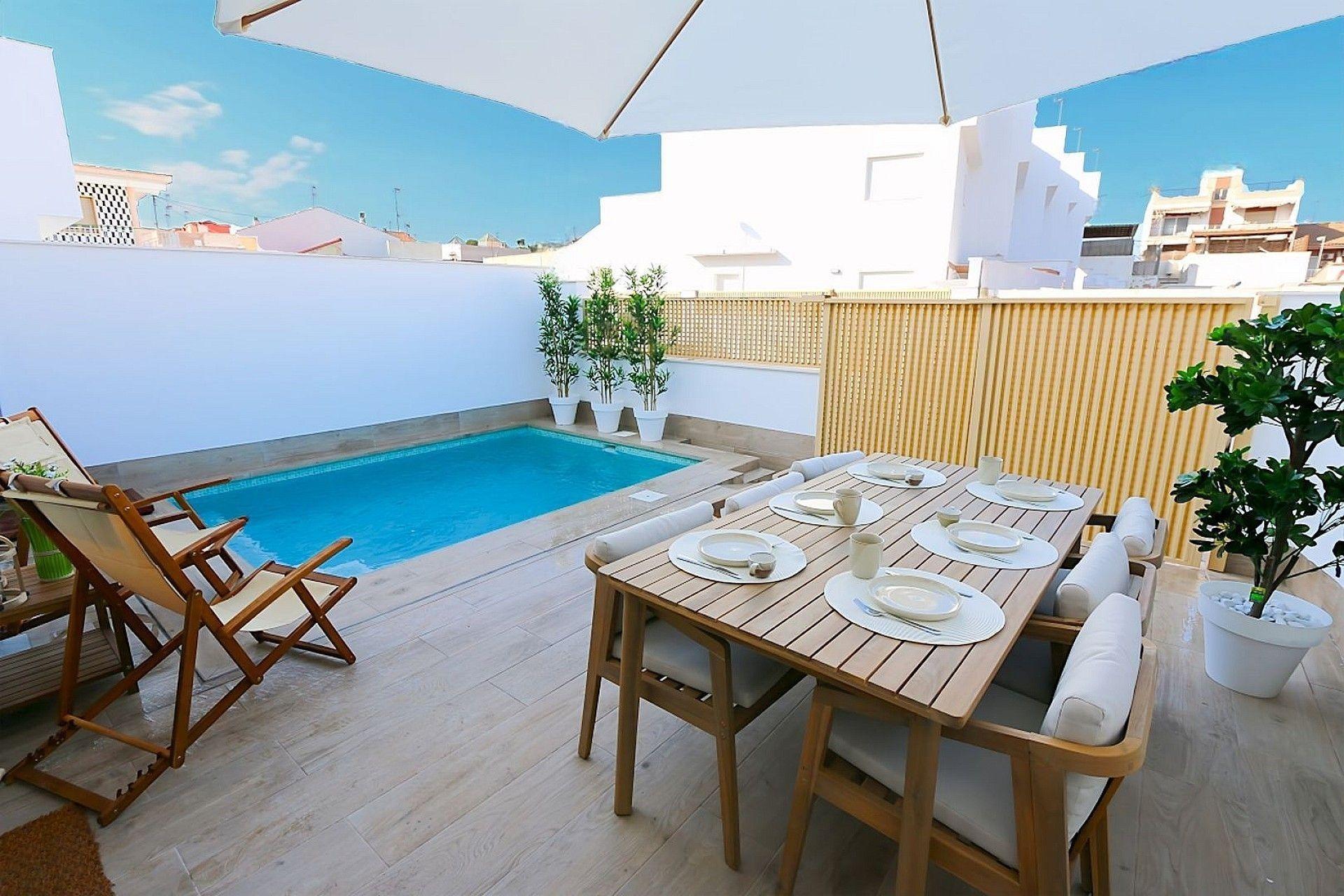 Stilvolles Strandhaus mit privatem Pool in der Nähe des Boulevards und des Strandes Genießen Sie Luxus und Komfort in einem einzigartigen Ferienhaus am Mar Menor!