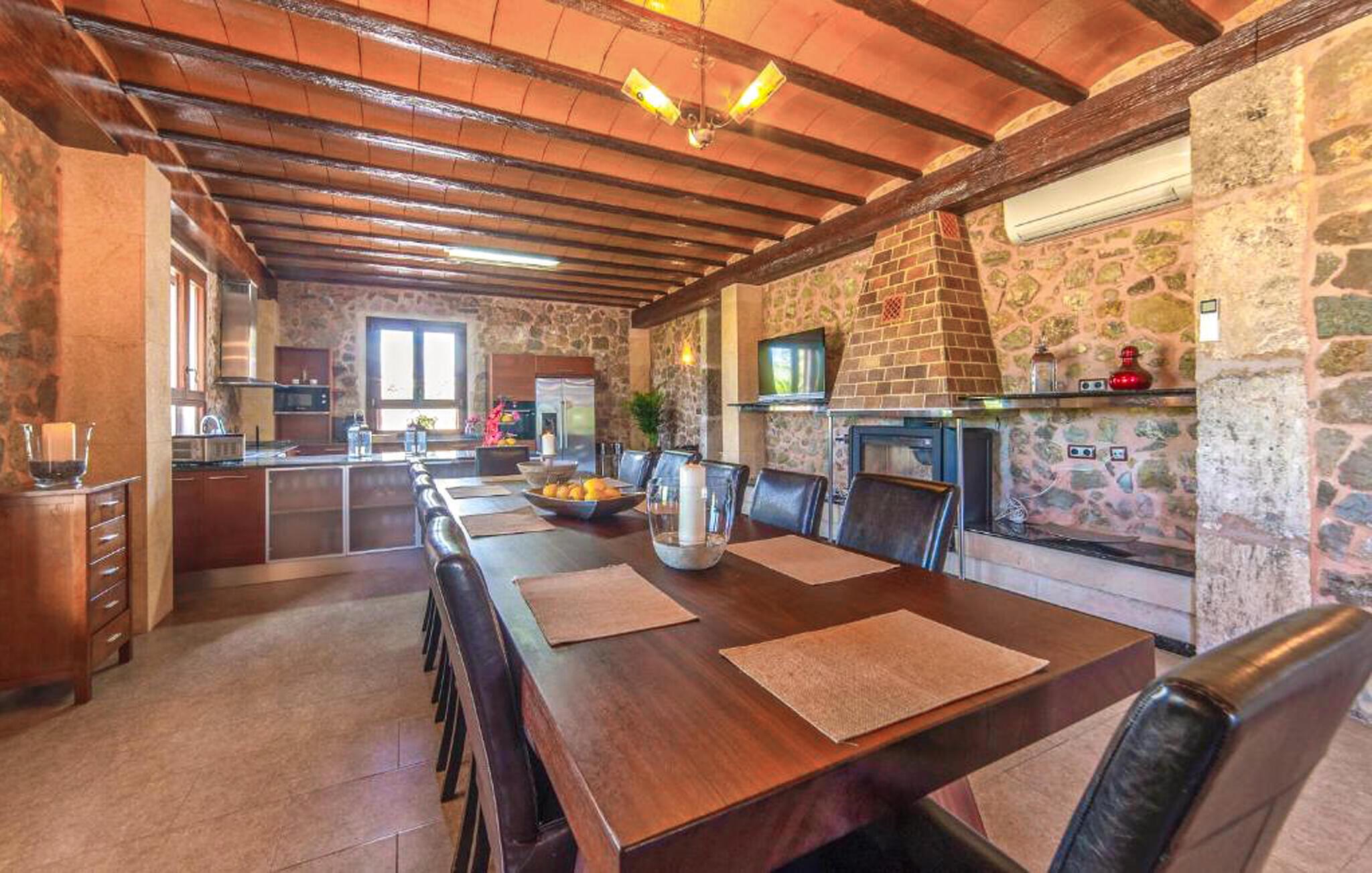 Træd indenfor og mærk straks den særlige atmosfære. Bliv betaget af de synlige træbjælker, tykke stenvægge og varme materialer. Brug opholdsstuen med komfortable sofaer og et fjernsyn som et samlingssted til rolige aftener. Lav mad sammen i det store køkken med moderne apparater og direkte adgang til spiseområdet. Saml jer omkring det lange bord og nyd afslappede måltider med venner og familie.