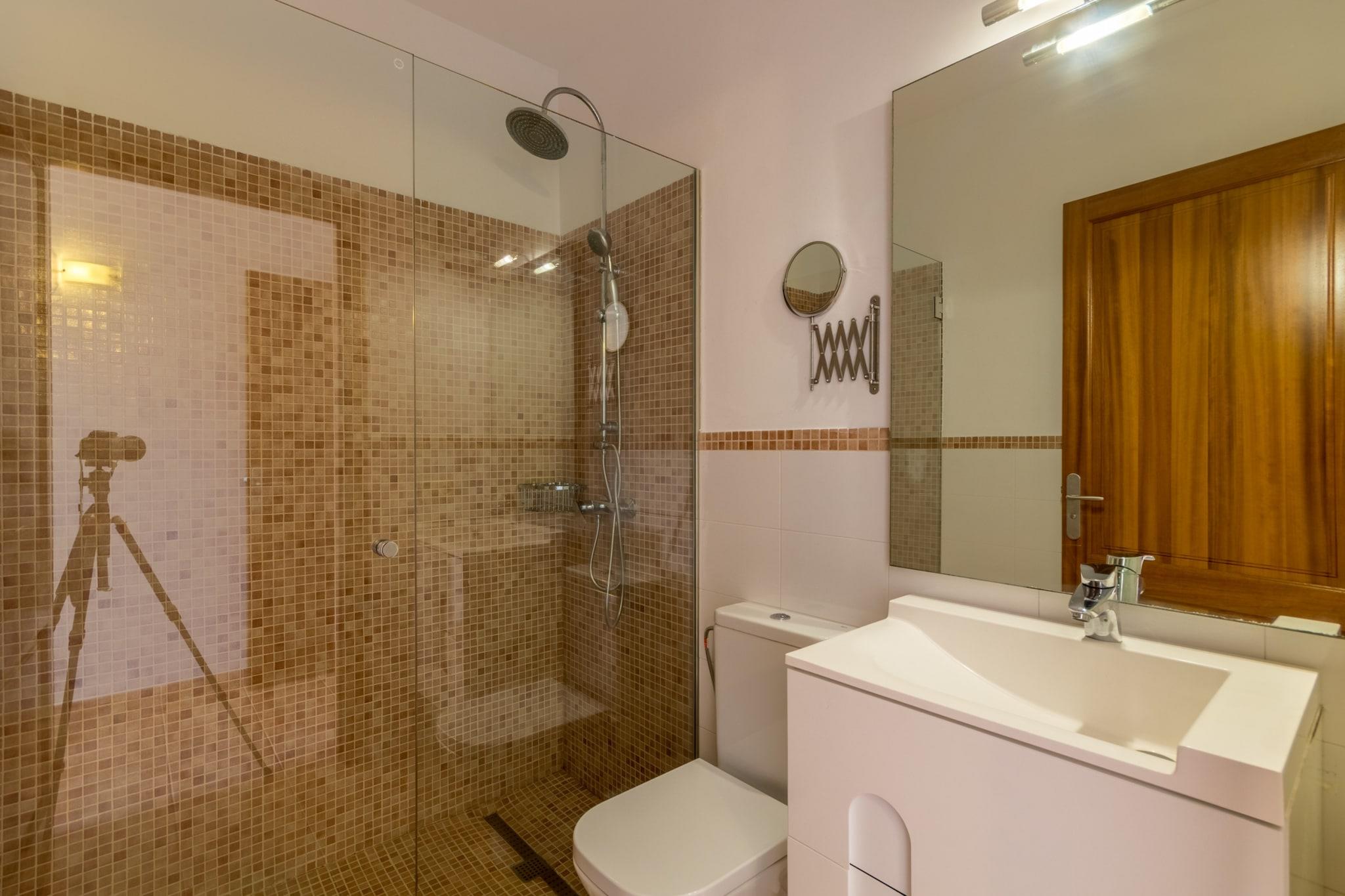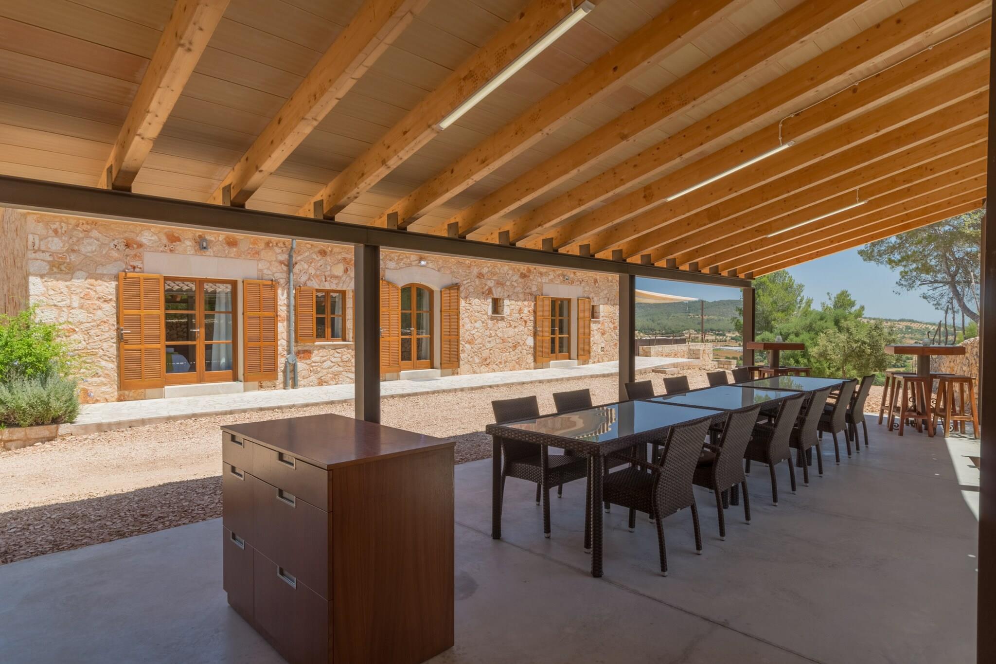 Beliggende i den rolige landsby Vista Sa Tanca i Sant Joan, tilbyder denne charmerende villa den perfekte flugt til det autentiske mallorcanske liv. Ejendommen kan prale af 6 komfortable dobbeltværelser, hver med et moderne en-suite badeværelse, hvilket sikrer maksimal privatliv og komfort for alle gæster. Med faciliteter som aircondition, varme, satellit-tv og gratis trådløs internetadgang giver villaen et indbydende og afslappende miljø under hele dit ophold. Udenfor er højdepunktet den spektakulære infinity-pool på den øverste terrasse, der tilbyder en betagende udsigt over det omkringliggende landskab. Beliggende kun 20 minutter fra den travle by Manacor, giver denne villa dig mulighed for at udforske Mallorcas rige historie og kultur. For dem, der søger øens fantastiske strande, er Son Serra de Marina og Porto Cristo inden for en kort køretur, der tilbyder krystalklart vand perfekt til en forfriskende svømmetur. Villaens strategiske beliggenhed giver nem adgang til øens bedste steder, mens den stadig tilbyder freden og roen i et afsondret tilflugtssted. Villaen er designet til afslapning og underholdning, og byder på en velholdt have omgivet af fyrretræer og farverige blomster. Udekøkkenet og grillpladsen er perfekte til at tilberede lækre måltider, mens bordtennisbordet sikrer, at der er sjov for alle aldre. Indvendigt giver det fuldt udstyrede køkken alt hvad du behøver for at skabe mindeværdige retter, hvilket gør det ideelt til familiesammenkomster eller grupperejser. Med sine fredfyldte omgivelser og moderne bekvemmeligheder er denne villa et sandt tilflugtssted for dem, der søger en blanding af afslapning, eventyr og lokal charme. Lejelicensnummeret er ETV/3832
