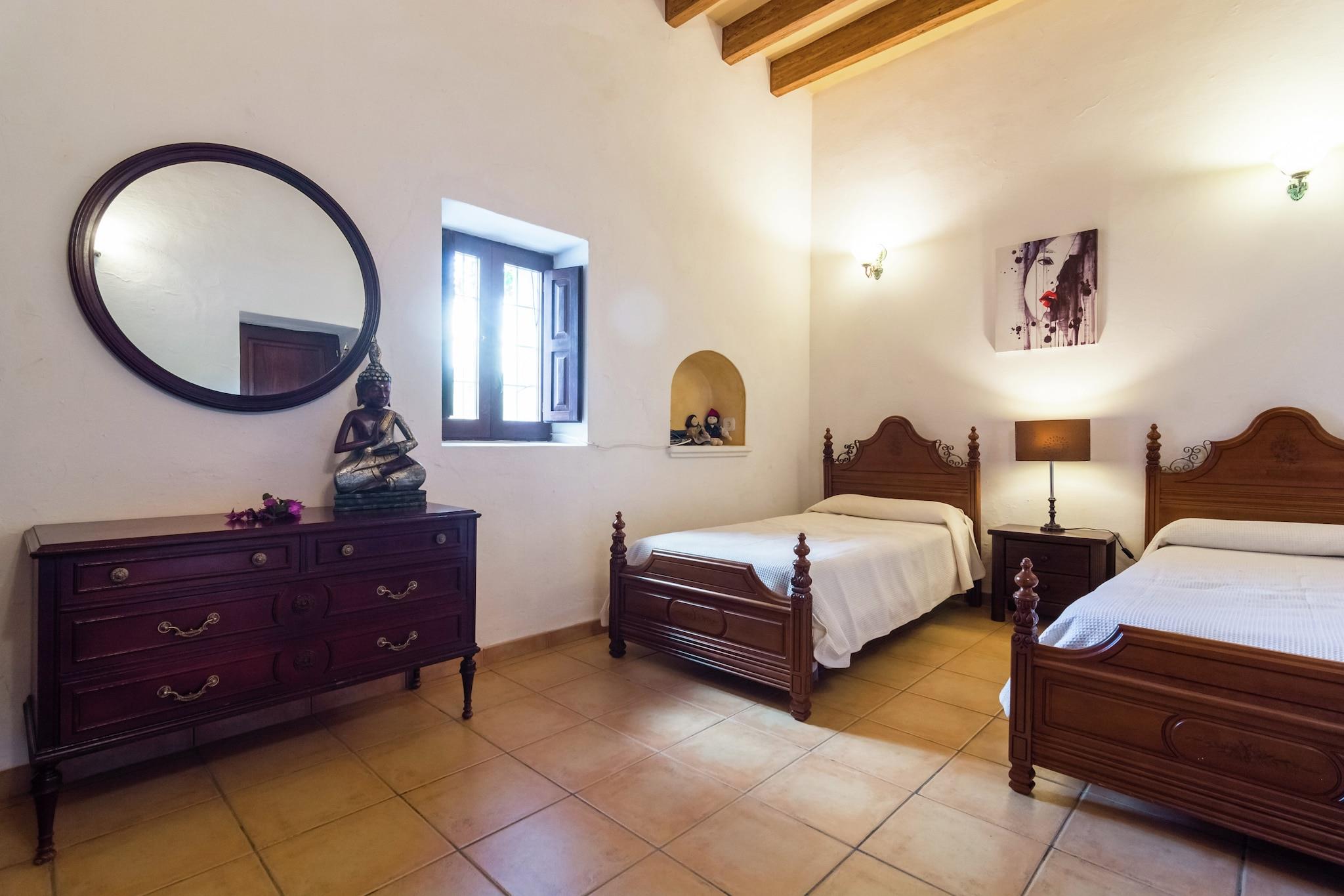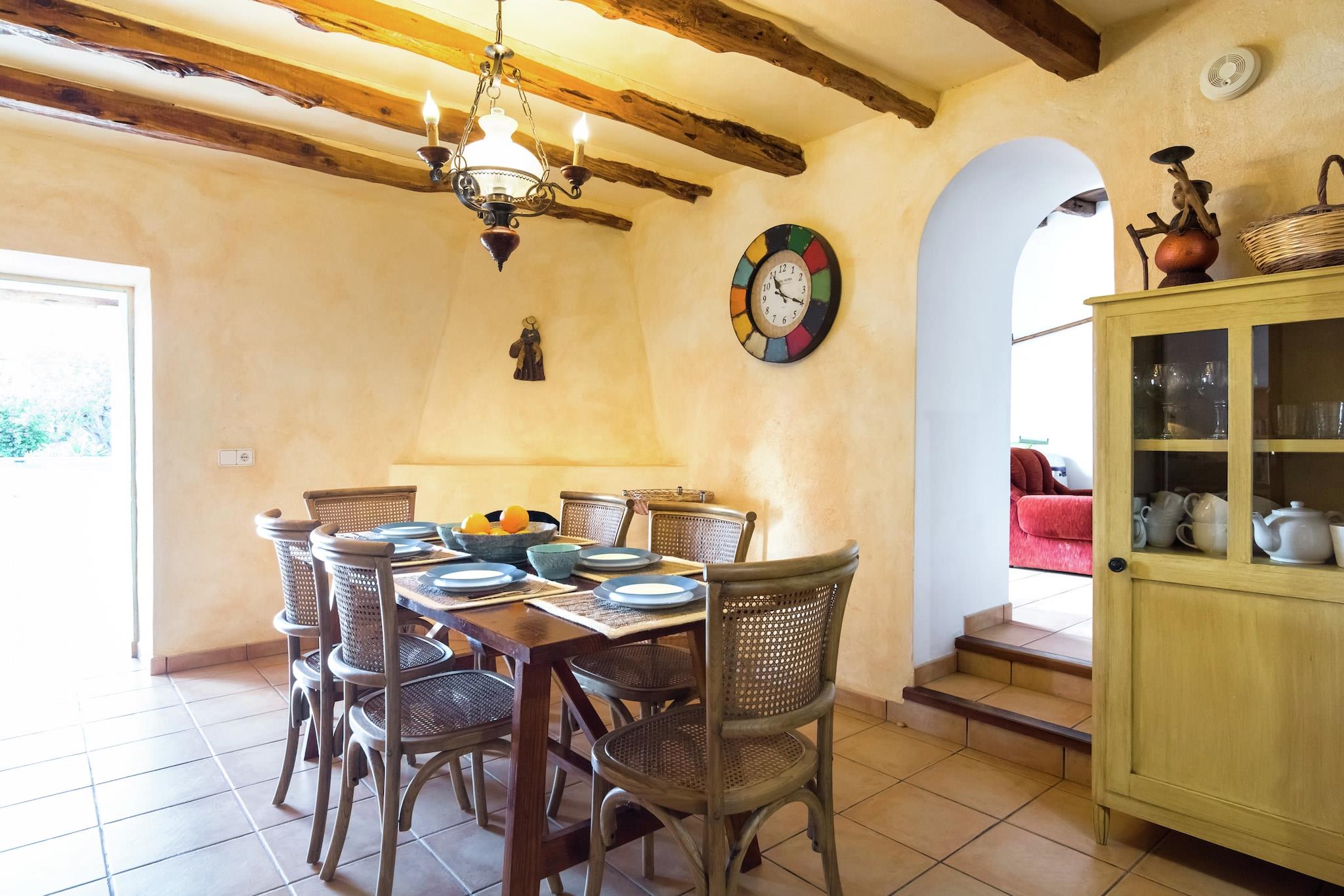Can Bosque er en finca i Santa Agnes. Finca er 300 år gammel. Det er roligt beliggende i det kuperede landskab i Santa Agnes. Det er omgivet af smukke grunde med århundreder gamle oliventræer. Finca er mellem San Mateo og Santa Agnes, to små landsbyer med en smuk kirke og en restaurant. Hjemmet ligger 15 minutter i bil fra Cala Salada-stranden. Det er 5 minutter i bil fra Santa Agnes med sin berømte dal af mandeltræer. På 20 km fra Can Bosque finder du den hyggelige by Ibiza Town. Hele området er perfekt til vandrere og folk, der nyder at opdage små bugter og indløb væk fra trængsel og travlhed. Grundene er helt lukket. Du går ind gennem elektroniske porte. Der er en stor terrasse foran huset med en 11 x 4 m swimmingpool. Der er en mursten bygget grill og en overdækket terrasse med spisebord. Hovedhuset har en stor stue med et attraktivt opholdsområde, pejs, satellit-tv, stereoanlæg og et smukt gammelt bjælkeloft. Franske vinduer åbner ud mod terrassen. Det tilstødende køkken er udstyret med keramisk kogeplade, ovn, mikroovn, stort køleskab og opvaskemaskine. Det har en komfortabel spiseplads. Næste er opbevaringsområdet med vaskemaskine. Der er to soveværelser støder op til stuen. Den ene er et soveværelse med dobbeltseng, den anden har to enkeltsenge. Begge har eget badeværelse med badekar, bruser og toilet. Trin fører op til det tredje soveværelse. Dette har en dobbeltseng, eget badeværelse med badekar, bruser og toilet. Alle værelser har aircondition.