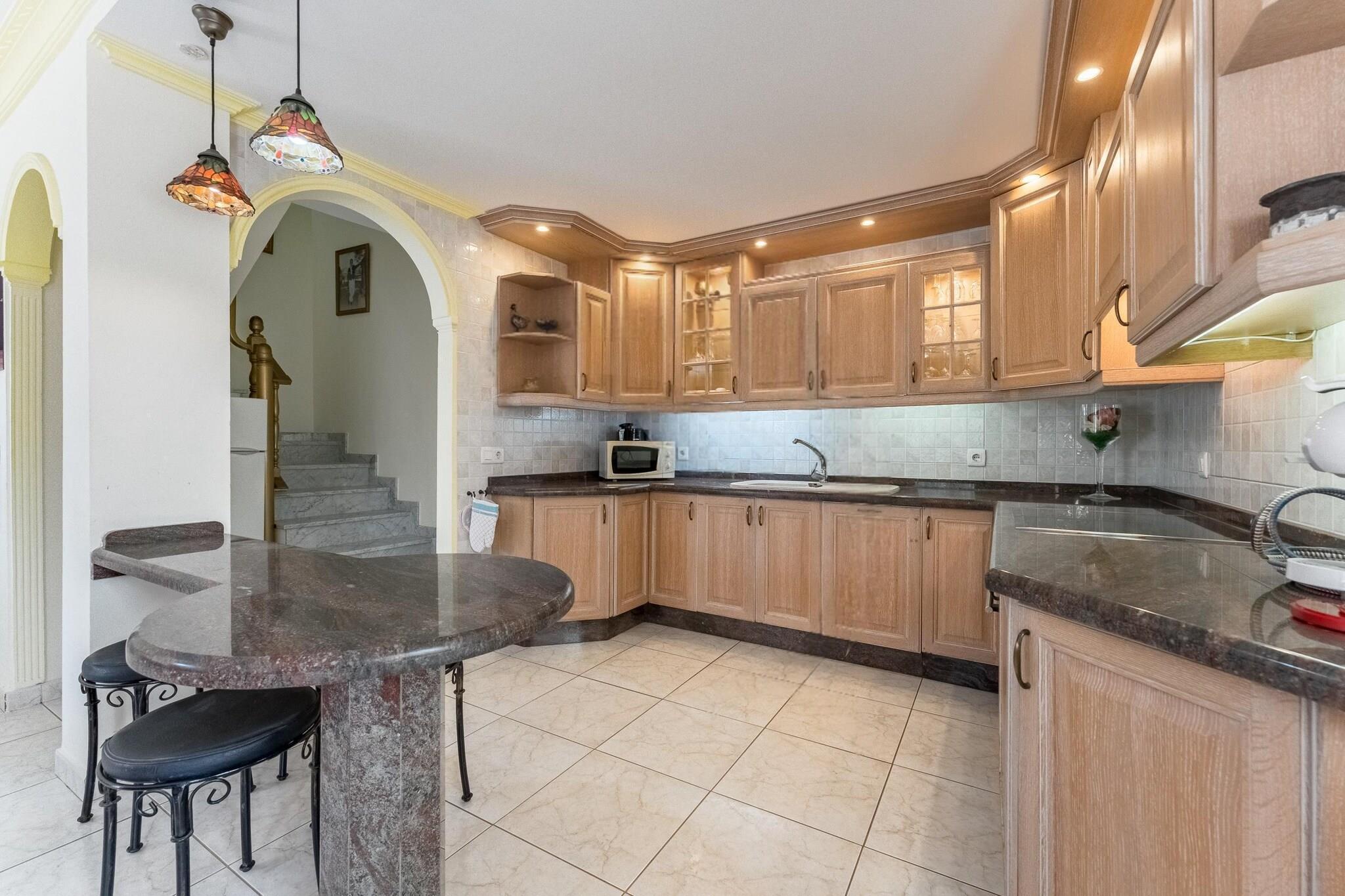 Stueetage: (Indgang (deles med andre gæster, adgang udefra), Stue(Fjernsyn(fladskærm, Internationale TV-kanaler), sofahjørne), Køkken(kogeplade, elkedel, emhætte, kaffemaskine, ovn, mikrobølgeovn, køle-fryseskab), soveværelse(dobbeltseng eller 2 enkeltsenge Senge), soveværelse(dobbeltseng eller 2 enkeltsenge Senge), badeværelse(bruser, håndvask, toilet), klimaanlæg) terrasse(privat), have(privat), parking lot(public), swimmingpool(deles med andre gæster, udendørs, opvarmet, opened from Jan upto and including Dec), strygebræt, strygejern