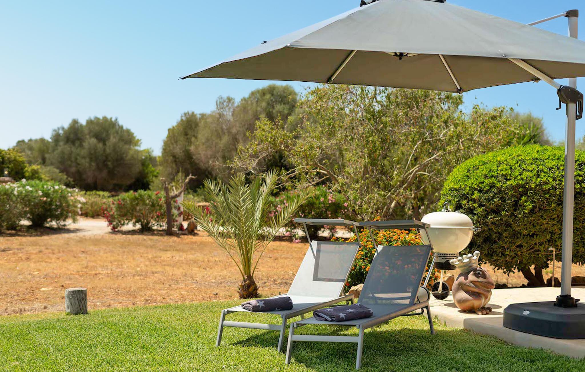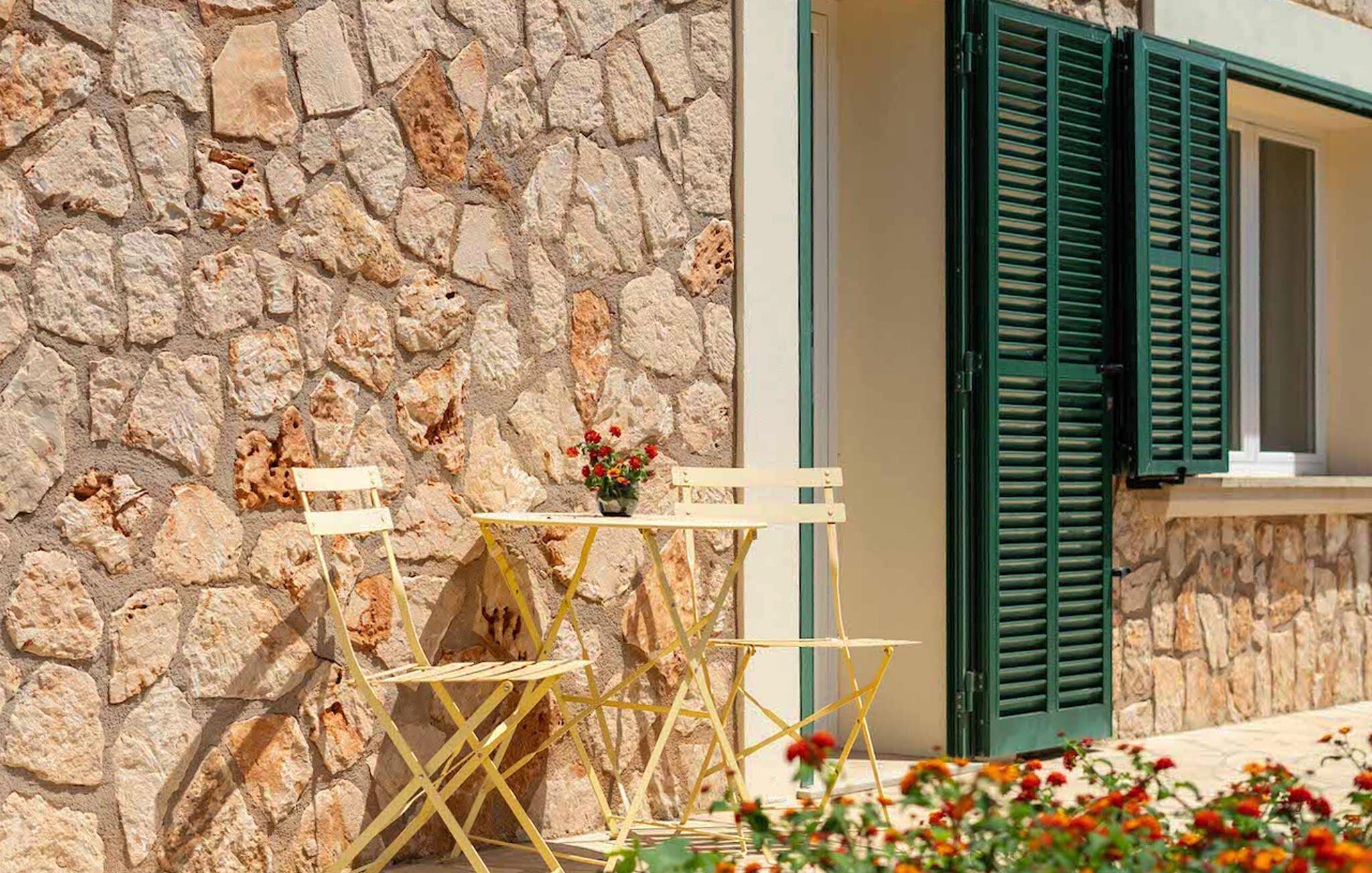 Fincaens udendørsområde udstråler middelhavscharme: en frodig have, en nostalgisk trædør og en facade af rustik og elegant natursten skaber en indbydende ferieatmosfære.
