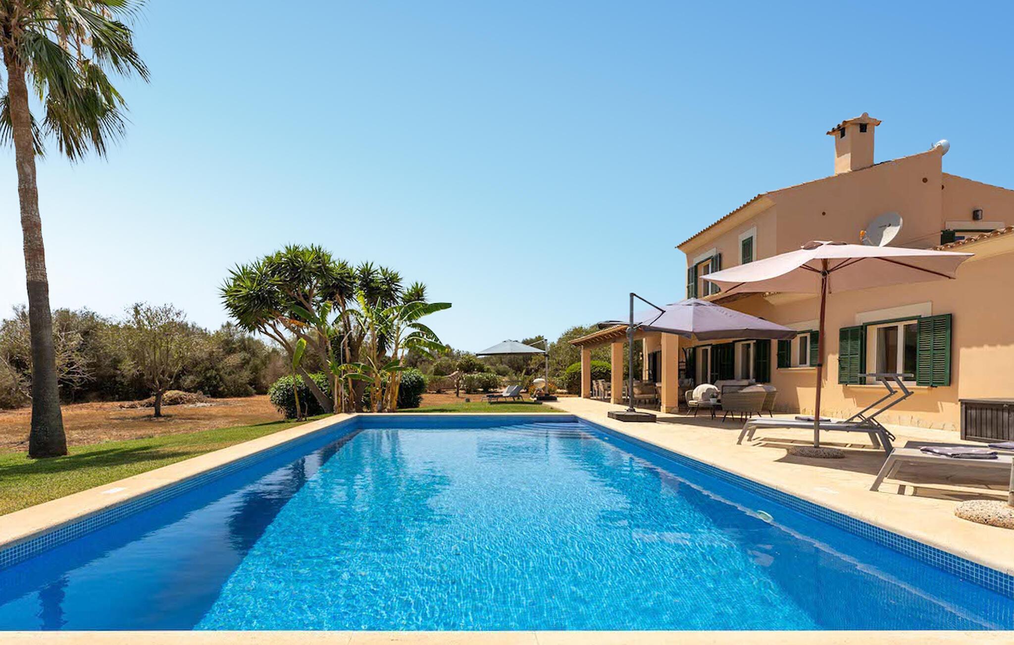 Beliggende mellem den charmerende landsby Calonge og den imponerende havneby Cala d'Or, kombinerer denne exceptionelle finca på perfekt vis ro og komfort. Den blev bygget i 2004 og er altid blevet omhyggeligt vedligeholdt og for nylig moderniseret på nogle områder. Indkørslen, omkranset af farverige oleanderbuske, fører malerisk til hovedindgangen.