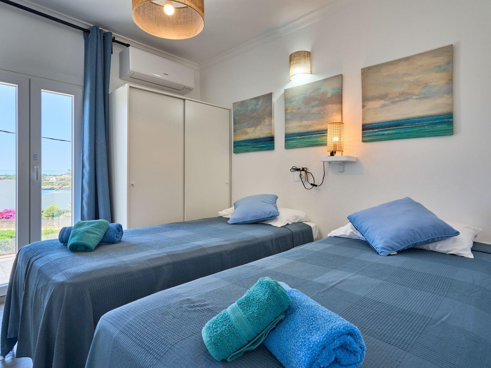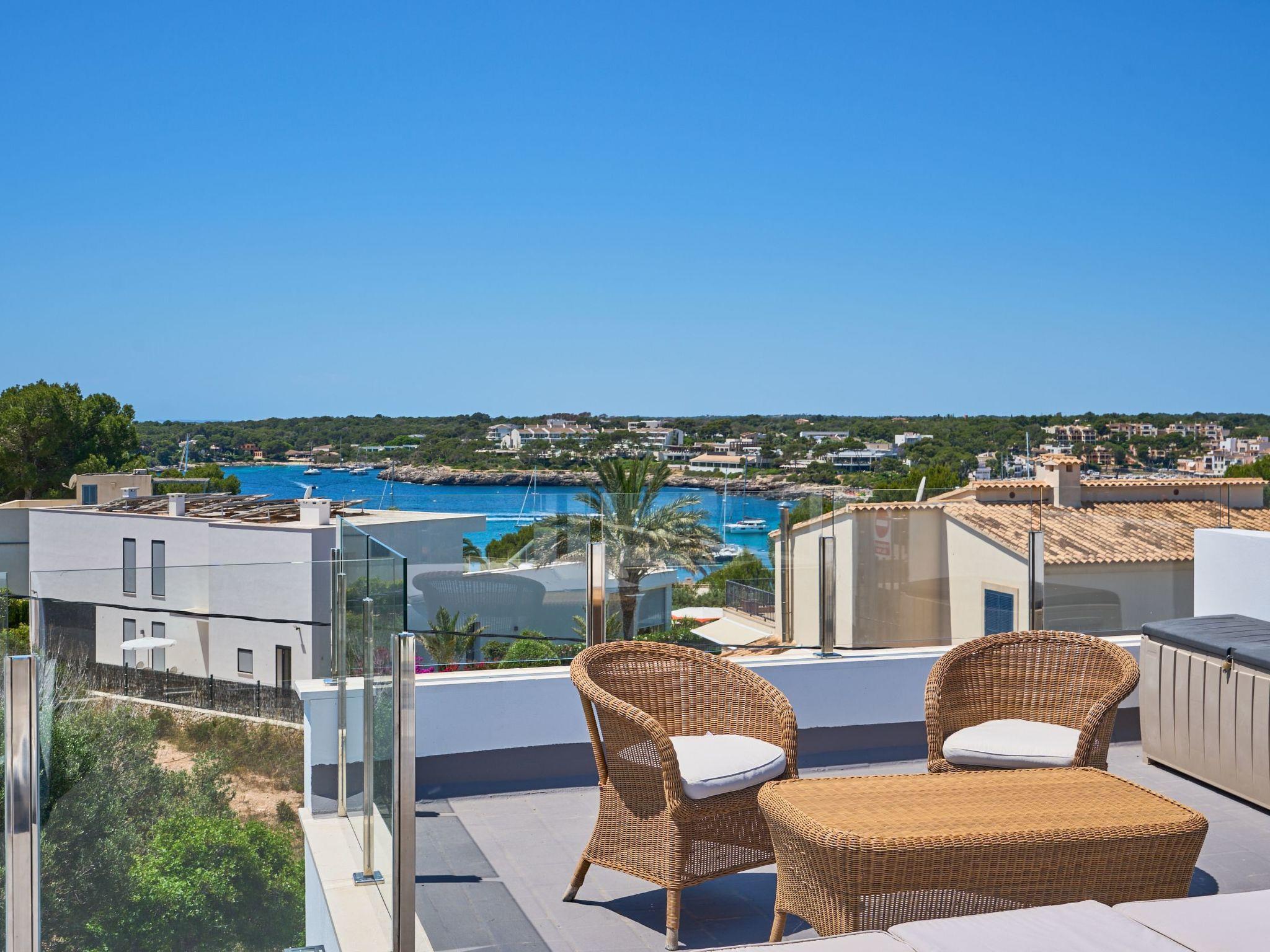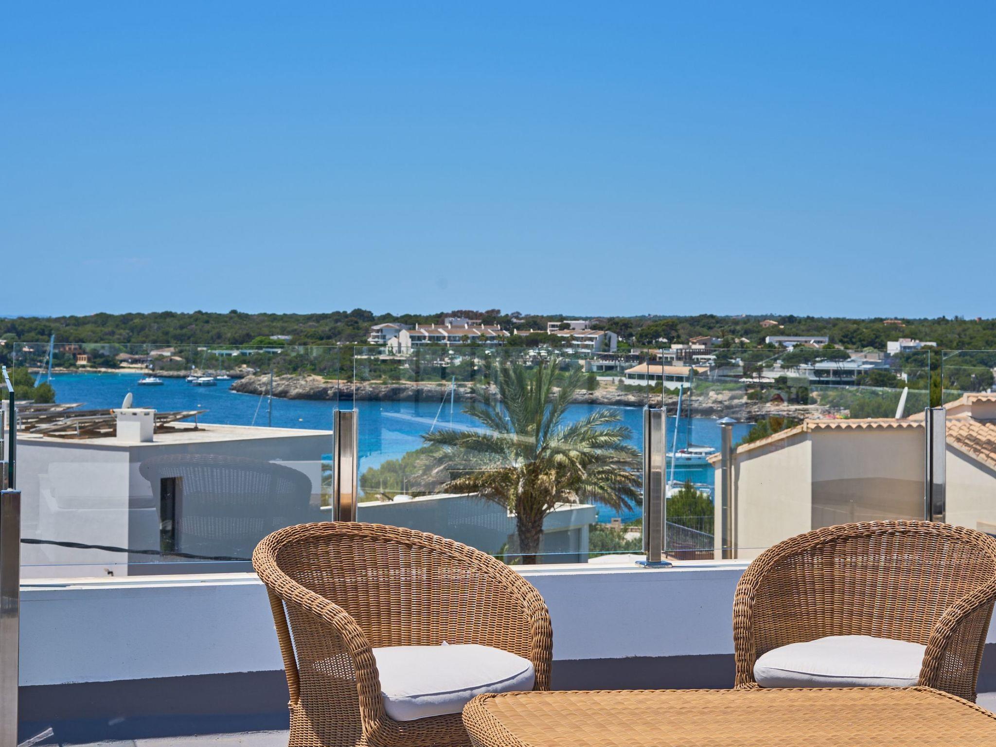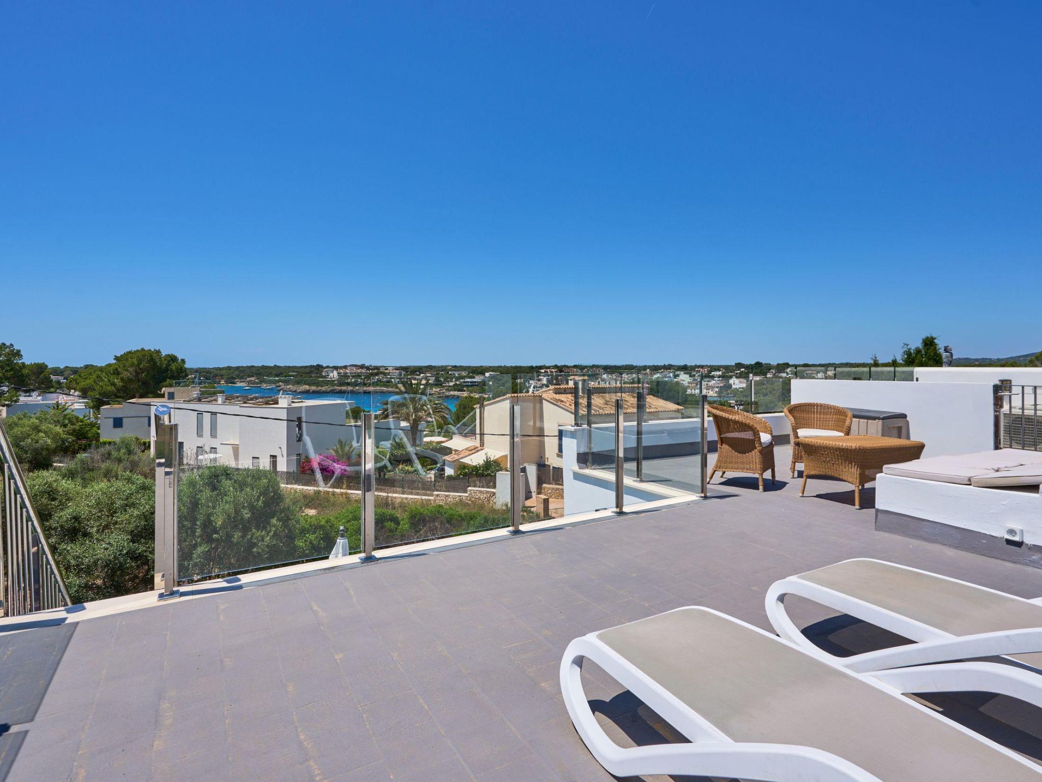 An external staircase leads to the upper floor, where there is a living room with access to a small terrace that offers sweeping views of the harbour of Porto Petro. There are three further bedrooms on this floor. One with two single beds and one with a double bed. Adjacent to these bedrooms is a bathroom with a bathtub and separate shower. The last bedroom has a double bed, a living room, a bathroom with shower and access to a small terrace.