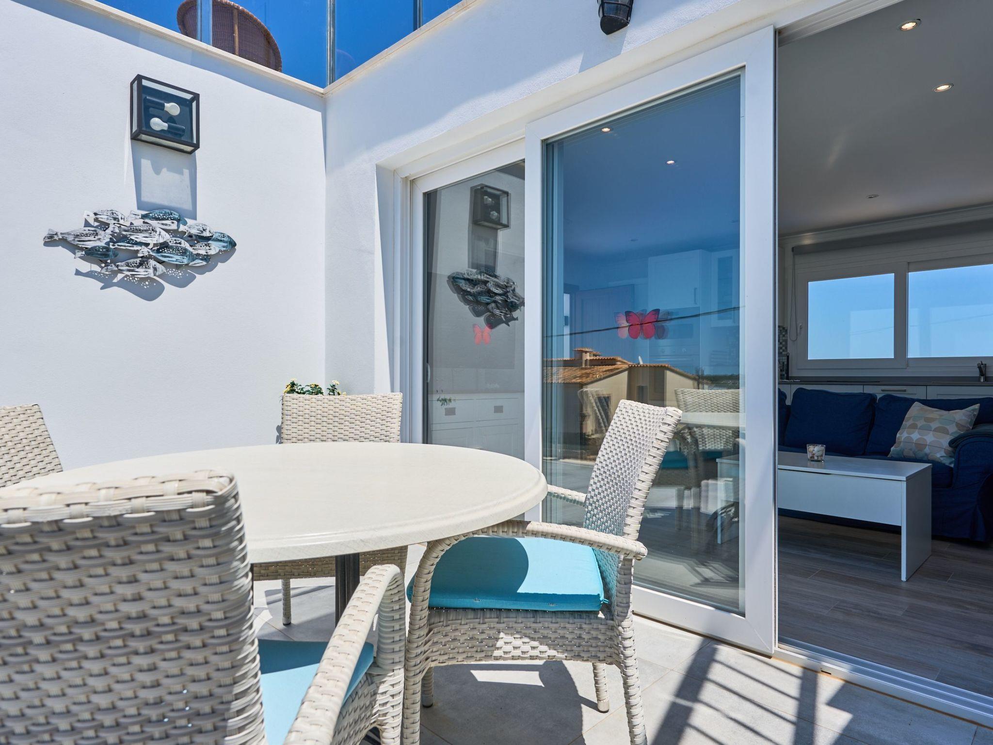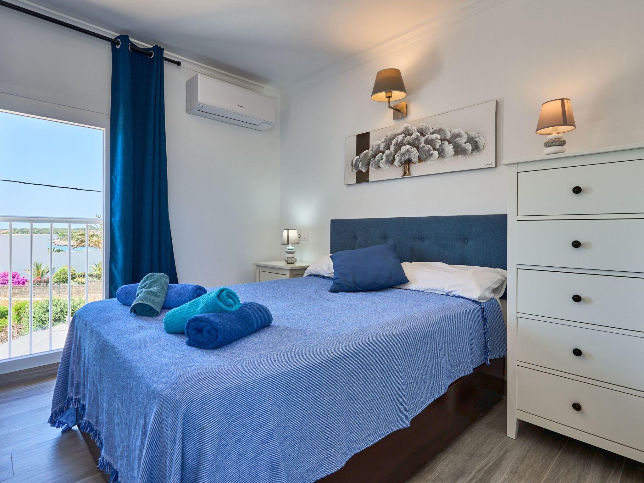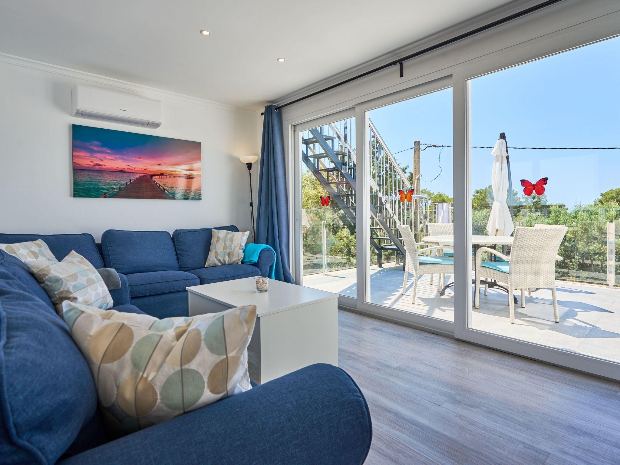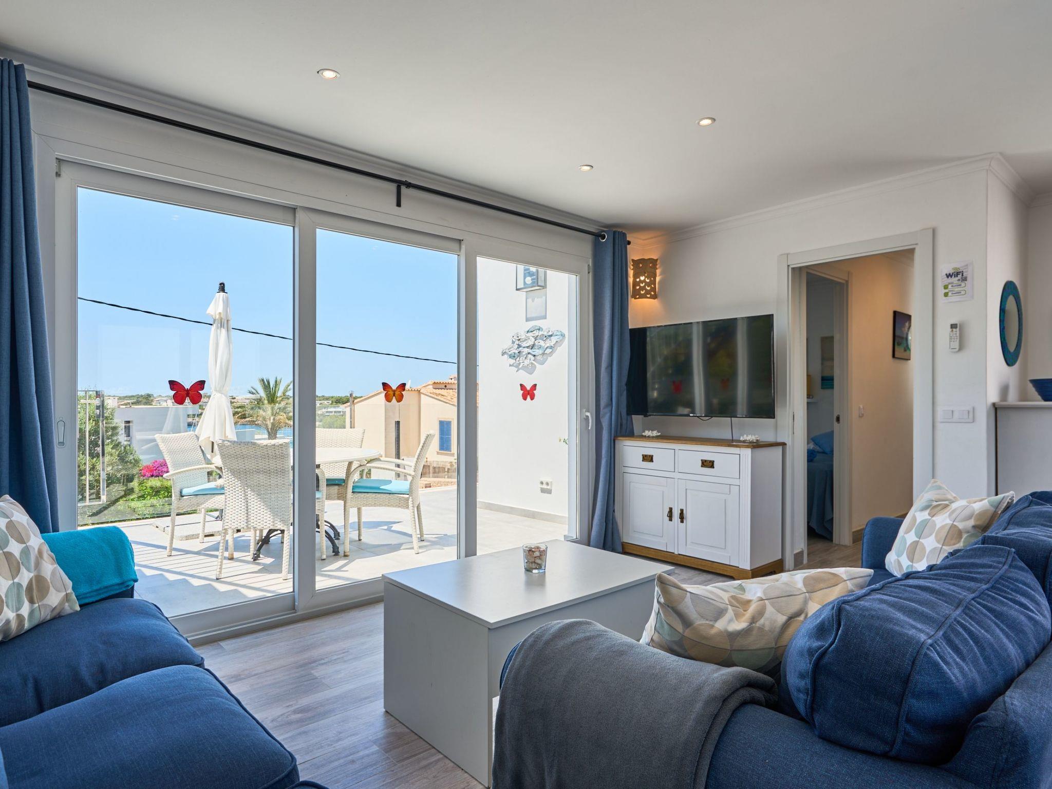 An external staircase leads to the upper floor, where there is a living room with access to a small terrace that offers sweeping views of the harbour of Porto Petro. There are three further bedrooms on this floor. One with two single beds and one with a double bed. Adjacent to these bedrooms is a bathroom with a bathtub and separate shower. The last bedroom has a double bed, a living room, a bathroom with shower and access to a small terrace.