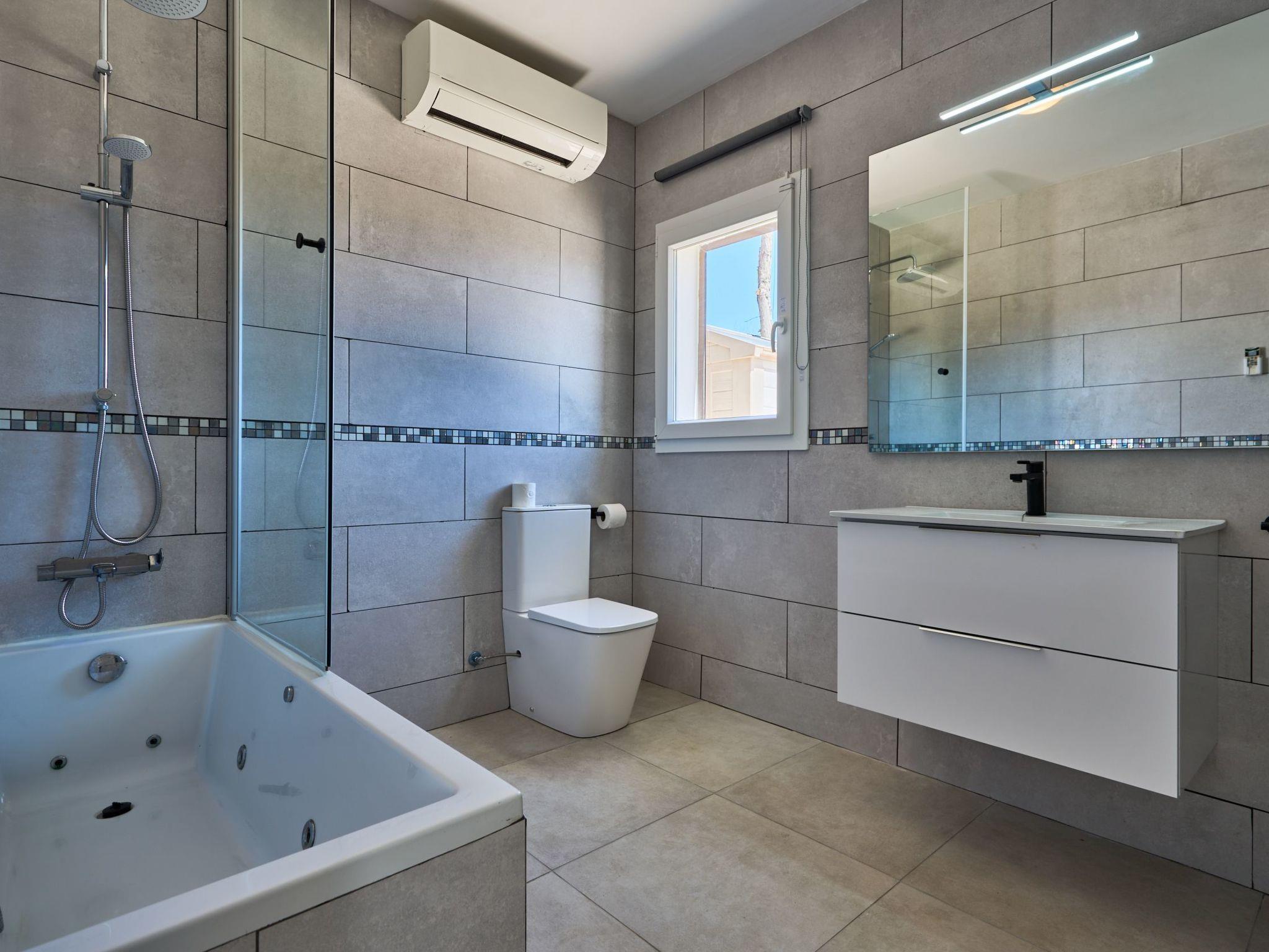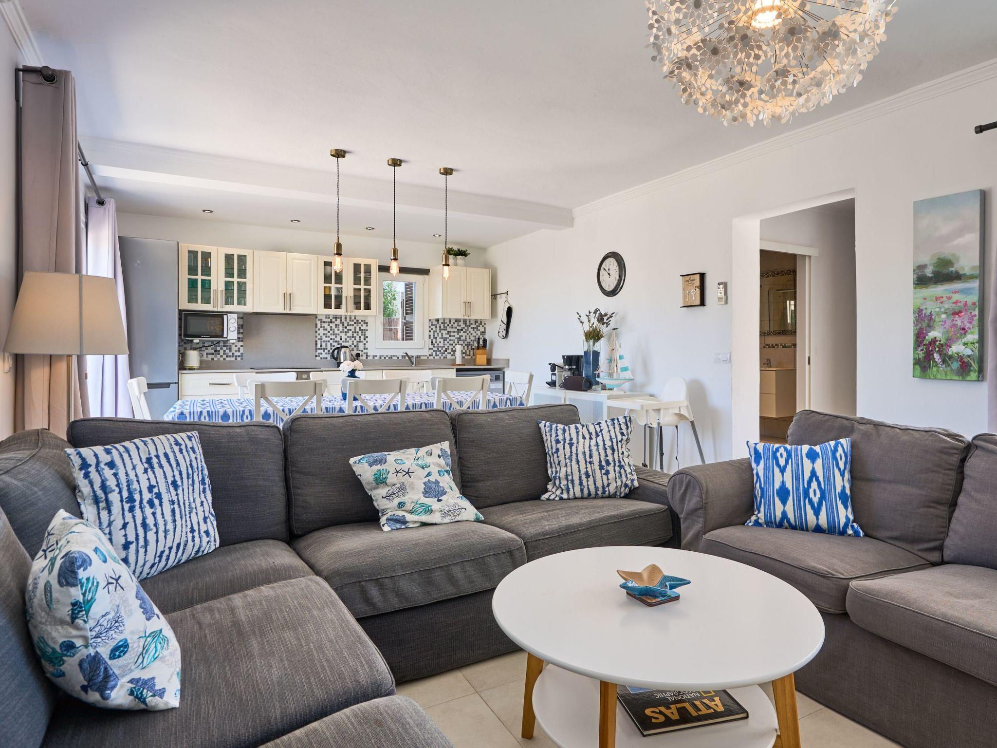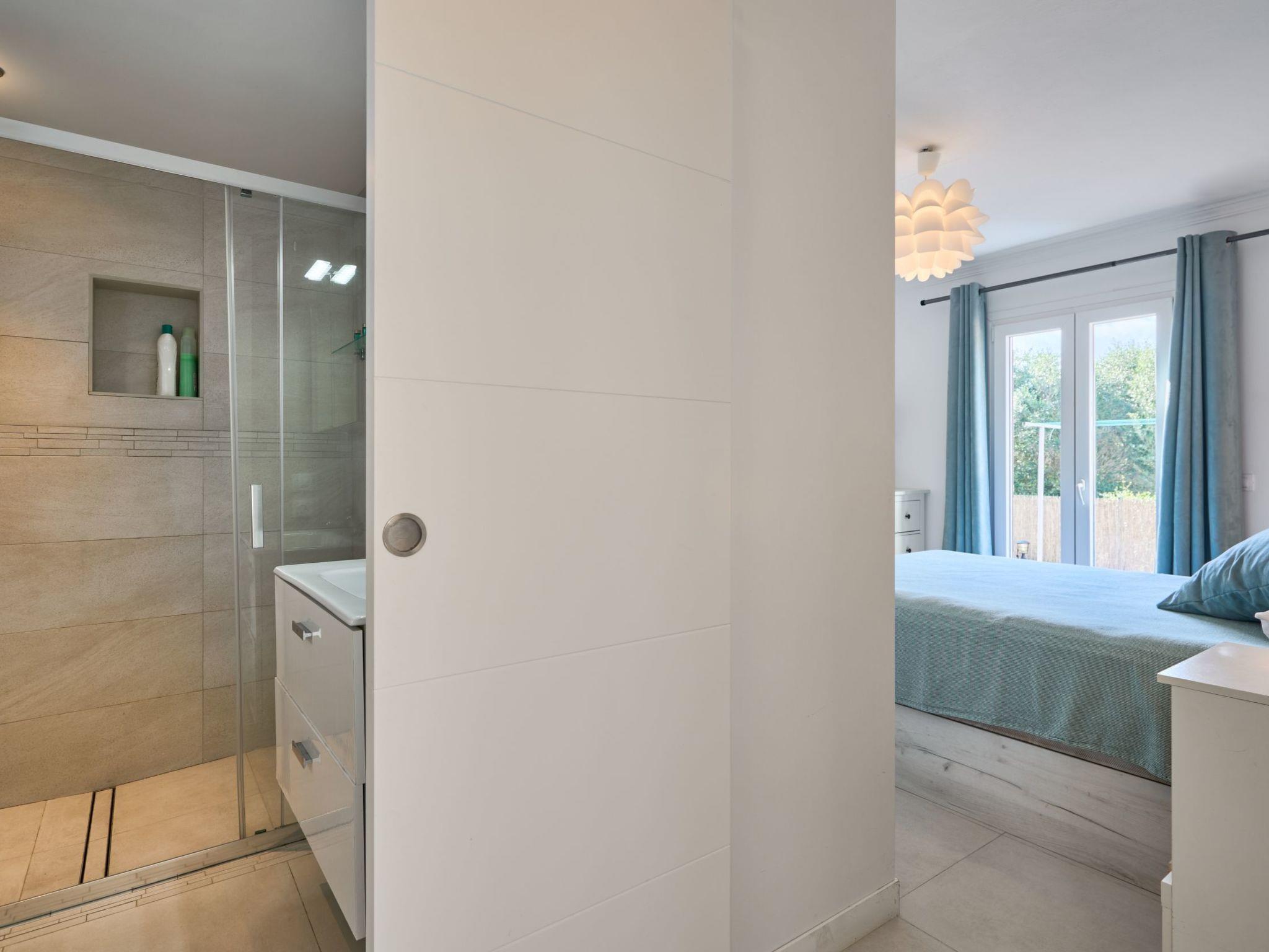 Large house spread over two floors. On the ground floor is the open-plan kitchen with dining area and adjoining living room. Next to the living room there is a bedroom with a double bed and an en suite bathroom with shower. A corridor next to the kitchen leads to two further bedrooms. One of them has two single beds and an adjoining bathroom with bathtub. The other bedroom has a double bed and an en-suite bathroom with shower. These two bedrooms have access to the pool area.
