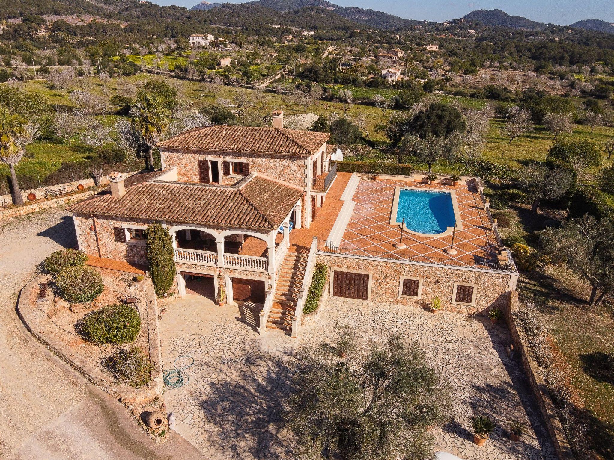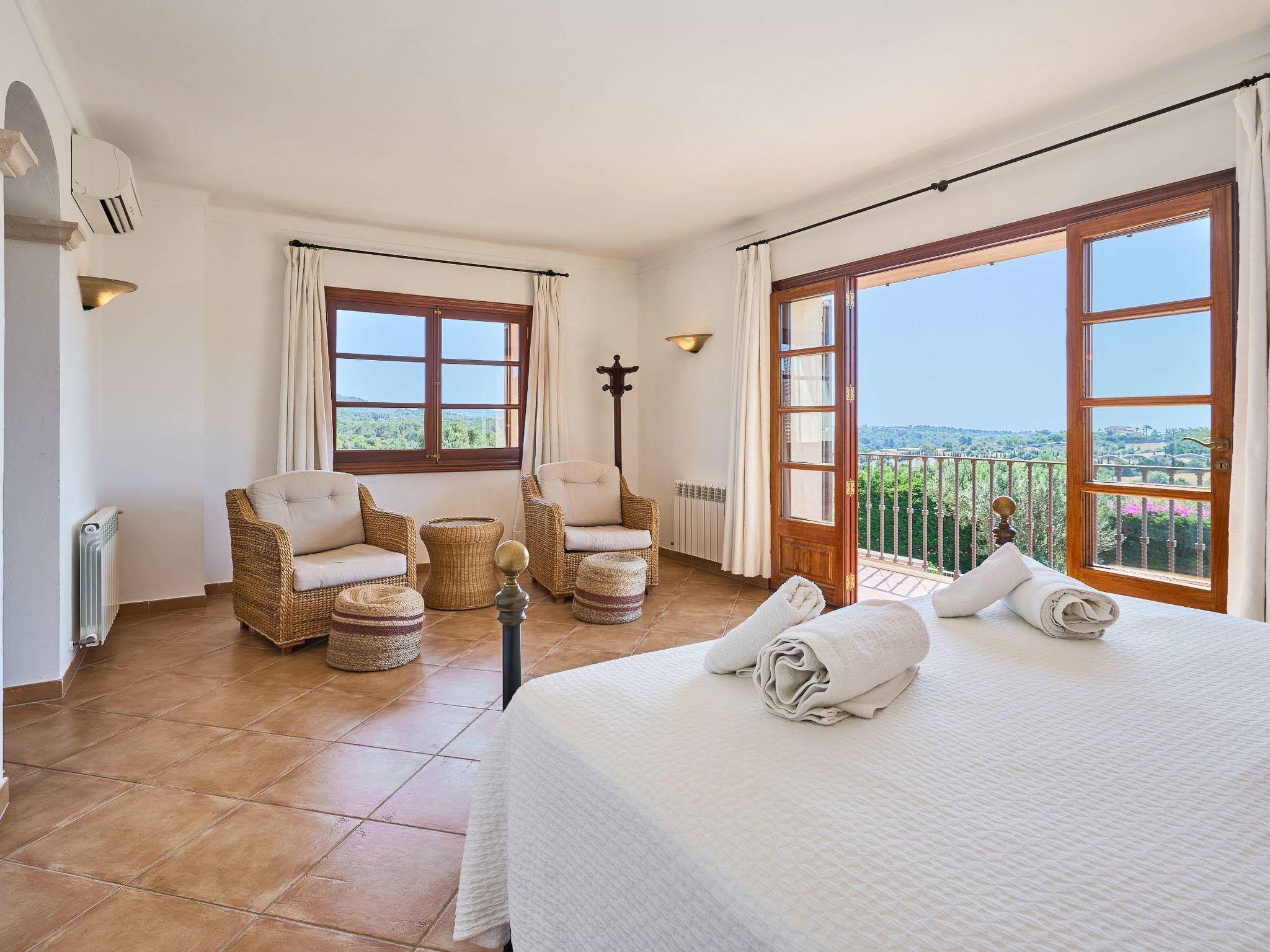 Spacious, two-storey country house with generous outdoor area and panoramic views. From the entrance you enter a large living room with French doors leading to the terraces and pool area. The dining room is located between the living room and the kitchen. Spacious kitchen with breakfast table, a pantry and access to the covered terrace. A utility room is located next to the kitchen. There are also three double bedrooms on the ground floor, each with 2 single beds pushed together. One of the rooms has an en suite bathroom, the other two bedrooms share an adjoining shower room. Guest WC. The master bedroom is located on the first floor. It has a double bed, walk-in wardrobe, a private balcony and an en-suite bathroom with separate shower. A staircase leads to two marvellous sun terraces, one facing east and the other west.