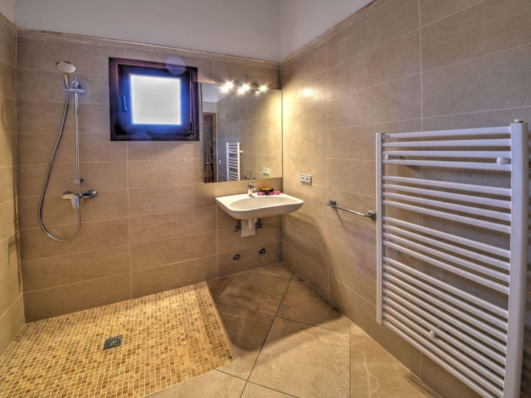 Two-storey country house. On the ground floor there is an open-plan living room with access to an open-plan kitchen with a large dining table. A pantry and the utility room are located next to the kitchen. This floor also offers two bedrooms with double beds and one with two single beds; each room with bath or shower en suite - one of the bathrooms is wheelchair accessible. Guest toilet next to the living room. There are three further bedrooms on the first floor. One with a double bed and one with two single beds; each with an en suite bathroom. The 3rd double bedroom is an outside room with a double bed (two mattresses together) and integrated shower room. This bedroom can be accessed both via an external staircase and from a terrace on the first floor.