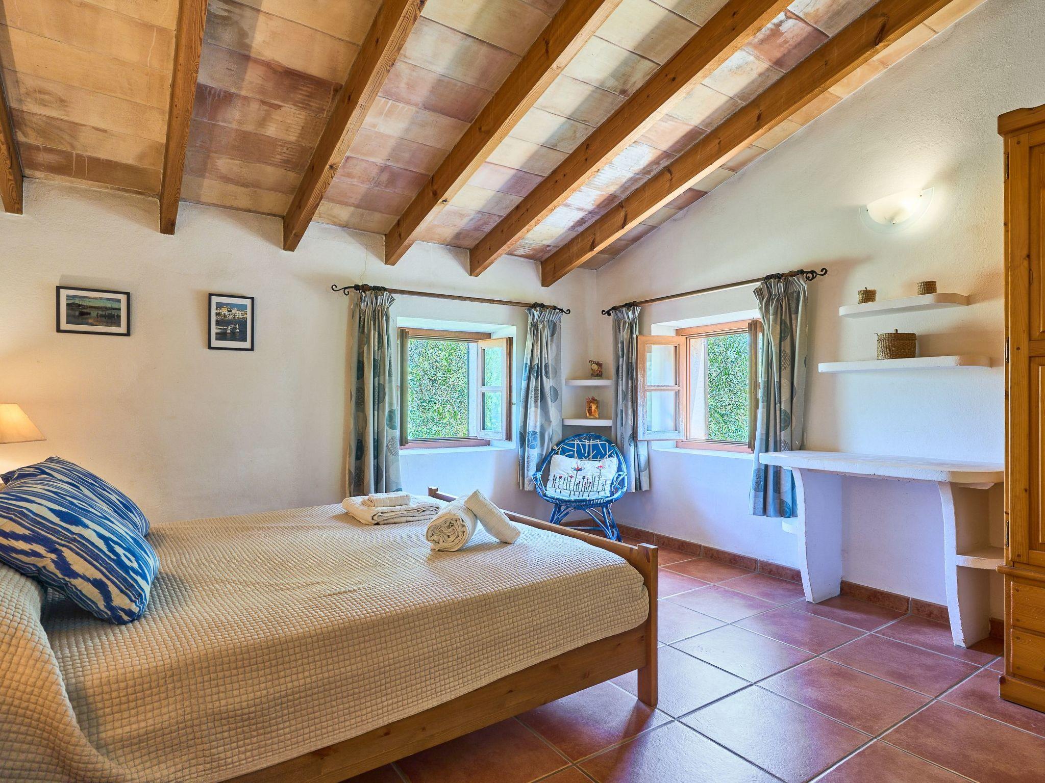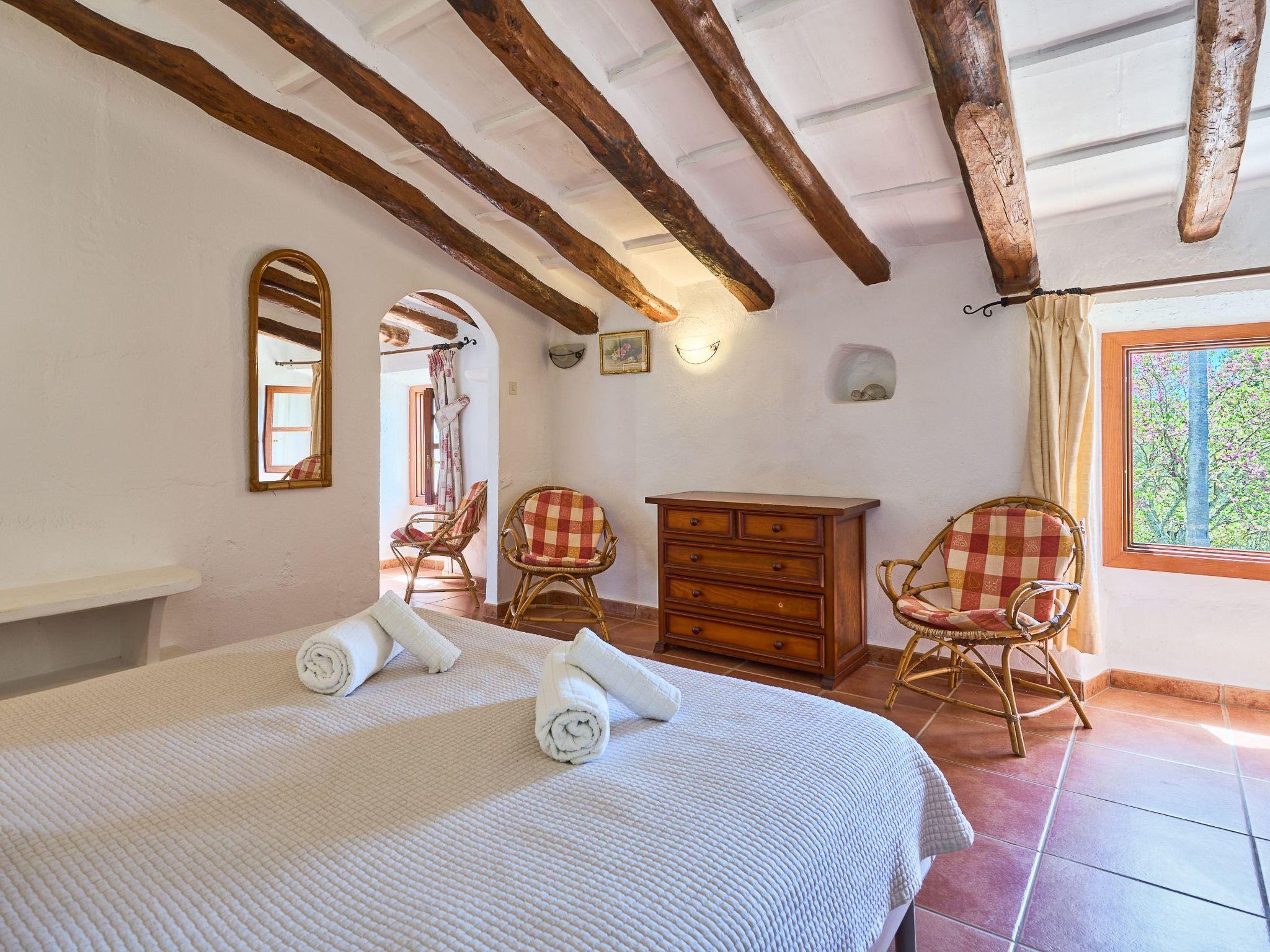The finca is distributed over two floors. The dining area is located on the ground floor right at the entrance. Next to it is the rustic, well-equipped kitchen. On the other side, overlooking the pool area, is the very spacious living room with access to the veranda and the external dining area. On the ground floor there is also a bedroom with two single beds and a bathroom with bathtub. The utility room is next to the kitchen.
