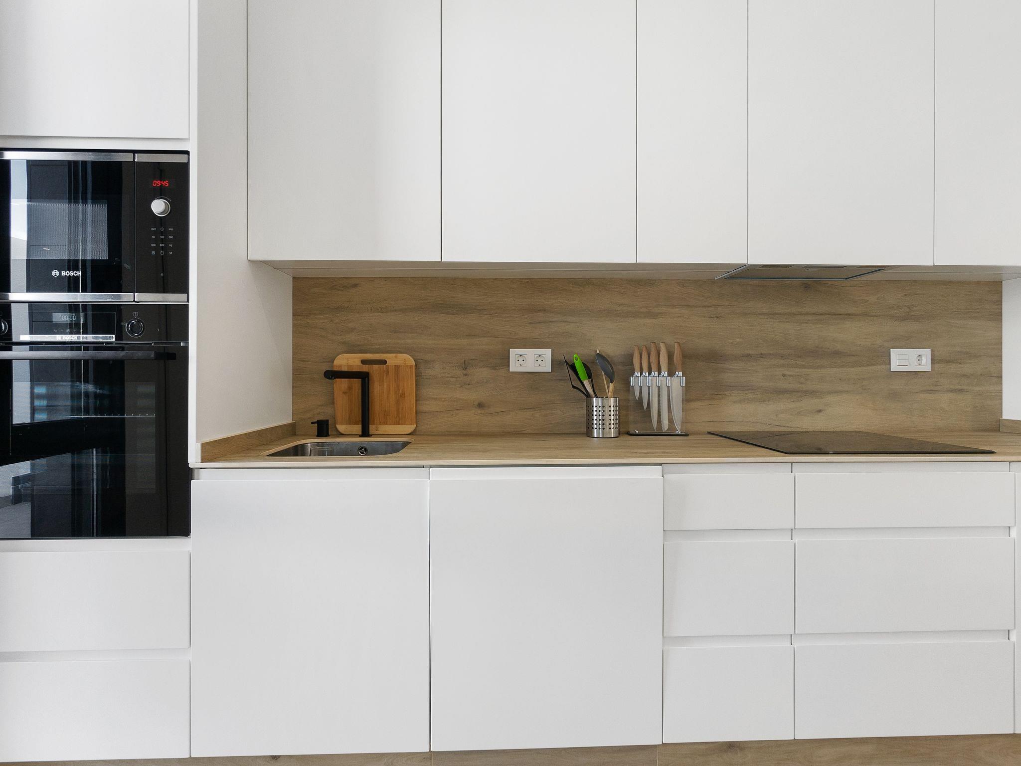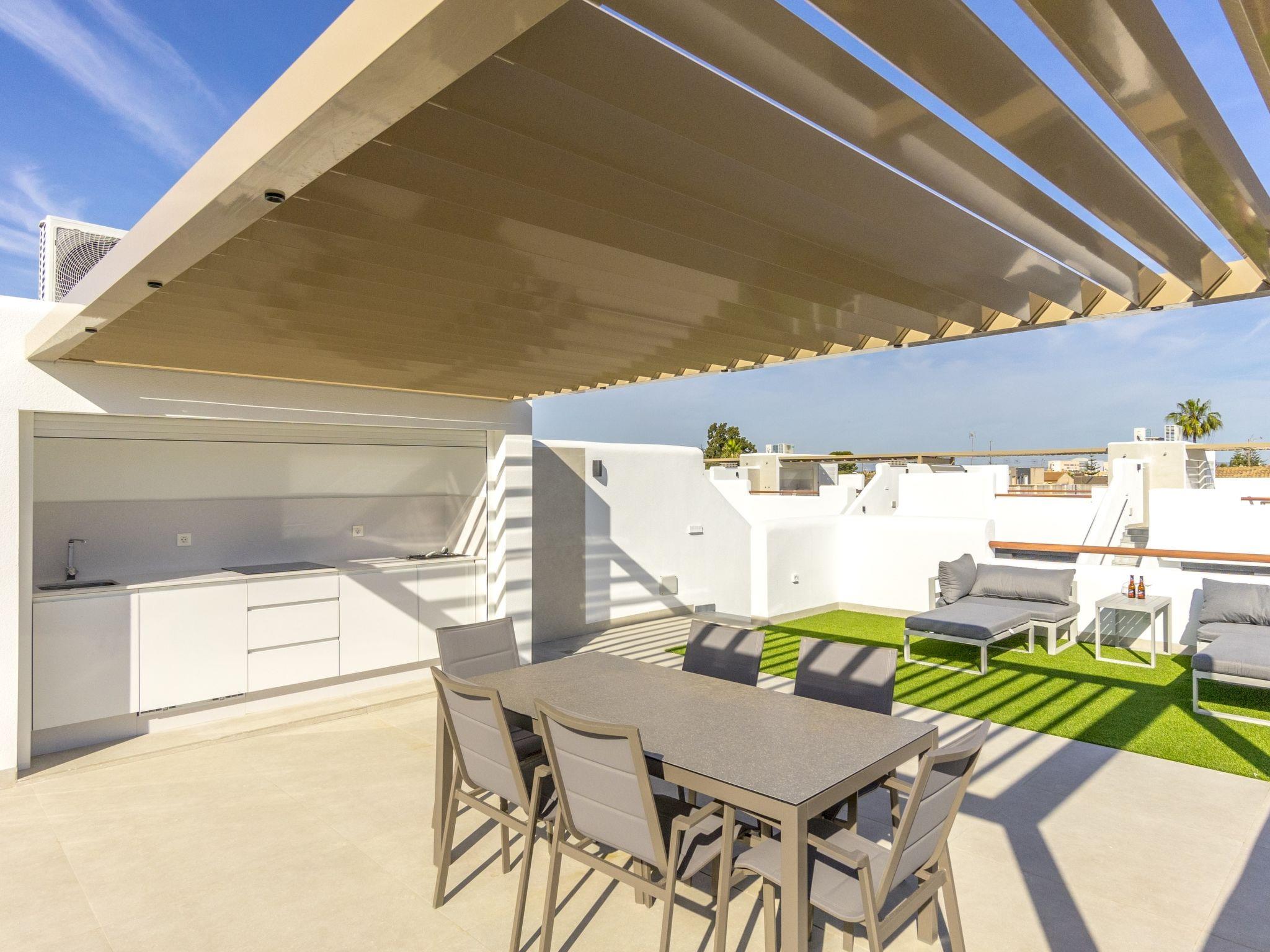 "Tropical Beach Penthouse", 3-room penthouse 64 m2 on 1st floor. Practical and comfortable furnishings: large living/dining room with 1 double sofabed (140 cm, length 190 cm), air conditioning and forced-air heating. Exit to the balcony. 1 room with 1 french bed (150 cm, length 190 cm), shower/WC, air conditioning and forced-air heating. 1 room with 1 french bed (150 cm, length 190 cm), air conditioning and forced-air heating. Open kitchen (oven, dishwasher, 4 ceramic glass hob hotplates, kettle, microwave, freezer, electric coffee machine). Shower/WC. Balcony, large terrace 80 m2. Terrace furniture, deck chairs. View of the resort. Facilities: washing machine, iron, children's high chair, baby cot for up to 2 year olds, hair dryer. Internet (WiFi, free). Please note: suitable for families. Non-smokers only. No lift. Outdoor kitchen, outdoor shower and outdoor WC on the rooftop. VV.MU.4442-1 // Reg. Nr.: ESFCTU0000300320008092230000000000000000VV/MU/4442-10