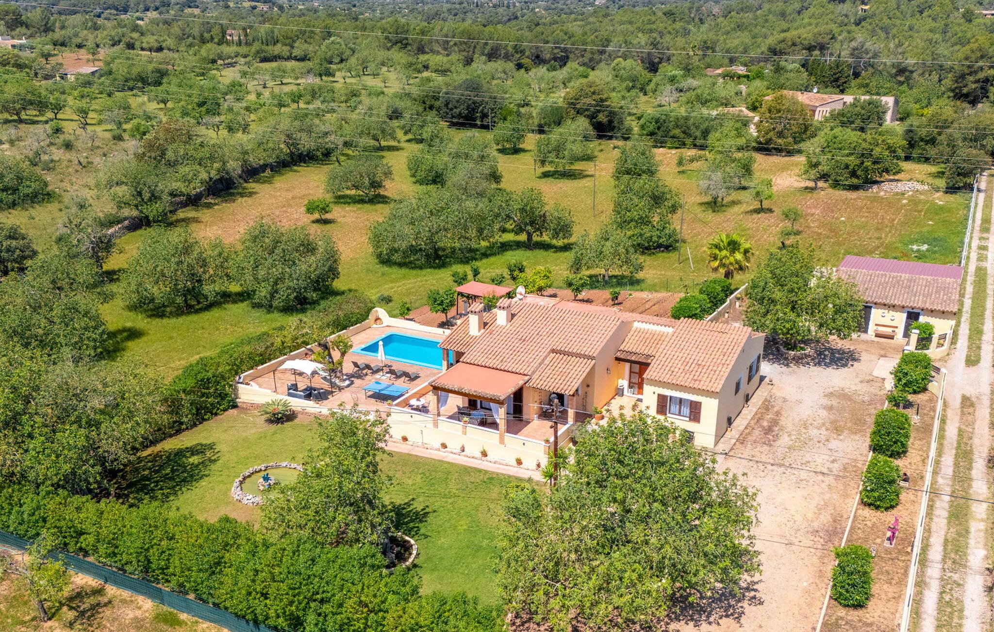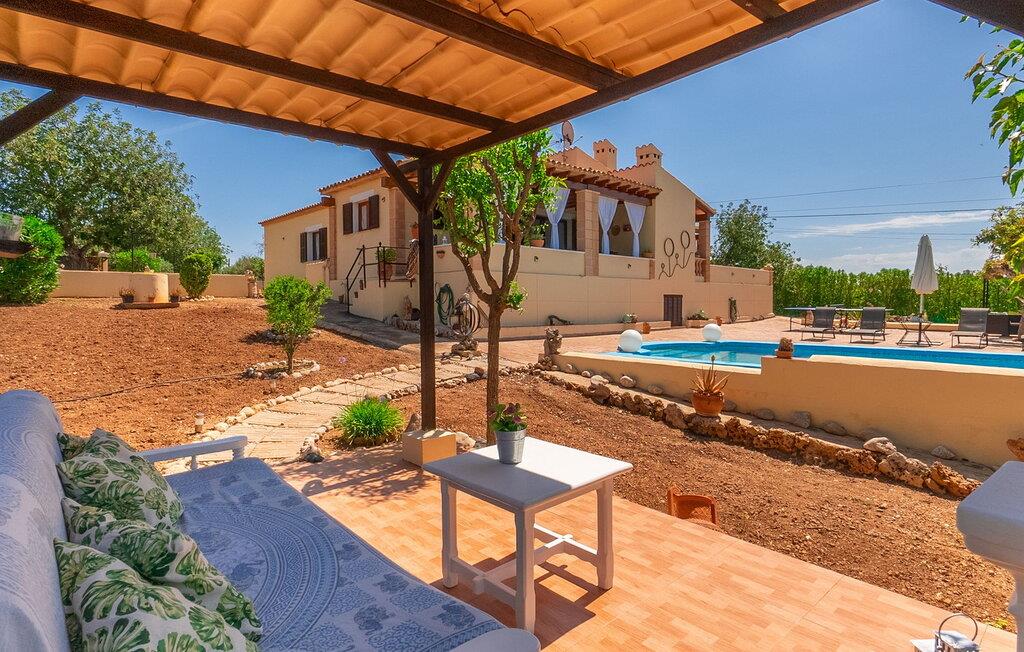 Huse fremkalder atmosfære, hver villa har sin egen atmosfære og karakter. Under vores første besøg i den smarte, trendy villa "Sauma", udstråler huset en absolut berusende følelse af afslapning og glæde, der straks overføres til os fra ejendommen. Vi er derfor meget glade for at kunne præsentere jer for den venlige villa i detaljer og endda tilbyde den til leje til en absolut sensationel pris. Det delikate udtryk i den glat pudsede og abrikosfarvede villa gemmer på et helt moderne og smagfuldt designet boligareal på 240 m². Villaen er omgivet af oliventræer og andre typiske middelhavsgræsser og planter på en 20.000 m² stor grund. Vi bydes velkommen fra den lidt hævede terrasse omkring huset. Der finder I utallige siddepladser samt et rundt, metallisk spisebord med stole i lignende design, med mulighed for afskærmning med baldakin. Vi støder også på en flet lounge sofa; I et andet område af terrassen er der et siddeområde bestående af komfortable træstole og en sofa med en tyk, mørkegrøn pude. Herfra har I udsigt til den smukke lille havedam. Bliver det for varmt, kan I altid tage den store parasol frem og sætte jer i skyggen. Vi kan især godt lide de to gyngestole i træ med blå og hvide sædehynder. Der er en rustik træbænk og en hængekøje til at slappe af under oliventræet - en anden topfunktion efter vores mening. Hvis I kan lide at grille, finder I en indbygget grillplads i det overdækkede område af Villa "Sauma". Grillen er solidt indmuret, foran er der en bar med to taburetter opsat. Så I kan sludre lidt, mens I griller eller fremtrylle en salat eller lignende sammen på bordpladen. Uanset om I rejser alene med hele gruppen - finder alle deres komfortable og afslappende yndlingssted her. Møblerne er beklædt med flotte puder, hvilket giver det et friskt, moderne og særdeles indbydende udtryk. Poolen sammen med den omkringliggende solterrasse, som byder på masser af plads til stilfulde aluminiums liggestole og parasoller til skygge, fuldender dette charmerende tilbud til vores gæster. Det indre af villaen er også indbydende. Gulv til loft vinduer sørger for, at huset bliver oversvømmet med lys. Hvide vægge, synligt træværk i lofterne, lyse gulvfliser og iøjnefaldende lamper understreger villaens lyse og moderne karakter. Fællesstuen har to flotte siddepladser, der er lidt forskudt fra hinanden. Der er et tv-område med en elegant rubinrød lædersofa suppleret med 2 komfortable lænestole betrukket med rubinrødt/hvidt blomstret stof. Det andet sofaområde er udstyret med en lys beige sofa, det røde og hvide blomstermønster fortsætter på tilbehøret og i lænestolene og skaber harmoni gennem gentagelser. I tråd med denne moderne boligtrend er det lange spisebord med rattan-look og glasbordplade også med i stuen. 8 komfortable lænestole giver plads til op til 8 personer. En svingdør i træ fører jer ind i det stilrene køkken med masser af opbevaringsplads i de hvide, højglansbunde, som foroven er beklædt med en fed, lilla bordplade. Rummet får igen den lilla nuance gennem de små mosaikfliser på de ellers hvide fliser og de lilla polstrede stole ved det lille hvide bord. Dette understreger køkkenets bevidst trendy boligtrend. Gangen leger med en asiatisk stil med den lille kommode og trælænestolen med lilla hynde med rosenmønster. De 3 soveværelser er rigtig godt opdelt og kan rumme enten en dobbeltseng eller to enkeltsenge, som det er tilfældet i det lysegrønne værelse. 2 moderne, flisebelagte badeværelser, enten med halvcirkelformet bruser eller badekar med fast bruser, runder villaens gennemgående trendy og moderne standard af. Der er andre charmerende små detaljer, der gør denne absolut moderne villa så utrolig attraktiv for en gruppe rejsende, ikke mindst den fremragende pris. Placeringen i den østlige del af øen nær den smukke by Artà er ikke mindre attraktiv. Artà har charmen fra en typisk mallorcansk lille by med specielle butikker, en smuk markedsplads og fremragende spisemuligheder. Ikke desto mindre har Artà formået at bevare sin autentiske charme. Området er præget af bølgende grønne bakker. De smukke strande, de såkaldte "Calas des Mallorca" langs østkysten, er nemme at nå. Her kan I vælge mellem lettilgængelige strande, der er gode for turister eller helt afsidesliggende naturstrande, der sjældent besøges. Med en lejebil kan I nå disse strande via landevejen - cirka 110 m fra villaen - på få kilometer, så I kan også køre til et badeområde hver dag, selvom I allerede har planlagt jeres dag i en anden aktiv måde, fx med et besøg i Cala Ratjada eller Artà-hulerne, en imponerende drypstensgrotte. Uanset hvordan I bruger jeres dag, vil I altid være glad for at vende tilbage til den vidunderligt ukomplicerede, farverige og trendy villa "Sauma", hvis atmosfære hurtigt vil smitte af på vores feriegæster. Den trendy villa "Sauma" imponerer med sine farverige og muntre, smarte møbler, som skaber en afslappet atmosfære. Denne rummelige villa kan sagtens rumme 6 personer - og det til en absolut sensationel pris. Villaen ligger på en stor grund nær den smukke by Artà, hvor I finder alt hvad I behøver til jeres daglige behov og mere til. Kun få kilometer væk ligger smukke østkyststrande som Sa Marjal eller Cala Bona, så intet står i vejen for en forfriskende svømmetur i Middelhavet.