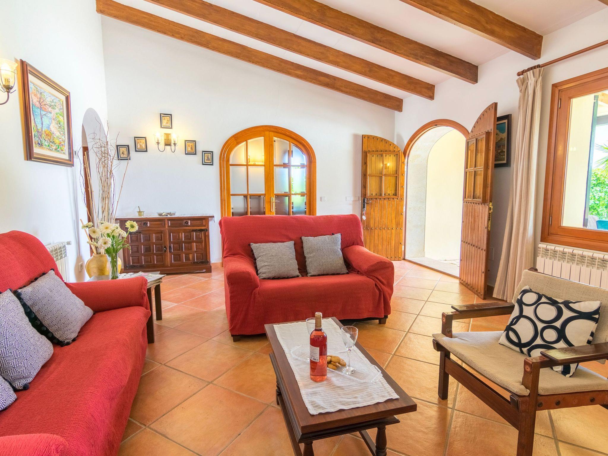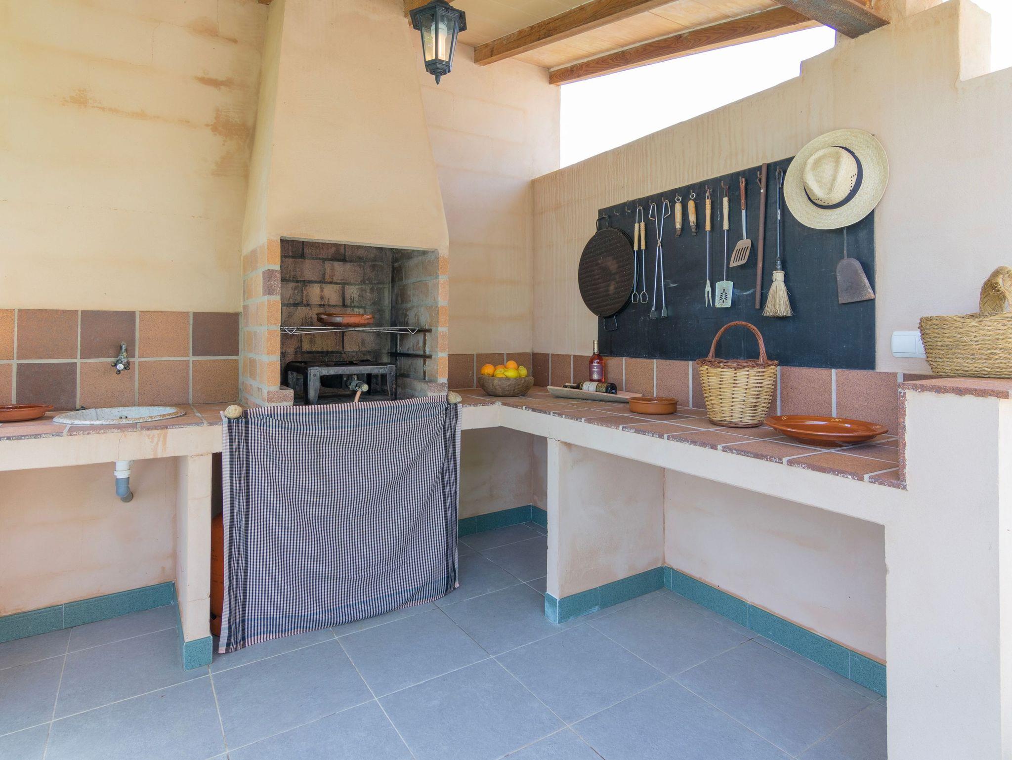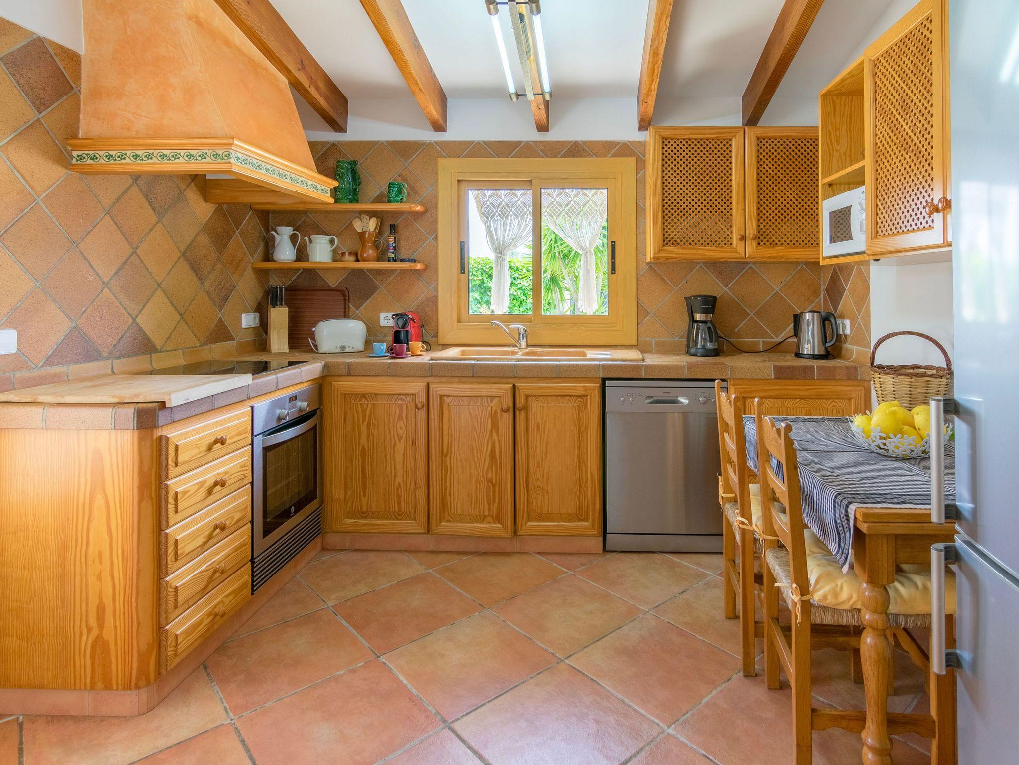 Die voll ausgestattete Küche mit Backofen, Kühl-/Gefrierschrank, Mikrowelle, Kaffeemaschine, Toaster, Wasserkocher und komplettem Kücheninventar ist offen mit dem gemütlichen Wohn- und Essbereich verbunden. Dieser verfügt über Klimaanlage, Kamin und Satelliten-TV. Traditionelle mallorquinische Details wie Holzbalken verleihen dem Haus besonderen Charme und eine warme Atmosphäre.
