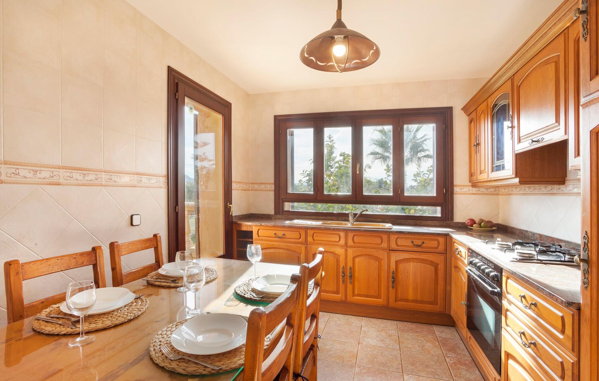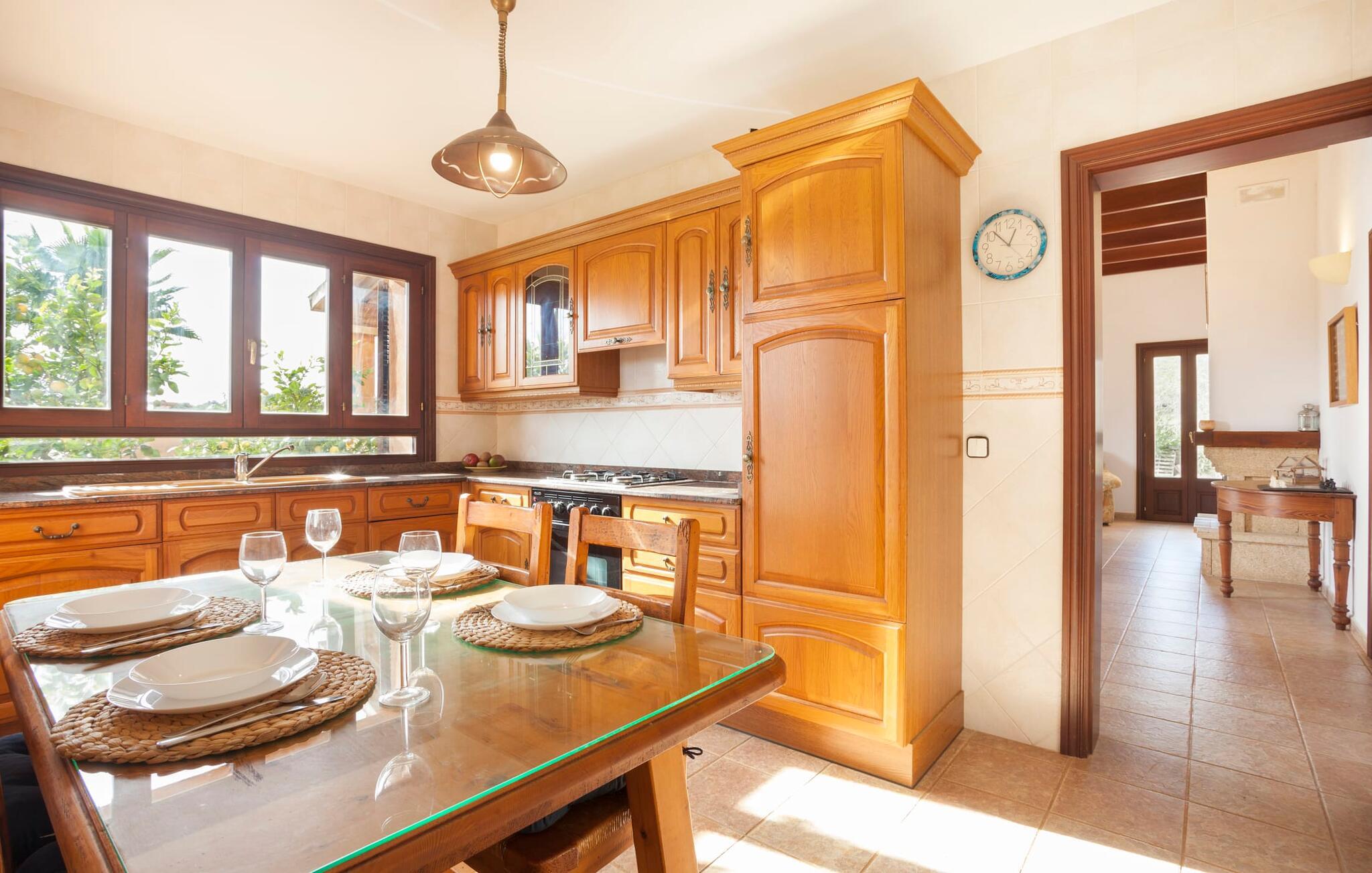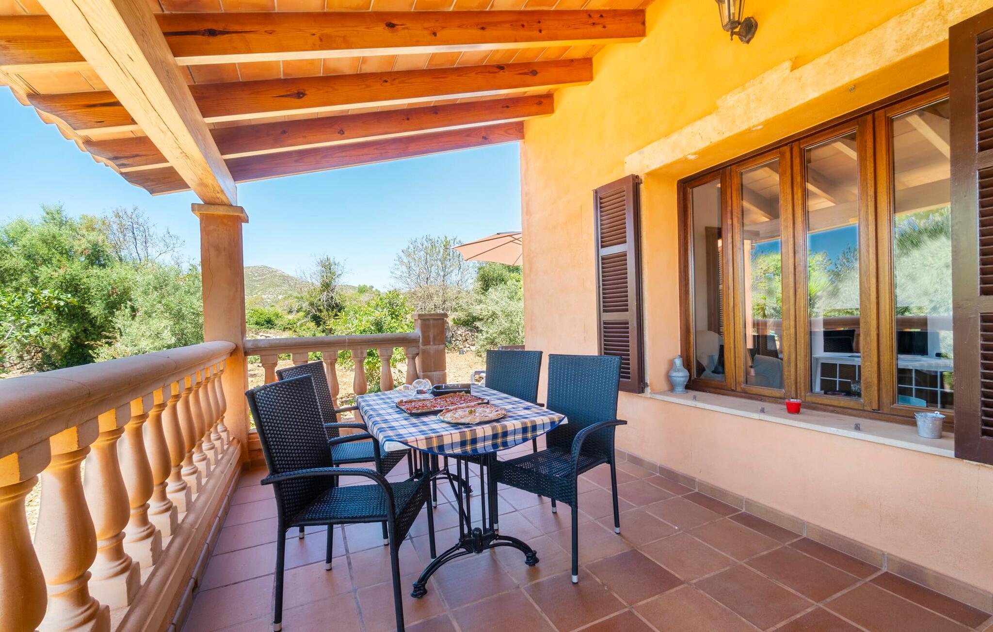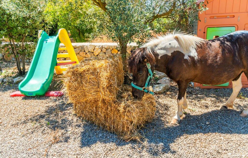 Det ydre af bygningen, som består af stenbrud og honningfarvede gipsflader, kombineret med en middelhavshave fuld af palmer og frugttræer, skaber det harmoniske billede af en rustik villa med naturlig charme. "Ses Camesroges" passer harmonisk ind i det blide landskab. Ved solopgang og solnedgang kan I nyde lysets magi med pastelfarver på de bølgende bakker fra det udendørs opholdsområde. jeres venlige udlejer inviterer gæster til at hjælpe sig selv til frugten fra frugttræerne for at berige deres måltider. Efter en overdådig morgenmad på den overdækkede terrasse kan I gå en tur gennem haven og aflægge et besøg hos villaens gode sjæl, den elskelige pony ved navn Boira. Erfaring har vist, at Boira vil vinde hjerterne hos både vores yngste besøgende og voksne på ingen tid. På jeres gåtur kommer I forbi poolområdet, som ligger lidt længere væk fra hovedhuset. Den forhøjede pool (kaldet Safreig på Mallorca) er tilgængelig via trapper. For lidt afslapning efter svømning venter liggestole på en anden terrasse lige ved siden af huset. Hvis det er nødvendigt, kan I åbne parasollen og fordybe jer i en spændende bog. Interiøret i denne charmerende antikke villa emmer også af forførende optimisme og en imødekommende energi. Her skaber naturmaterialer som træ, terracotta fliser og talrige vinduer behageligt lyse rum i en vellykket blanding af stilarter. Den rummelige stue med storslåede møbler lover hyggelige aftener ved pejsen. Den tilstødende stue med køkken med landstedsinventar byder på endnu en udgang til terrassen - så I kun skal gå et kort stykke, uanset hvor I spiser jeres måltider. I kan tilføje en vis variation til jeres kulinariske aktiviteter ved at lave mad enten på gaskomfuret eller udenfor på grillen. De to soveværelser og et enkeltværelse med masser af opbevaringsplads er ideelle til en familie eller endda fem venner. Mens det store soveværelse har eget badeværelse med badekar og bidet, er det andet badeværelse tilgængeligt for alle gæster og har et stort brusekabine. Neurale keramiske fliser og smukke, håndmalede dekorative kanter tilføjer dygtigt farveaccenter til det autentiske interiør i dette smukke sommerhus, som kan lejes til en overkommelig pris selv i højsæsonen. "Ses Camesroges" ligger i nærheden af middelalderbyen Capdepera. Med sine smalle gader mellem huse dekoreret med blomster, har byen bevaret sin autenticitet. Fra slottet kan I nyde en fantastisk udsigt over kystlandskabet hele vejen til Cala Ratjada. Om sommeren er det livligt og byder på en bred vifte af gode restauranter. På grund af sin nærhed til landevejen, som kun lejlighedsvis er hørbar, er villaen også ideel for strandelskere. Cala Mesquida vil glæde jer ikke kun med sit fine sand og turkise vand, men også med det tilstødende klitlandskab, som kan nås til fods via trægange og ender i en fyrreskov. Som afslutning på jeres spændende ferieudflugter i denne smukke nordøstlige region, kan I trække jer tilbage til jeres usædvanligt indbydende villa og nyde en afslappende aften. Den historiske villa "Ses Camesroges" er beliggende i en behagelig landlig beliggenhed mellem middelalderbyen Capdepera og Cala Mesquida. I kan gøre jeres indkøb kun få kilometer væk i byen i de lokale supermarkeder eller om onsdagen på det ugentlige marked. Stranden i Cala Mesquida med turkisblåt vand og vidunderlige bølger kan nås på mindre end 10 minutter. Andre naturlige strande inviterer til aktive besøg.