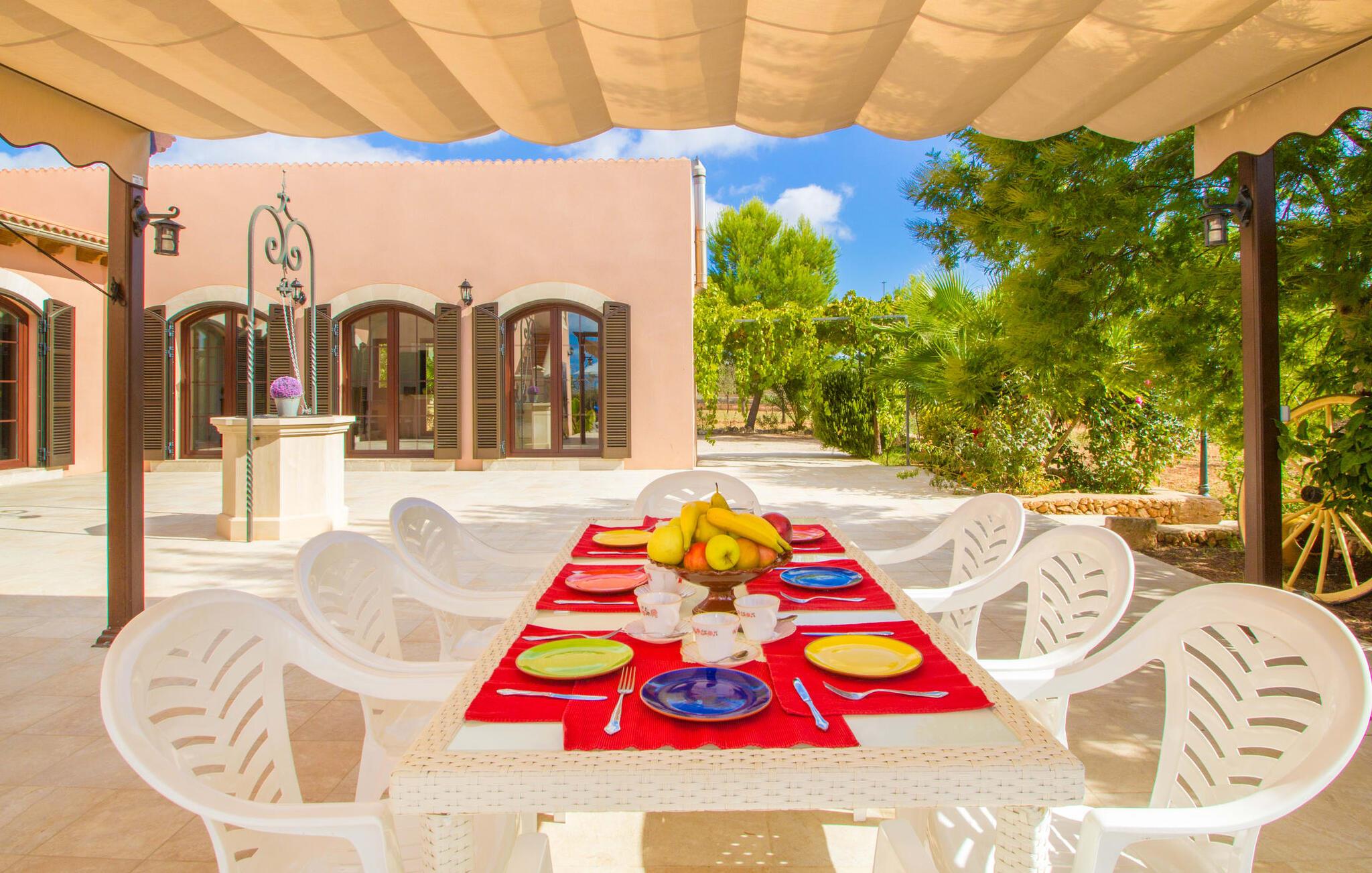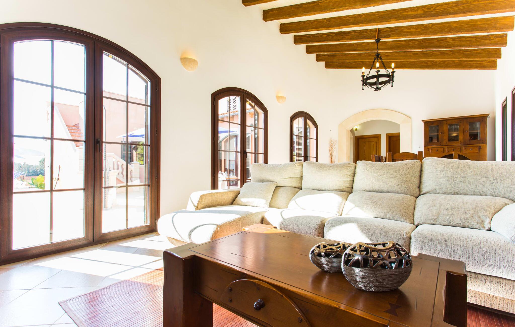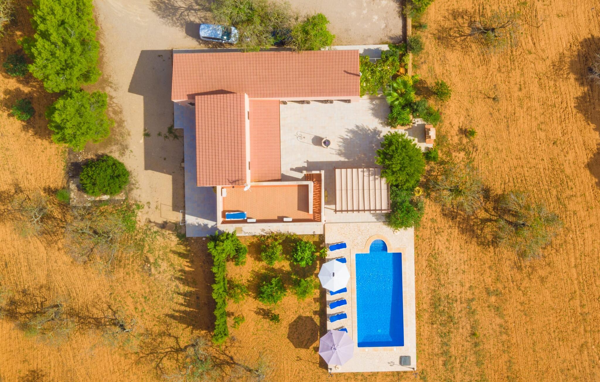 For at fange ejendommens fulde skønhed med et øjeblik, skal I nærme jer villaen "Ses Comunes" fra luften. Bygningen står som en lyserød flamingo med udstrakte vinger på den okkerfarvede mallorcanske jord, den blå pool i midten af den velholdte ejendom skinner så klart som en afrikansk sø. Træer og marker synes at fortsætte i endeløse rækker helt til bjergene; Man kunne næsten overse, at andre landsteder har slået sig ned på denne vidunderlige lille ø-spot, og at asfalterede veje fører til smukke destinationer, der efterlader den blide lyd af en motor. I vil føle, at I er på fri fod, især når I sidder på terrassen ved den gamle brønd, i læ for vinden og flankeret af 6 store buede glasdøre, der slipper masser af lys ind i interiøret. Hvem kunne ikke nyde de lækkerier, der bliver bragt på bordet fra grillhytten? Mens kødet stadig koger, kan I smide et par bolde i basketballkurven, træne på tagterrassen eller svømme et par længder i poolen – udnyt pladsen! Har vi vækket jeres appetit på et kig indenfor endnu? Hvilke farver og hvilke møbler gemmer sig bag disse glasdøre? Lad os først se på stuen/spisestuen: jordnær, rustik, hyggelig. Masser af plads til at strække ud, synke ned i pejsesofaernes dybe puder og se en film på en skærm, der næsten er på størrelse med en hjemmebiograf. Køkkenet er desuden rummeligt og jordnært; I kan brødføde en hær med denne perle af et komfur, der fuldstændig gør den udendørs grill til skamme. De to dobbeltværelser udstråler komfort med deres varme farver og massive træmøbler; Blomster eller bølger – hvad får jer hurtigst til at sove? Tingene er lidt sværere i dobbeltværelserne - i hvert fald for de voksne: Er opkvikkende farver lige det, I skal bruge for at hoppe ud af sengen om morgenen, eller vil I hellere glide lidt mere behageligt over det dybe blå hav om natten? oplyst af den meget originale sejlbådslampe? At dele to badeværelser er også nemmere, hvis I har både natteravner og morgenlærker med i gruppen – og på ferien er det lige meget, om I går i bad før eller efter jeres første kop kaffe. Lyst til mallorcanske specialiteter? Den landlige by Campos har ikke kun et middelalderligt bymidte og imponerende stenbygninger at byde på - I kan også finde vidunderlige delikatesser på ostmejeriet Burguera og Pasteleria Pomar. Med køer og vindmøller på næsten hvert hjørne, er tempoet her bestemt roligt. For at indvarsle ændringerne kan en tur til Colonia de Sant Jordi varmt anbefales. Fra havnen kan I tage en 30-minutters bådtur til Cabrera (bogstaveligt talt "gede-ø"). Dyk ned i det krystalklare vand, besøg slottet og Nationalmuseet og opdag det fortryllende lys fra Den Blå Grotte, der ikke er mindre betagende end den i Capri. For dem, der foretrækker at blive på land, lover Es Trenc, den længste naturlige strand på øen (vest for Sant Jordi), en ubekymret dag med svømning. I havde jo en velfyldt picnickurv med fra Campos... Fra Palma lufthavn tager vi sydpå mod solen. Cirka 5 minutter fra byen Campos finder I middelhavsvillaen "Ses Comunes", spredt mellem træer, marker og spredte landejendomme. Fra tagterrassen har I en vidunderlig udsigt over bjergene og I kan endda se den lille ø Cabrera i det glitrende hav. På vej til kysten er Santanyi, Ses Salines og Colonia de Sant Jordi et besøg værd; Naturreservater og smukke sandstrande som Es Trenc er næsten lige uden for døren.