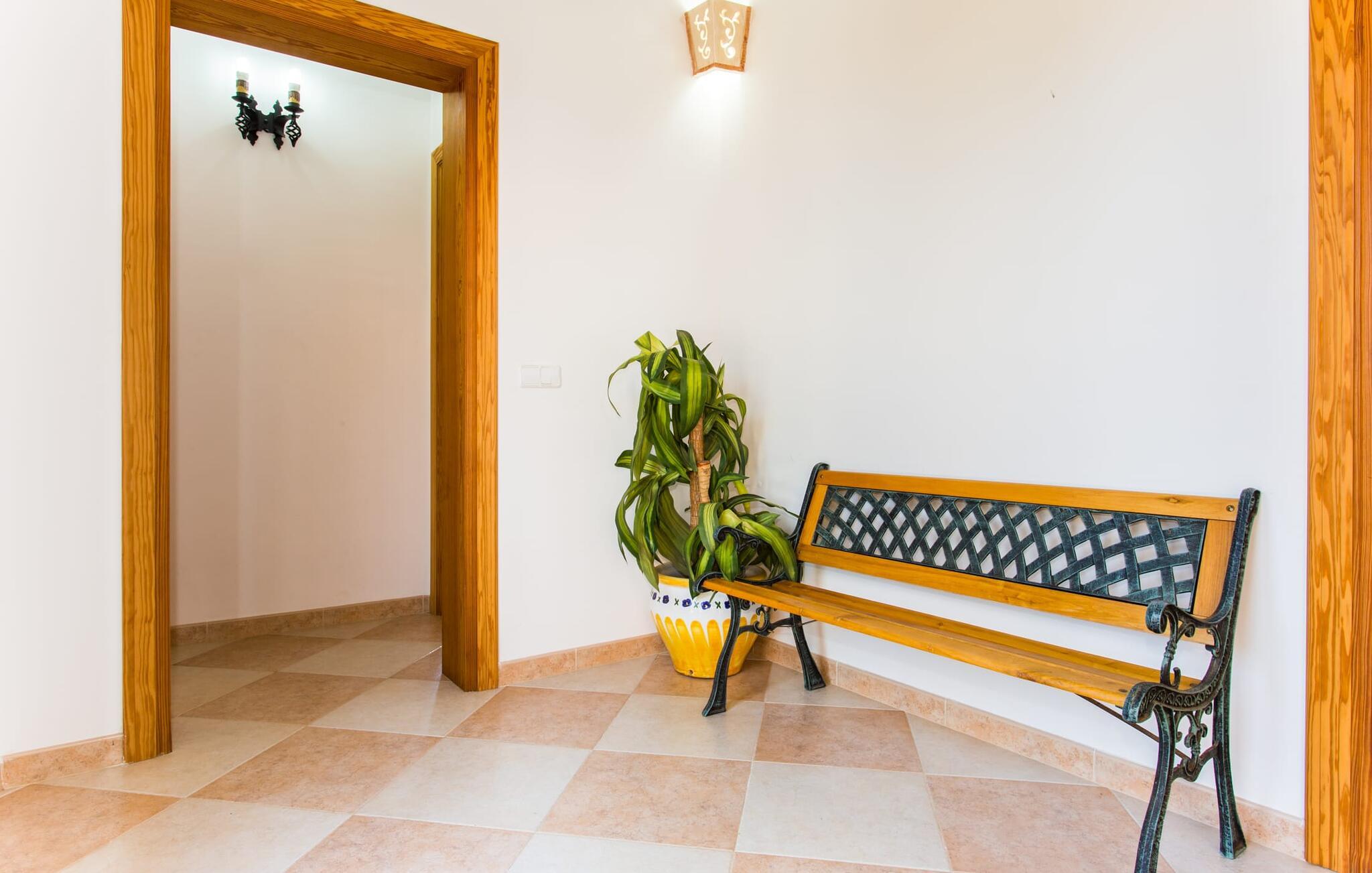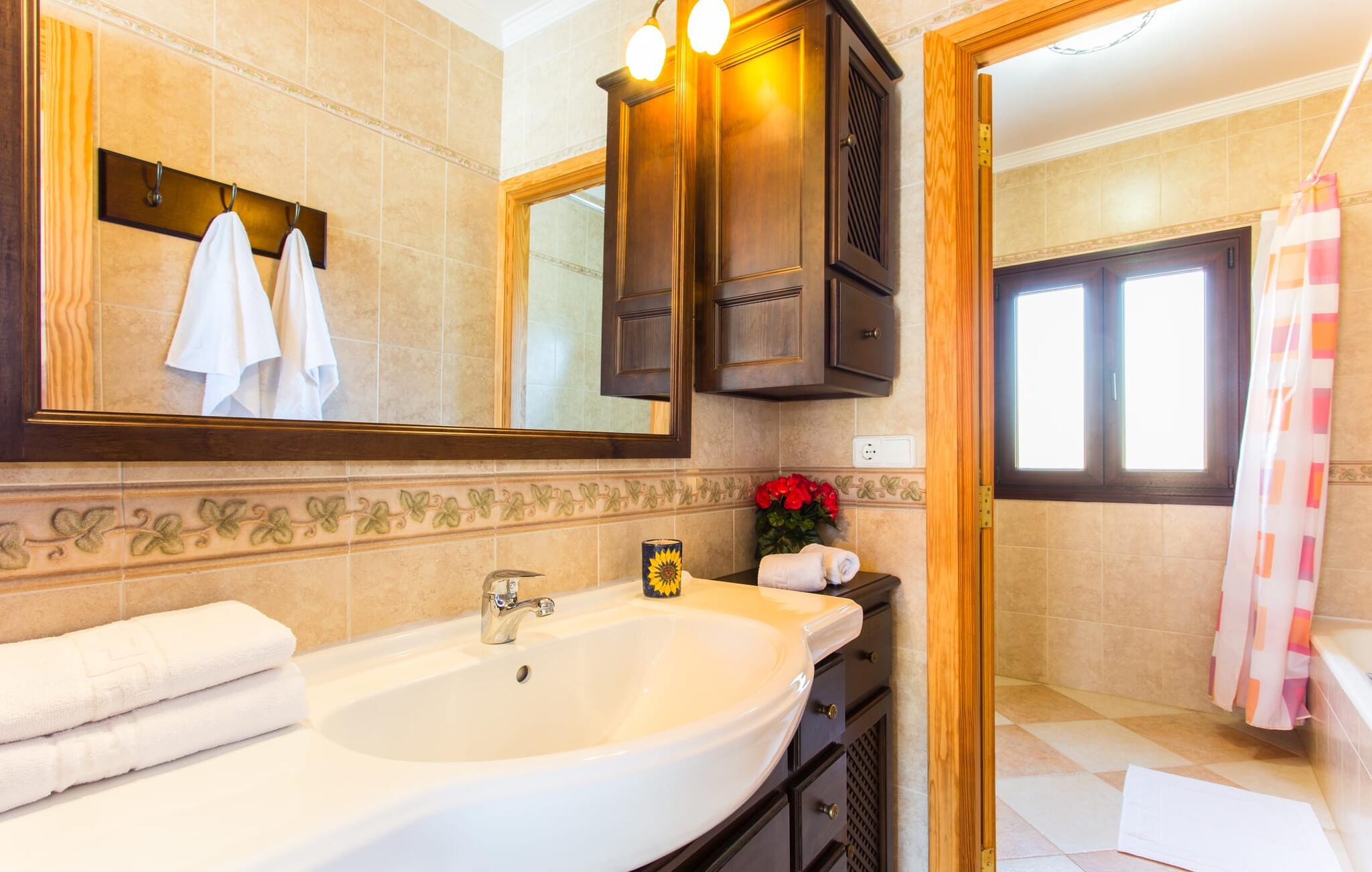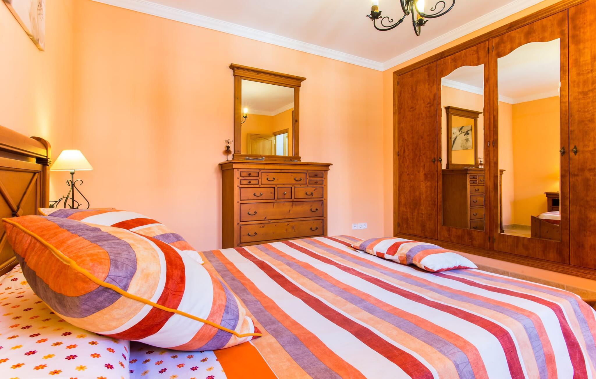 For at fange ejendommens fulde skønhed med et øjeblik, skal I nærme jer villaen "Ses Comunes" fra luften. Bygningen står som en lyserød flamingo med udstrakte vinger på den okkerfarvede mallorcanske jord, den blå pool i midten af den velholdte ejendom skinner så klart som en afrikansk sø. Træer og marker synes at fortsætte i endeløse rækker helt til bjergene; Man kunne næsten overse, at andre landsteder har slået sig ned på denne vidunderlige lille ø-spot, og at asfalterede veje fører til smukke destinationer, der efterlader den blide lyd af en motor. I vil føle, at I er på fri fod, især når I sidder på terrassen ved den gamle brønd, i læ for vinden og flankeret af 6 store buede glasdøre, der slipper masser af lys ind i interiøret. Hvem kunne ikke nyde de lækkerier, der bliver bragt på bordet fra grillhytten? Mens kødet stadig koger, kan I smide et par bolde i basketballkurven, træne på tagterrassen eller svømme et par længder i poolen – udnyt pladsen! Har vi vækket jeres appetit på et kig indenfor endnu? Hvilke farver og hvilke møbler gemmer sig bag disse glasdøre? Lad os først se på stuen/spisestuen: jordnær, rustik, hyggelig. Masser af plads til at strække ud, synke ned i pejsesofaernes dybe puder og se en film på en skærm, der næsten er på størrelse med en hjemmebiograf. Køkkenet er desuden rummeligt og jordnært; I kan brødføde en hær med denne perle af et komfur, der fuldstændig gør den udendørs grill til skamme. De to dobbeltværelser udstråler komfort med deres varme farver og massive træmøbler; Blomster eller bølger – hvad får jer hurtigst til at sove? Tingene er lidt sværere i dobbeltværelserne - i hvert fald for de voksne: Er opkvikkende farver lige det, I skal bruge for at hoppe ud af sengen om morgenen, eller vil I hellere glide lidt mere behageligt over det dybe blå hav om natten? oplyst af den meget originale sejlbådslampe? At dele to badeværelser er også nemmere, hvis I har både natteravner og morgenlærker med i gruppen – og på ferien er det lige meget, om I går i bad før eller efter jeres første kop kaffe. Lyst til mallorcanske specialiteter? Den landlige by Campos har ikke kun et middelalderligt bymidte og imponerende stenbygninger at byde på - I kan også finde vidunderlige delikatesser på ostmejeriet Burguera og Pasteleria Pomar. Med køer og vindmøller på næsten hvert hjørne, er tempoet her bestemt roligt. For at indvarsle ændringerne kan en tur til Colonia de Sant Jordi varmt anbefales. Fra havnen kan I tage en 30-minutters bådtur til Cabrera (bogstaveligt talt "gede-ø"). Dyk ned i det krystalklare vand, besøg slottet og Nationalmuseet og opdag det fortryllende lys fra Den Blå Grotte, der ikke er mindre betagende end den i Capri. For dem, der foretrækker at blive på land, lover Es Trenc, den længste naturlige strand på øen (vest for Sant Jordi), en ubekymret dag med svømning. I havde jo en velfyldt picnickurv med fra Campos... Fra Palma lufthavn tager vi sydpå mod solen. Cirka 5 minutter fra byen Campos finder I middelhavsvillaen "Ses Comunes", spredt mellem træer, marker og spredte landejendomme. Fra tagterrassen har I en vidunderlig udsigt over bjergene og I kan endda se den lille ø Cabrera i det glitrende hav. På vej til kysten er Santanyi, Ses Salines og Colonia de Sant Jordi et besøg værd; Naturreservater og smukke sandstrande som Es Trenc er næsten lige uden for døren.