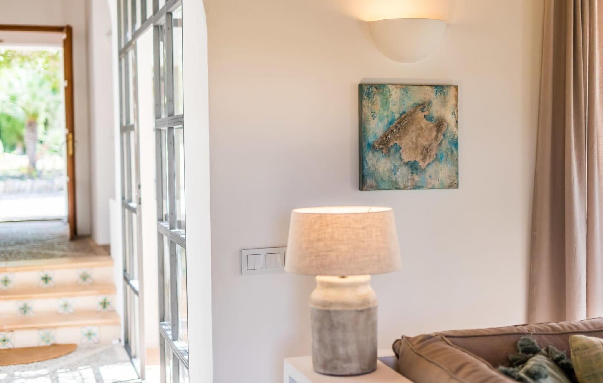 Fincaen "Ses Eretes" ligger midt i en særlig idyllisk have med alle slags hyggelige steder - det gør den til en ideel destination for alle, der søger fred og ro, og som ønsker en all-round æstetisk stemning til deres ferie på Mallorca. I den delvise skygge af ejendommen er der mandel- og oliventræer og små springvand, høje palmer og cypresser giver en typisk ø-stemning. Små stier lavet af natursten løber gennem den rummelige have, som er rig på middelhavsbuske, kaktusarter og blomstrende planter. Føl jer godt tilpas på den stilfulde daybed og nyd den fantastiske udsigt over det omkringliggende landskab med dets grønne, bølgende bakker. Måske får I selskab af de to søde katte, der hører til fincaen. Så snart I har lyst til at køle af, kan I glide ned i den smukke pool, som er så lang, at selv sportslige svømmere vil blive begejstrede. Senere er den overdækkede terrasse det ideelle sted at nyde alle de kulinariske lækkerier, der kan findes på Artàs ugentlige marked. Et glas vin fra en mallorcansk bodega passer vidunderligt til.