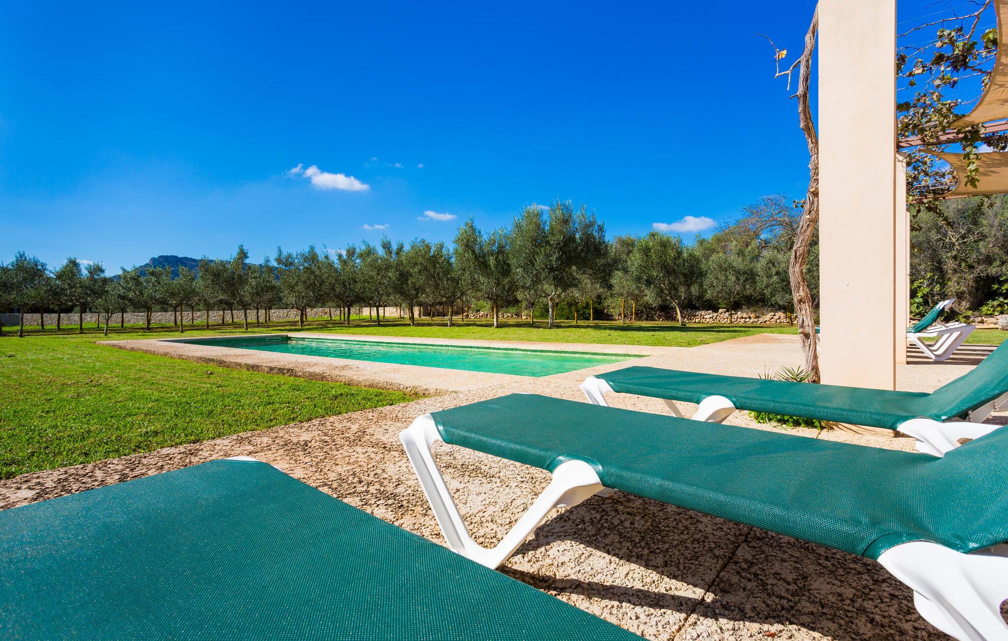 Malerisk indlejret i det grønne landskab i kystsamfundet Son Servera, tilbyder denne moderne villa det ideelle tilflugtssted for feriegæster, der søger fred og afslapning i landlige omgivelser, men også ønsker at køre ad sideveje til de smukke badebyer på østkysten med deres mange forskellige aktiviteter. Den yderst velbevarede ejendom er beklædt med oliventræer, som understreger middelhavsstemningen i naturstensfincaen. Den smukke, åbne plads fungerer også som en græsplæne til at fange solen, samt et godt sted for børn at løbe rundt. Udeområdets store højdepunkt er naturligvis den glitrende turkise pool, som ligger perfekt på den store solterrasse (10 m lang, tilgængelig via brede trin, maksimal dybde mellem 0,60 m og 1,60 m). Her kan I lægge hverdagen langt bag jer, tage et par forfriskende svømmeture og derefter slappe af i den mallorcanske sol på en af liggestolene ved poolen. For at læse lidt ferielæsning eller have en lille snack efter at have brugt tid ved poolen, kan I gøre jer rigtig godt tilpas på terrassen under markiserne draperet med vinstokke. Til siden af huset er der endnu en halvåben terrasse med spisebord og en fantastisk udsigt over de bølgende bakker i det fjerne. Udover køkkenet og med en stor grill er dette et dejligt rum, perfekt til udendørs spisning sammen. Interiøret i villaen "Ses Fonolleres" har et harmonisk rumligt design - moderne og alligevel varmt. Villaen er oversvømmet med lys gennem de mange gulv-til-loft vinduer og adgangsdøre til haven. Rummet i stueetagen er særligt imponerende. Høje hvælvede lofter understreger den rummelige følelse, mens runde buer giver indtryk af en flydende kombination af ophold, spisning og madlavning. Hylder og belysningselementer indbygget i væggene tjener et praktisk og æstetisk formål i hele villaen. Det fuldt udstyrede køkken med ø og disk giver plads til alle til at hjælpe med at tilberede måltider. Har I lyst til at underholde, eller vejret ikke er godt, kan I slappe af i sofaen foran fladskærms-tv'et eller se en spændende dvd sammen. Tre soveværelser (1 x med dobbeltseng, 2 x med to enkeltsenge, masser af opbevaringsplads) tilbyder en afslappende, fredelig søvn. Værelserne har typisk mallorcansk indretning med kridhvide vægge og traditionelle bjælkelofter. Det ene af de to badeværelser med naturligt lys i stueplan er adskilt og er derfor praktisk som gæstebadeværelse. En bred trappe fører fra indgangspartiet til øverste etage. I et lille galleri er der en sofa, hvor I kan nyde en bog. Bag galleriet ligger det tredje soveværelse med tilhørende badeværelse og direkte udgang til altanen, som byder på en vidunderlig, uhindret udsigt over det omkringliggende landskab. Havde I tid nok til at nyde komforten i villaen? Vil I have lidt strandsjov? I er kun 12 minutters gang fra Cala Bona, hvor adskillige aktiviteter og faciliteter er tilgængelige. Den nærliggende bugt er velegnet til familier med små børn - bølgebrydere markerer et eksklusivt badeområde med en svag skråning, der fører til dybere vand. Er større bølger og mindre travlhed mere jeres ting? Derefter tager vi til Sa Marjal strand med en smuk udsigt over det grønne landskab. Det lokkende turiststed Cala Millor, med en attraktiv shoppingpromenade og et bredt udvalg af barer, caféer og restauranter, ligger kun 5 minutter fra villaen. For at lære stedet lidt bedre at kende og nyde helt friske produkter og mallorcanske specialiteter, anbefaler vi, at I tager et kig på det ugentlige marked i Son Servera, som finder sted fredag eftermiddag. Denne smukke villa ligger på en 8.000 m² stor grund i en solrig, sydvendt beliggenhed i et landligt område på den sydlige del af øen. På grund af de landlige omgivelser nyder dette sted absolut fred, selvom det kun ligger et stenkast fra badebugter som Cala Bona og andre smukke sandstrande. Den lille by Son Servera og den nærliggende kystby Cala Millor ligger kun 5 minutter væk i bil og byder på shopping og restauranter.