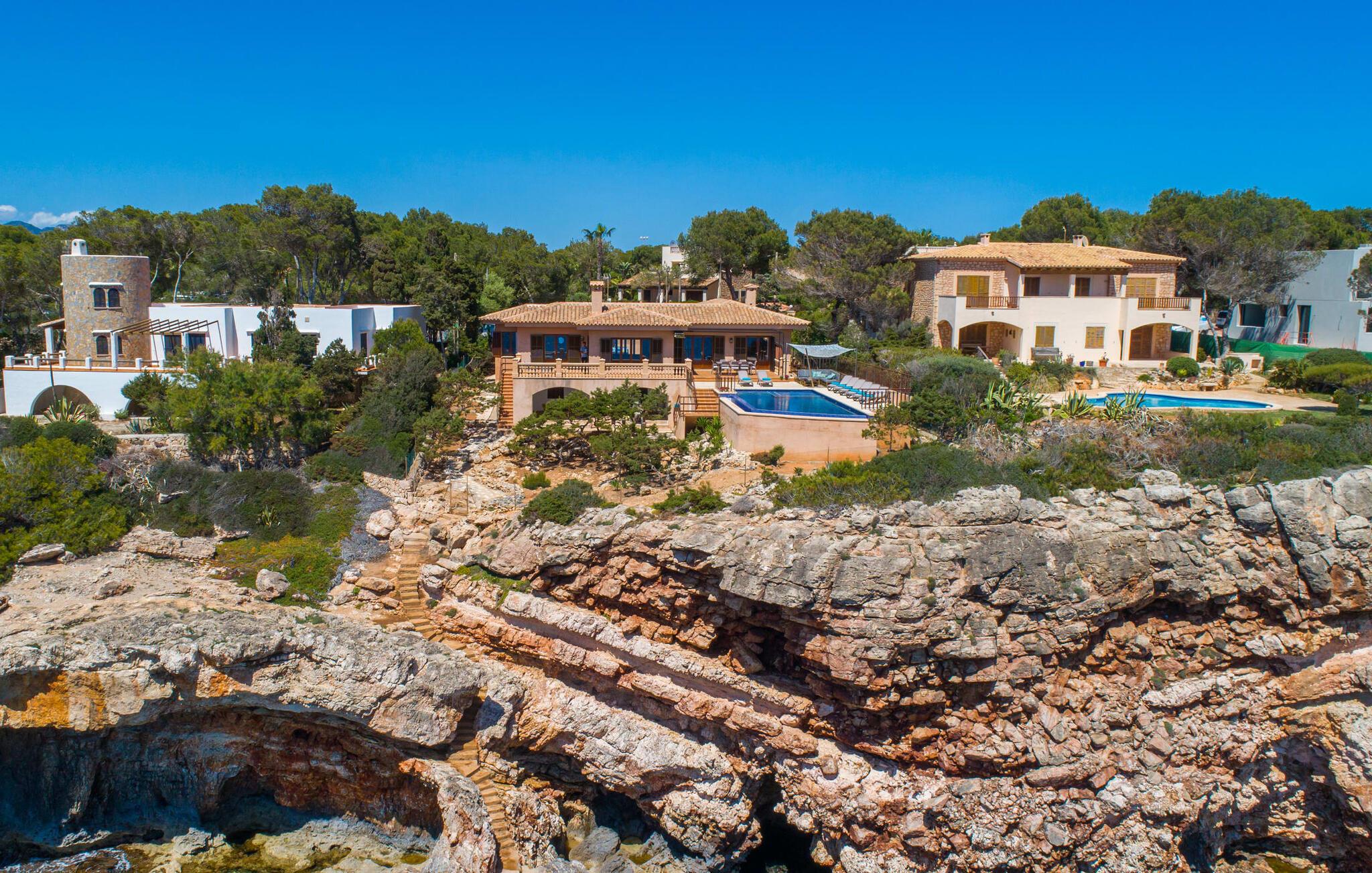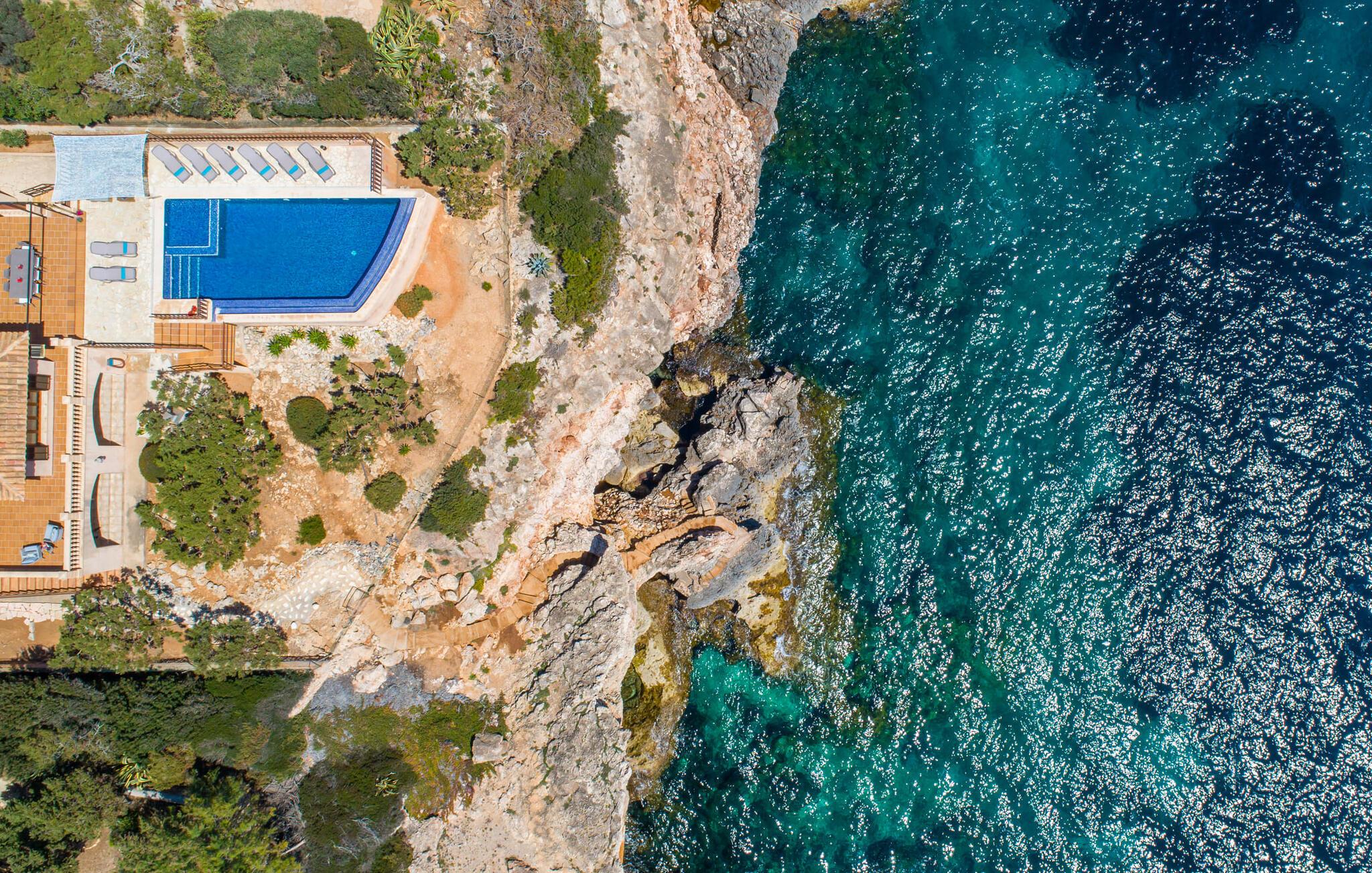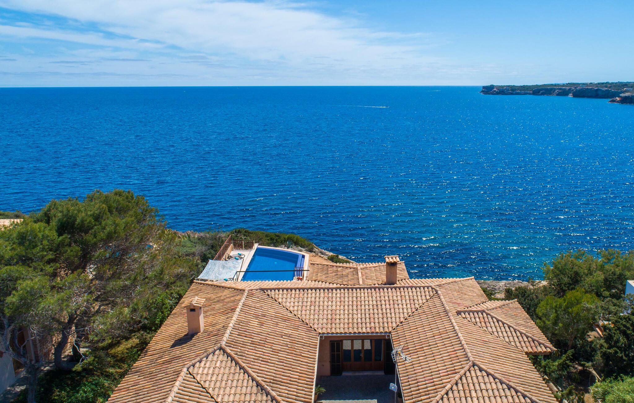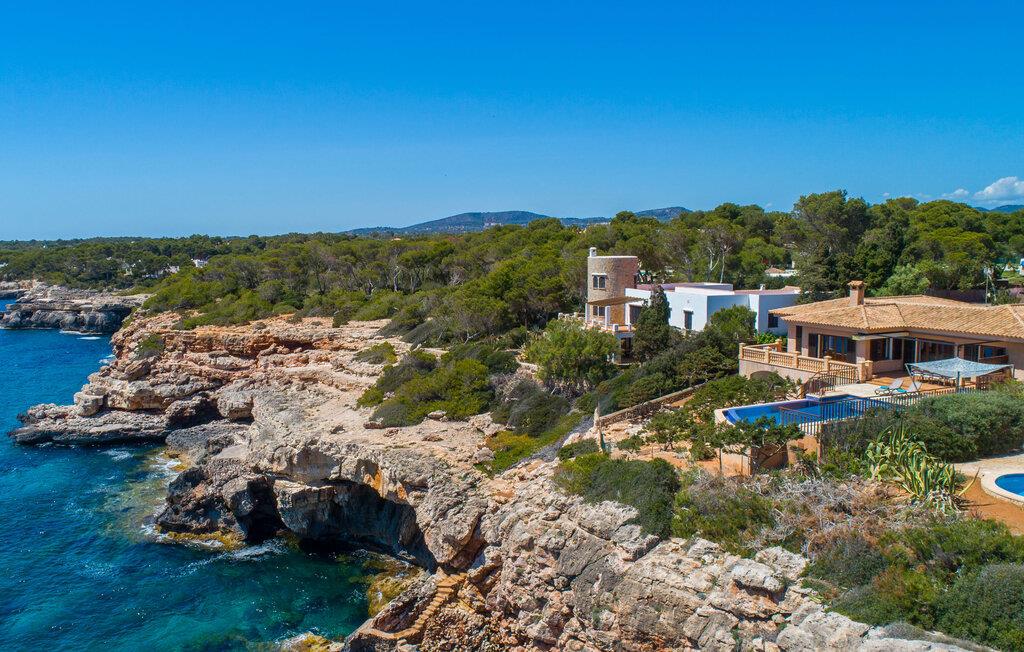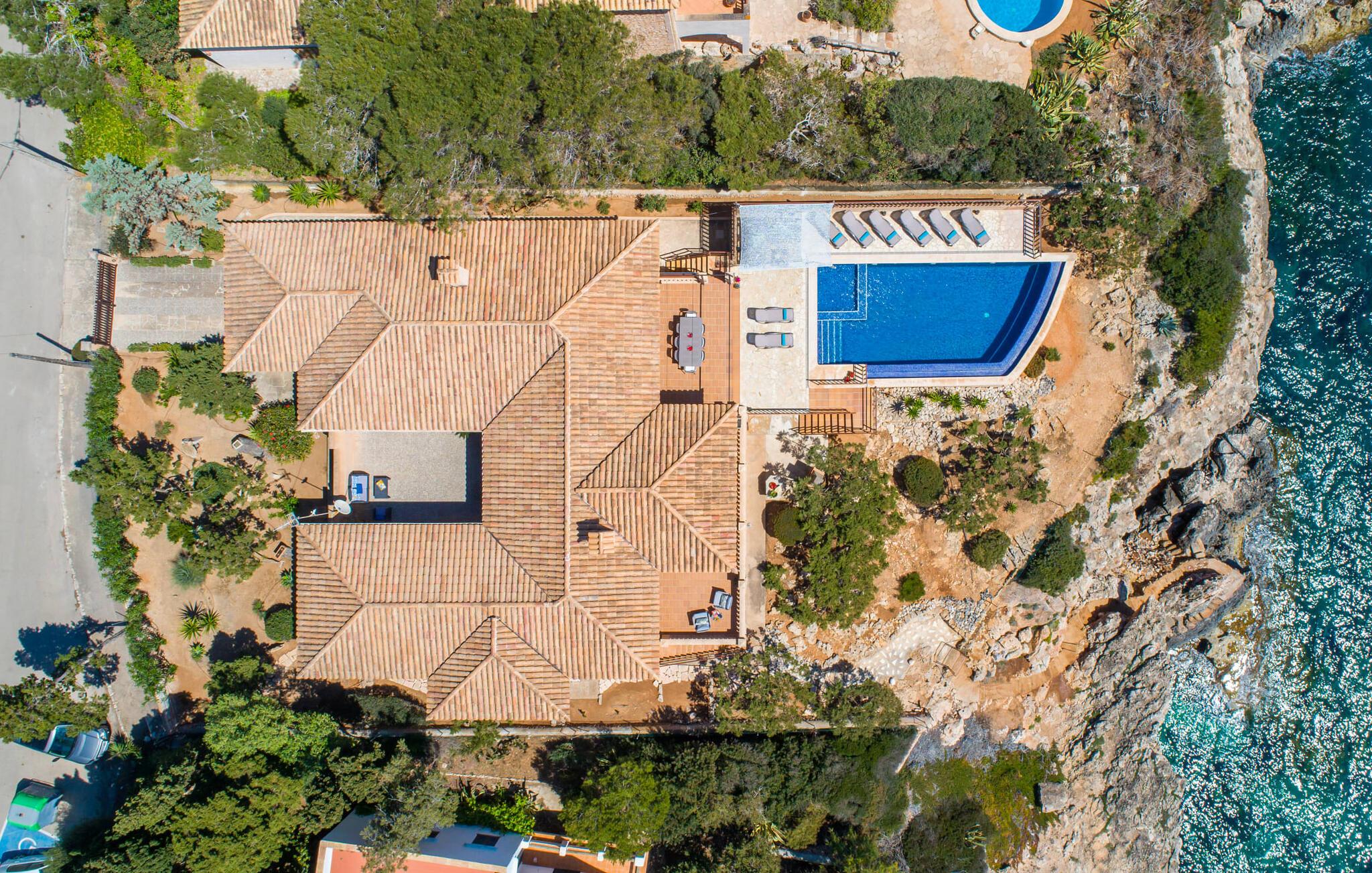 Med sit slående navn refererer den drømmeagtige villa "Ses Penyes Rotges" til et bemærkelsesværdigt naturskue - fordi det ligger direkte på de berømte røde klipper i den sydlige kystsektion mellem Portopetro og Mondragó Naturpark. Som ejendom i en eksklusiv urbanisering med lidt gennemkørende trafik, nyder I godt af en virkelig førsteklasses beliggenhed med kun få naboer. En smal sti og trin hugget ind i klipperne fører jer direkte til jeres private indgang til havet. Fra sommerhuset kan I nyde den frie udsigt til det funklende blå fra morgen til aften - enten fra en af de talrige altaner eller fra de rummelige overdækkede terrassearealer, hvor I kan opleve bordtennis og grill på en helt ny måde. Den kølige infinity-pool ser ud til at flyde direkte ud i Middelhavet og sikrer eksklusiv badeglæde. For de yngre gæster er der en ekstra børnepool, der erstatter soppebassinet. På trods af placeringen over klippeklipperne er hele området behageligt grønt. Denne typiske kystflora går igen i haveområdet med fyrretræer og kaktusser. Bemærk venligst, at adgang til havet ikke kan garanteres i tilfælde af dårligt vejr eller kraftig vind og ujævn hav. Ejerne vil så ikke bygge trappen. Hvis I gerne vil selvforplejning i dette vidunderlige sommerhus, så tag til fiskerlandsbyen Portopetro eller til de ugentlige markeder i den beboelige sydlige del af øen. I kan lave mad i det fuldt udstyrede køkken med et tidløst design og servere middelhavskøkkenets delikatesser via lugen direkte i den smarte spisestue. Den lyse og rummelige rumindretning med åben stue og spiseplads samt fire rummelige soveværelser understreges af et harmonisk farvevalg. Det lyse design med grå gulvfliser er kombineret med varme trætoner. Den moderne stil kombinerer den kølige adel af en maritim villa med typisk mallorcansk pragmatisme. Takket være de fuldt klimatiserede soveværelser kan I ikke bare håbe på en kølig brise fra havet. Tre moderne badeværelser, to af dem en suite, inviterer jer til at tage et brusebad. En af dem med et dobbeltværelse kan kun nås via den spanske terrasse med et ekstra loungehjørne. Flyd væk i dette perfekte sommerhus med op til otte personer, eller vær aktiv med båd- eller kajakudlejning, tag på fisketur eller tag en dukkert i havet. Spil bordtennis eller, hvis I foretrækker noget lidt mere generøst, besøg den nærliggende tennisbane - "Ses Penyes Rotges" tilbyder jer fantastiske rammer for jeres individuelle ferie! Den eksklusive villa "Ses Penyes Rotges" med pool og talrige terrasser er en sand juvel blandt mallorcanske feriehuse. Det ligger på den første kystlinje i den sydlige del af øen nær fiskerbyen Portopetro. Beliggende på kanten af en udsøgt urbanisering, vil I nyde en spektakulær udsigt over havet. I kan gøre jeres indkøb i de omkringliggende landsbyer eller tage på udflugter til de smukkeste steder i syd som Santanyí eller Cala D'Or. For at svømme i havet går I ned ad en privat sti med et par trin til badestigen indlejret i klippen. Aircondition i soveværelserne er inkluderet i prisen, men brugen er begrænset til mellem kl. 22.00 og kl. Gebyret afregnes herefter kontant på stedet.