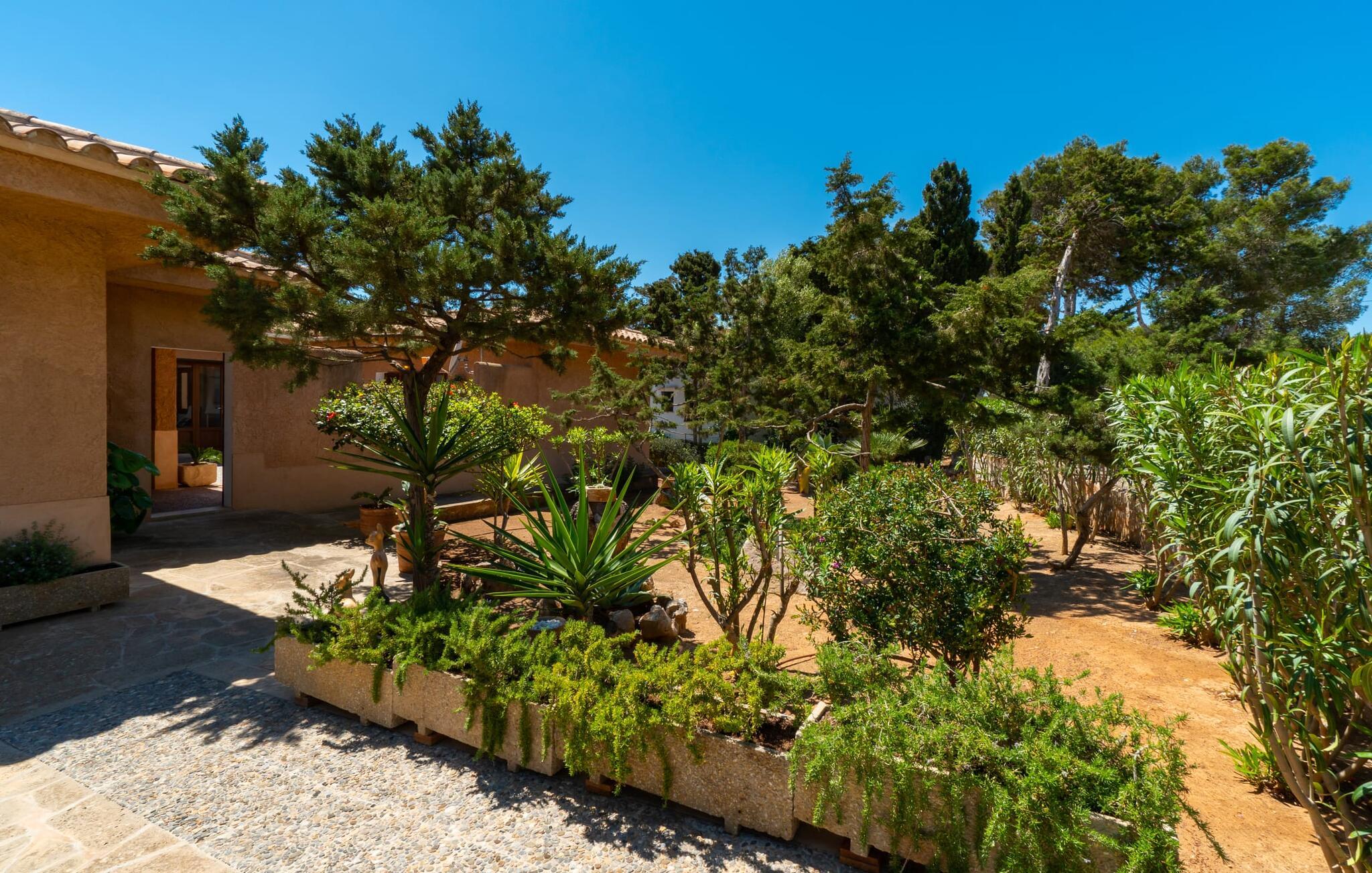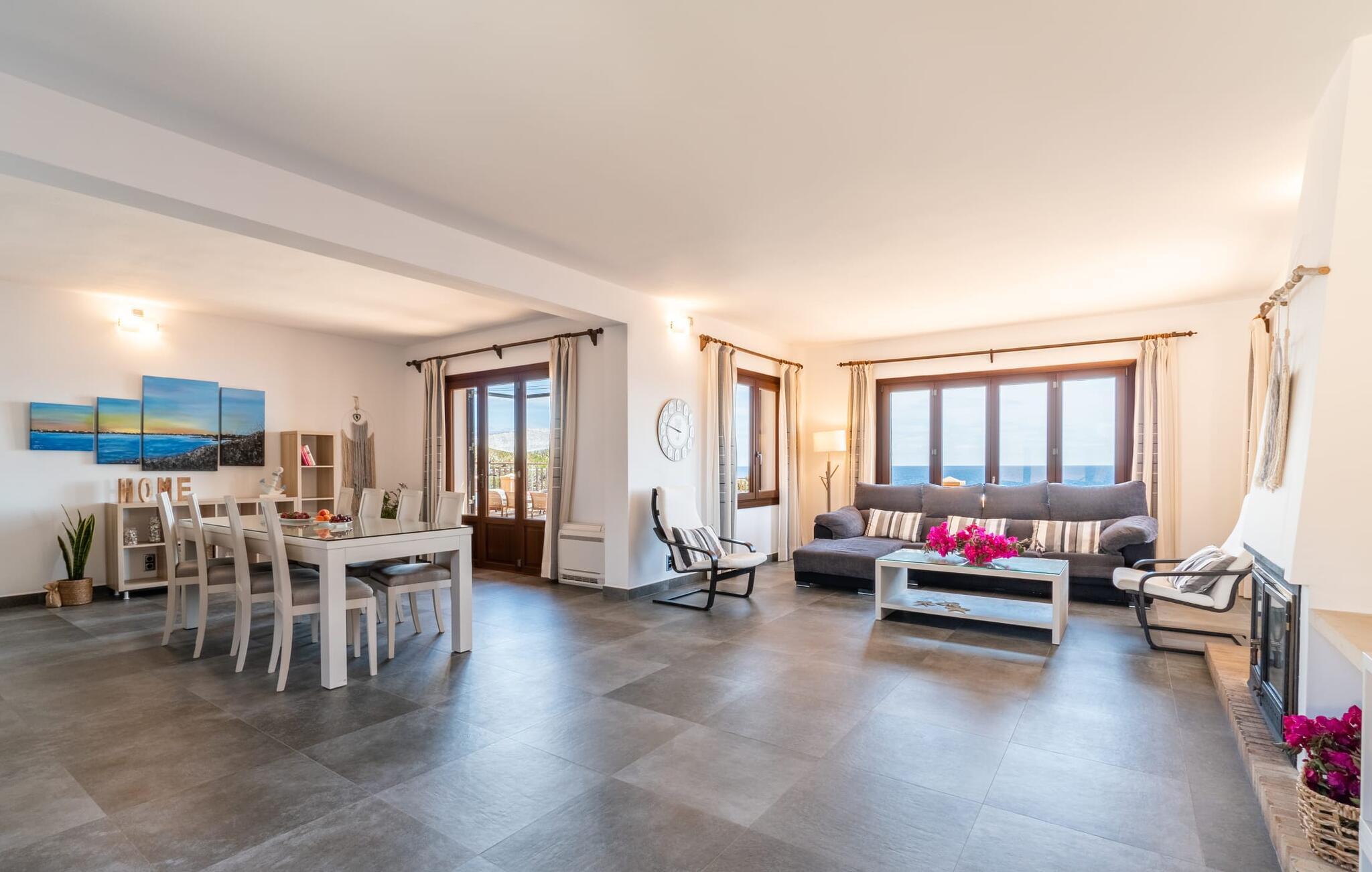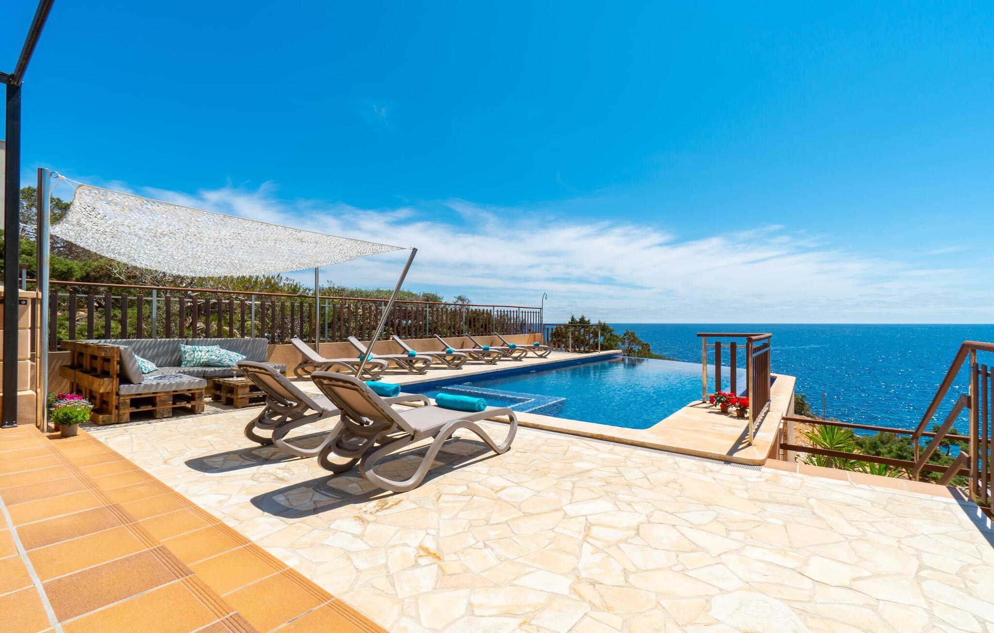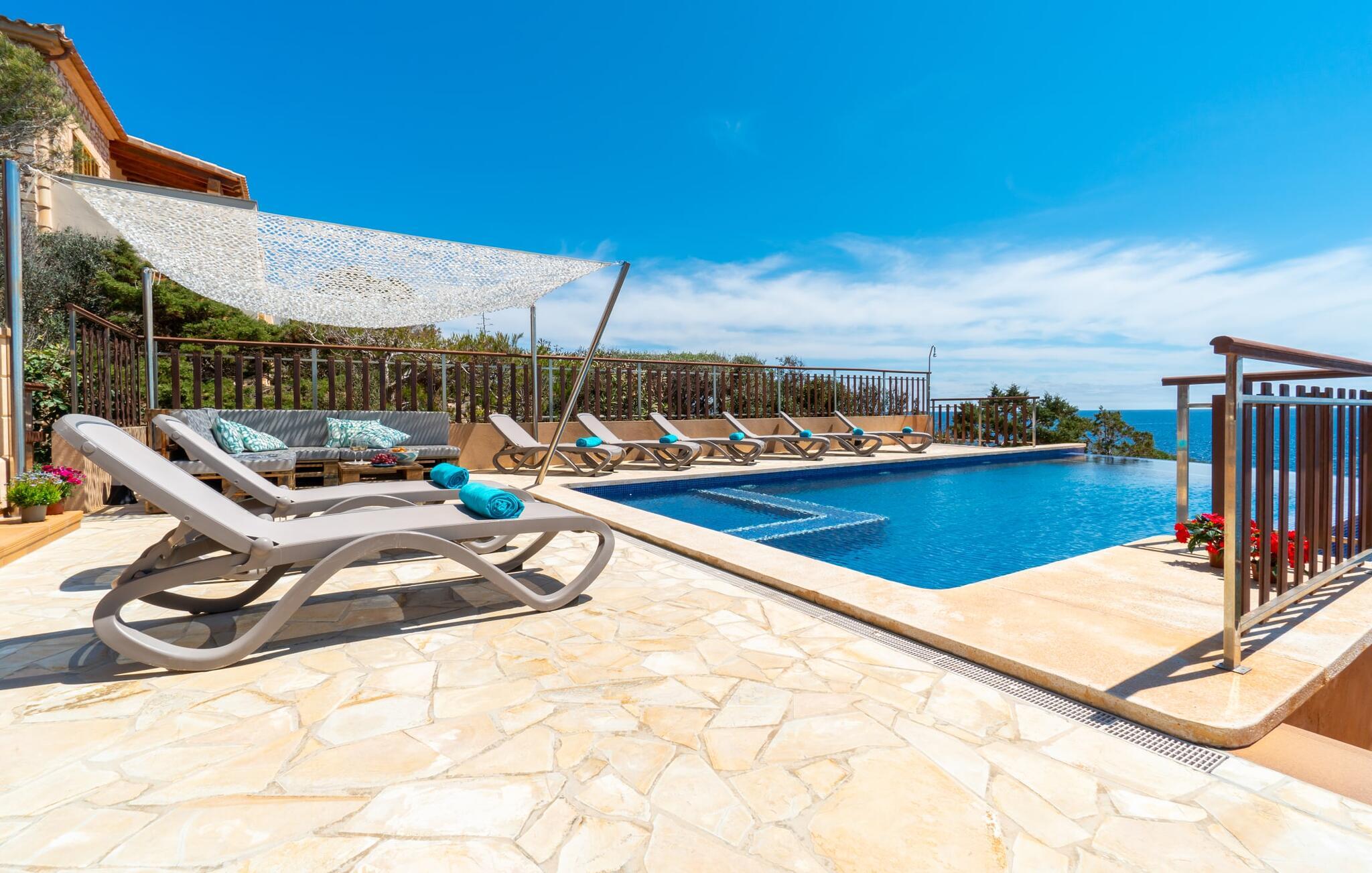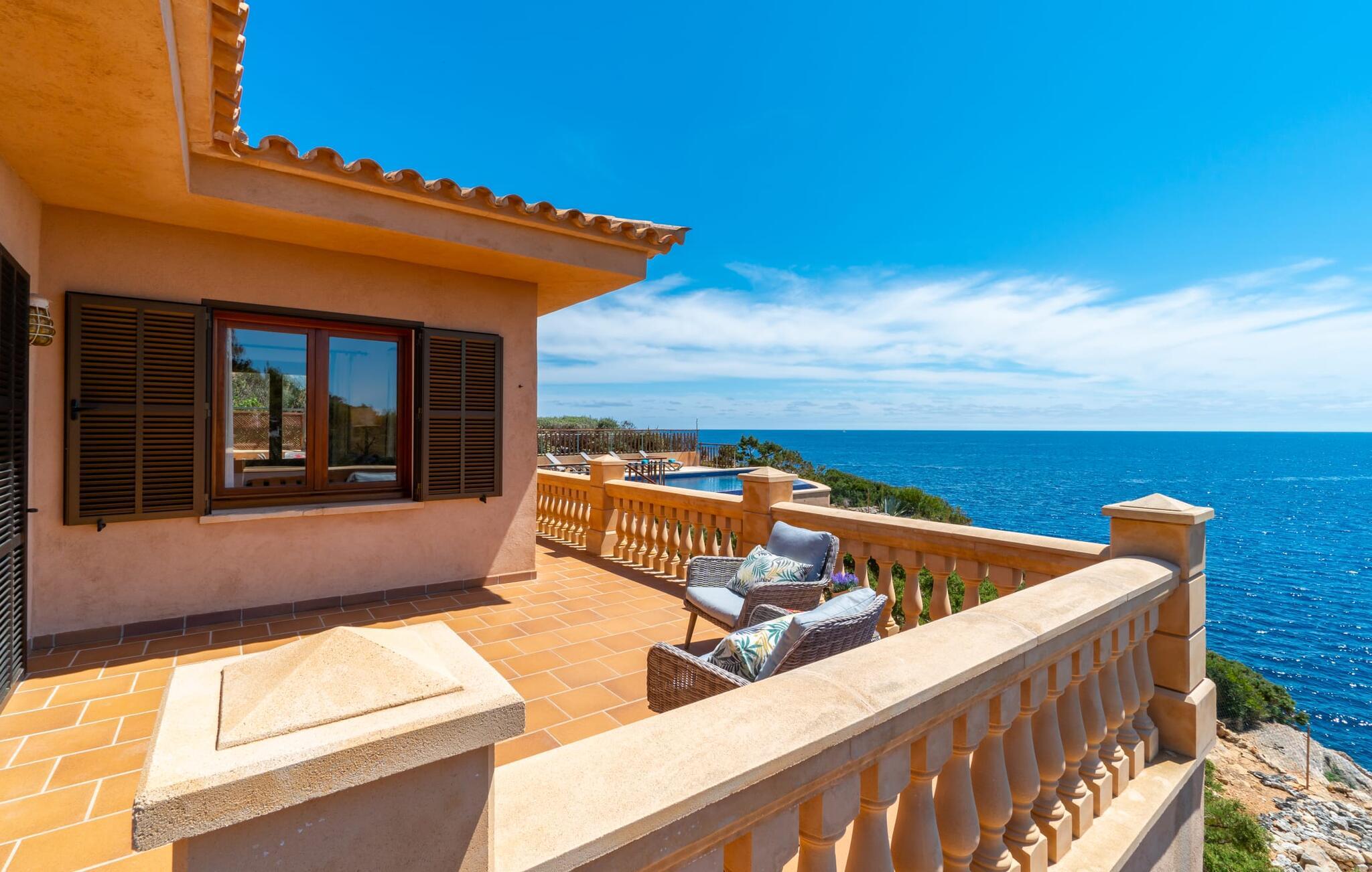 Med sit slående navn refererer den drømmeagtige villa "Ses Penyes Rotges" til et bemærkelsesværdigt naturskue - fordi det ligger direkte på de berømte røde klipper i den sydlige kystsektion mellem Portopetro og Mondragó Naturpark. Som ejendom i en eksklusiv urbanisering med lidt gennemkørende trafik, nyder I godt af en virkelig førsteklasses beliggenhed med kun få naboer. En smal sti og trin hugget ind i klipperne fører jer direkte til jeres private indgang til havet. Fra sommerhuset kan I nyde den frie udsigt til det funklende blå fra morgen til aften - enten fra en af de talrige altaner eller fra de rummelige overdækkede terrassearealer, hvor I kan opleve bordtennis og grill på en helt ny måde. Den kølige infinity-pool ser ud til at flyde direkte ud i Middelhavet og sikrer eksklusiv badeglæde. For de yngre gæster er der en ekstra børnepool, der erstatter soppebassinet. På trods af placeringen over klippeklipperne er hele området behageligt grønt. Denne typiske kystflora går igen i haveområdet med fyrretræer og kaktusser. Bemærk venligst, at adgang til havet ikke kan garanteres i tilfælde af dårligt vejr eller kraftig vind og ujævn hav. Ejerne vil så ikke bygge trappen. Hvis I gerne vil selvforplejning i dette vidunderlige sommerhus, så tag til fiskerlandsbyen Portopetro eller til de ugentlige markeder i den beboelige sydlige del af øen. I kan lave mad i det fuldt udstyrede køkken med et tidløst design og servere middelhavskøkkenets delikatesser via lugen direkte i den smarte spisestue. Den lyse og rummelige rumindretning med åben stue og spiseplads samt fire rummelige soveværelser understreges af et harmonisk farvevalg. Det lyse design med grå gulvfliser er kombineret med varme trætoner. Den moderne stil kombinerer den kølige adel af en maritim villa med typisk mallorcansk pragmatisme. Takket være de fuldt klimatiserede soveværelser kan I ikke bare håbe på en kølig brise fra havet. Tre moderne badeværelser, to af dem en suite, inviterer jer til at tage et brusebad. En af dem med et dobbeltværelse kan kun nås via den spanske terrasse med et ekstra loungehjørne. Flyd væk i dette perfekte sommerhus med op til otte personer, eller vær aktiv med båd- eller kajakudlejning, tag på fisketur eller tag en dukkert i havet. Spil bordtennis eller, hvis I foretrækker noget lidt mere generøst, besøg den nærliggende tennisbane - "Ses Penyes Rotges" tilbyder jer fantastiske rammer for jeres individuelle ferie! Den eksklusive villa "Ses Penyes Rotges" med pool og talrige terrasser er en sand juvel blandt mallorcanske feriehuse. Det ligger på den første kystlinje i den sydlige del af øen nær fiskerbyen Portopetro. Beliggende på kanten af en udsøgt urbanisering, vil I nyde en spektakulær udsigt over havet. I kan gøre jeres indkøb i de omkringliggende landsbyer eller tage på udflugter til de smukkeste steder i syd som Santanyí eller Cala D'Or. For at svømme i havet går I ned ad en privat sti med et par trin til badestigen indlejret i klippen. Aircondition i soveværelserne er inkluderet i prisen, men brugen er begrænset til mellem kl. 22.00 og kl. Gebyret afregnes herefter kontant på stedet.