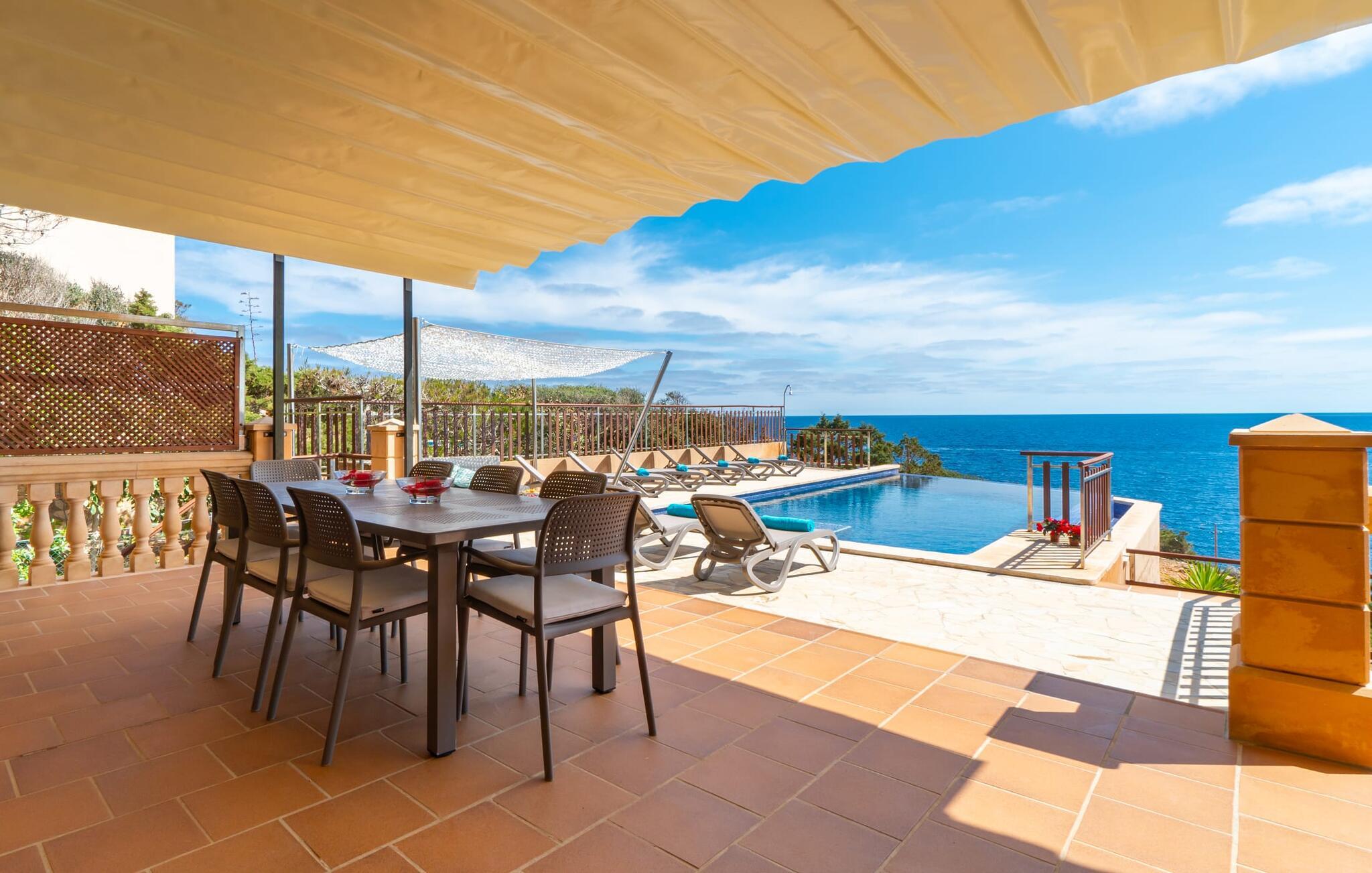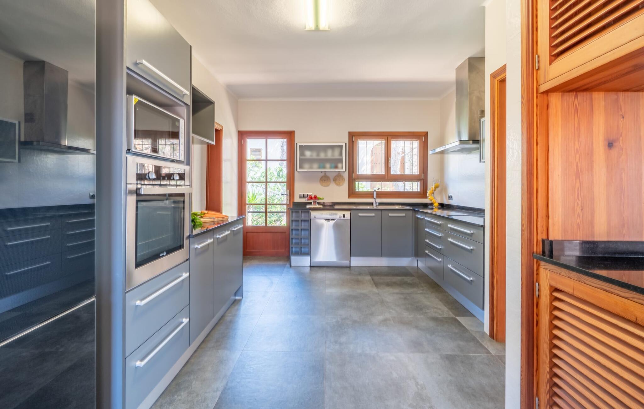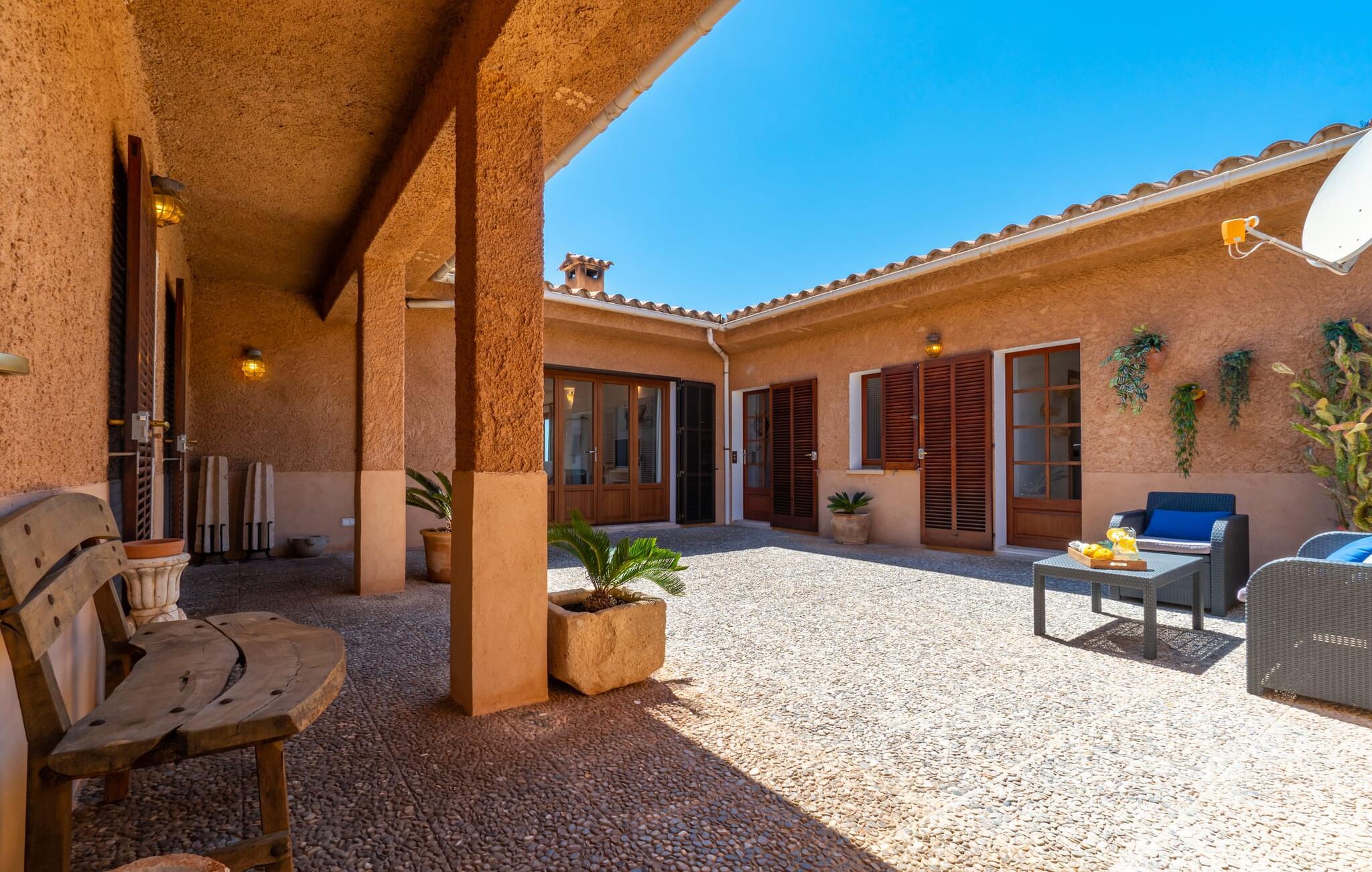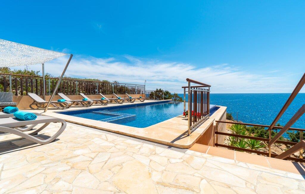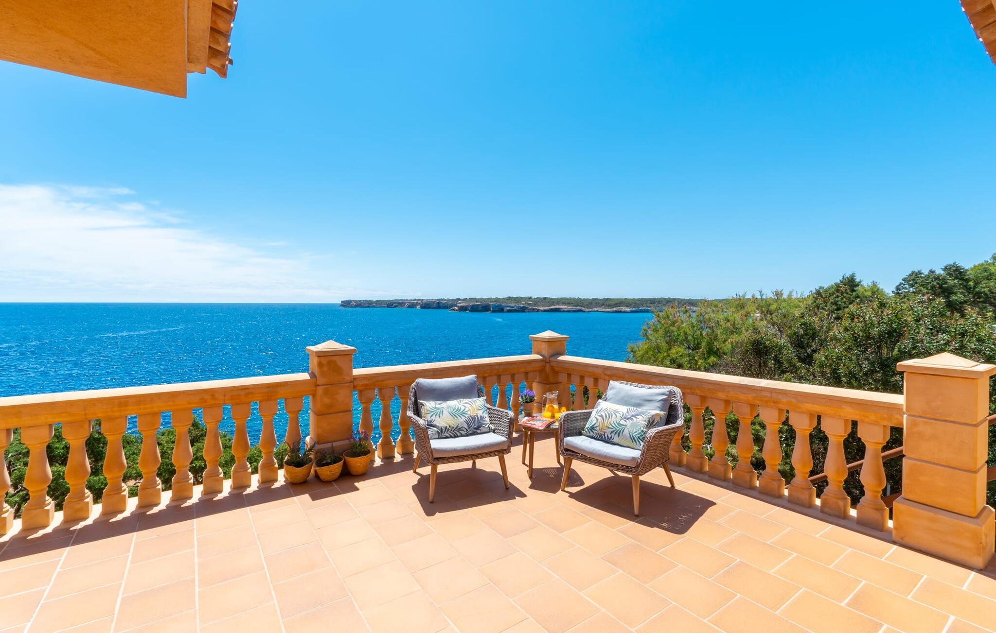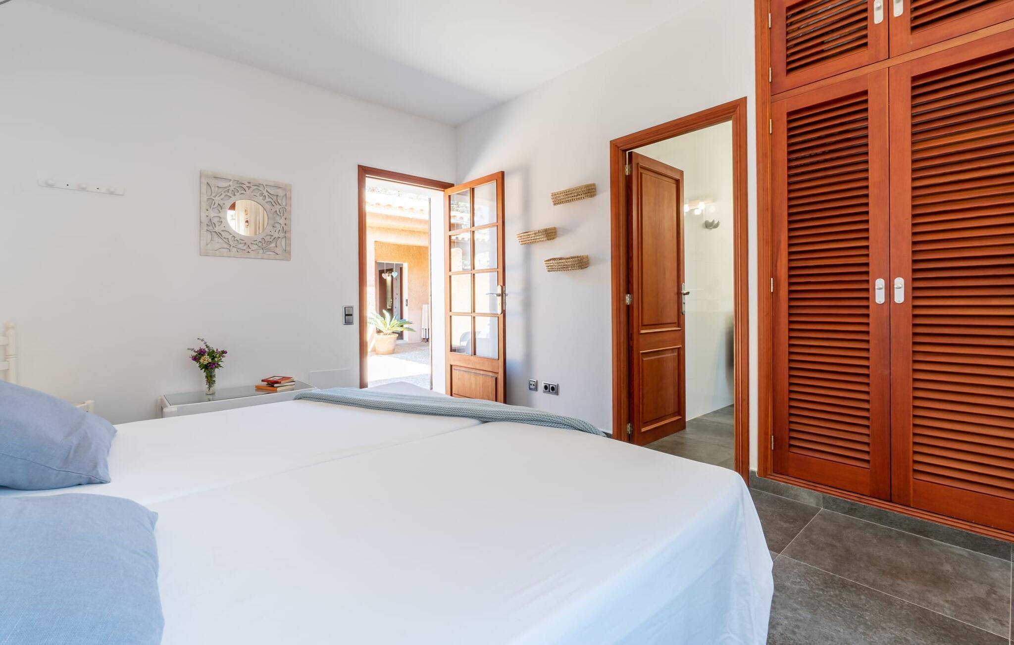 Med sit slående navn refererer den drømmeagtige villa "Ses Penyes Rotges" til et bemærkelsesværdigt naturskue - fordi det ligger direkte på de berømte røde klipper i den sydlige kystsektion mellem Portopetro og Mondragó Naturpark. Som ejendom i en eksklusiv urbanisering med lidt gennemkørende trafik, nyder I godt af en virkelig førsteklasses beliggenhed med kun få naboer. En smal sti og trin hugget ind i klipperne fører jer direkte til jeres private indgang til havet. Fra sommerhuset kan I nyde den frie udsigt til det funklende blå fra morgen til aften - enten fra en af de talrige altaner eller fra de rummelige overdækkede terrassearealer, hvor I kan opleve bordtennis og grill på en helt ny måde. Den kølige infinity-pool ser ud til at flyde direkte ud i Middelhavet og sikrer eksklusiv badeglæde. For de yngre gæster er der en ekstra børnepool, der erstatter soppebassinet. På trods af placeringen over klippeklipperne er hele området behageligt grønt. Denne typiske kystflora går igen i haveområdet med fyrretræer og kaktusser. Bemærk venligst, at adgang til havet ikke kan garanteres i tilfælde af dårligt vejr eller kraftig vind og ujævn hav. Ejerne vil så ikke bygge trappen. Hvis I gerne vil selvforplejning i dette vidunderlige sommerhus, så tag til fiskerlandsbyen Portopetro eller til de ugentlige markeder i den beboelige sydlige del af øen. I kan lave mad i det fuldt udstyrede køkken med et tidløst design og servere middelhavskøkkenets delikatesser via lugen direkte i den smarte spisestue. Den lyse og rummelige rumindretning med åben stue og spiseplads samt fire rummelige soveværelser understreges af et harmonisk farvevalg. Det lyse design med grå gulvfliser er kombineret med varme trætoner. Den moderne stil kombinerer den kølige adel af en maritim villa med typisk mallorcansk pragmatisme. Takket være de fuldt klimatiserede soveværelser kan I ikke bare håbe på en kølig brise fra havet. Tre moderne badeværelser, to af dem en suite, inviterer jer til at tage et brusebad. En af dem med et dobbeltværelse kan kun nås via den spanske terrasse med et ekstra loungehjørne. Flyd væk i dette perfekte sommerhus med op til otte personer, eller vær aktiv med båd- eller kajakudlejning, tag på fisketur eller tag en dukkert i havet. Spil bordtennis eller, hvis I foretrækker noget lidt mere generøst, besøg den nærliggende tennisbane - "Ses Penyes Rotges" tilbyder jer fantastiske rammer for jeres individuelle ferie! Den eksklusive villa "Ses Penyes Rotges" med pool og talrige terrasser er en sand juvel blandt mallorcanske feriehuse. Det ligger på den første kystlinje i den sydlige del af øen nær fiskerbyen Portopetro. Beliggende på kanten af en udsøgt urbanisering, vil I nyde en spektakulær udsigt over havet. I kan gøre jeres indkøb i de omkringliggende landsbyer eller tage på udflugter til de smukkeste steder i syd som Santanyí eller Cala D'Or. For at svømme i havet går I ned ad en privat sti med et par trin til badestigen indlejret i klippen. Aircondition i soveværelserne er inkluderet i prisen, men brugen er begrænset til mellem kl. 22.00 og kl. Gebyret afregnes herefter kontant på stedet.