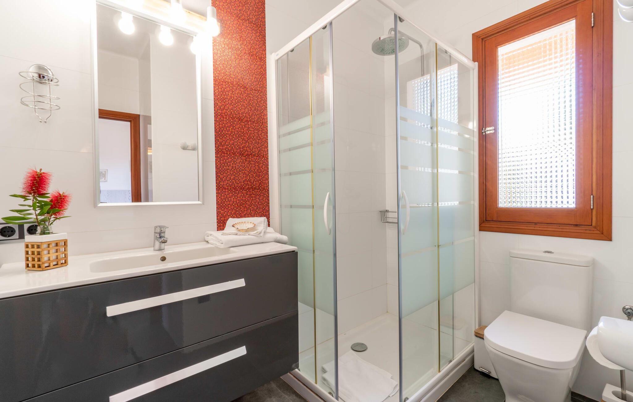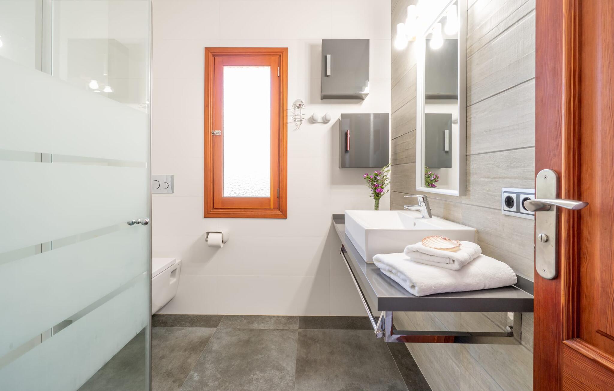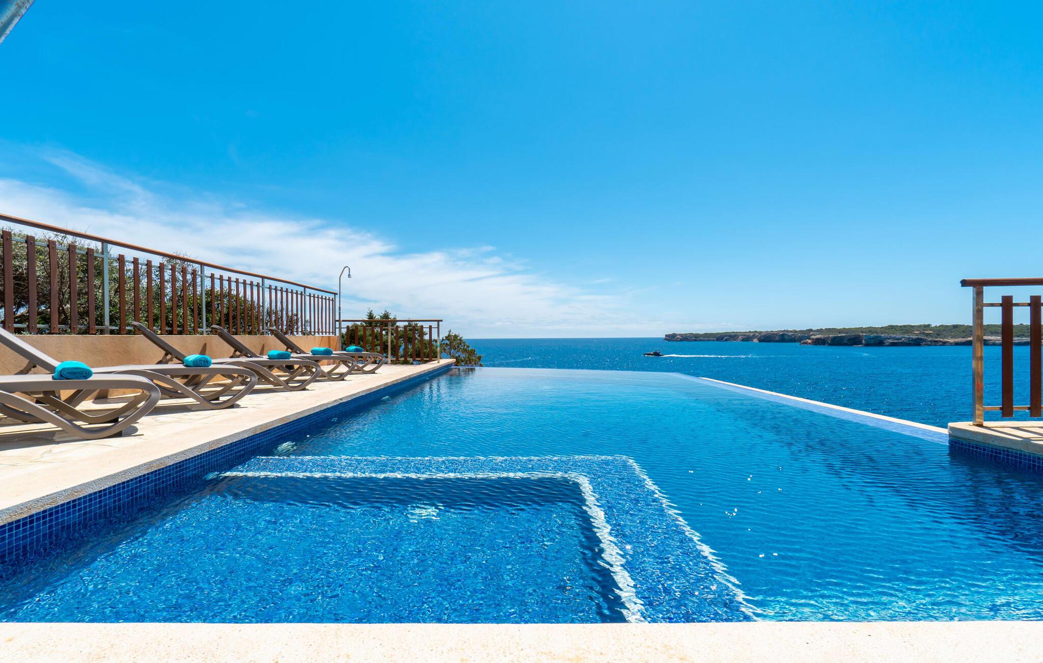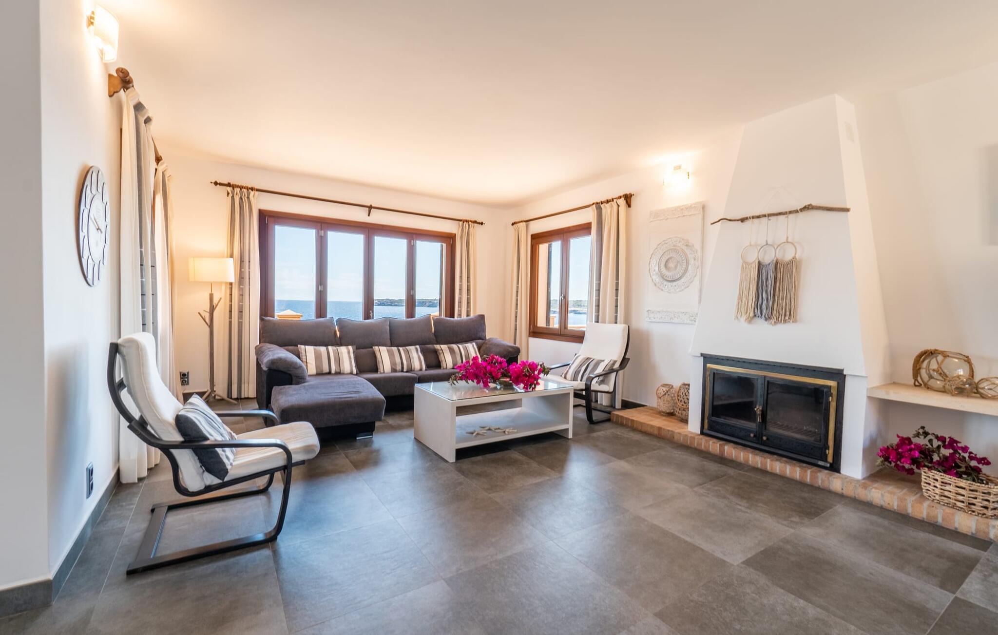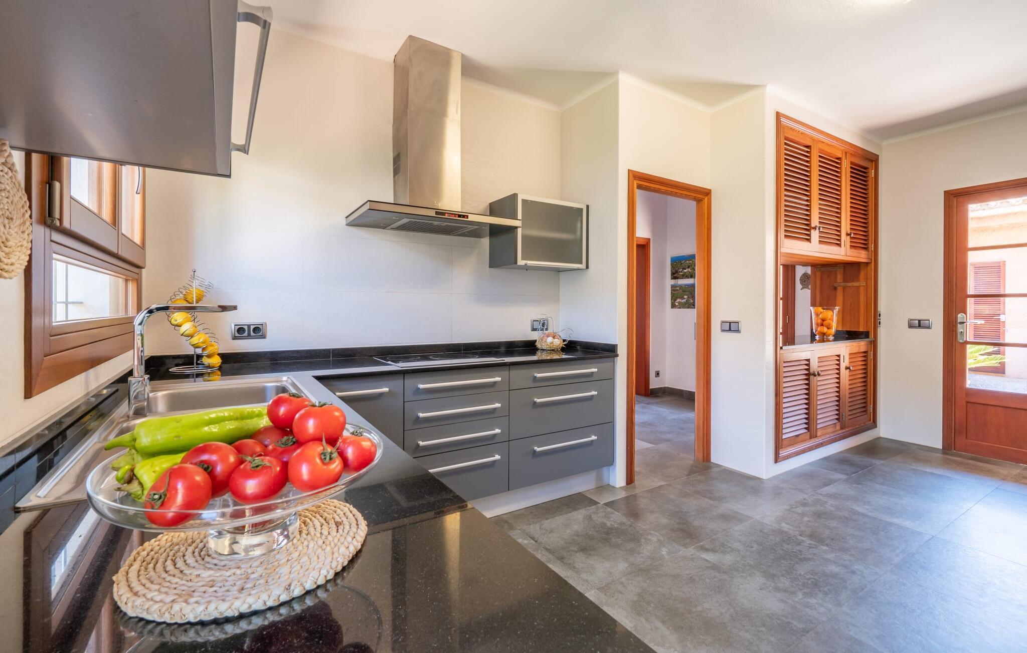 Med sit slående navn refererer den drømmeagtige villa "Ses Penyes Rotges" til et bemærkelsesværdigt naturskue - fordi det ligger direkte på de berømte røde klipper i den sydlige kystsektion mellem Portopetro og Mondragó Naturpark. Som ejendom i en eksklusiv urbanisering med lidt gennemkørende trafik, nyder I godt af en virkelig førsteklasses beliggenhed med kun få naboer. En smal sti og trin hugget ind i klipperne fører jer direkte til jeres private indgang til havet. Fra sommerhuset kan I nyde den frie udsigt til det funklende blå fra morgen til aften - enten fra en af de talrige altaner eller fra de rummelige overdækkede terrassearealer, hvor I kan opleve bordtennis og grill på en helt ny måde. Den kølige infinity-pool ser ud til at flyde direkte ud i Middelhavet og sikrer eksklusiv badeglæde. For de yngre gæster er der en ekstra børnepool, der erstatter soppebassinet. På trods af placeringen over klippeklipperne er hele området behageligt grønt. Denne typiske kystflora går igen i haveområdet med fyrretræer og kaktusser. Bemærk venligst, at adgang til havet ikke kan garanteres i tilfælde af dårligt vejr eller kraftig vind og ujævn hav. Ejerne vil så ikke bygge trappen. Hvis I gerne vil selvforplejning i dette vidunderlige sommerhus, så tag til fiskerlandsbyen Portopetro eller til de ugentlige markeder i den beboelige sydlige del af øen. I kan lave mad i det fuldt udstyrede køkken med et tidløst design og servere middelhavskøkkenets delikatesser via lugen direkte i den smarte spisestue. Den lyse og rummelige rumindretning med åben stue og spiseplads samt fire rummelige soveværelser understreges af et harmonisk farvevalg. Det lyse design med grå gulvfliser er kombineret med varme trætoner. Den moderne stil kombinerer den kølige adel af en maritim villa med typisk mallorcansk pragmatisme. Takket være de fuldt klimatiserede soveværelser kan I ikke bare håbe på en kølig brise fra havet. Tre moderne badeværelser, to af dem en suite, inviterer jer til at tage et brusebad. En af dem med et dobbeltværelse kan kun nås via den spanske terrasse med et ekstra loungehjørne. Flyd væk i dette perfekte sommerhus med op til otte personer, eller vær aktiv med båd- eller kajakudlejning, tag på fisketur eller tag en dukkert i havet. Spil bordtennis eller, hvis I foretrækker noget lidt mere generøst, besøg den nærliggende tennisbane - "Ses Penyes Rotges" tilbyder jer fantastiske rammer for jeres individuelle ferie! Den eksklusive villa "Ses Penyes Rotges" med pool og talrige terrasser er en sand juvel blandt mallorcanske feriehuse. Det ligger på den første kystlinje i den sydlige del af øen nær fiskerbyen Portopetro. Beliggende på kanten af en udsøgt urbanisering, vil I nyde en spektakulær udsigt over havet. I kan gøre jeres indkøb i de omkringliggende landsbyer eller tage på udflugter til de smukkeste steder i syd som Santanyí eller Cala D'Or. For at svømme i havet går I ned ad en privat sti med et par trin til badestigen indlejret i klippen. Aircondition i soveværelserne er inkluderet i prisen, men brugen er begrænset til mellem kl. 22.00 og kl. Gebyret afregnes herefter kontant på stedet.
