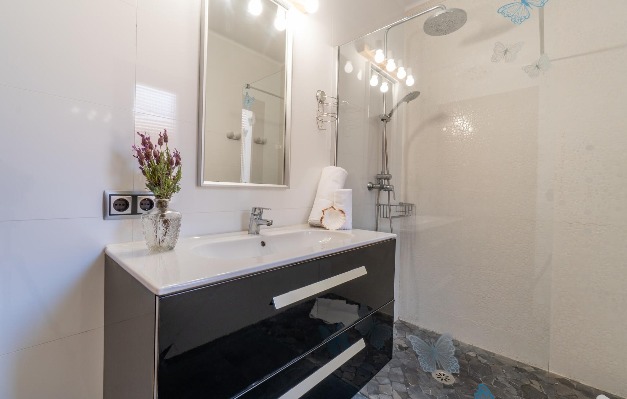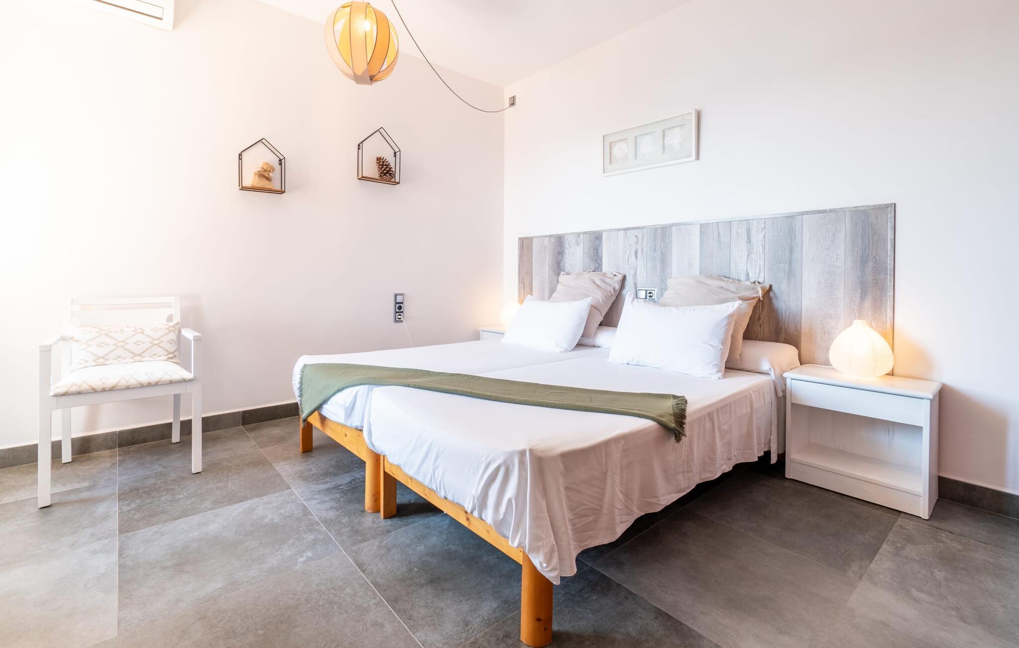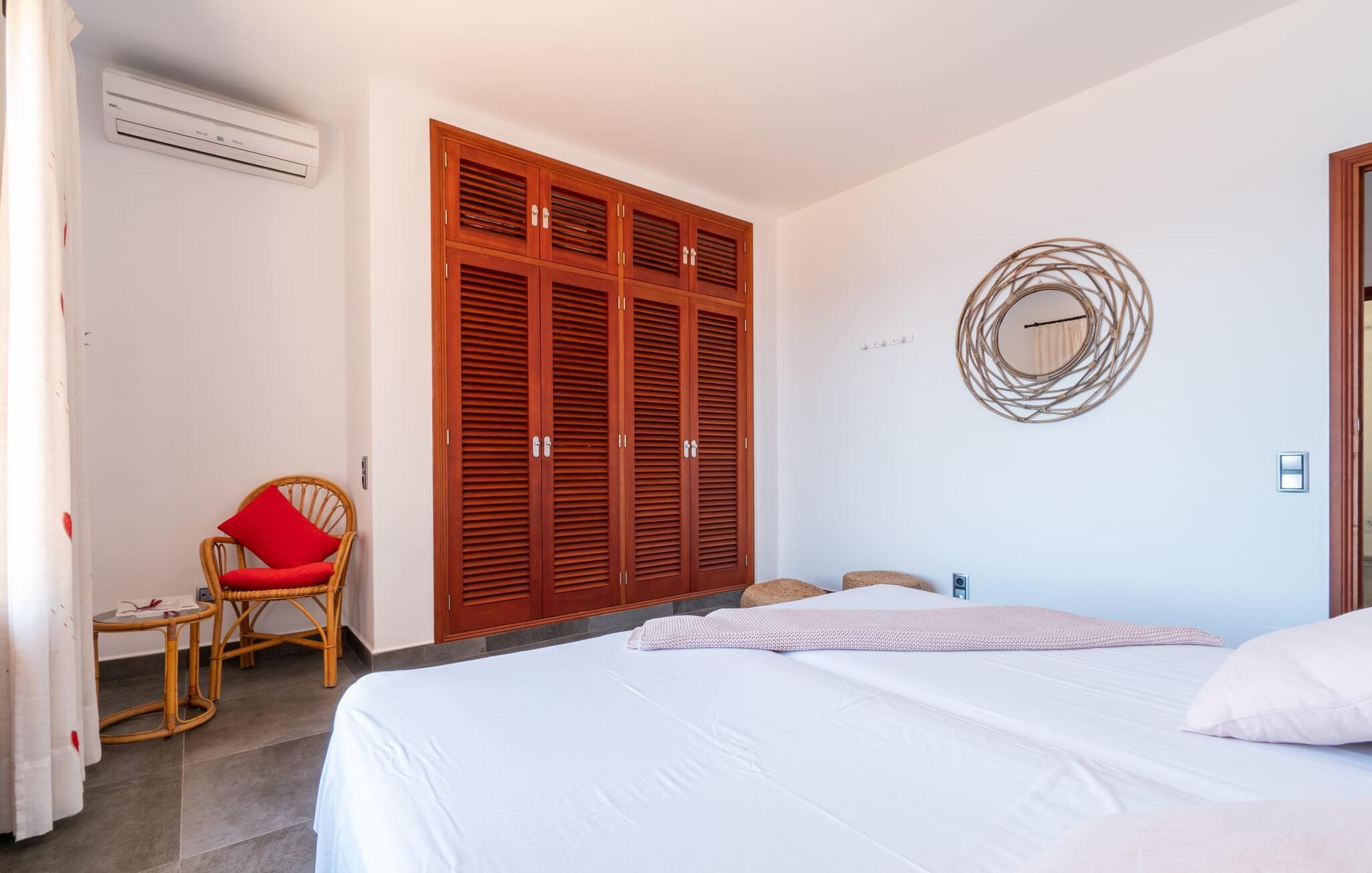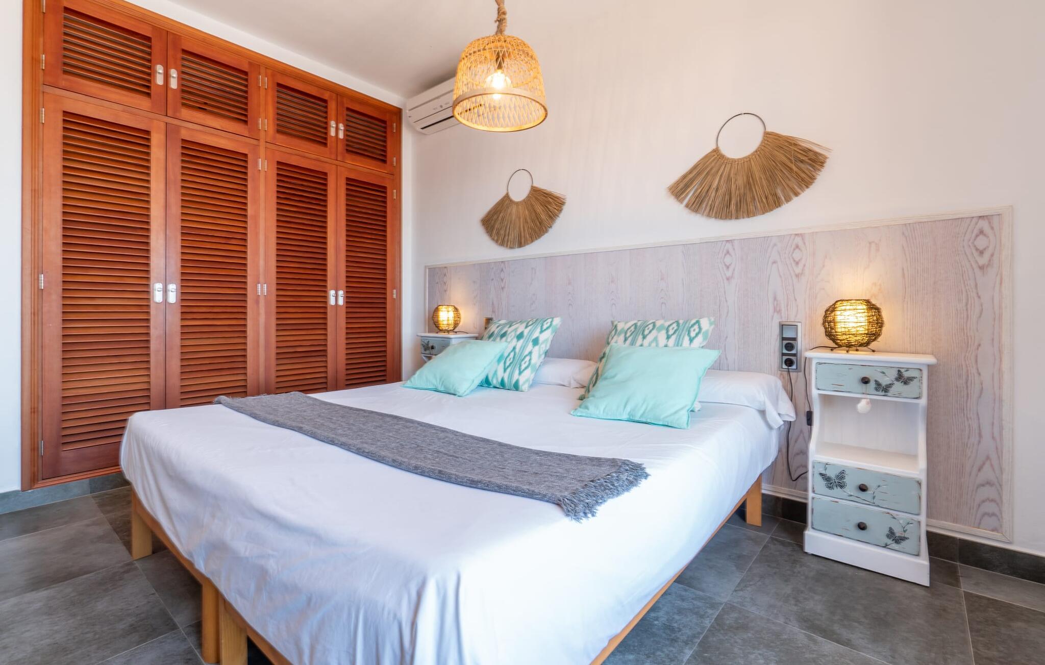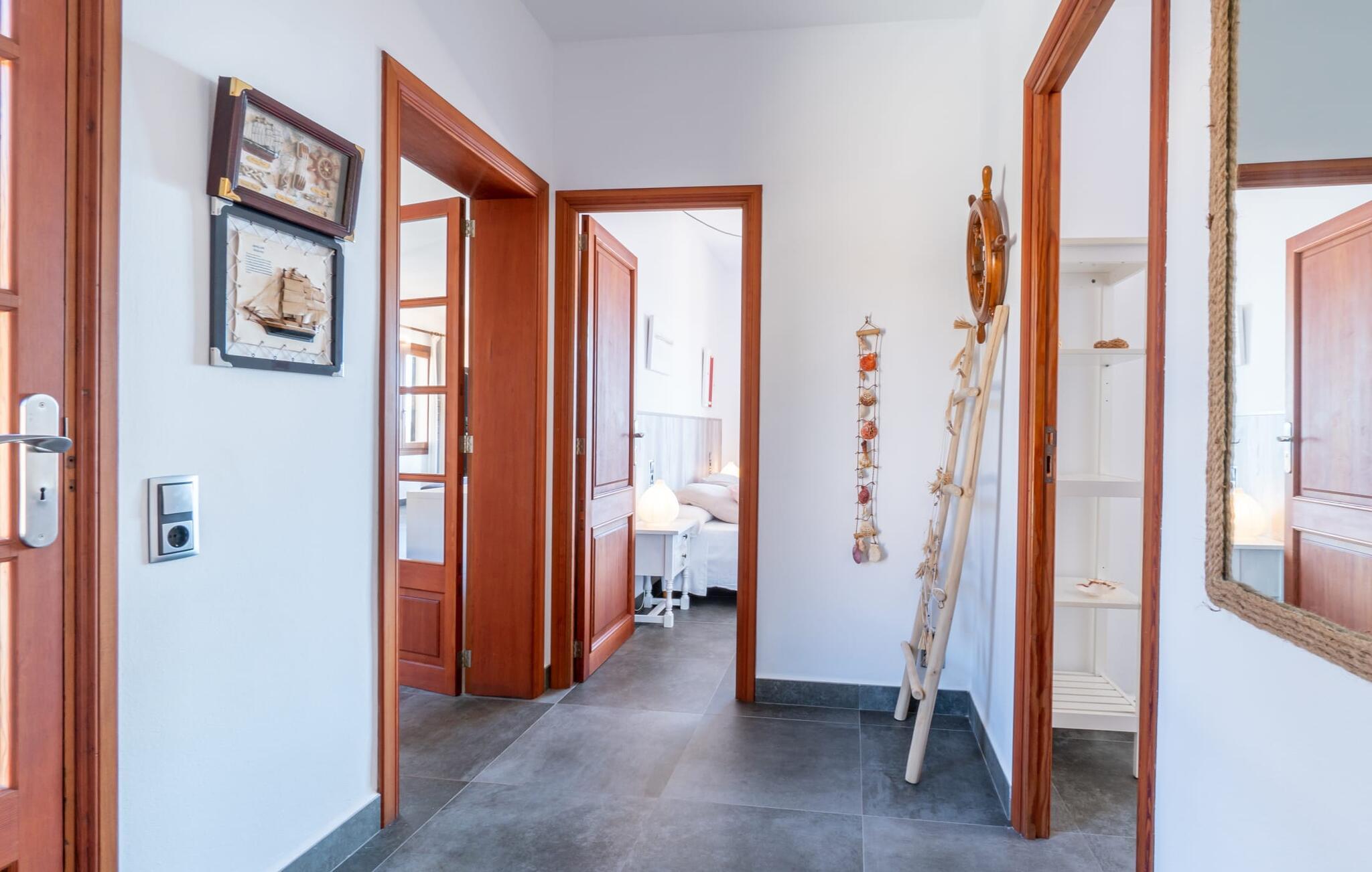 Med sit slående navn refererer den drømmeagtige villa "Ses Penyes Rotges" til et bemærkelsesværdigt naturskue - fordi det ligger direkte på de berømte røde klipper i den sydlige kystsektion mellem Portopetro og Mondragó Naturpark. Som ejendom i en eksklusiv urbanisering med lidt gennemkørende trafik, nyder I godt af en virkelig førsteklasses beliggenhed med kun få naboer. En smal sti og trin hugget ind i klipperne fører jer direkte til jeres private indgang til havet. Fra sommerhuset kan I nyde den frie udsigt til det funklende blå fra morgen til aften - enten fra en af de talrige altaner eller fra de rummelige overdækkede terrassearealer, hvor I kan opleve bordtennis og grill på en helt ny måde. Den kølige infinity-pool ser ud til at flyde direkte ud i Middelhavet og sikrer eksklusiv badeglæde. For de yngre gæster er der en ekstra børnepool, der erstatter soppebassinet. På trods af placeringen over klippeklipperne er hele området behageligt grønt. Denne typiske kystflora går igen i haveområdet med fyrretræer og kaktusser. Bemærk venligst, at adgang til havet ikke kan garanteres i tilfælde af dårligt vejr eller kraftig vind og ujævn hav. Ejerne vil så ikke bygge trappen. Hvis I gerne vil selvforplejning i dette vidunderlige sommerhus, så tag til fiskerlandsbyen Portopetro eller til de ugentlige markeder i den beboelige sydlige del af øen. I kan lave mad i det fuldt udstyrede køkken med et tidløst design og servere middelhavskøkkenets delikatesser via lugen direkte i den smarte spisestue. Den lyse og rummelige rumindretning med åben stue og spiseplads samt fire rummelige soveværelser understreges af et harmonisk farvevalg. Det lyse design med grå gulvfliser er kombineret med varme trætoner. Den moderne stil kombinerer den kølige adel af en maritim villa med typisk mallorcansk pragmatisme. Takket være de fuldt klimatiserede soveværelser kan I ikke bare håbe på en kølig brise fra havet. Tre moderne badeværelser, to af dem en suite, inviterer jer til at tage et brusebad. En af dem med et dobbeltværelse kan kun nås via den spanske terrasse med et ekstra loungehjørne. Flyd væk i dette perfekte sommerhus med op til otte personer, eller vær aktiv med båd- eller kajakudlejning, tag på fisketur eller tag en dukkert i havet. Spil bordtennis eller, hvis I foretrækker noget lidt mere generøst, besøg den nærliggende tennisbane - "Ses Penyes Rotges" tilbyder jer fantastiske rammer for jeres individuelle ferie! Den eksklusive villa "Ses Penyes Rotges" med pool og talrige terrasser er en sand juvel blandt mallorcanske feriehuse. Det ligger på den første kystlinje i den sydlige del af øen nær fiskerbyen Portopetro. Beliggende på kanten af en udsøgt urbanisering, vil I nyde en spektakulær udsigt over havet. I kan gøre jeres indkøb i de omkringliggende landsbyer eller tage på udflugter til de smukkeste steder i syd som Santanyí eller Cala D'Or. For at svømme i havet går I ned ad en privat sti med et par trin til badestigen indlejret i klippen. Aircondition i soveværelserne er inkluderet i prisen, men brugen er begrænset til mellem kl. 22.00 og kl. Gebyret afregnes herefter kontant på stedet.