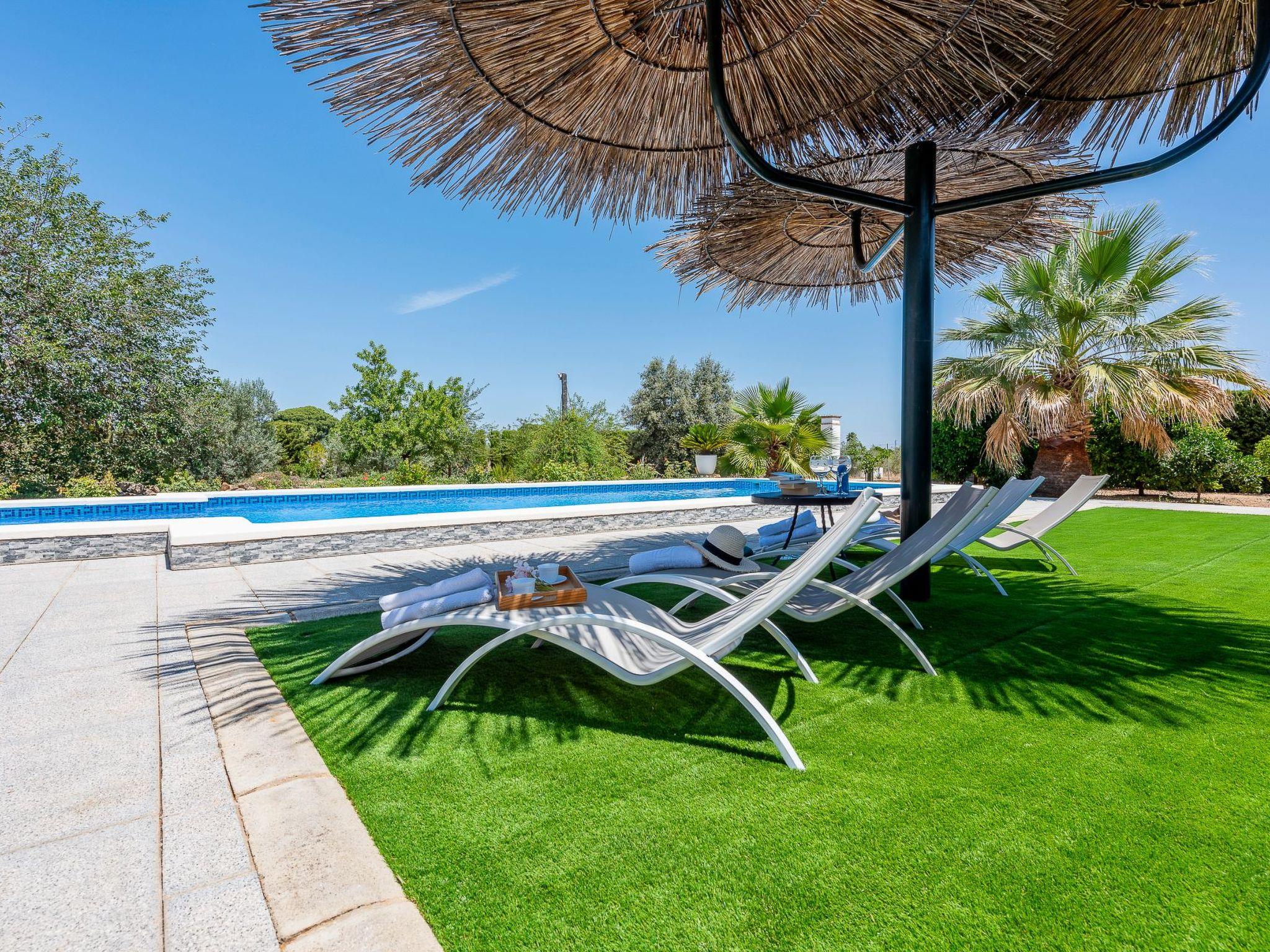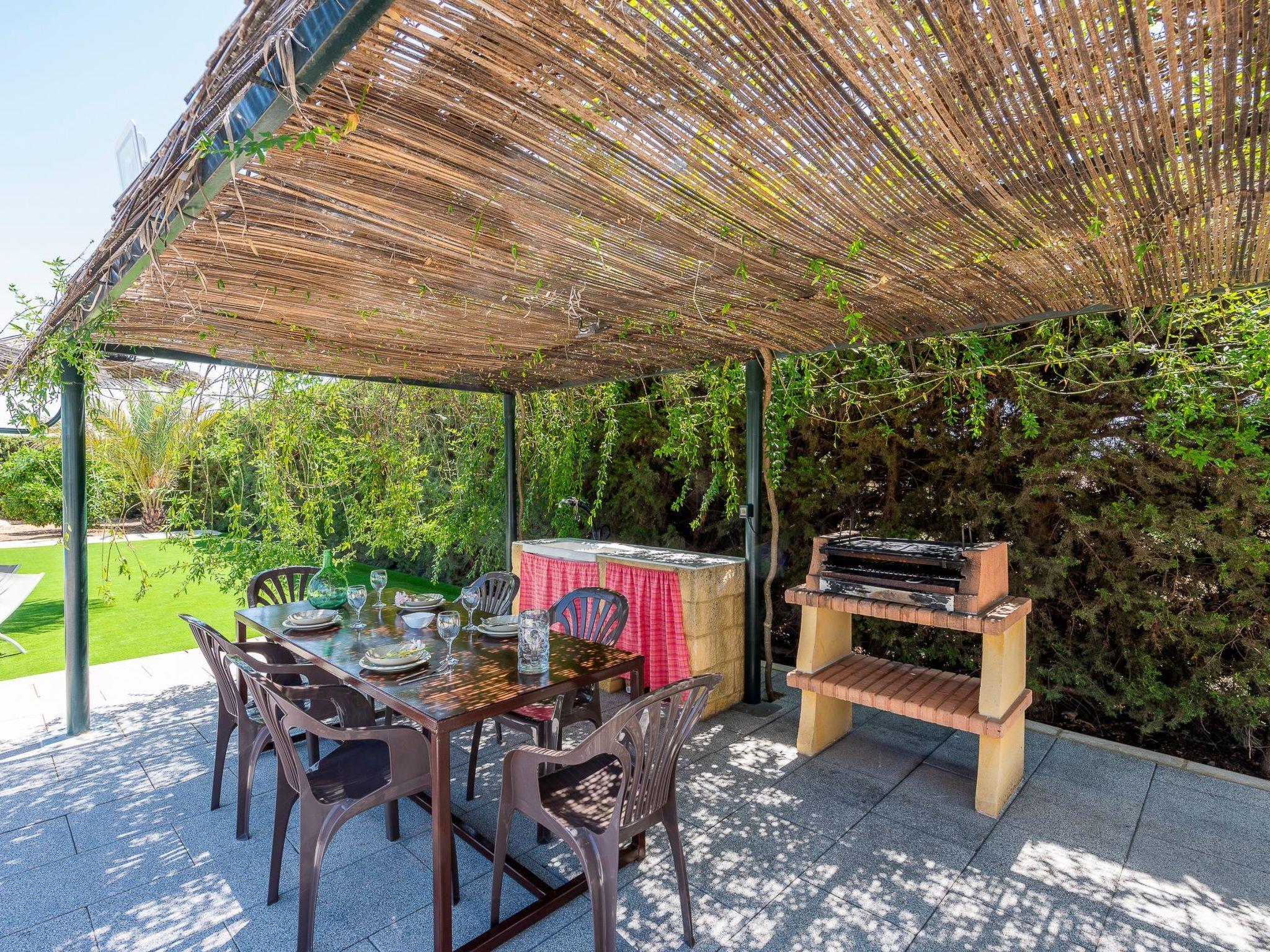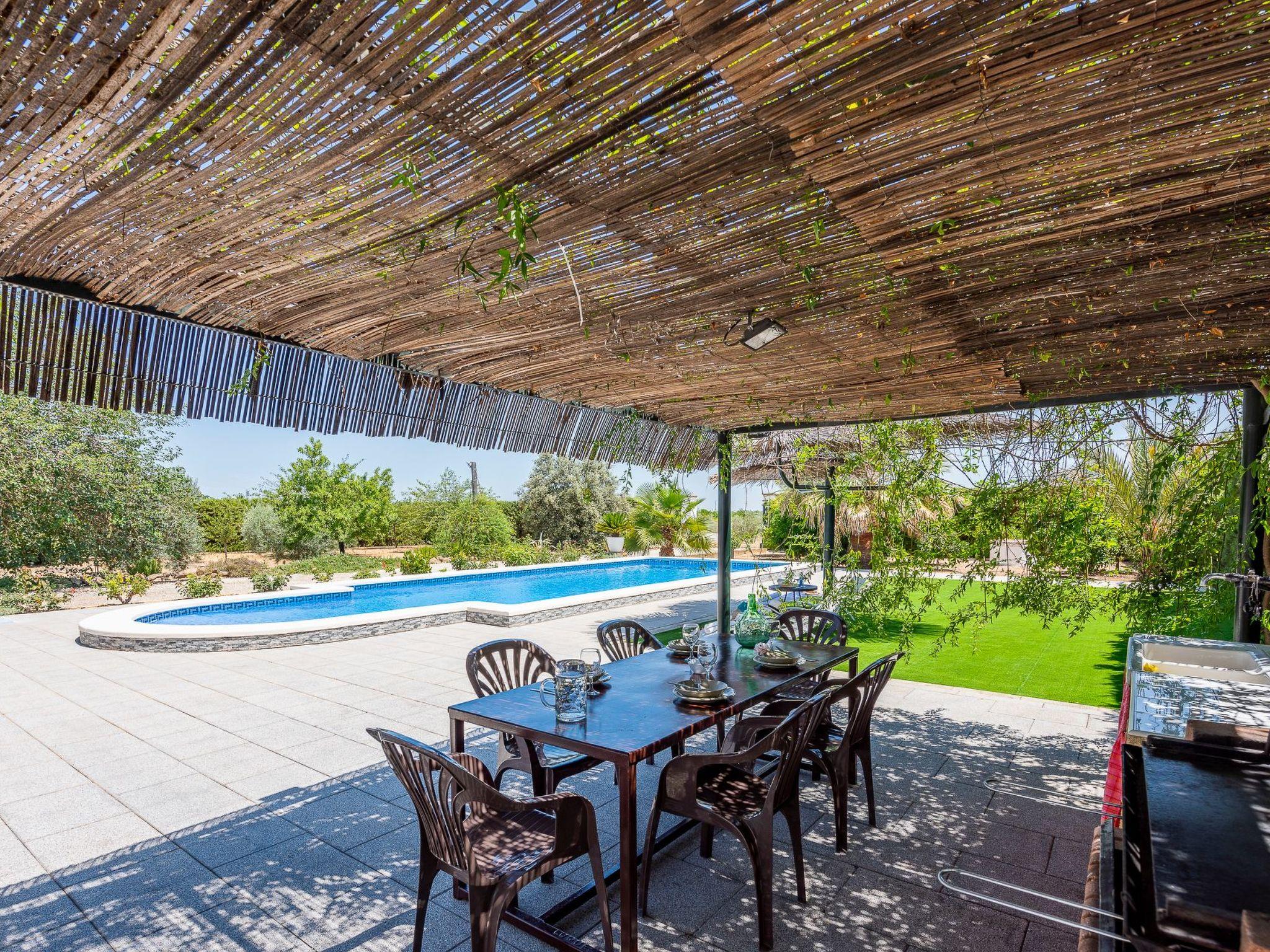 Barbecue area, pergola and lawn area, swimming pool with large sunshade.