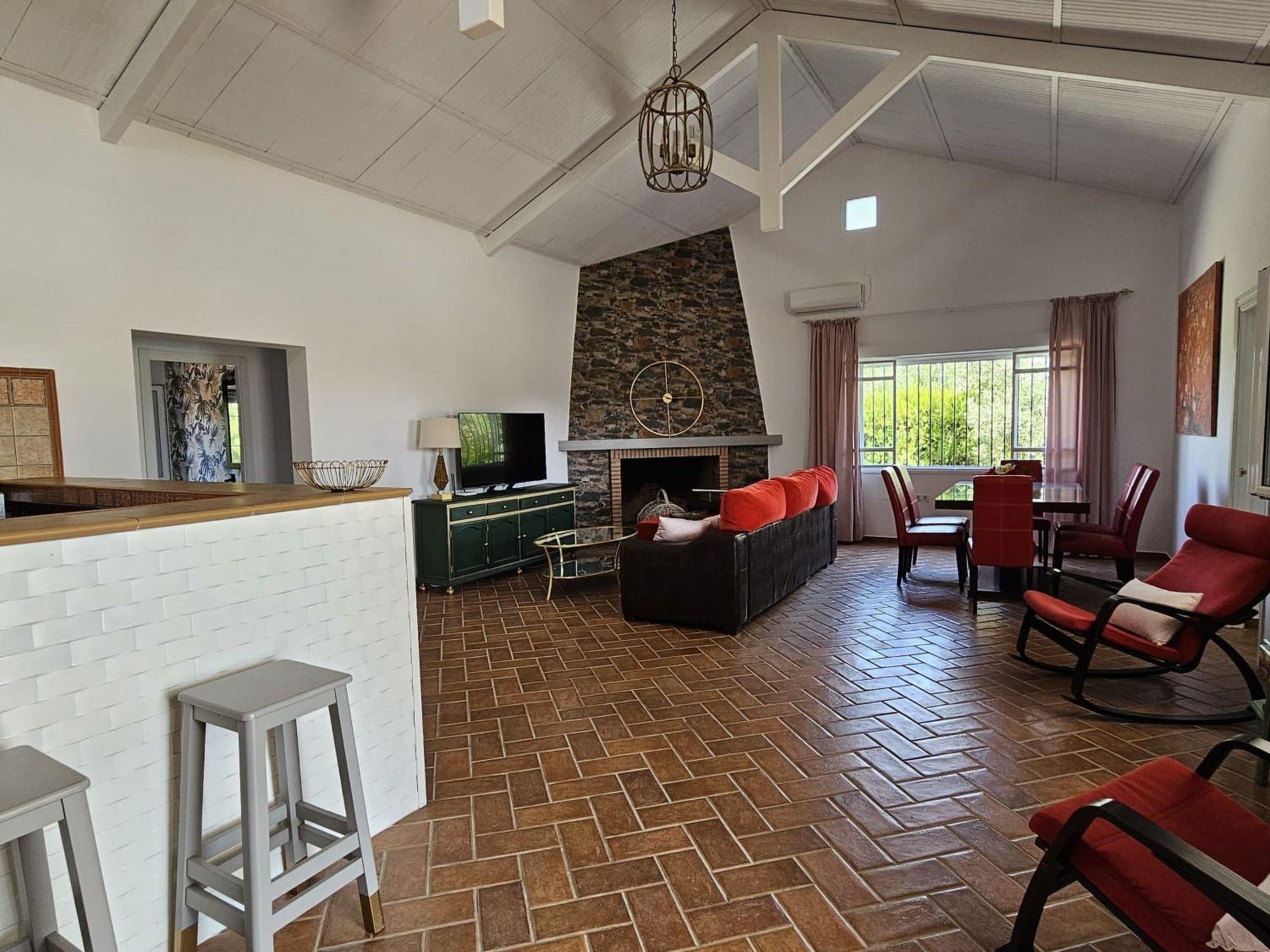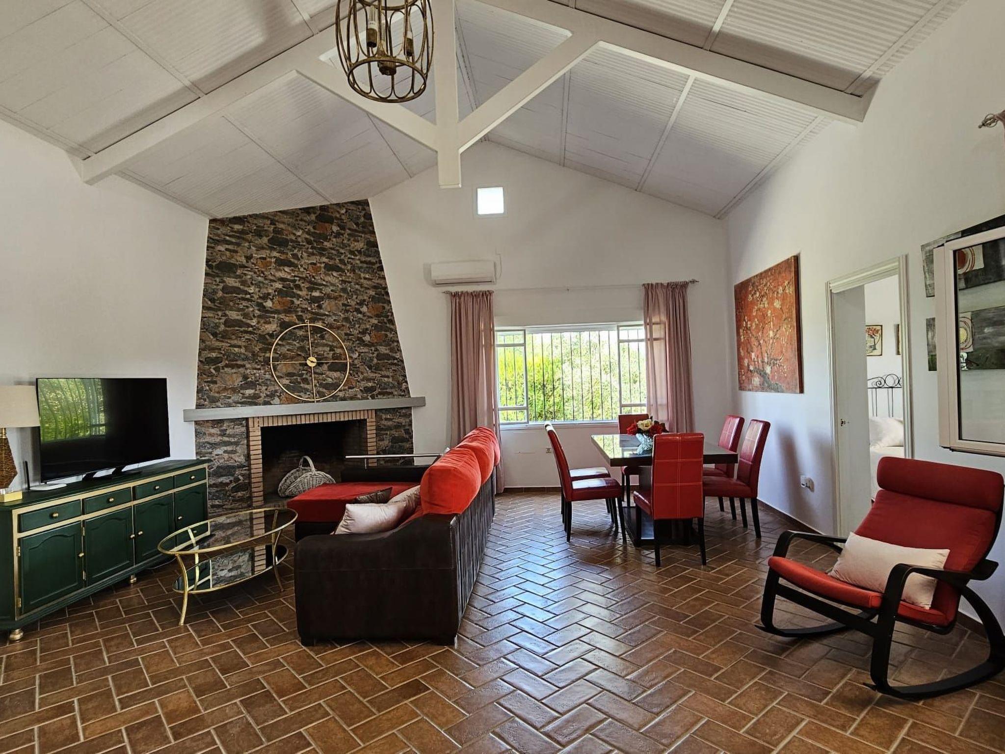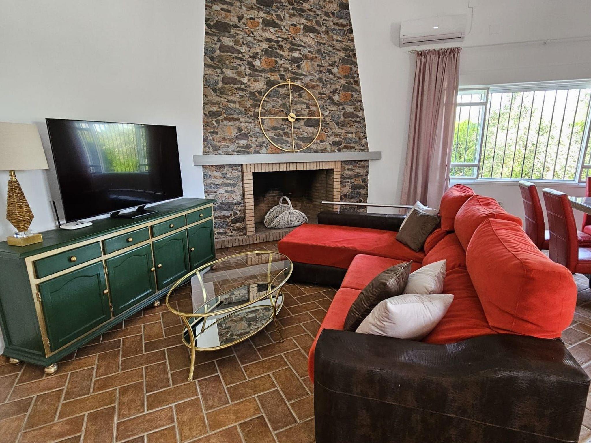 Large living-dining room with wooden gable roof, air conditioning hot-cold, 55? flat screen TV with IPTV channels, large fireplace.