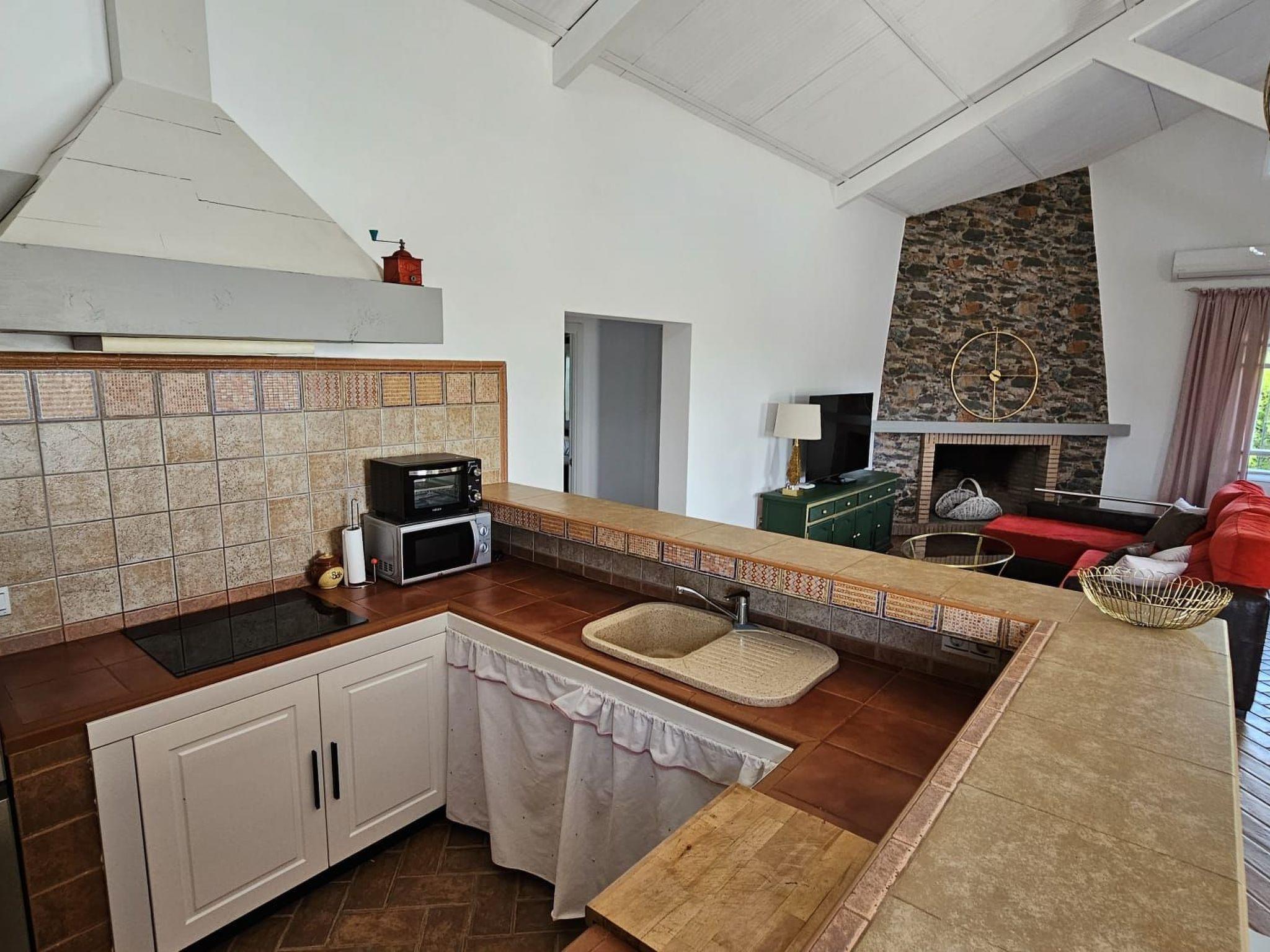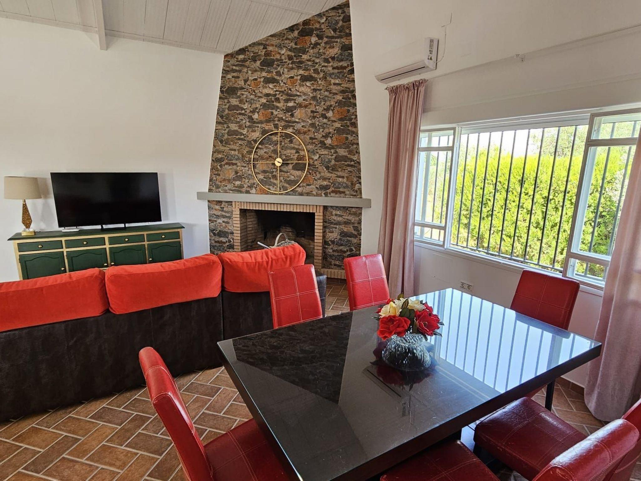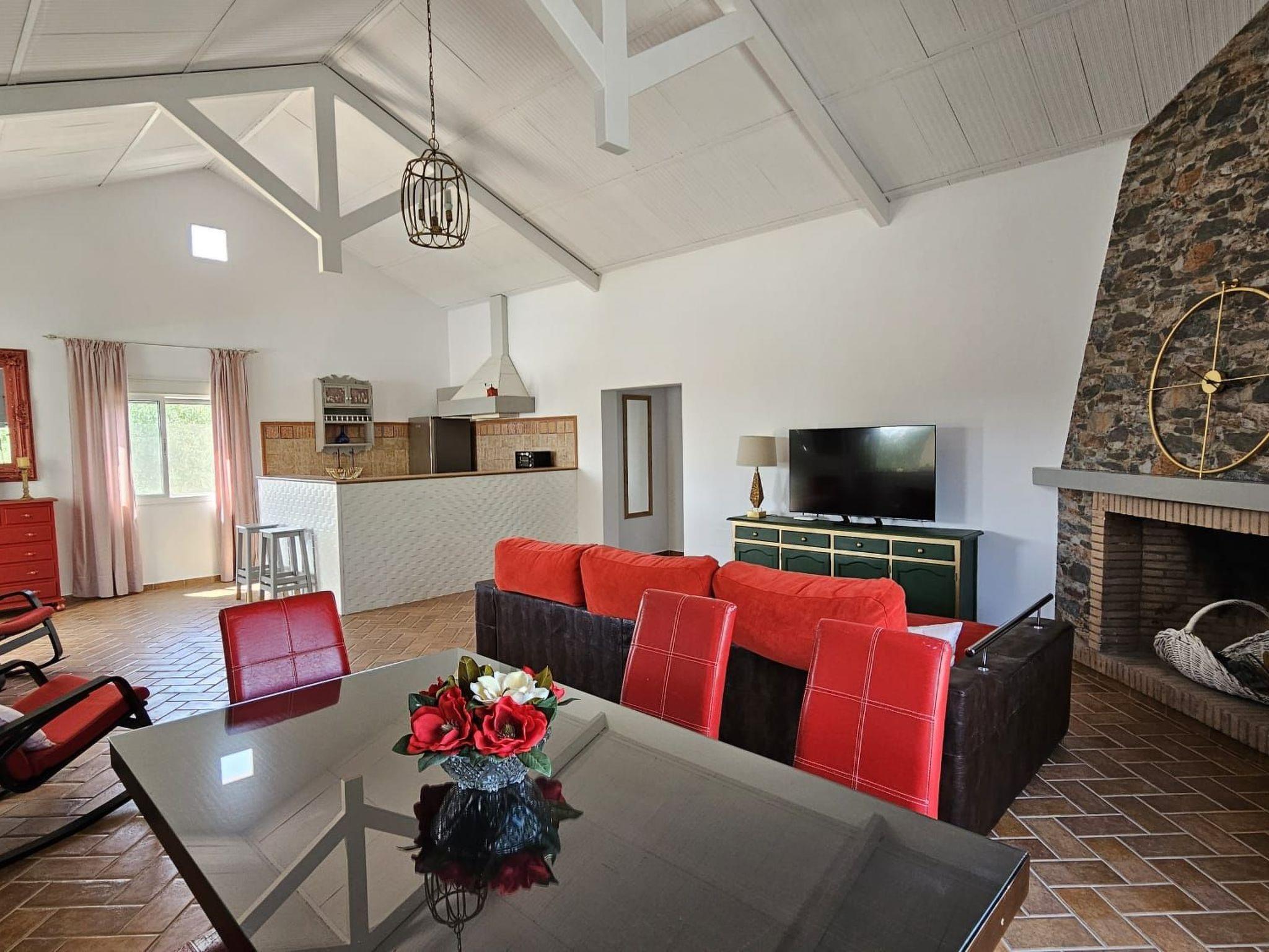 Large living-dining room with wooden gable roof, air conditioning hot-cold, 55? flat screen TV with IPTV channels, large fireplace.