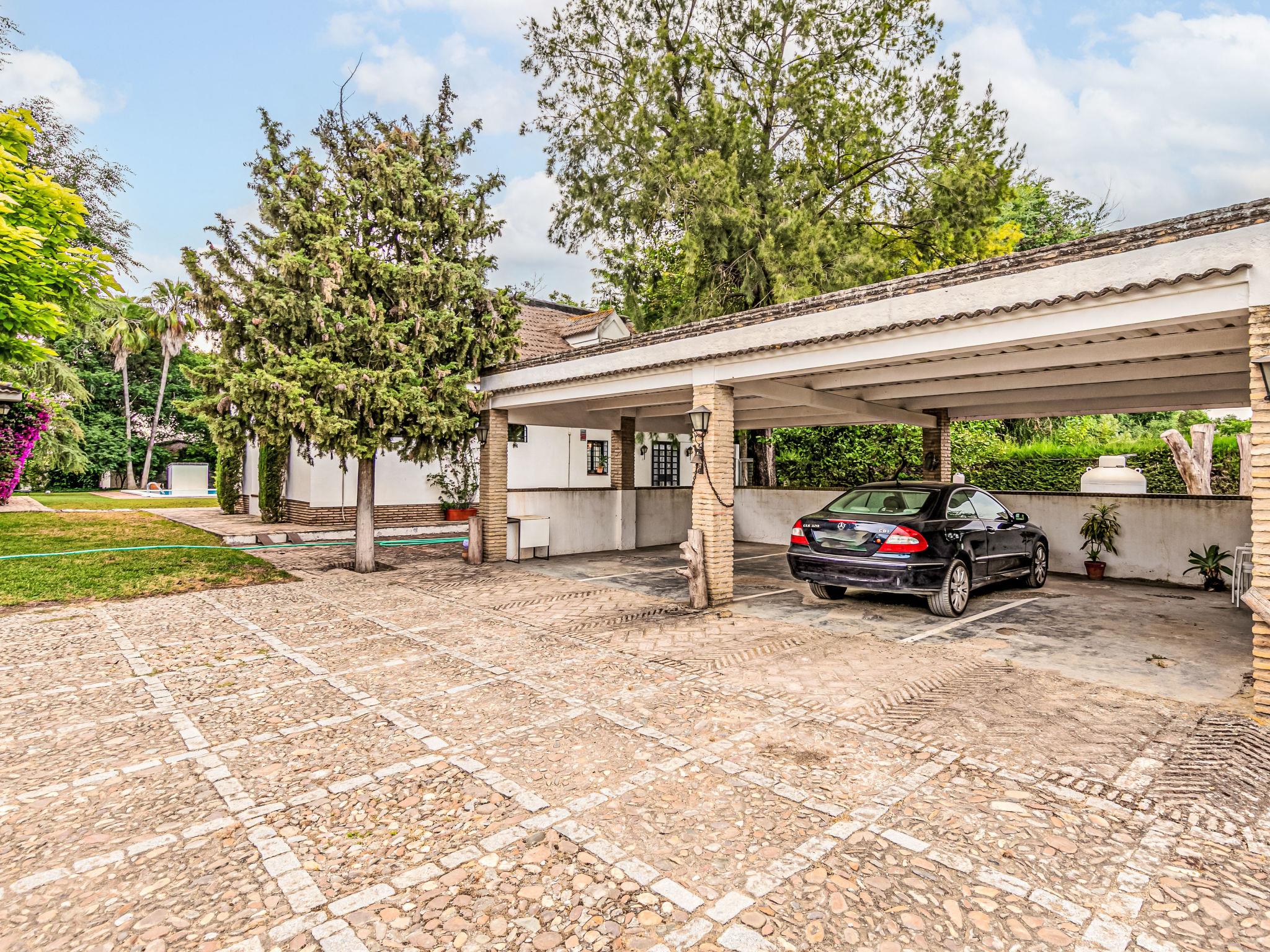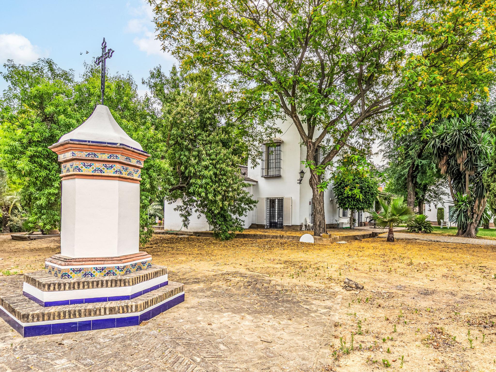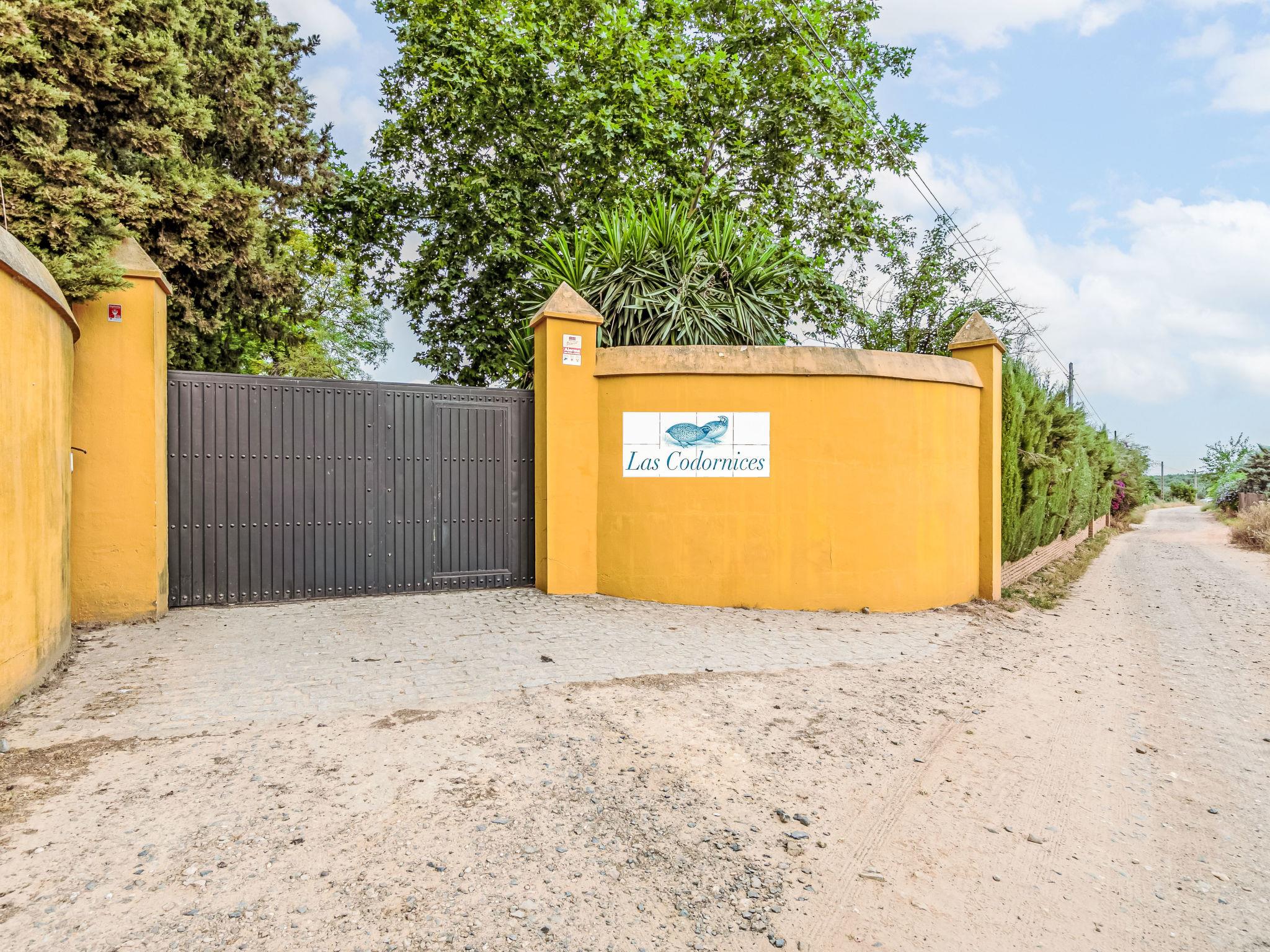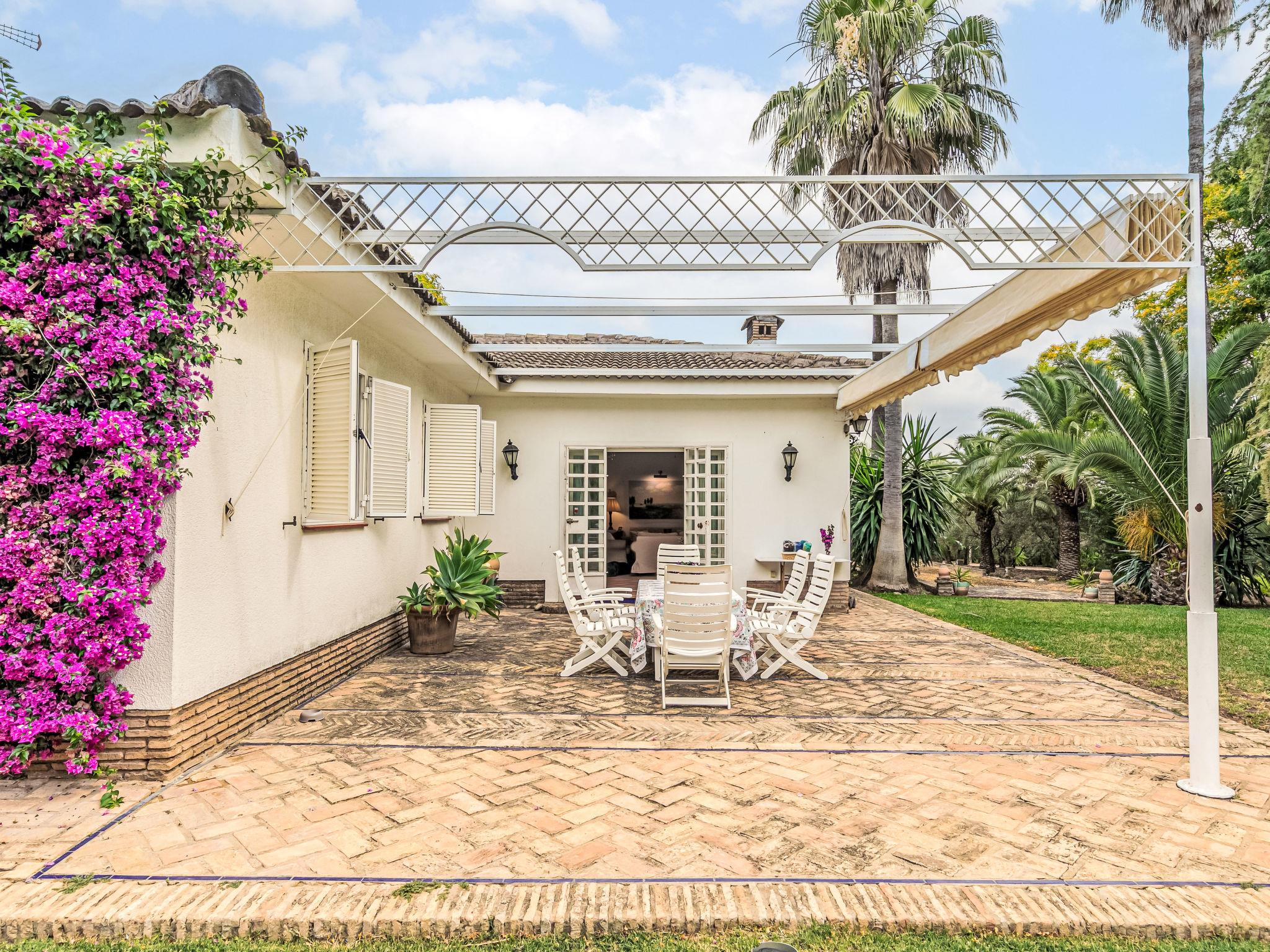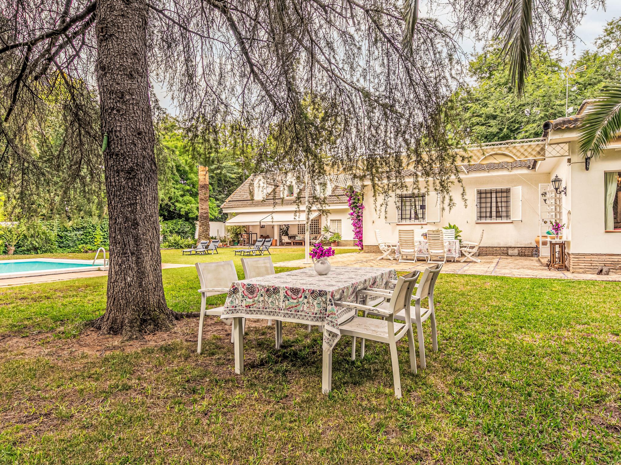 Comfortable villa "Las Codornices". On the outskirts Sanlúcar la Mayor, in a secluded, quiet, sunny position. Private: garden 9'000 m2 with lawn and trees, swimming pool (12 x 6 m, depth 170 - 185 cm, seasonal availability: 01.Jan. - 31.Dec.). Outdoor shower, pool house, parking (for 10 cars) at the house. Grocery 2 km, supermarket 2 km, restaurant 2 km, bakery 2 km, bus stop 2 km, railway station 2 km, sandy beach 60 km. Sports harbour 80 km, golf course (18 hole) 10 km, tennis 2 km. Nearby attractions: Sevilla 19 km, Aldea del Rocío 50 km. Hiking paths: Parque de Doñana 50 km, Corredor Verde del Río Guadiamar 2 km. The owner does not accept any youth groups.
