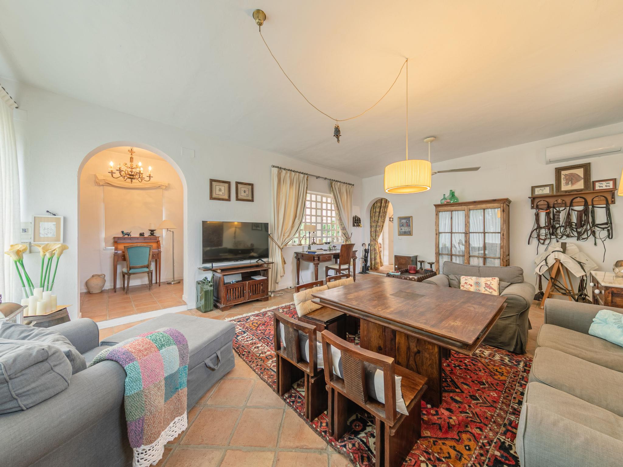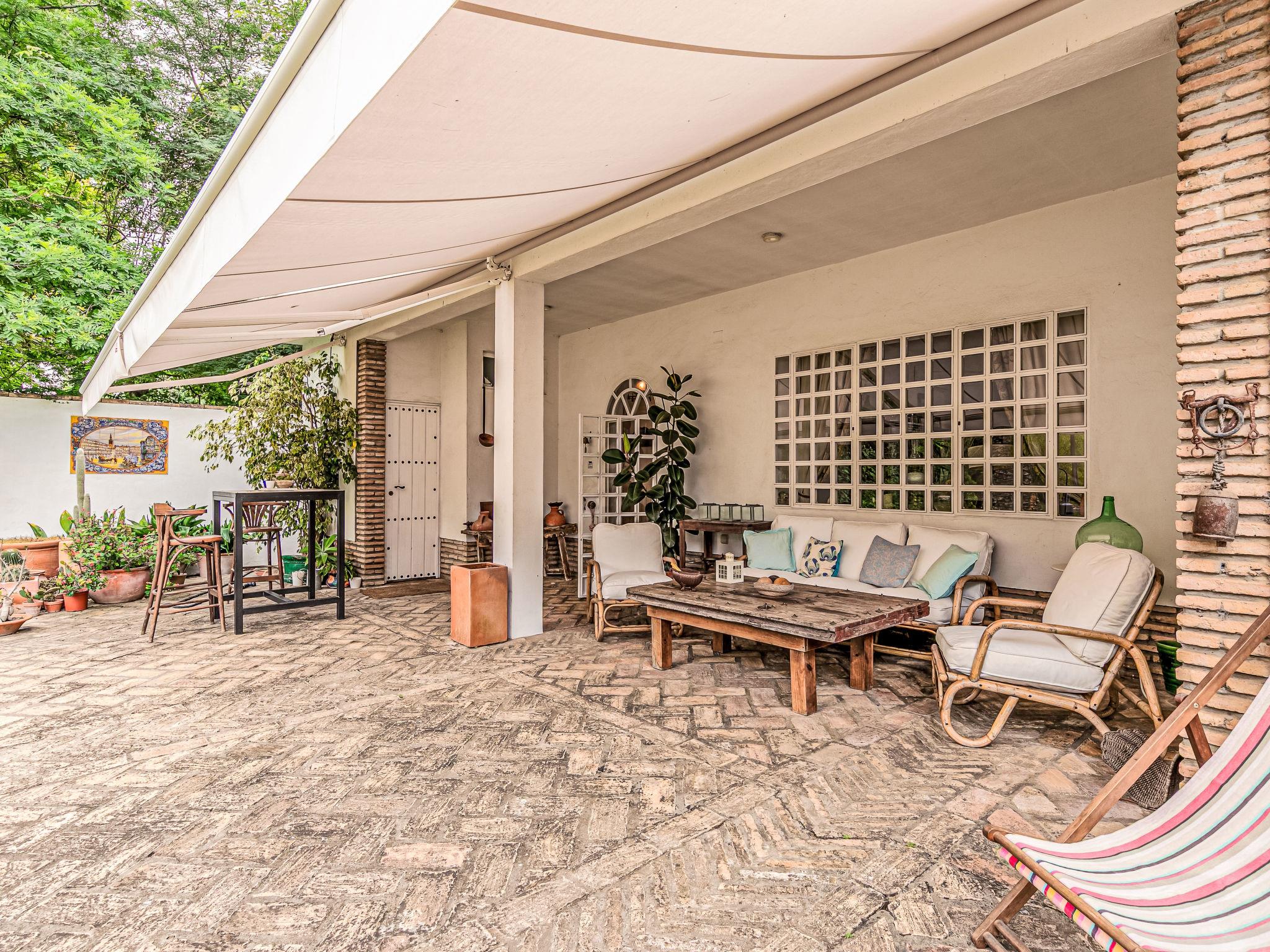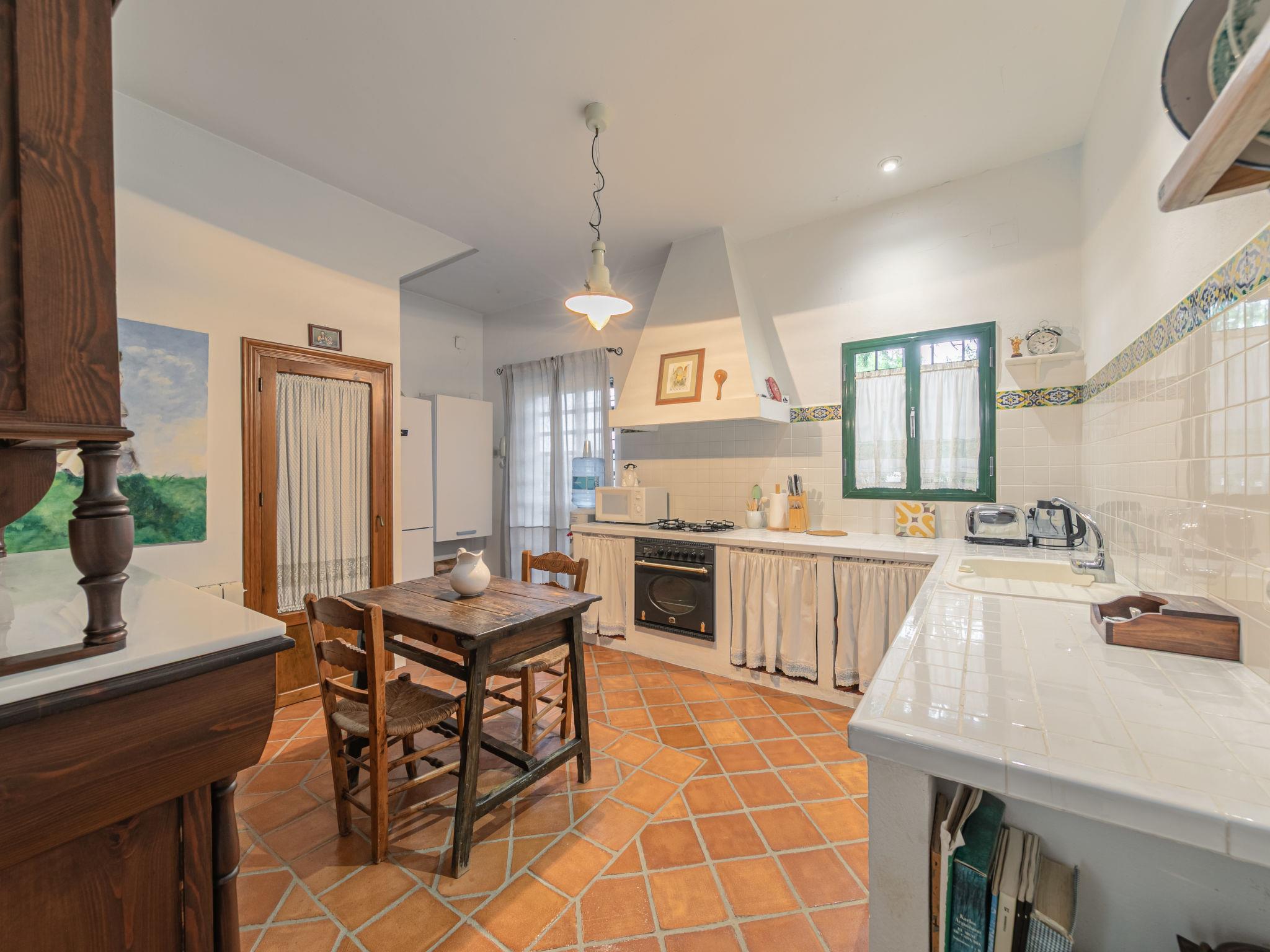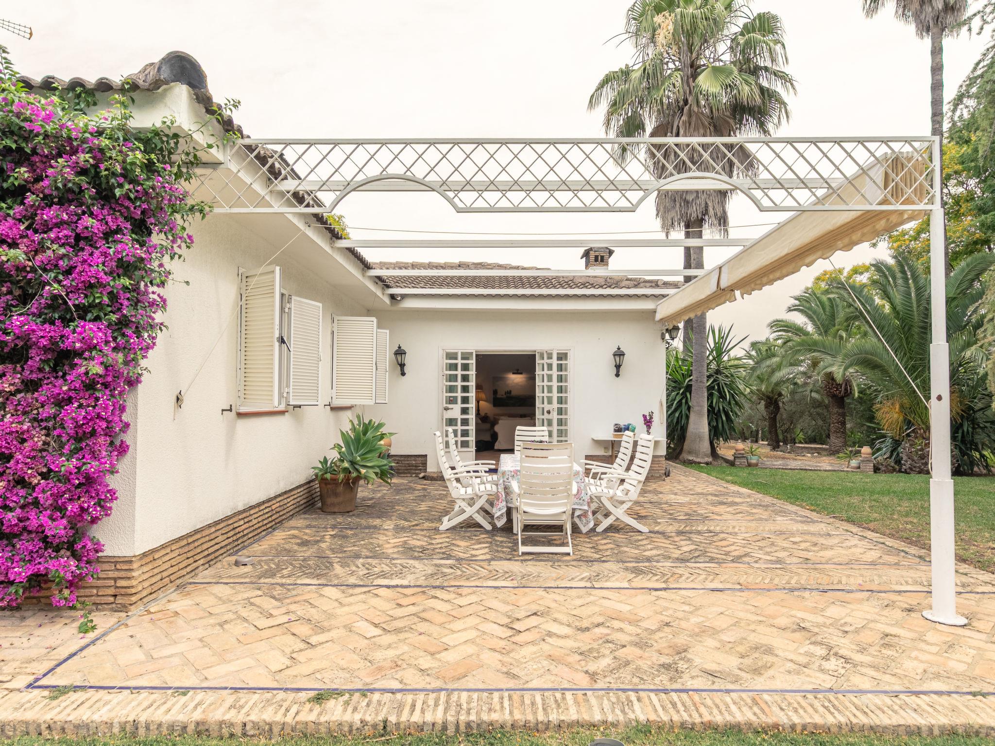 Comfortable villa "Las Codornices". On the outskirts Sanlúcar la Mayor, in a secluded, quiet, sunny position. Private: garden 9'000 m2 with lawn and trees, swimming pool (12 x 6 m, depth 170 - 185 cm, seasonal availability: 01.Jan. - 31.Dec.). Outdoor shower, pool house, parking (for 10 cars) at the house. Grocery 2 km, supermarket 2 km, restaurant 2 km, bakery 2 km, bus stop 2 km, railway station 2 km, sandy beach 60 km. Sports harbour 80 km, golf course (18 hole) 10 km, tennis 2 km. Nearby attractions: Sevilla 19 km, Aldea del Rocío 50 km. Hiking paths: Parque de Doñana 50 km, Corredor Verde del Río Guadiamar 2 km. The owner does not accept any youth groups.