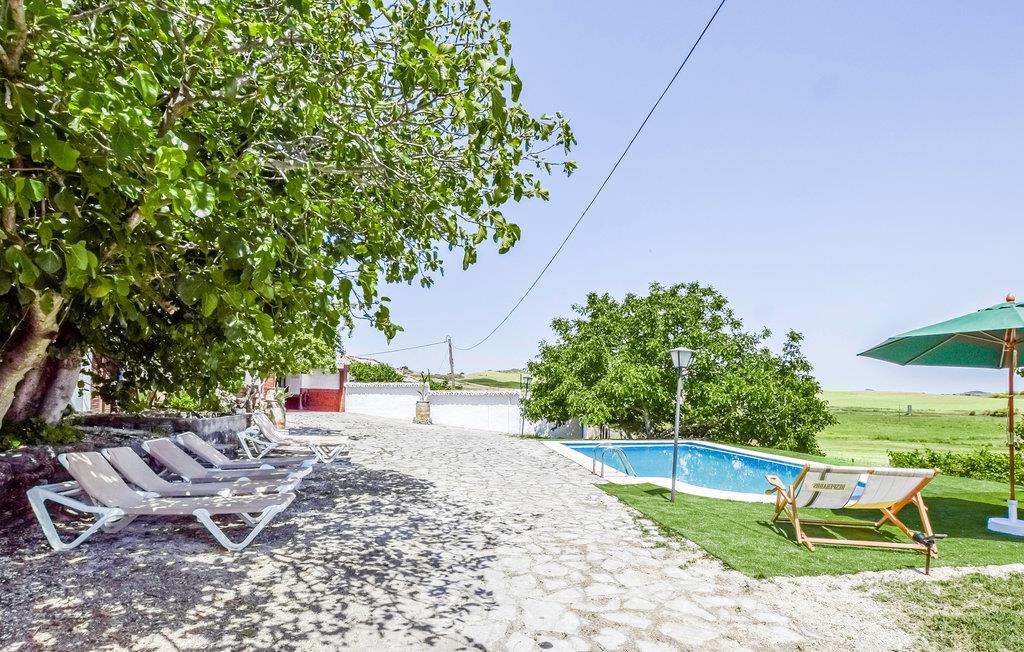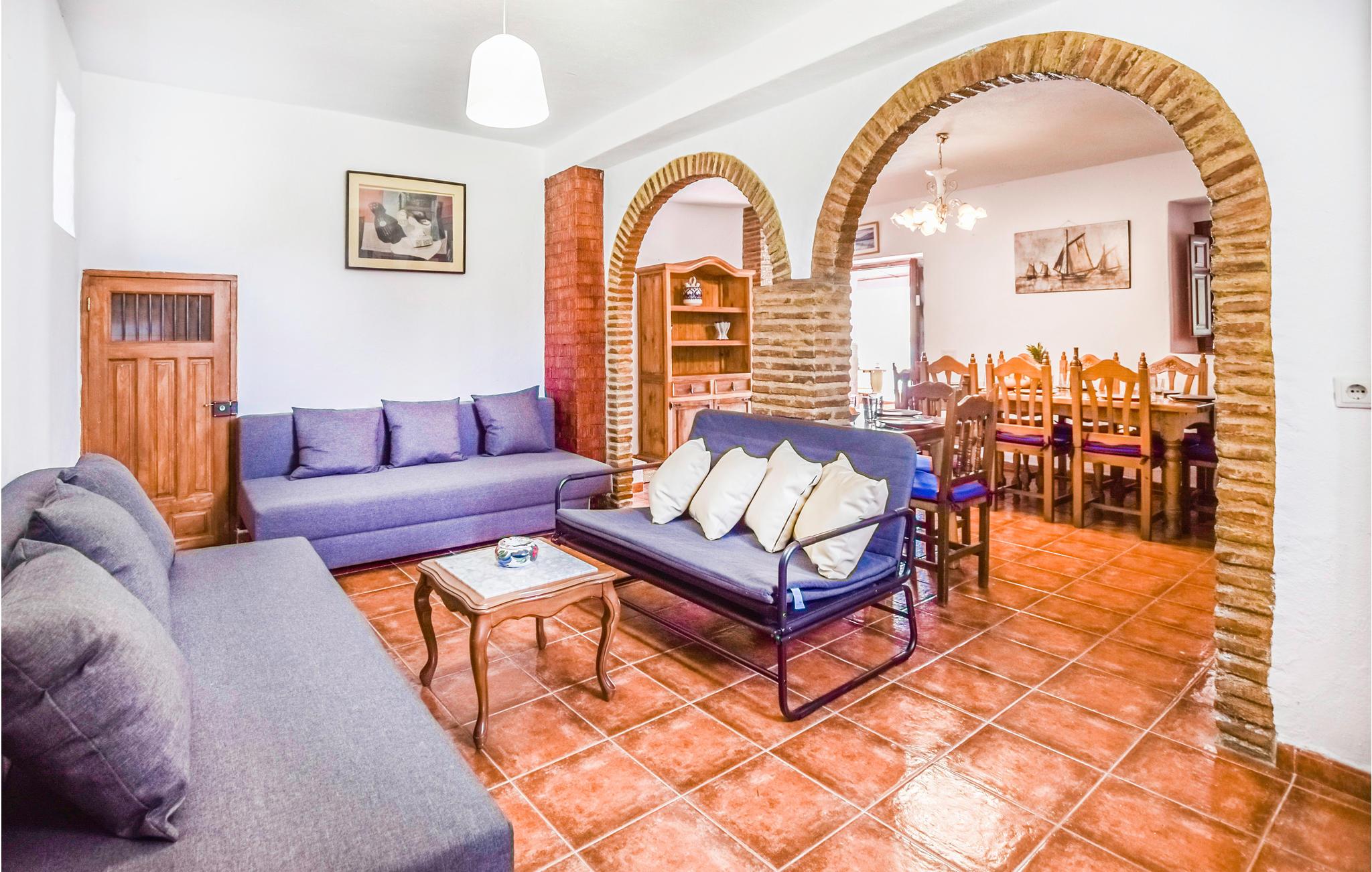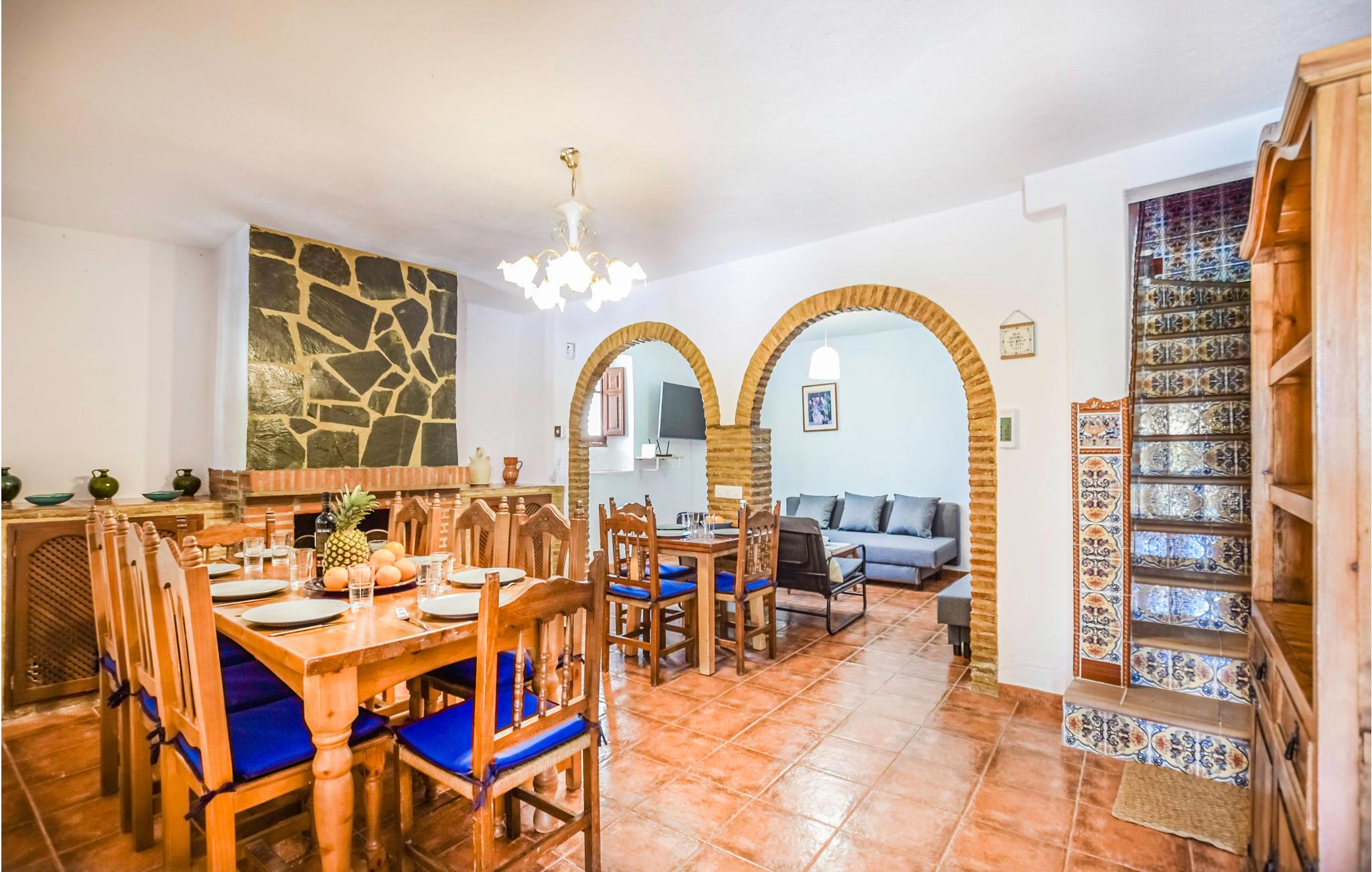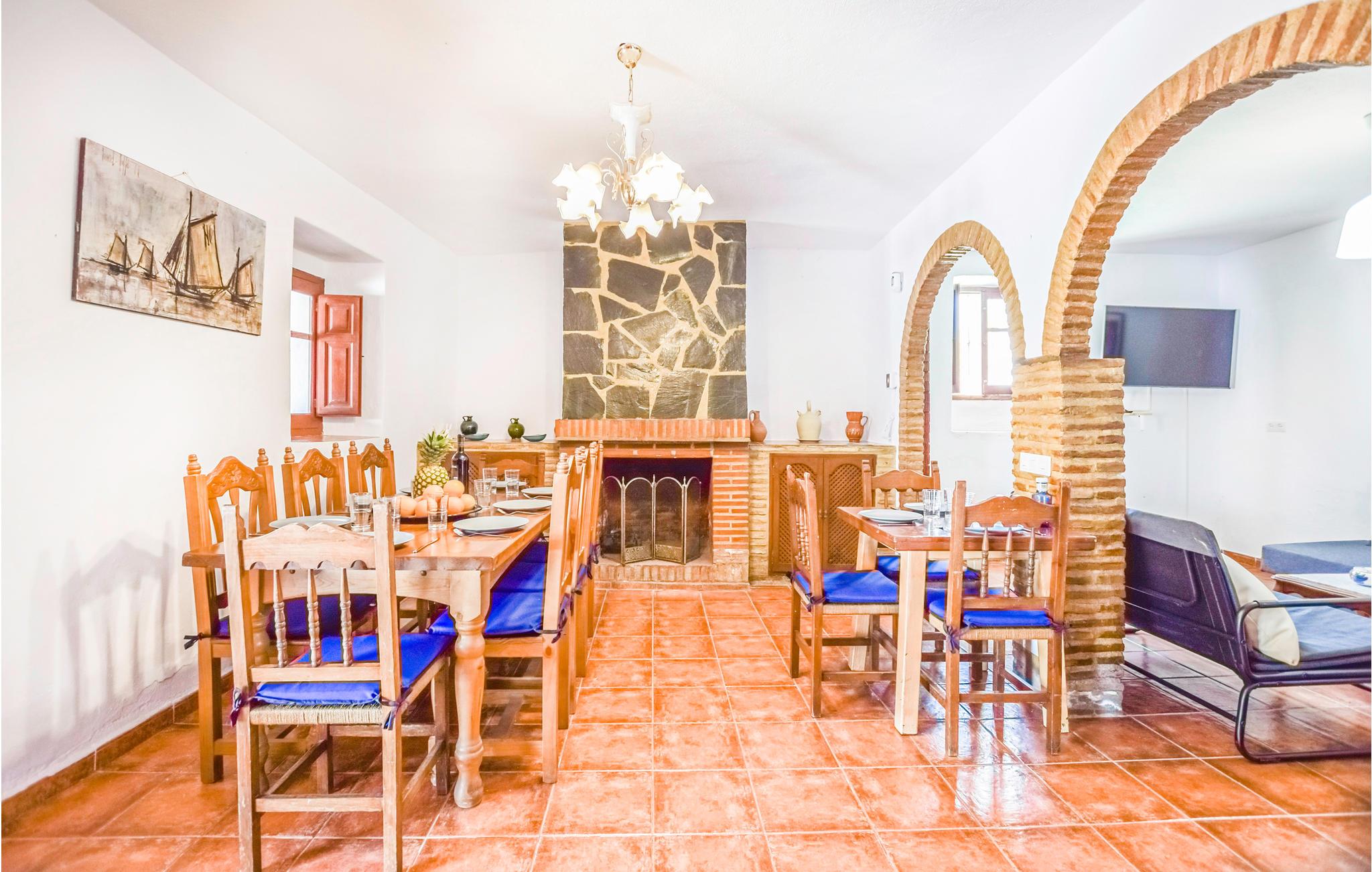 Føl jer hjemme i dette feriehus med fliser, som er prydet med runde buer, der fungerer som passager i opholdsrummene. I stuen er der komfortable sofaer og et tv, hvor I kan tilbringe afslappende timer med jeres selskab. Den rummelige spiseplads byder på et stort spisebord med rustikke træstole og en pejs, der kan skabe en hyggelig varme. De rustikke værelser byder på god plads, højt til loftet og enkle møbler. Udenfor kan I læne jer tilbage på verandaen, grille sammen eller slikke sol på liggestolene, mens den udendørs pool inviterer til forfriskende dukkerter i sommervarmen.