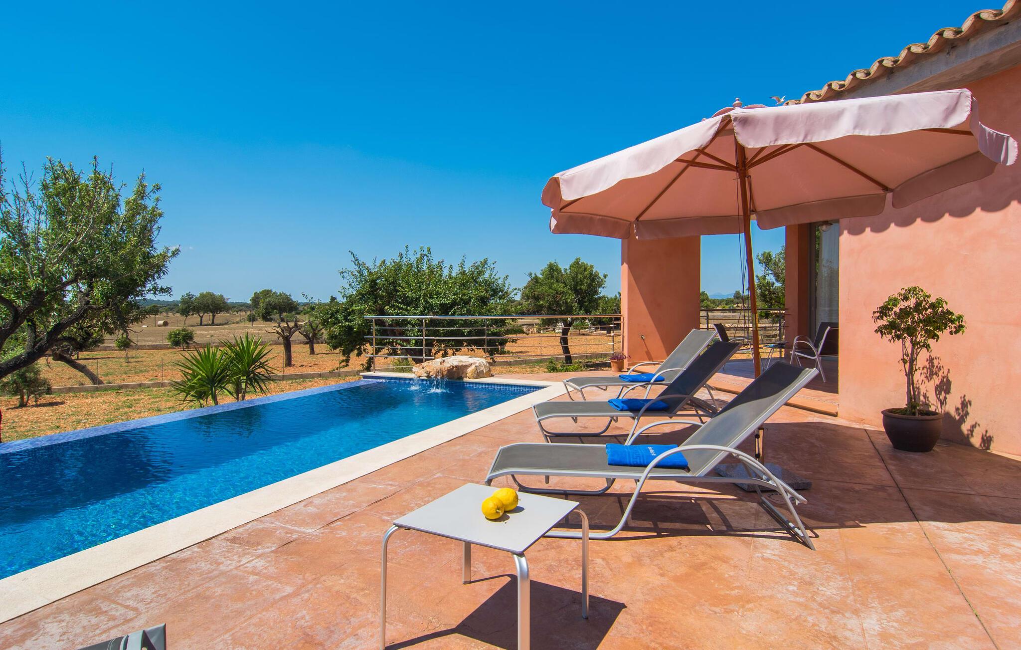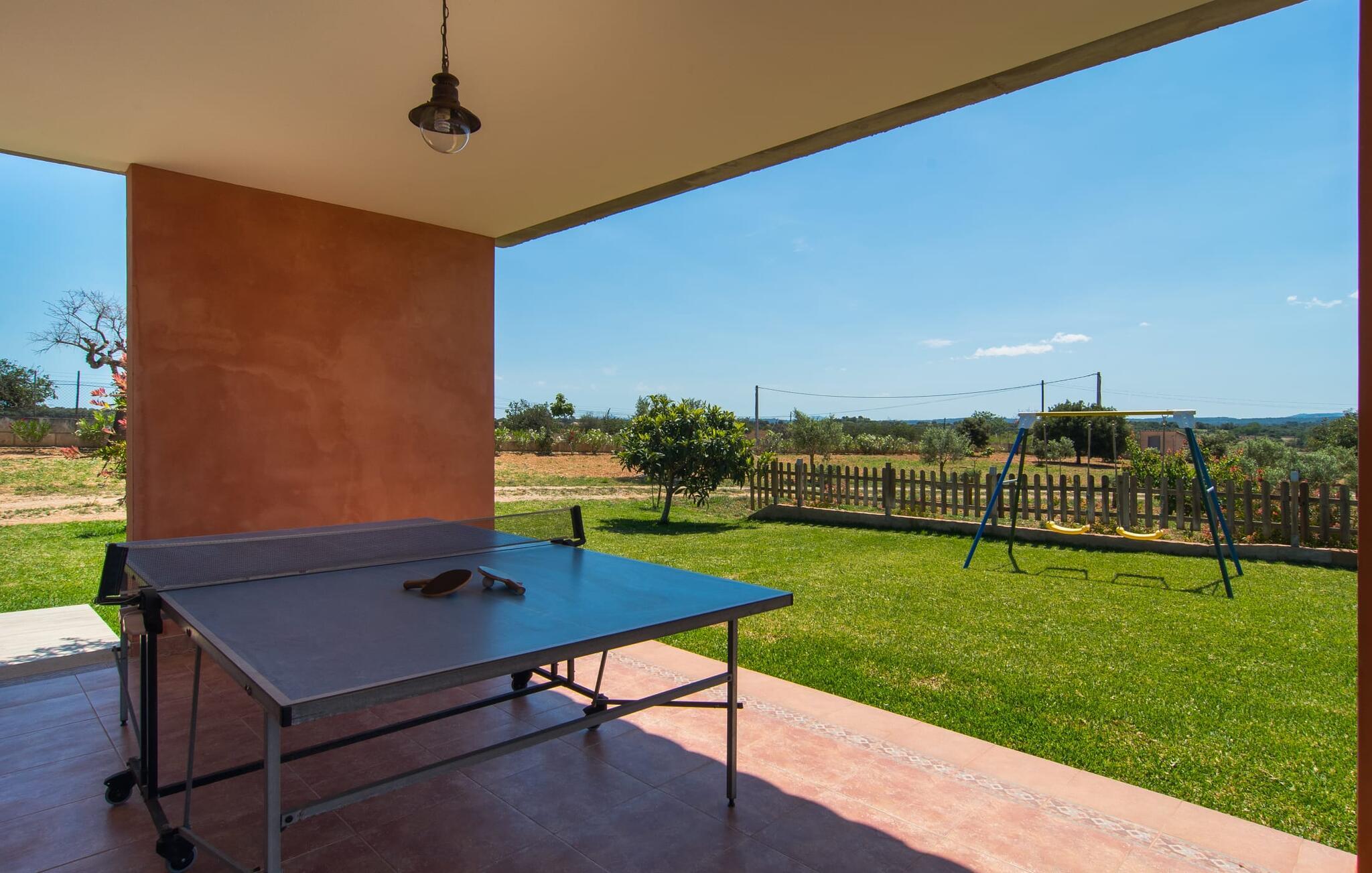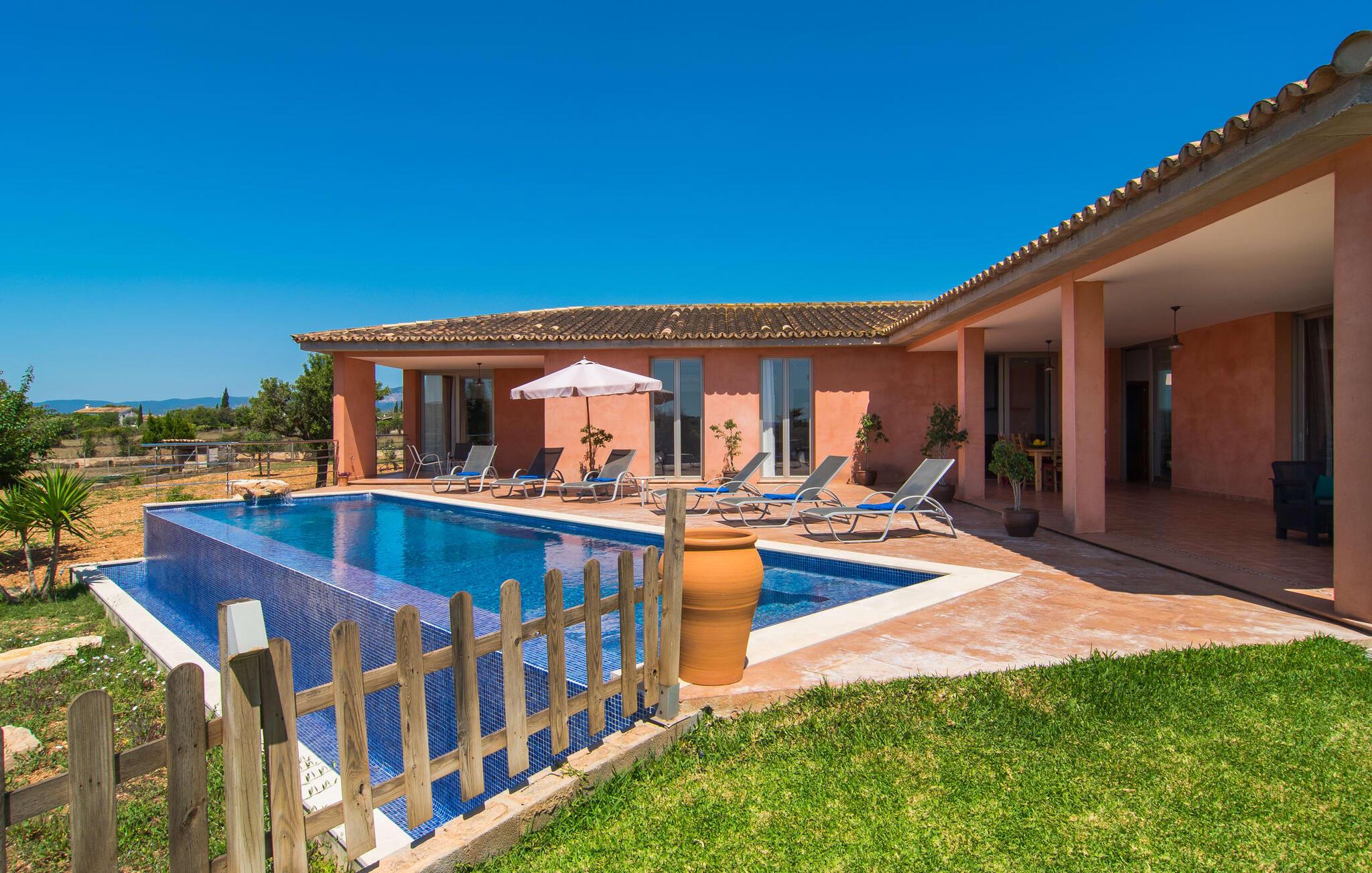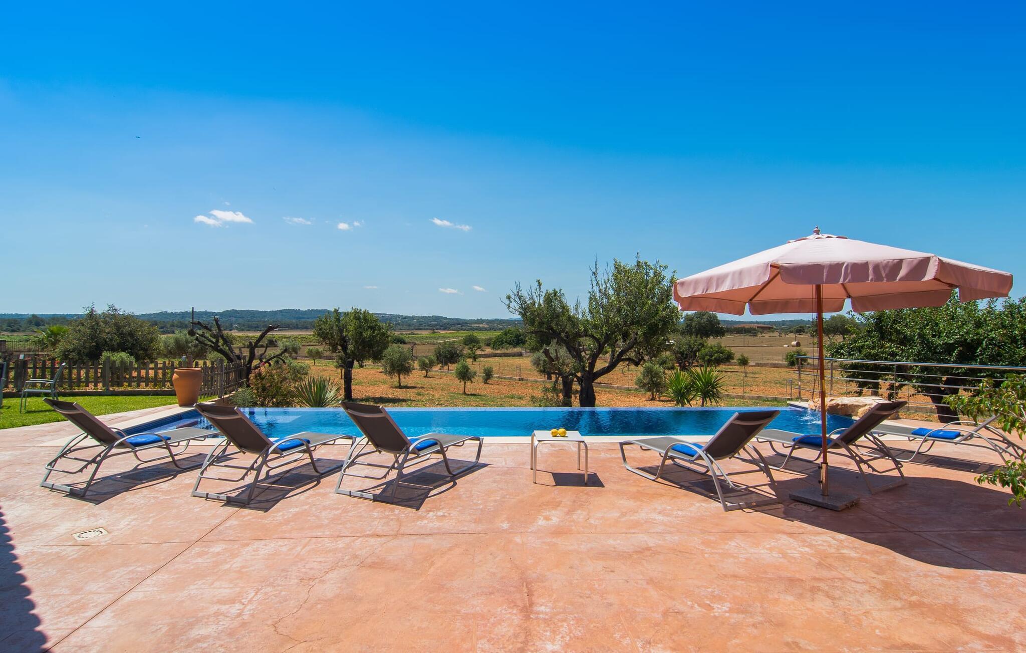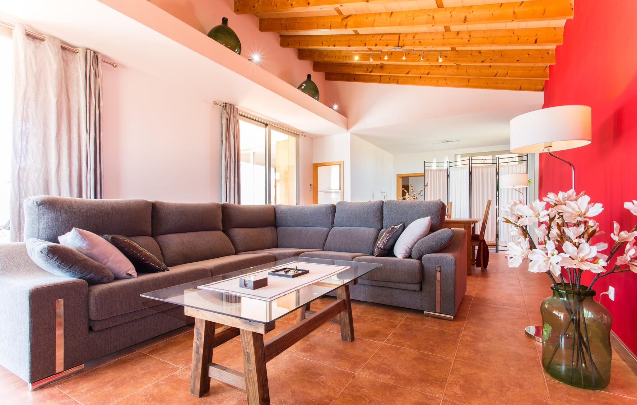 "Son Bordils Petit" har karakter af en ung, frugtig Prosecco frem for en langsomt modnet sen høst, som den dyrkes og sælges i den nærliggende "Ses Bordils"-vingård. Begge vil dog lige byde feinschmeckere, der værdsætter fordelene ved begge dele. Og denne villa har så meget at byde på, som vil fortrylle dig: dens smukke L-form med overdækkede terrasser, der fanger så meget lys - I kan se alt og alle her og bevæge jer med solen; infinity-poolen med dens komfortable trin og udsigt over mandeltræerne - I vil føle, at I blomstrer med dem, mens I svømmer runder; det lille grønne område med gynger - børn nyder deres egen legeplads; I er velkommen til at plukke frugt fra villaens figen-, blomme-, mispel- og abrikostræer, og friske æg er gratis - I vil ikke have for noget. Selvom ejendommen har "petit" i sit navn, er det eneste, der får det til at virke lille, de fjerne bjerge, der får det til at virke endnu mere betydningsfuldt. Et panorama at skåle for, med Coll-familiens prisvindende vin ved siden af... Der er også noget sprudlende over interiøret - hvis I ser rød, pink, blå og lilla, er det ikke fordi, I har haft lidt for meget til drikke. Den dristige brug af farve på individuelle vægge i stuen og soveværelset gør hvert værelse særpræget og suppleres smagfuldt af matchende billeder og møbler. Sådan ser livsstilen ud kombineret med livsglæde og fortjener bestemt navnet "Gran Reserva". Uanset hvilket soveværelse I vælger, kan I hoppe direkte ud af sengen ud i det fri og poolen - selvom der kan være skænderier om det ensuite badeværelse og walk-in closet! Det moderne, kompakte køkken med gulv-til-loft glasdøre udstråler kvalitet og lader intet tilbage at ønske; Med blot et par enkle trin kan I forvandle jeres indendørs og udendørs rum til jeres egen vinbar og bistro, der holder åbent til langt ud på natten. Og når det bliver varmt – hvad med et forfriskende brusebad? Eller, hvis I foretrækker det, et langt, afslappende bad i et badekar med levende lys? Da der er tre badeværelser, kan I sagtens tillade jer at indtage det ene i en periode. Mallorcas centrum inviterer jer til at finde jeres naturlige balance! By og land, centralt beliggende, men stadig lidt væk fra alfarvej - den tætte nærhed til Ma-3240 til Sineu (hørbar uden for villaen) betyder, at I kan være på farten næsten med det samme. Derfra er det kun 7 minutters kørsel nordpå til Inca, en af øens livlige hovedbyer. Traditionelle kældertaverner som Celler Can Amer på Carrer de la Pau byder på et udpluk af regionens specialiteter, og I kan ofte finde et kup i de mange læderværksteder. Eller se over skuldrene på skomagerne i det nærliggende Lloseta, og forkæl jer selv med et par Bestard-bjergstøvler til en vandretur i Serra de Tramuntana-bjergene. Når I rejser gennem en region fuld af vindmøller mod Sineu og Costitx, vil I finde andre traditionelle attraktioner som det populære ugentlige marked (med middelalderlige omgivelser), det eneste observatorium på Mallorca og mange kulinariske overraskelser. Og selvfølgelig god vin lagret under den spanske sol... Med sin bjergrige kulisse, der passer til et filmsæt, sine vinstokke og frugttræer, bekvemt placeret mellem byen Inca - berømt for sit læder - og landlige Costitx i hjertet. -etagers, moderne villa "Son Bordils Petit" med en vidunderlig pool og stor grund venter jer på øen. På den ene side er der endeløse timers shopping, på den anden side venter vindmøller, et observatorium og øens historie på at forføre jer. Havet er heller ikke langt væk: I finder smukke strande inden for en radius af 30 km.