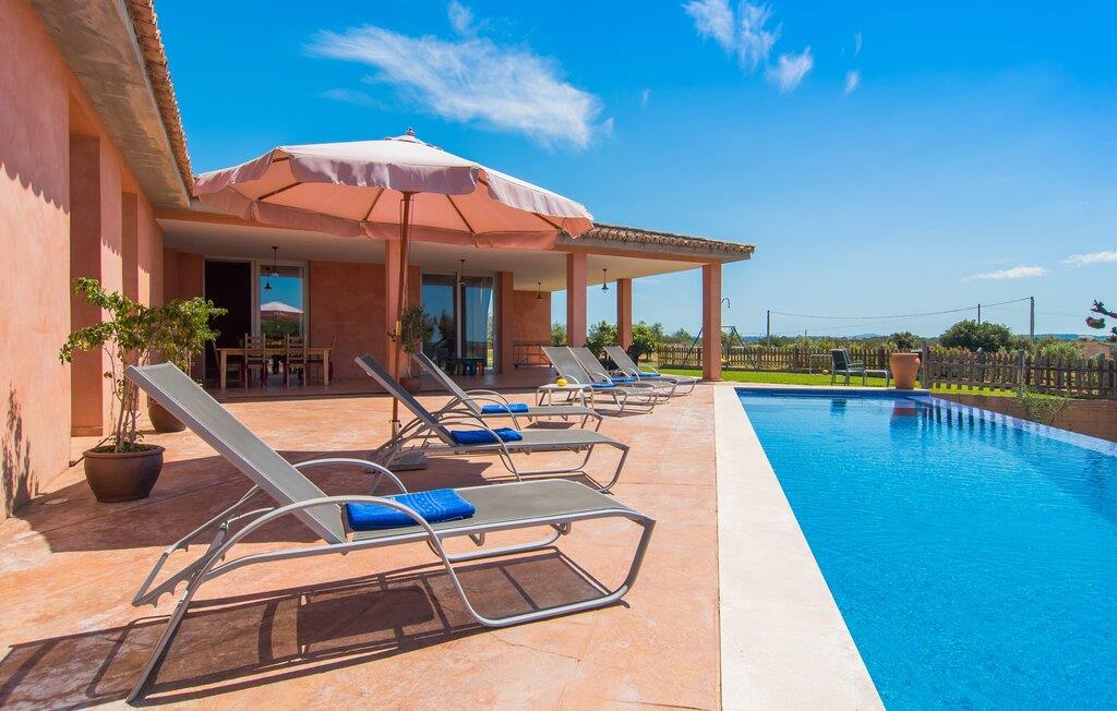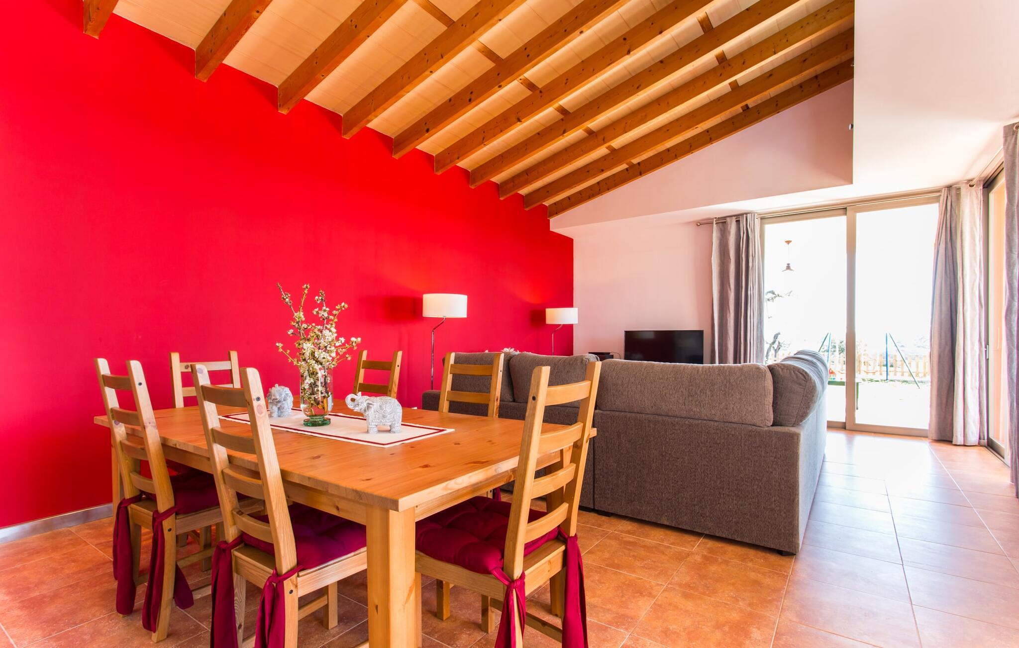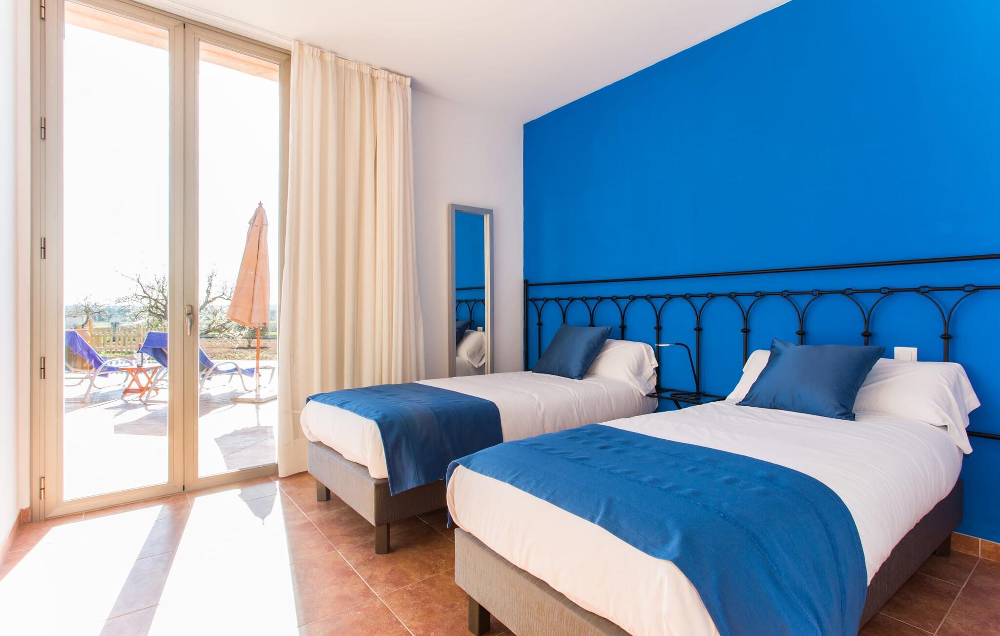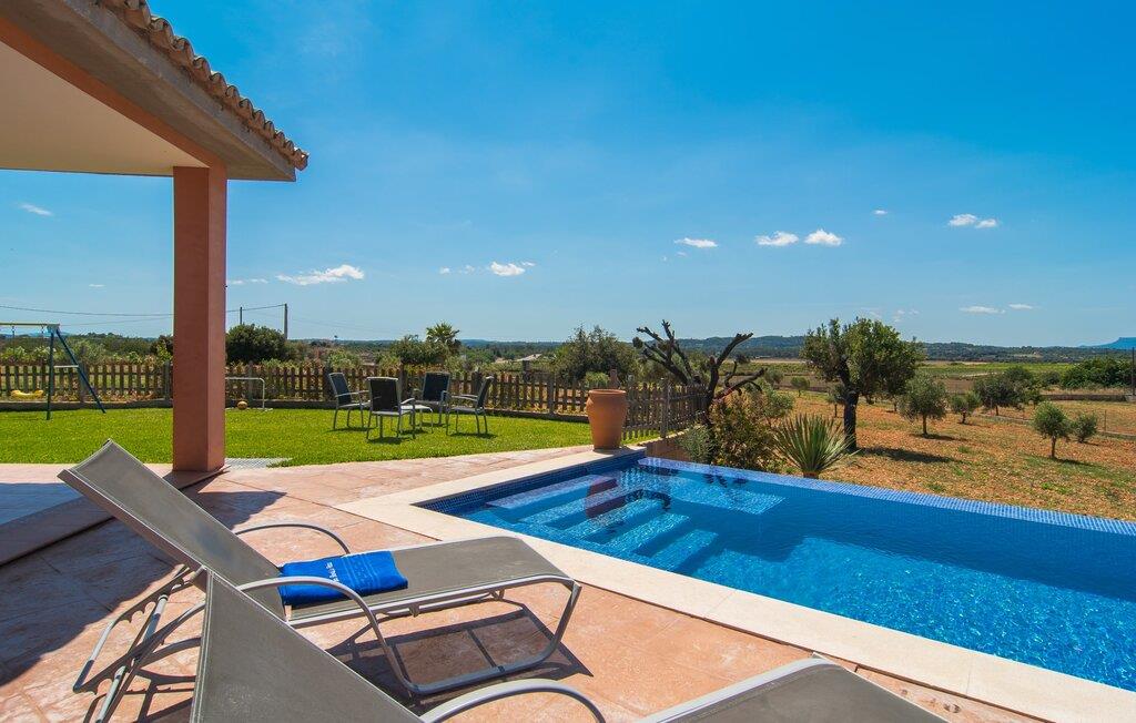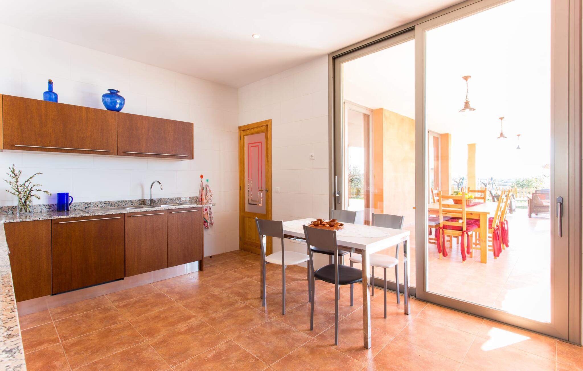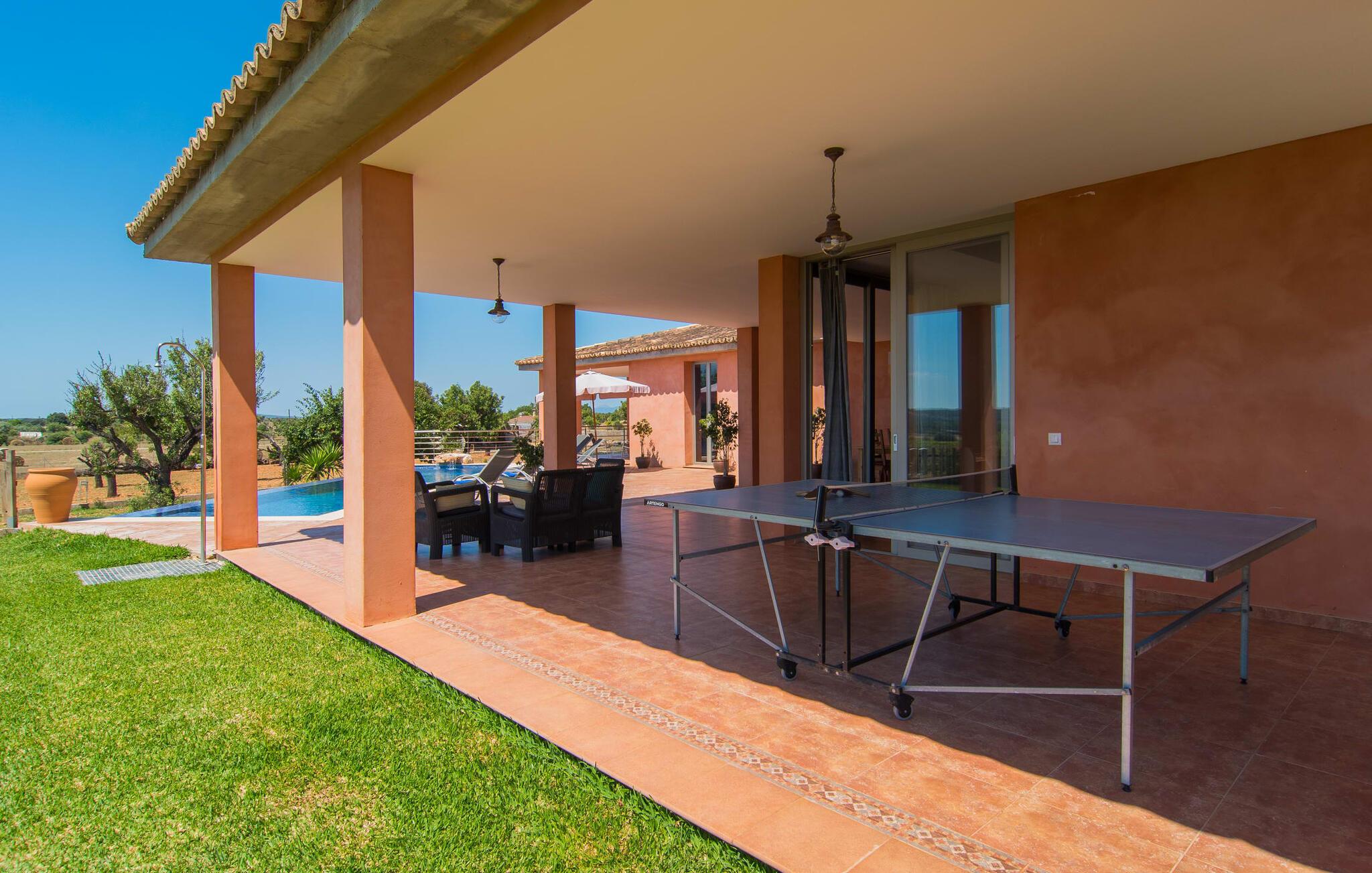"Son Bordils Petit" har karakter af en ung, frugtig Prosecco frem for en langsomt modnet sen høst, som den dyrkes og sælges i den nærliggende "Ses Bordils"-vingård. Begge vil dog lige byde feinschmeckere, der værdsætter fordelene ved begge dele. Og denne villa har så meget at byde på, som vil fortrylle dig: dens smukke L-form med overdækkede terrasser, der fanger så meget lys - I kan se alt og alle her og bevæge jer med solen; infinity-poolen med dens komfortable trin og udsigt over mandeltræerne - I vil føle, at I blomstrer med dem, mens I svømmer runder; det lille grønne område med gynger - børn nyder deres egen legeplads; I er velkommen til at plukke frugt fra villaens figen-, blomme-, mispel- og abrikostræer, og friske æg er gratis - I vil ikke have for noget. Selvom ejendommen har "petit" i sit navn, er det eneste, der får det til at virke lille, de fjerne bjerge, der får det til at virke endnu mere betydningsfuldt. Et panorama at skåle for, med Coll-familiens prisvindende vin ved siden af... Der er også noget sprudlende over interiøret - hvis I ser rød, pink, blå og lilla, er det ikke fordi, I har haft lidt for meget til drikke. Den dristige brug af farve på individuelle vægge i stuen og soveværelset gør hvert værelse særpræget og suppleres smagfuldt af matchende billeder og møbler. Sådan ser livsstilen ud kombineret med livsglæde og fortjener bestemt navnet "Gran Reserva". Uanset hvilket soveværelse I vælger, kan I hoppe direkte ud af sengen ud i det fri og poolen - selvom der kan være skænderier om det ensuite badeværelse og walk-in closet! Det moderne, kompakte køkken med gulv-til-loft glasdøre udstråler kvalitet og lader intet tilbage at ønske; Med blot et par enkle trin kan I forvandle jeres indendørs og udendørs rum til jeres egen vinbar og bistro, der holder åbent til langt ud på natten. Og når det bliver varmt – hvad med et forfriskende brusebad? Eller, hvis I foretrækker det, et langt, afslappende bad i et badekar med levende lys? Da der er tre badeværelser, kan I sagtens tillade jer at indtage det ene i en periode. Mallorcas centrum inviterer jer til at finde jeres naturlige balance! By og land, centralt beliggende, men stadig lidt væk fra alfarvej - den tætte nærhed til Ma-3240 til Sineu (hørbar uden for villaen) betyder, at I kan være på farten næsten med det samme. Derfra er det kun 7 minutters kørsel nordpå til Inca, en af øens livlige hovedbyer. Traditionelle kældertaverner som Celler Can Amer på Carrer de la Pau byder på et udpluk af regionens specialiteter, og I kan ofte finde et kup i de mange læderværksteder. Eller se over skuldrene på skomagerne i det nærliggende Lloseta, og forkæl jer selv med et par Bestard-bjergstøvler til en vandretur i Serra de Tramuntana-bjergene. Når I rejser gennem en region fuld af vindmøller mod Sineu og Costitx, vil I finde andre traditionelle attraktioner som det populære ugentlige marked (med middelalderlige omgivelser), det eneste observatorium på Mallorca og mange kulinariske overraskelser. Og selvfølgelig god vin lagret under den spanske sol... Med sin bjergrige kulisse, der passer til et filmsæt, sine vinstokke og frugttræer, bekvemt placeret mellem byen Inca - berømt for sit læder - og landlige Costitx i hjertet. -etagers, moderne villa "Son Bordils Petit" med en vidunderlig pool og stor grund venter jer på øen. På den ene side er der endeløse timers shopping, på den anden side venter vindmøller, et observatorium og øens historie på at forføre jer. Havet er heller ikke langt væk: I finder smukke strande inden for en radius af 30 km.