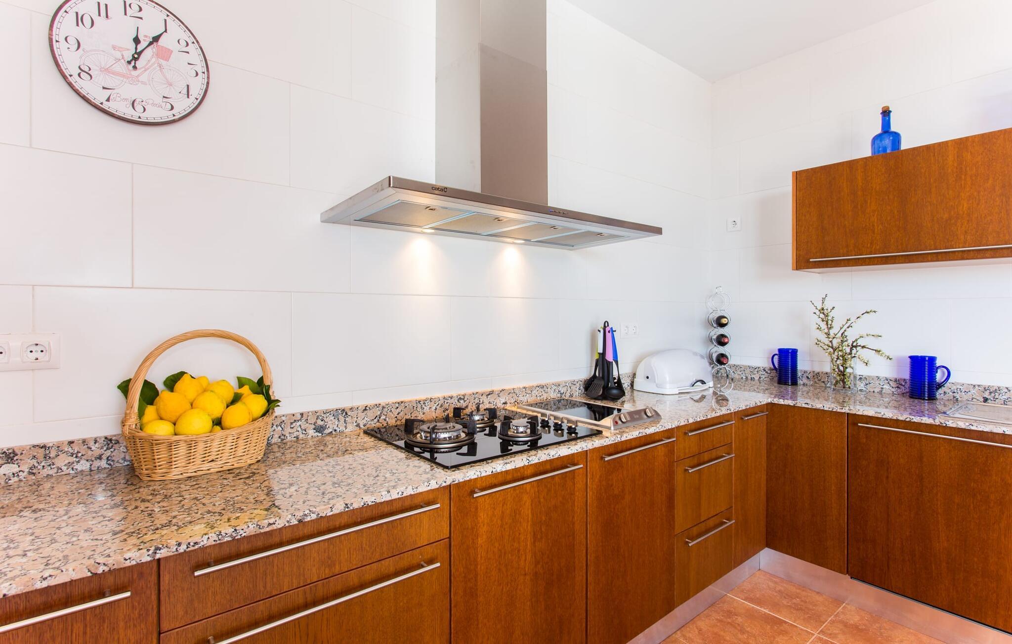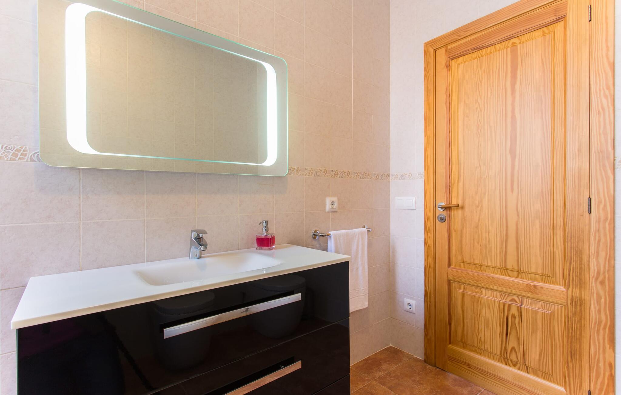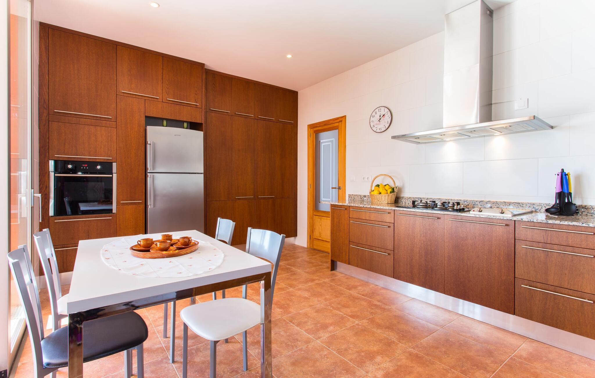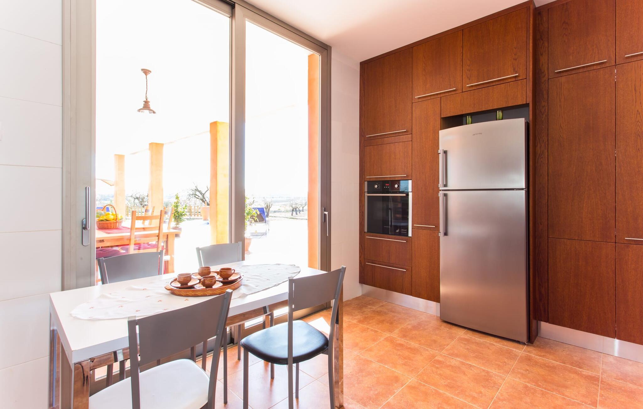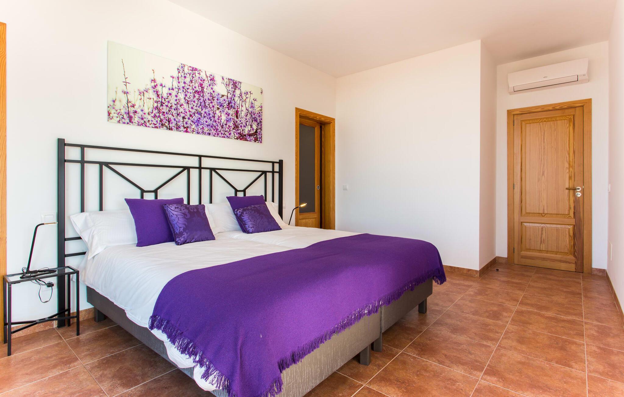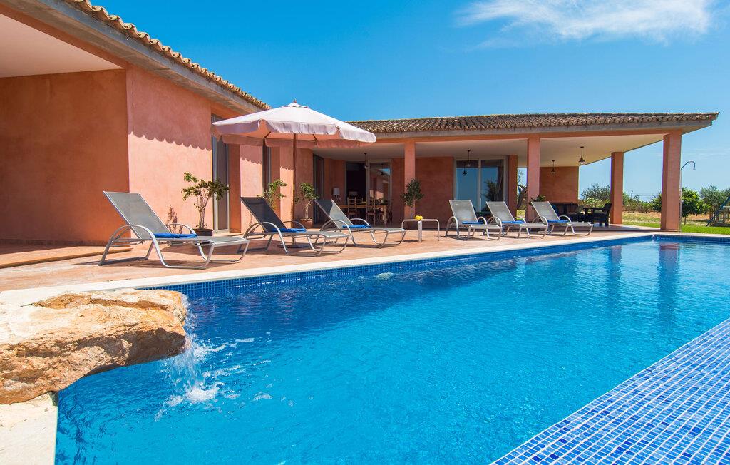 "Son Bordils Petit" har karakter af en ung, frugtig Prosecco frem for en langsomt modnet sen høst, som den dyrkes og sælges i den nærliggende "Ses Bordils"-vingård. Begge vil dog lige byde feinschmeckere, der værdsætter fordelene ved begge dele. Og denne villa har så meget at byde på, som vil fortrylle dig: dens smukke L-form med overdækkede terrasser, der fanger så meget lys - I kan se alt og alle her og bevæge jer med solen; infinity-poolen med dens komfortable trin og udsigt over mandeltræerne - I vil føle, at I blomstrer med dem, mens I svømmer runder; det lille grønne område med gynger - børn nyder deres egen legeplads; I er velkommen til at plukke frugt fra villaens figen-, blomme-, mispel- og abrikostræer, og friske æg er gratis - I vil ikke have for noget. Selvom ejendommen har "petit" i sit navn, er det eneste, der får det til at virke lille, de fjerne bjerge, der får det til at virke endnu mere betydningsfuldt. Et panorama at skåle for, med Coll-familiens prisvindende vin ved siden af... Der er også noget sprudlende over interiøret - hvis I ser rød, pink, blå og lilla, er det ikke fordi, I har haft lidt for meget til drikke. Den dristige brug af farve på individuelle vægge i stuen og soveværelset gør hvert værelse særpræget og suppleres smagfuldt af matchende billeder og møbler. Sådan ser livsstilen ud kombineret med livsglæde og fortjener bestemt navnet "Gran Reserva". Uanset hvilket soveværelse I vælger, kan I hoppe direkte ud af sengen ud i det fri og poolen - selvom der kan være skænderier om det ensuite badeværelse og walk-in closet! Det moderne, kompakte køkken med gulv-til-loft glasdøre udstråler kvalitet og lader intet tilbage at ønske; Med blot et par enkle trin kan I forvandle jeres indendørs og udendørs rum til jeres egen vinbar og bistro, der holder åbent til langt ud på natten. Og når det bliver varmt – hvad med et forfriskende brusebad? Eller, hvis I foretrækker det, et langt, afslappende bad i et badekar med levende lys? Da der er tre badeværelser, kan I sagtens tillade jer at indtage det ene i en periode. Mallorcas centrum inviterer jer til at finde jeres naturlige balance! By og land, centralt beliggende, men stadig lidt væk fra alfarvej - den tætte nærhed til Ma-3240 til Sineu (hørbar uden for villaen) betyder, at I kan være på farten næsten med det samme. Derfra er det kun 7 minutters kørsel nordpå til Inca, en af øens livlige hovedbyer. Traditionelle kældertaverner som Celler Can Amer på Carrer de la Pau byder på et udpluk af regionens specialiteter, og I kan ofte finde et kup i de mange læderværksteder. Eller se over skuldrene på skomagerne i det nærliggende Lloseta, og forkæl jer selv med et par Bestard-bjergstøvler til en vandretur i Serra de Tramuntana-bjergene. Når I rejser gennem en region fuld af vindmøller mod Sineu og Costitx, vil I finde andre traditionelle attraktioner som det populære ugentlige marked (med middelalderlige omgivelser), det eneste observatorium på Mallorca og mange kulinariske overraskelser. Og selvfølgelig god vin lagret under den spanske sol... Med sin bjergrige kulisse, der passer til et filmsæt, sine vinstokke og frugttræer, bekvemt placeret mellem byen Inca - berømt for sit læder - og landlige Costitx i hjertet. -etagers, moderne villa "Son Bordils Petit" med en vidunderlig pool og stor grund venter jer på øen. På den ene side er der endeløse timers shopping, på den anden side venter vindmøller, et observatorium og øens historie på at forføre jer. Havet er heller ikke langt væk: I finder smukke strande inden for en radius af 30 km.