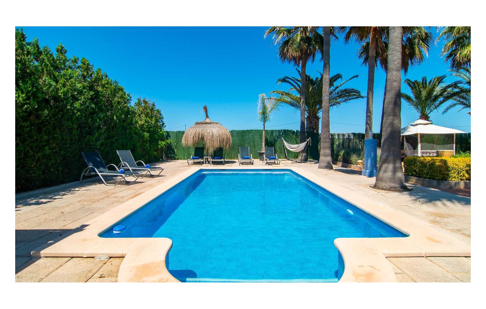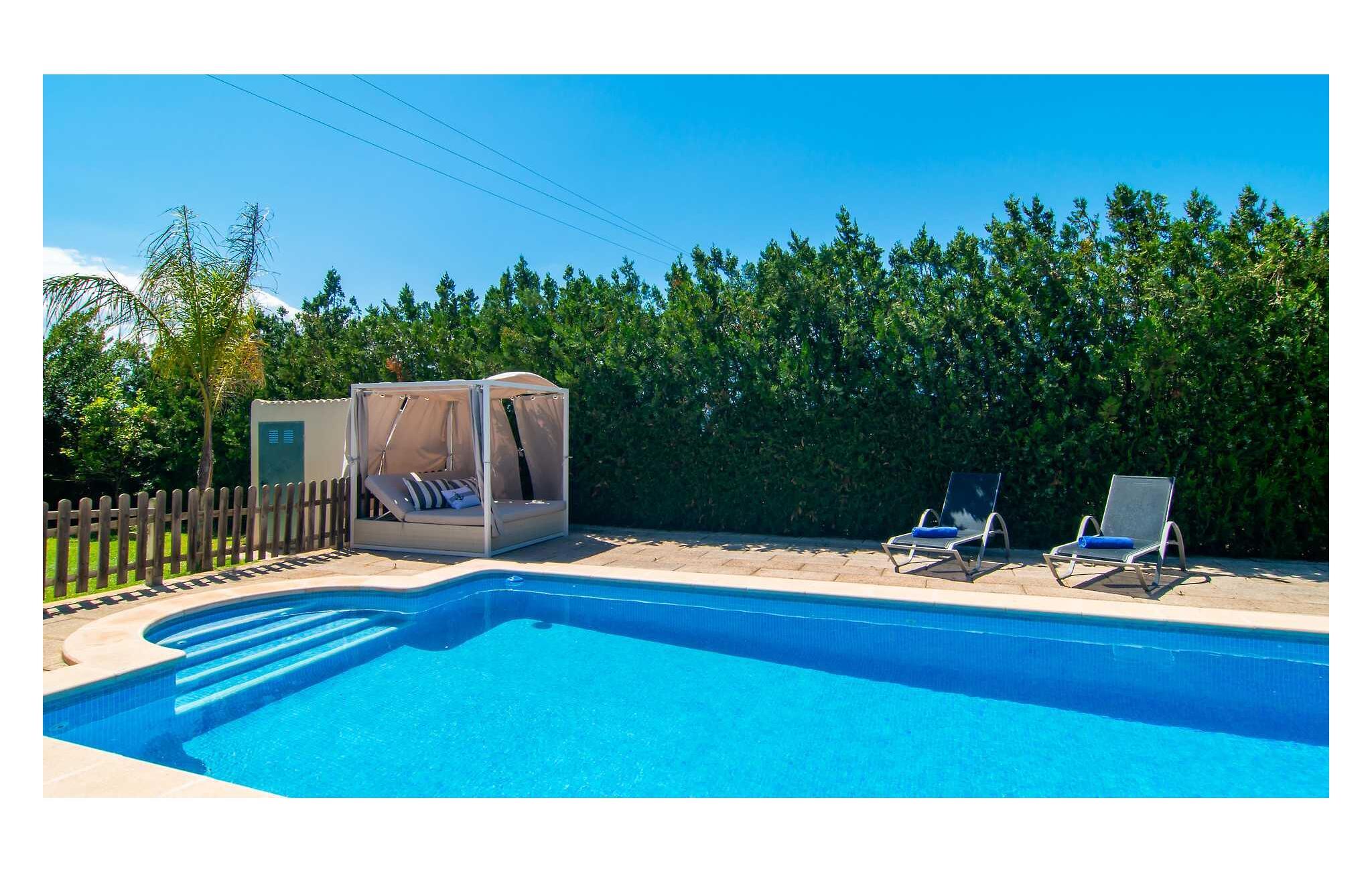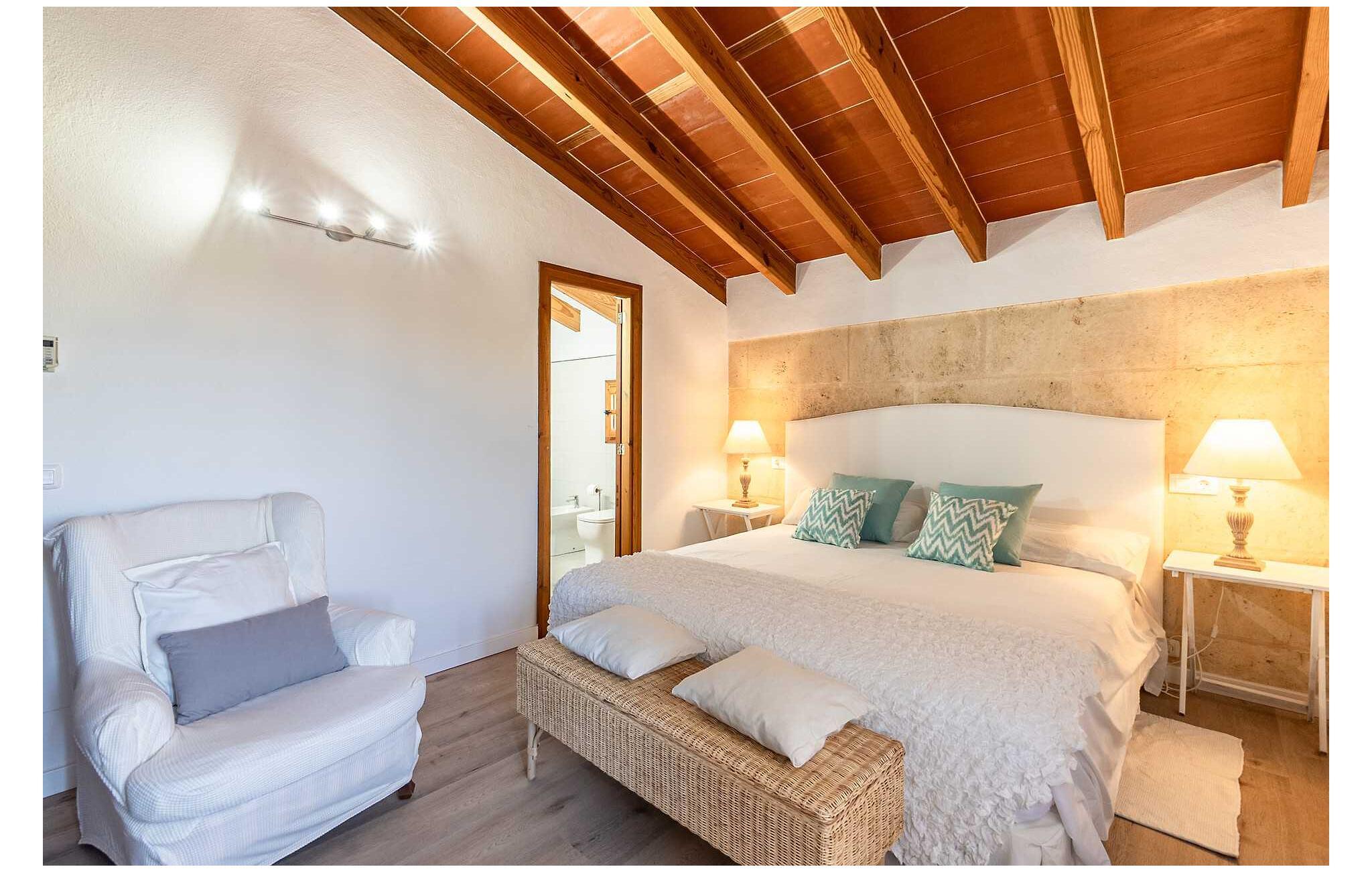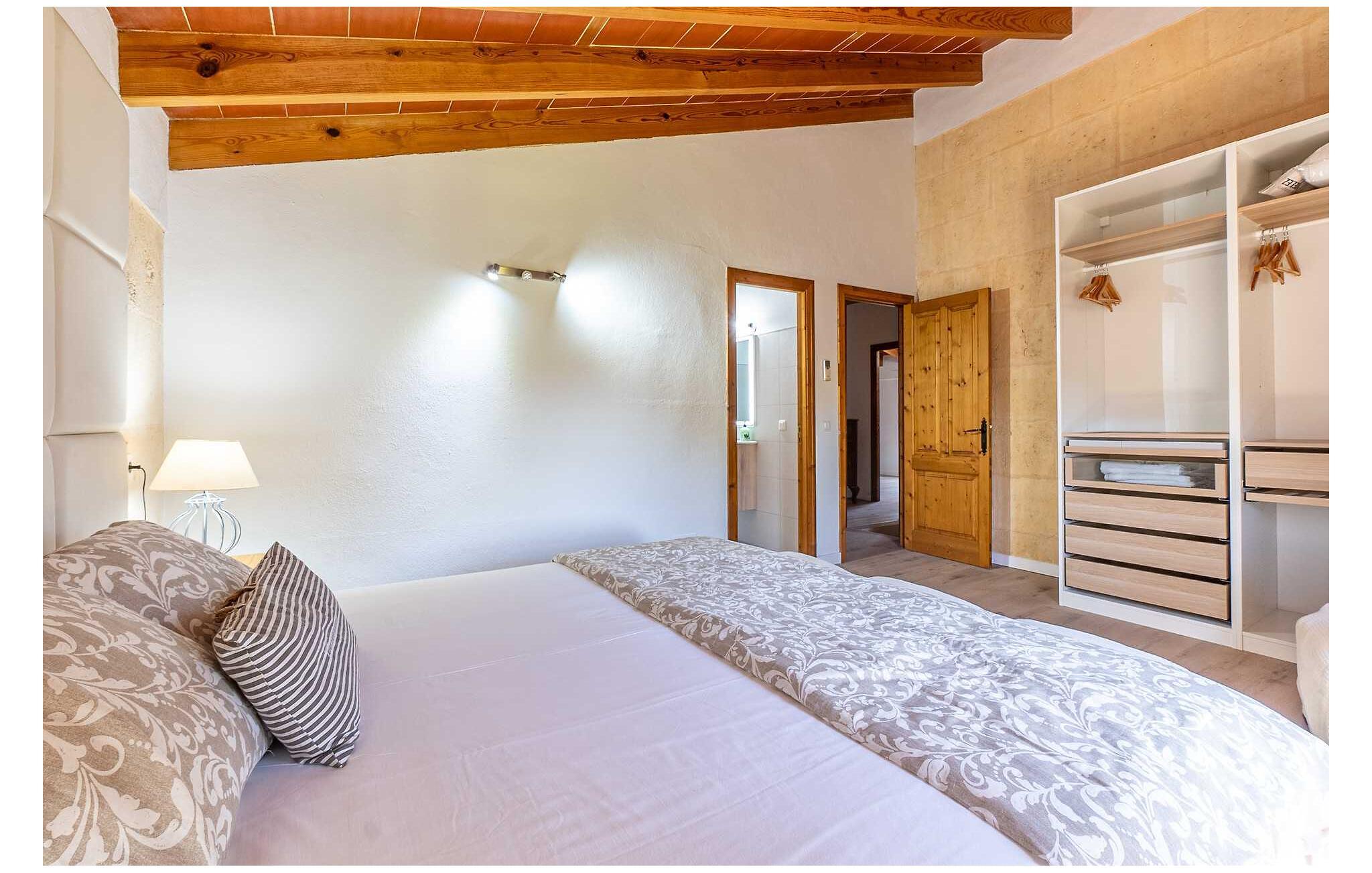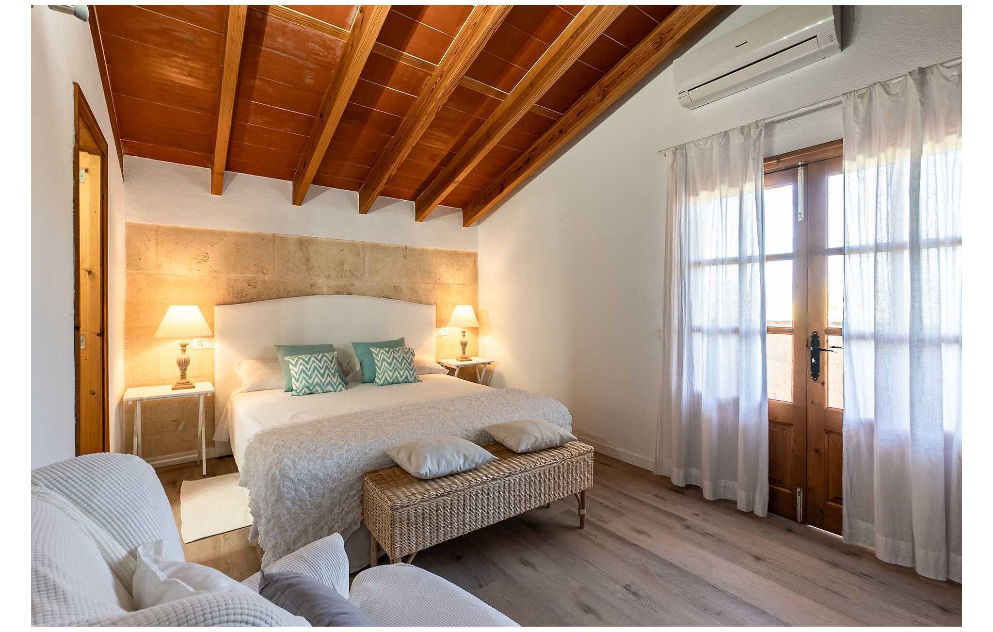 Feriehuset "Son Claret" er en grøn oase på fladt landbrugsområde nær Muro, kun 10 minutter fra sandstranden i Alcúdia-bugten. Ejendommen er helt privat og omgivet af hække og hegn. Poolterrassen har en let skrånende pool med trappeadgang, liggestole og en hyggelig dagseng med høje palmer, der giver skygge. I tilknytning til huset er en skyggefuld spiseplads under en overdækket terrasse med udsigt over poolen. Renoveret i 2024, interiøret omfatter lyse, smagfuldt indrettede værelser. Den åbne planløsning giver nem adgang til terrassen og poolen gennem en glasskydedør. Det rummelige køkken med integreret spiseplads er udstyret med moderne hårde hvidevarer og har egen udgang til det fri. Et badeværelse med bruser fuldender stueetagen. Der er tre komfortable dobbeltværelser på øverste etage; to har ensuite badeværelser og en har en privat balkon. Huset har aircondition og skodder til perfekt mørke. Beliggende omkring 3 km fra Muro og 8 km fra Can Picafort, er "Son Claret" ideel til fjernarbejde, med stabilt internet og god mobilmodtagelse. Den lange sandstrand i Alcúdia-bugten ligger mindre end 10 minutter væk i bil.