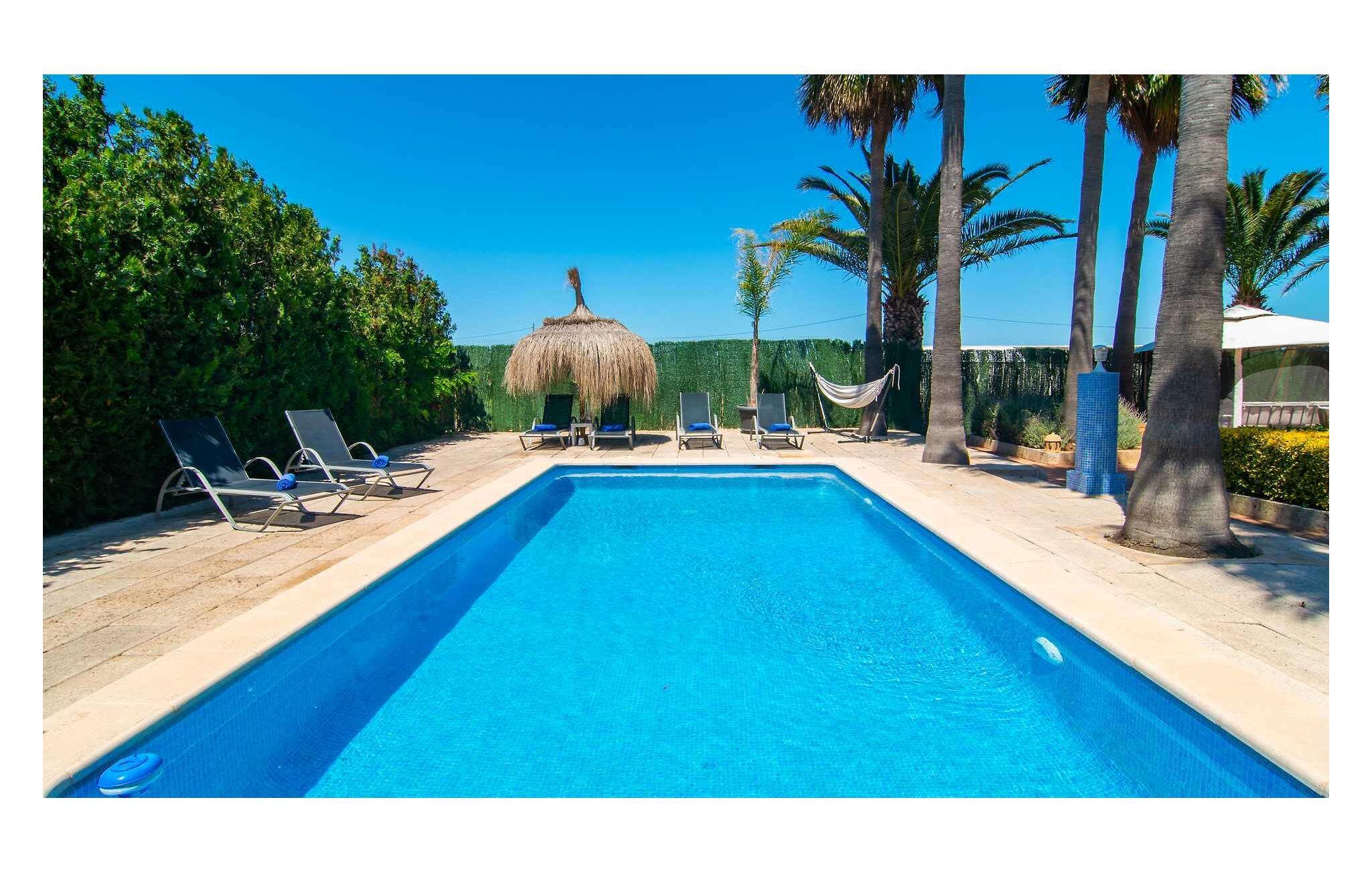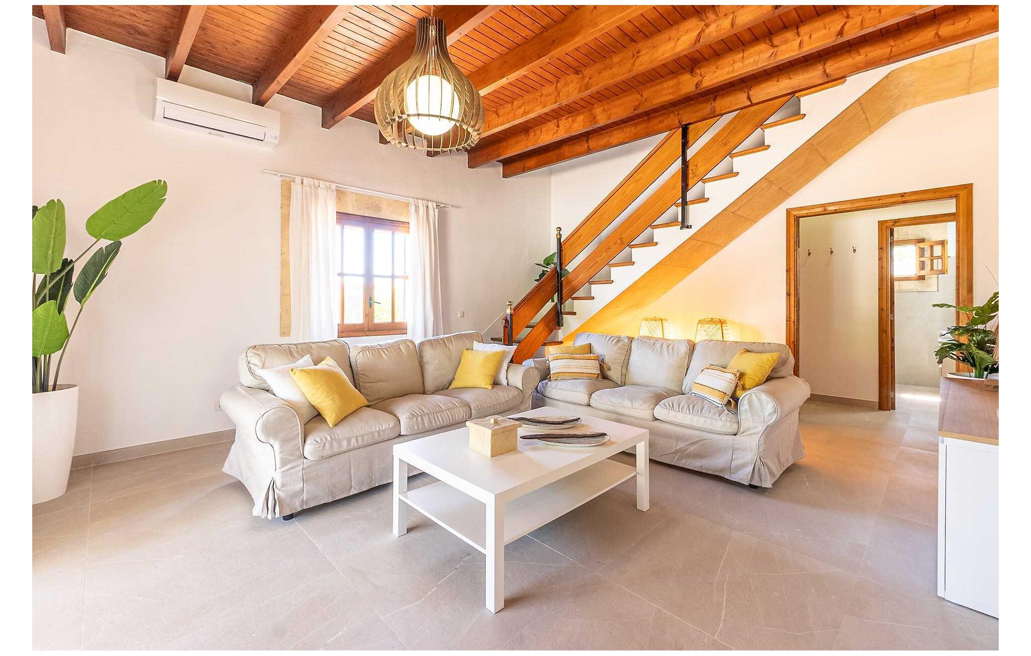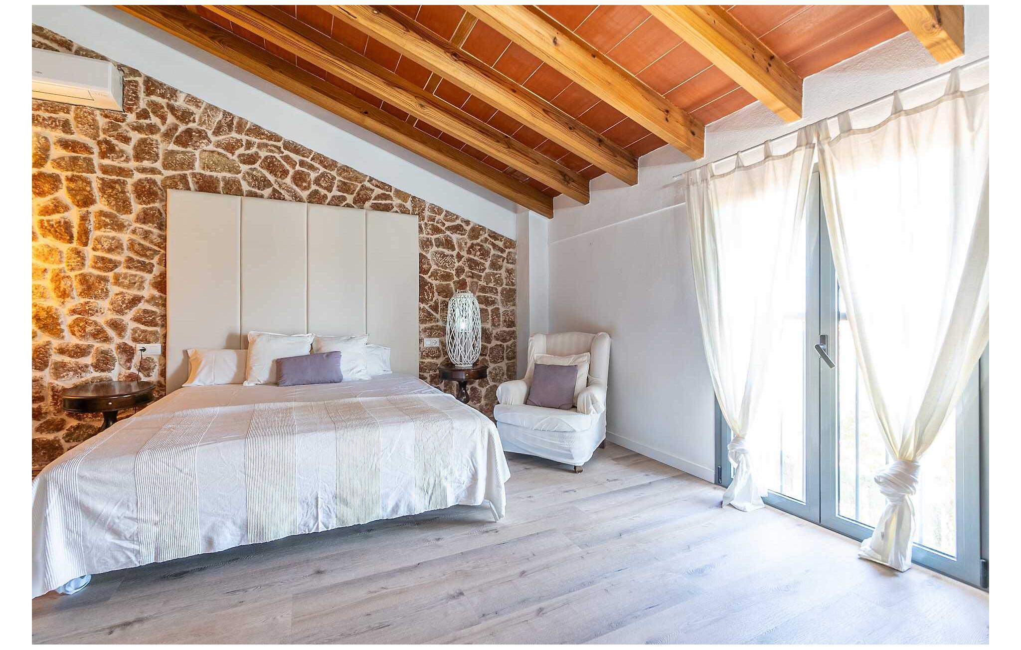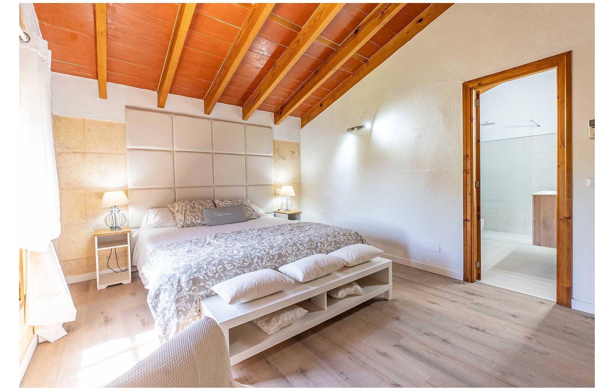Feriehuset "Son Claret" er en grøn oase på fladt landbrugsområde nær Muro, kun 10 minutter fra sandstranden i Alcúdia-bugten. Ejendommen er helt privat og omgivet af hække og hegn. Poolterrassen har en let skrånende pool med trappeadgang, liggestole og en hyggelig dagseng med høje palmer, der giver skygge. I tilknytning til huset er en skyggefuld spiseplads under en overdækket terrasse med udsigt over poolen. Renoveret i 2024, interiøret omfatter lyse, smagfuldt indrettede værelser. Den åbne planløsning giver nem adgang til terrassen og poolen gennem en glasskydedør. Det rummelige køkken med integreret spiseplads er udstyret med moderne hårde hvidevarer og har egen udgang til det fri. Et badeværelse med bruser fuldender stueetagen. Der er tre komfortable dobbeltværelser på øverste etage; to har ensuite badeværelser og en har en privat balkon. Huset har aircondition og skodder til perfekt mørke. Beliggende omkring 3 km fra Muro og 8 km fra Can Picafort, er "Son Claret" ideel til fjernarbejde, med stabilt internet og god mobilmodtagelse. Den lange sandstrand i Alcúdia-bugten ligger mindre end 10 minutter væk i bil.