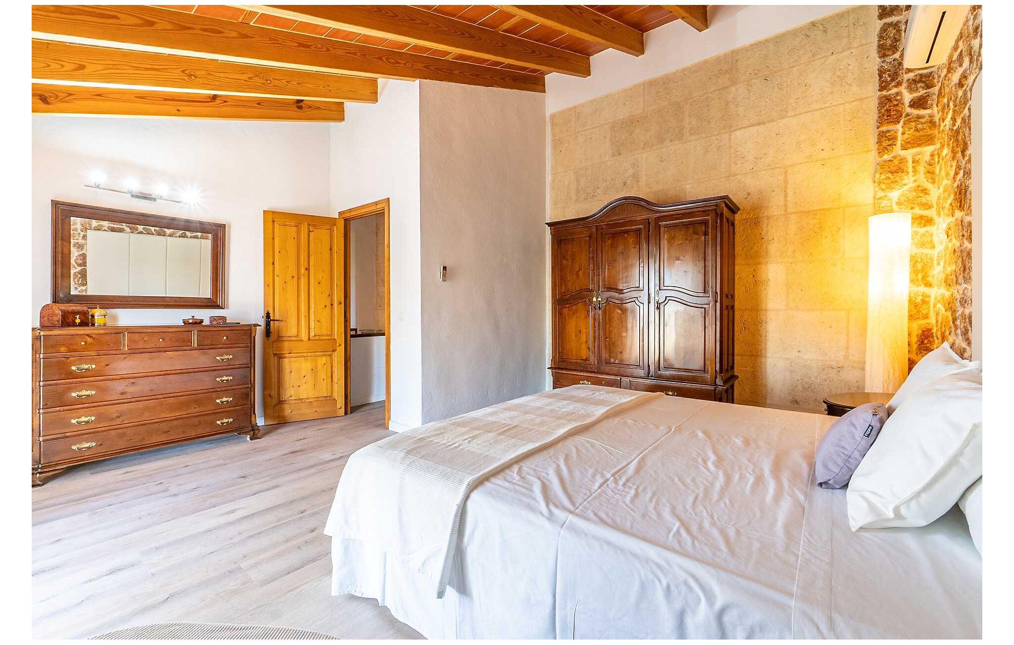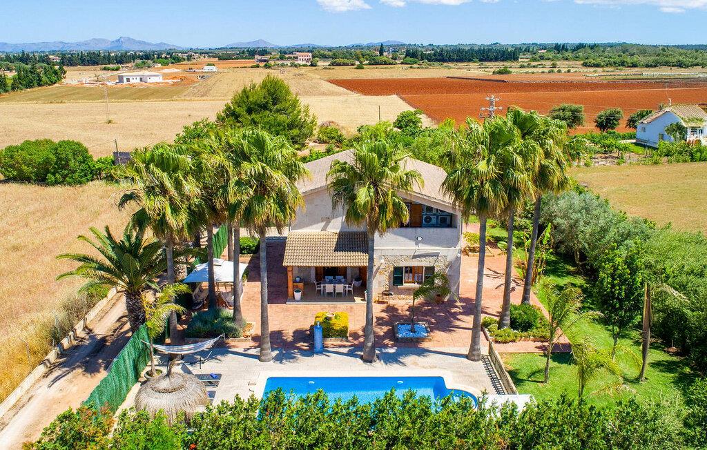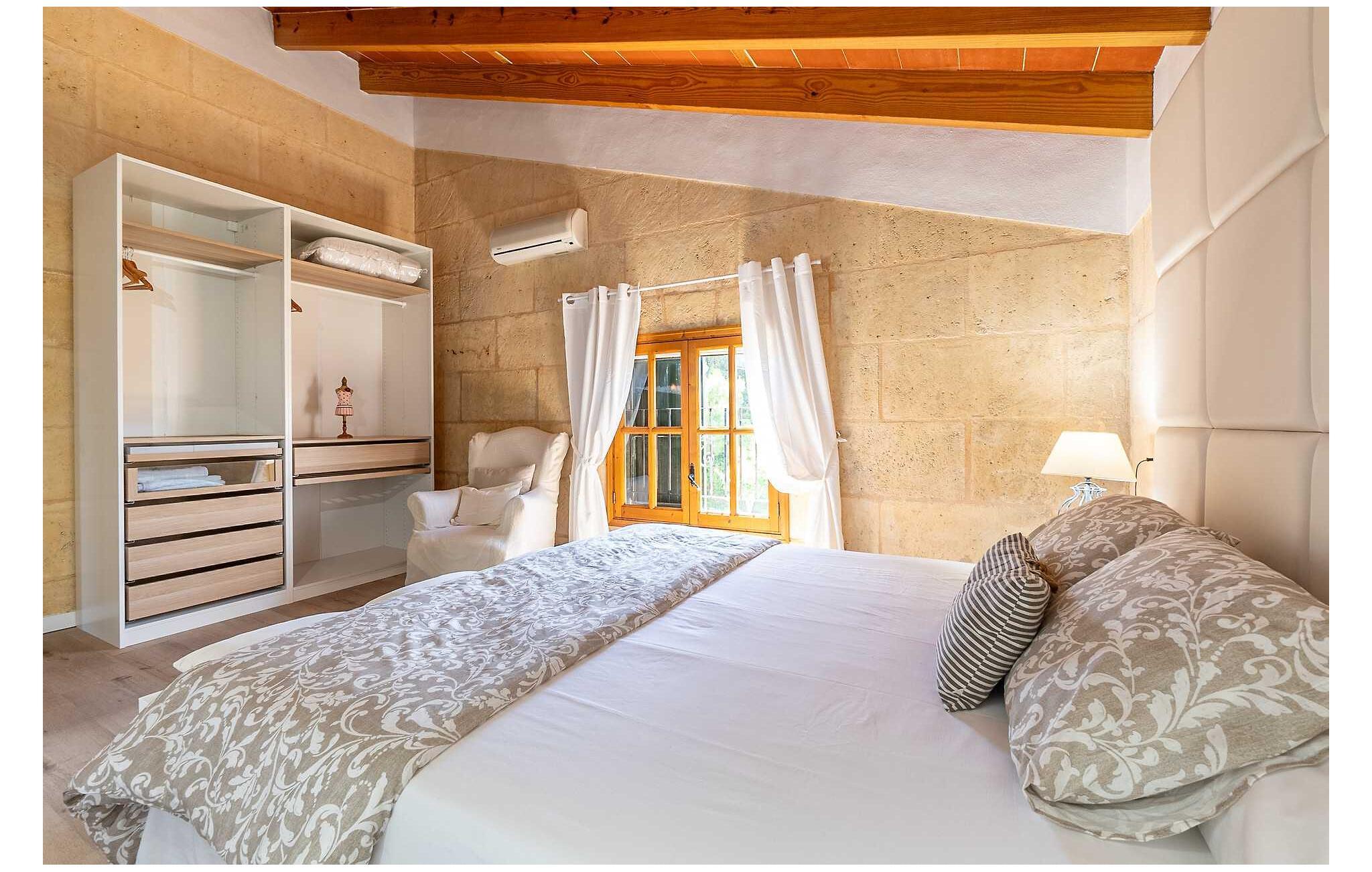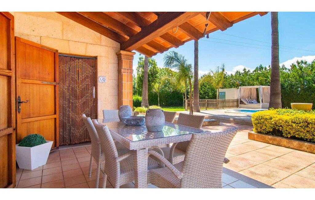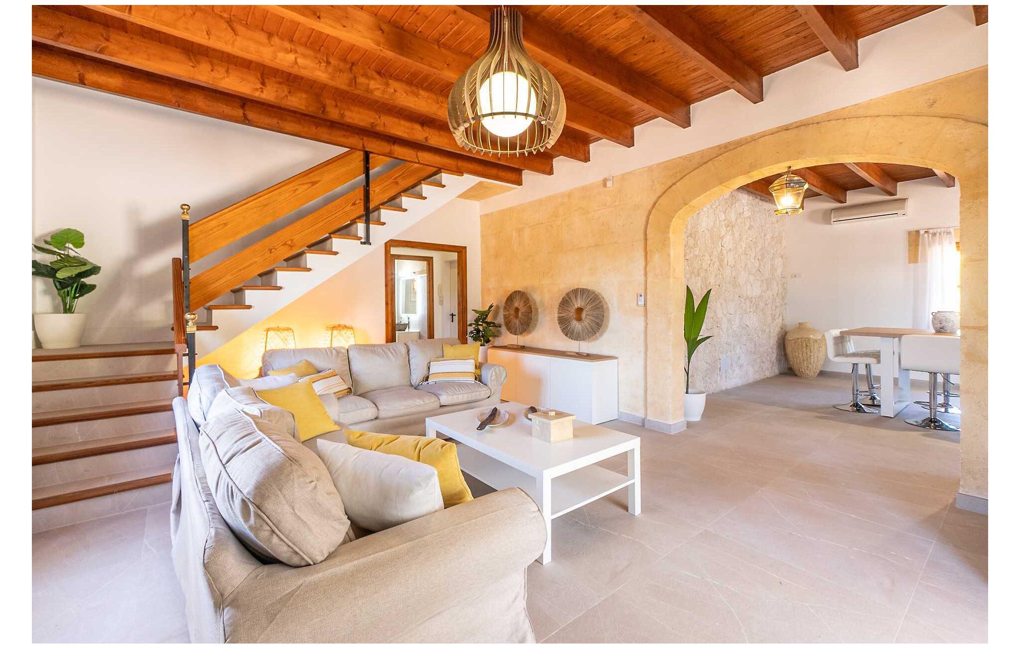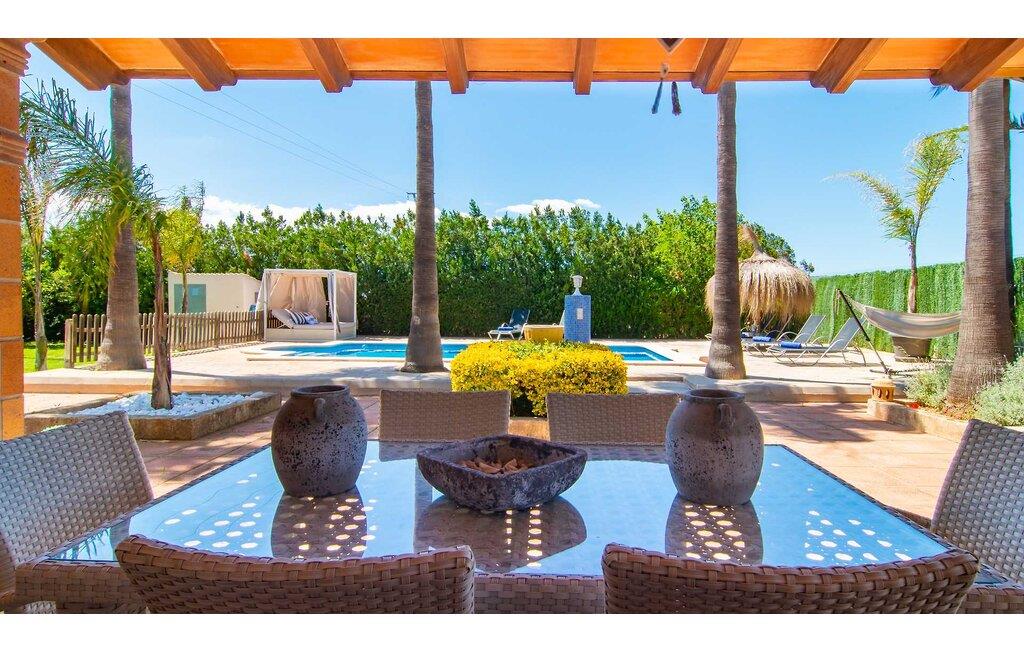 Feriehuset "Son Claret" er en grøn oase på fladt landbrugsområde nær Muro, kun 10 minutter fra sandstranden i Alcúdia-bugten. Ejendommen er helt privat og omgivet af hække og hegn. Poolterrassen har en let skrånende pool med trappeadgang, liggestole og en hyggelig dagseng med høje palmer, der giver skygge. I tilknytning til huset er en skyggefuld spiseplads under en overdækket terrasse med udsigt over poolen. Renoveret i 2024, interiøret omfatter lyse, smagfuldt indrettede værelser. Den åbne planløsning giver nem adgang til terrassen og poolen gennem en glasskydedør. Det rummelige køkken med integreret spiseplads er udstyret med moderne hårde hvidevarer og har egen udgang til det fri. Et badeværelse med bruser fuldender stueetagen. Der er tre komfortable dobbeltværelser på øverste etage; to har ensuite badeværelser og en har en privat balkon. Huset har aircondition og skodder til perfekt mørke. Beliggende omkring 3 km fra Muro og 8 km fra Can Picafort, er "Son Claret" ideel til fjernarbejde, med stabilt internet og god mobilmodtagelse. Den lange sandstrand i Alcúdia-bugten ligger mindre end 10 minutter væk i bil.
