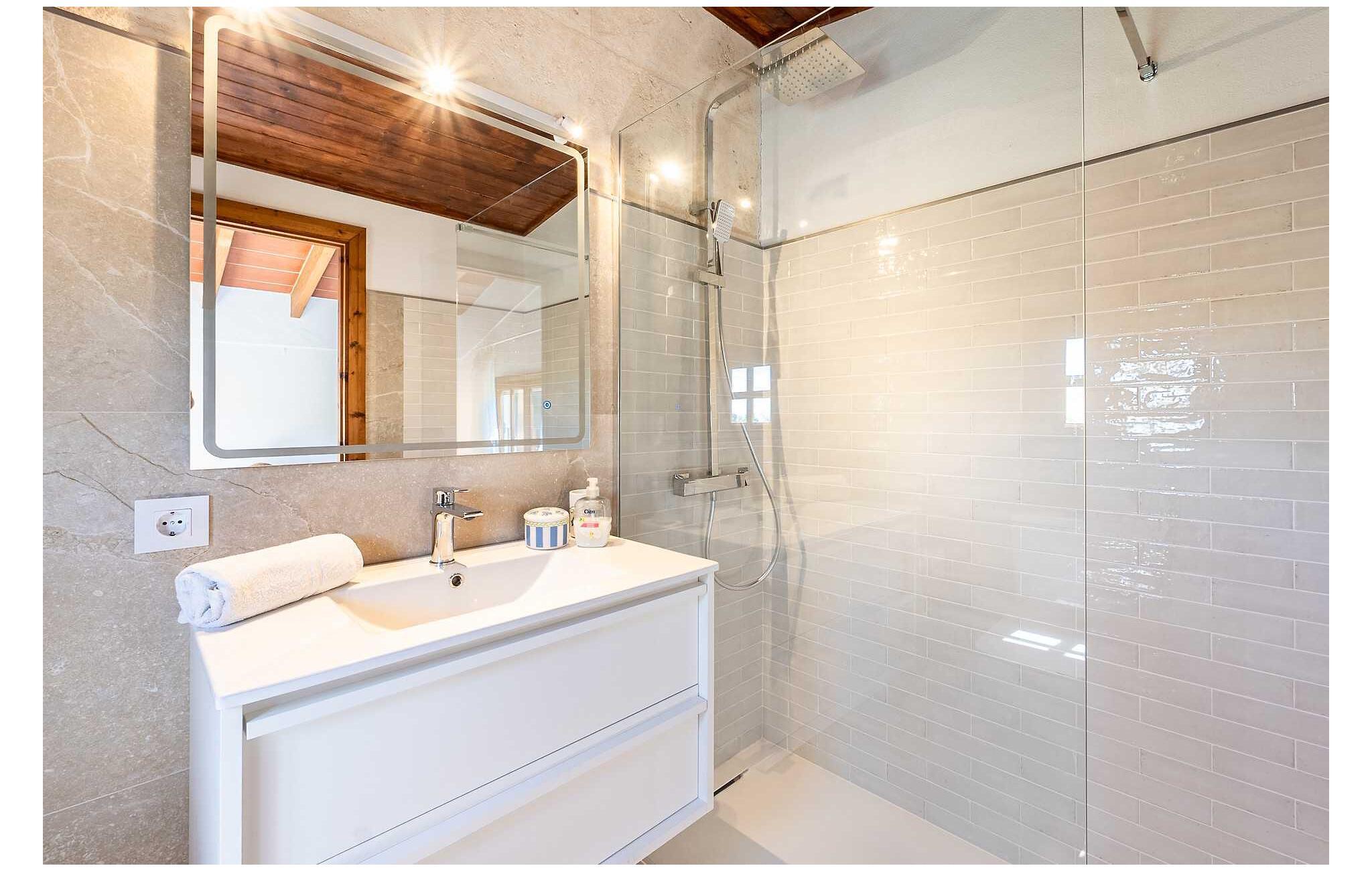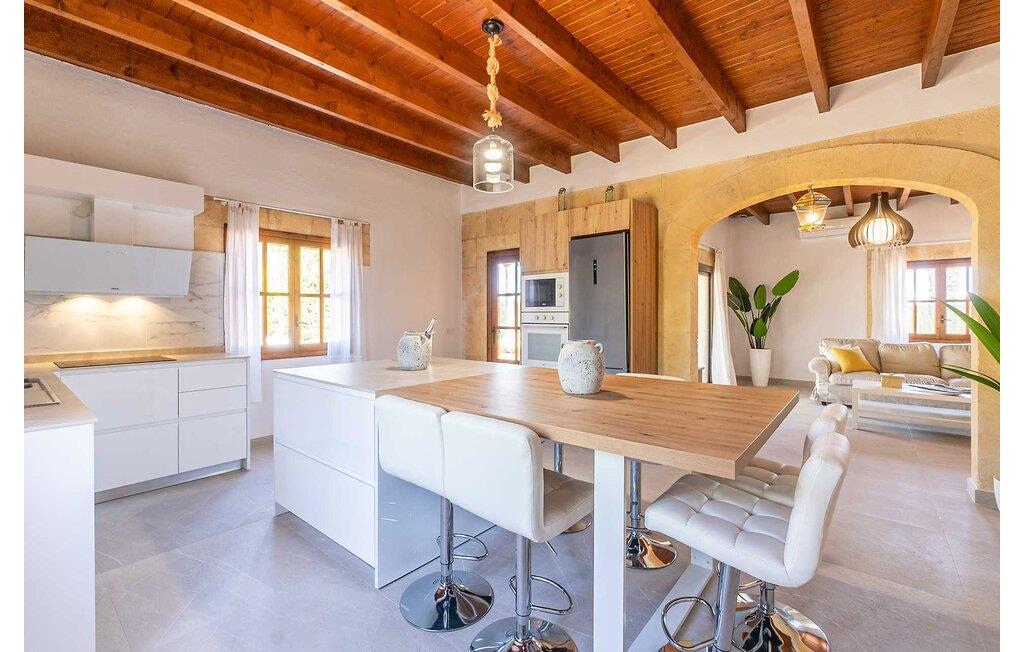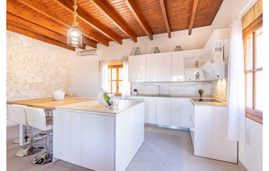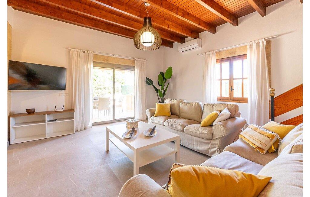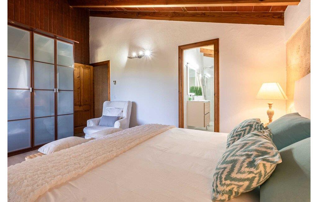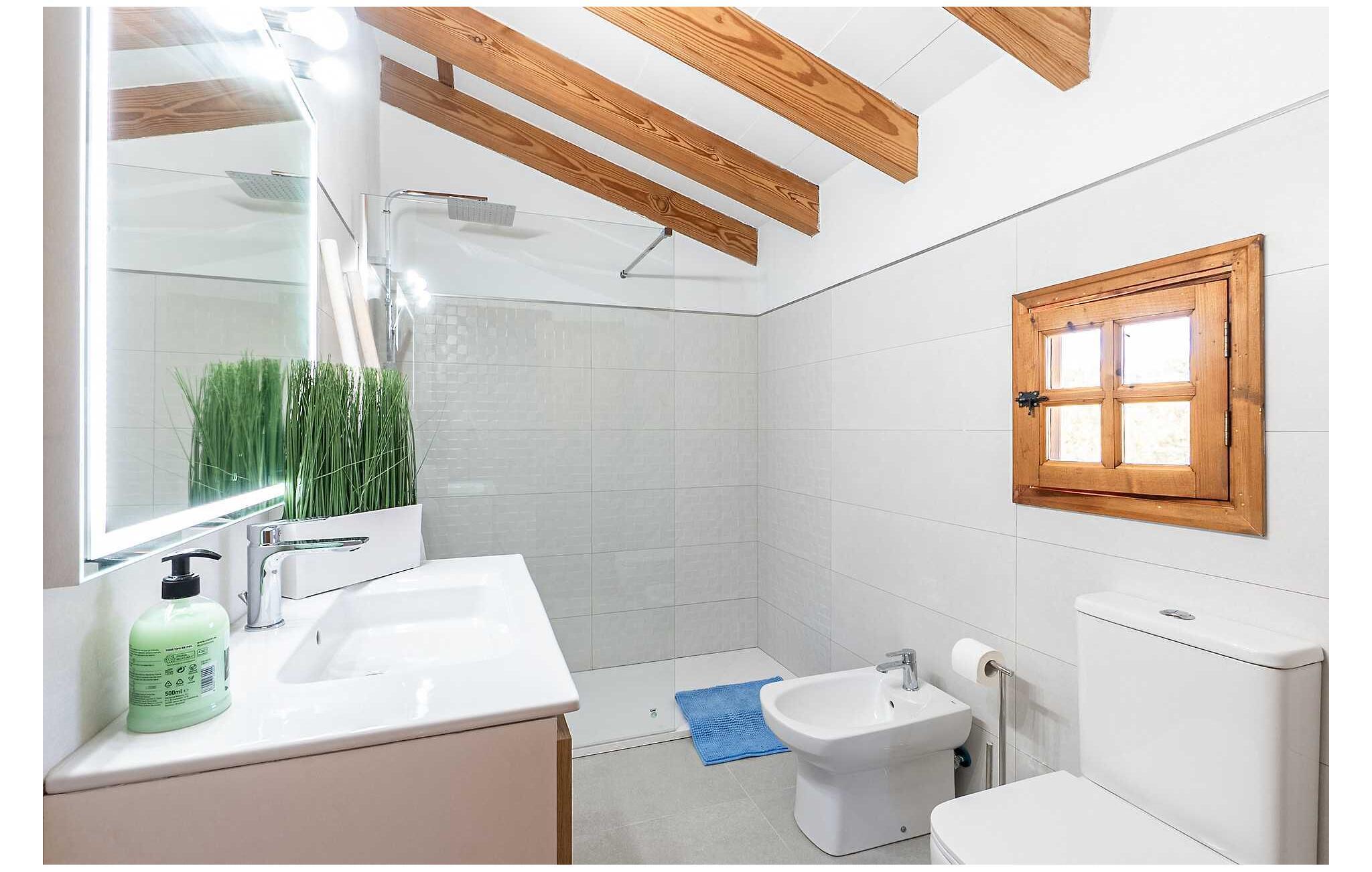 Feriehuset "Son Claret" er en grøn oase på fladt landbrugsområde nær Muro, kun 10 minutter fra sandstranden i Alcúdia-bugten. Ejendommen er helt privat og omgivet af hække og hegn. Poolterrassen har en let skrånende pool med trappeadgang, liggestole og en hyggelig dagseng med høje palmer, der giver skygge. I tilknytning til huset er en skyggefuld spiseplads under en overdækket terrasse med udsigt over poolen. Renoveret i 2024, interiøret omfatter lyse, smagfuldt indrettede værelser. Den åbne planløsning giver nem adgang til terrassen og poolen gennem en glasskydedør. Det rummelige køkken med integreret spiseplads er udstyret med moderne hårde hvidevarer og har egen udgang til det fri. Et badeværelse med bruser fuldender stueetagen. Der er tre komfortable dobbeltværelser på øverste etage; to har ensuite badeværelser og en har en privat balkon. Huset har aircondition og skodder til perfekt mørke. Beliggende omkring 3 km fra Muro og 8 km fra Can Picafort, er "Son Claret" ideel til fjernarbejde, med stabilt internet og god mobilmodtagelse. Den lange sandstrand i Alcúdia-bugten ligger mindre end 10 minutter væk i bil.