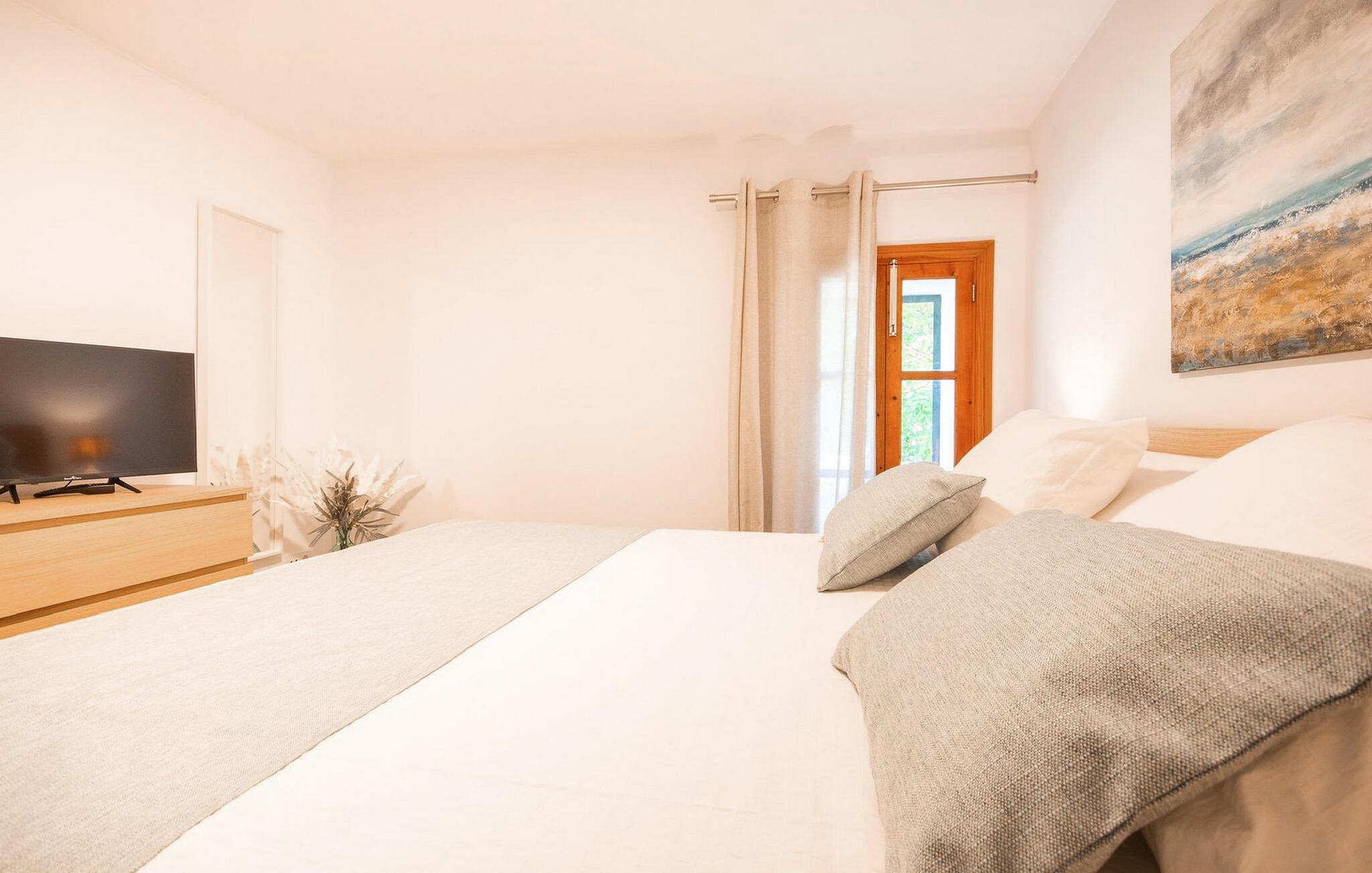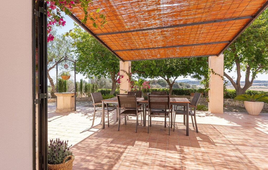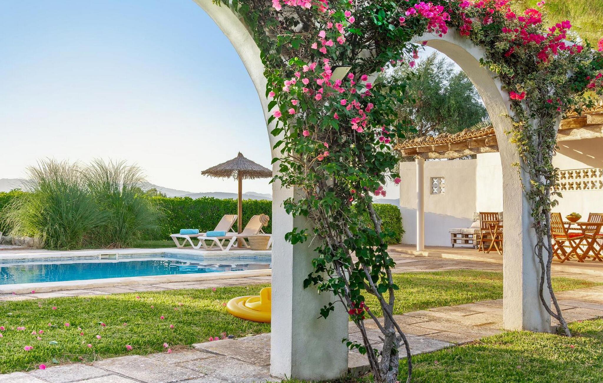 Lejligheden "Son Flo Bouganvilla" er en del af Agroturismo Son Flor, beliggende på en bakke i den østlige del af Mallorca. Det har en privat, skyggefuld terrasse med spiseplads og udsigt over sletten ved Santa Margalida. Det inkluderer adgang til to fælles pools med liggestole, en anlagt have, en fælles grillplads, et bordtennisbord, et lille bibliotek og en dartbane. Åbne parkeringspladser er også tilgængelige på anmodning foran agriturismekomplekset, og sandstrandene på Mallorcas østkyst er kun en kort køretur væk. Med et boligareal på 100 m2 kan lejligheden rumme op til syv gæster. Det primære opholdsrum er tilgængeligt fra terrassen og består af en stue, et køkken og en indendørs spiseplads. Der er tre soveværelser med dobbeltsenge, hvoraf det ene har en køjeseng, og to badeværelser med bruser. En anden gæst kan sove på den komfortable sovesofa i stuen. Lejligheden er udstyret med aircondition og har WiFi og pålidelig mobiltelefonmodtagelse. Ferielejligheden ligger ca 3,5 km nordøst for Santa Margalida på den østlige del af Mallorca. Can Picafort og den lange strand i Alcúdia-bugten ligger kun 15 minutter væk i bil.