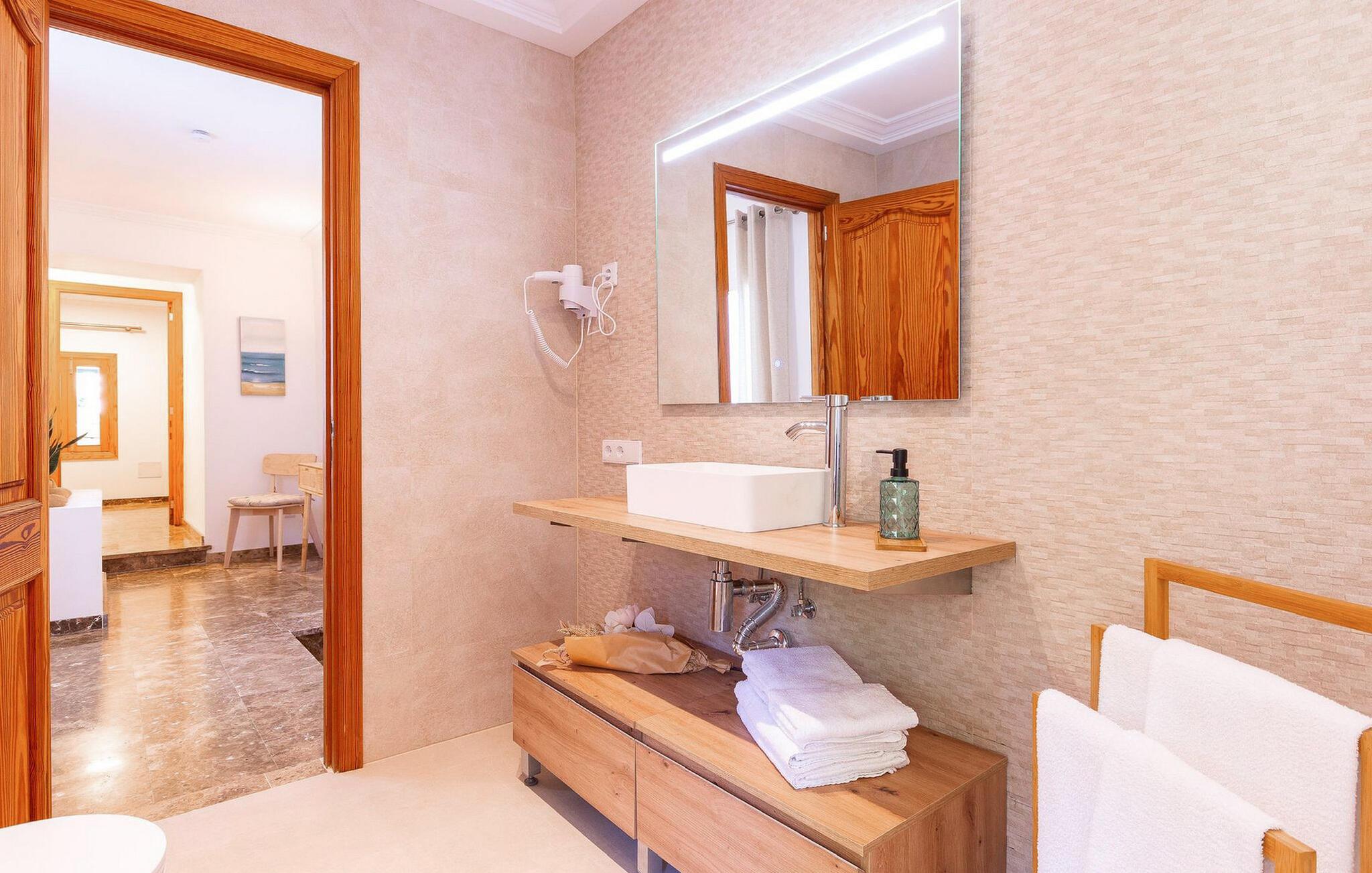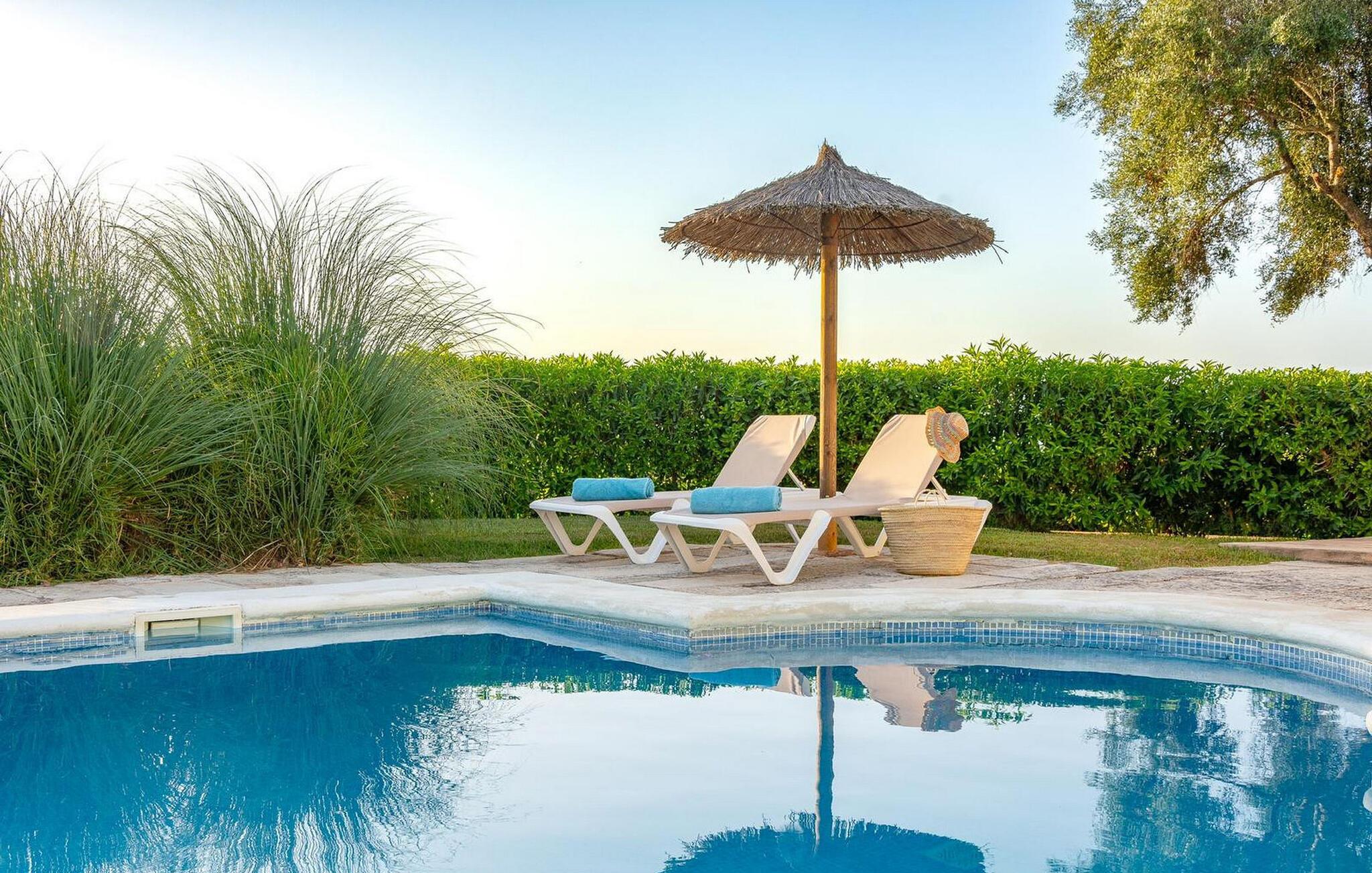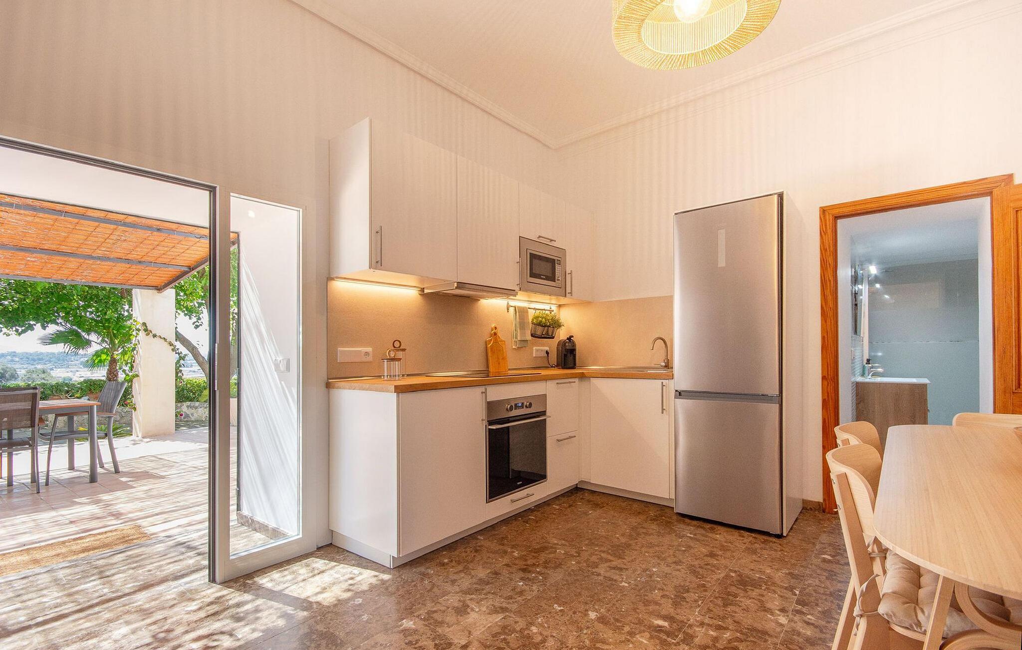 Lejligheden "Son Flo Bouganvilla" er en del af Agroturismo Son Flor, beliggende på en bakke i den østlige del af Mallorca. Det har en privat, skyggefuld terrasse med spiseplads og udsigt over sletten ved Santa Margalida. Det inkluderer adgang til to fælles pools med liggestole, en anlagt have, en fælles grillplads, et bordtennisbord, et lille bibliotek og en dartbane. Åbne parkeringspladser er også tilgængelige på anmodning foran agriturismekomplekset, og sandstrandene på Mallorcas østkyst er kun en kort køretur væk. Med et boligareal på 100 m2 kan lejligheden rumme op til syv gæster. Det primære opholdsrum er tilgængeligt fra terrassen og består af en stue, et køkken og en indendørs spiseplads. Der er tre soveværelser med dobbeltsenge, hvoraf det ene har en køjeseng, og to badeværelser med bruser. En anden gæst kan sove på den komfortable sovesofa i stuen. Lejligheden er udstyret med aircondition og har WiFi og pålidelig mobiltelefonmodtagelse. Ferielejligheden ligger ca 3,5 km nordøst for Santa Margalida på den østlige del af Mallorca. Can Picafort og den lange strand i Alcúdia-bugten ligger kun 15 minutter væk i bil.