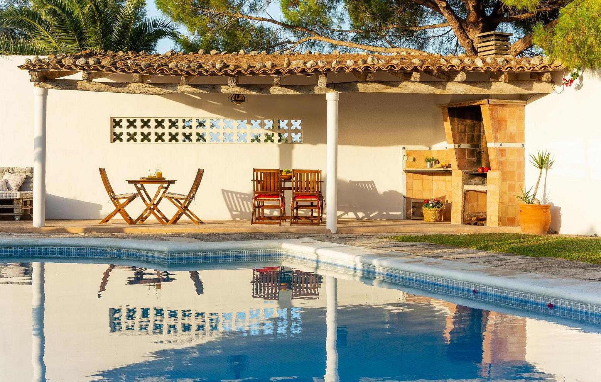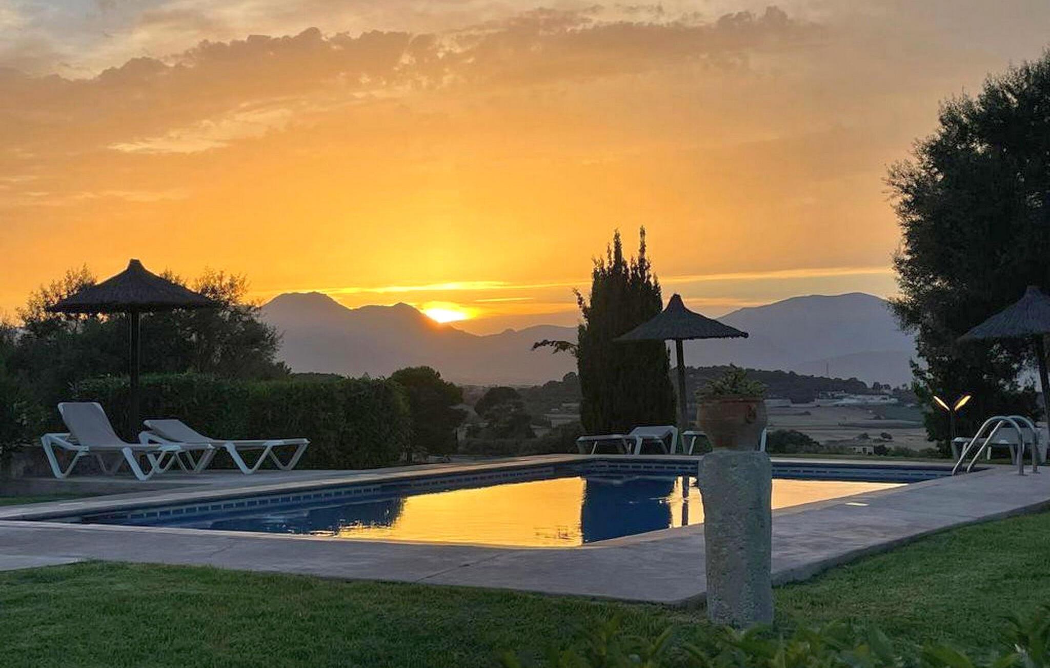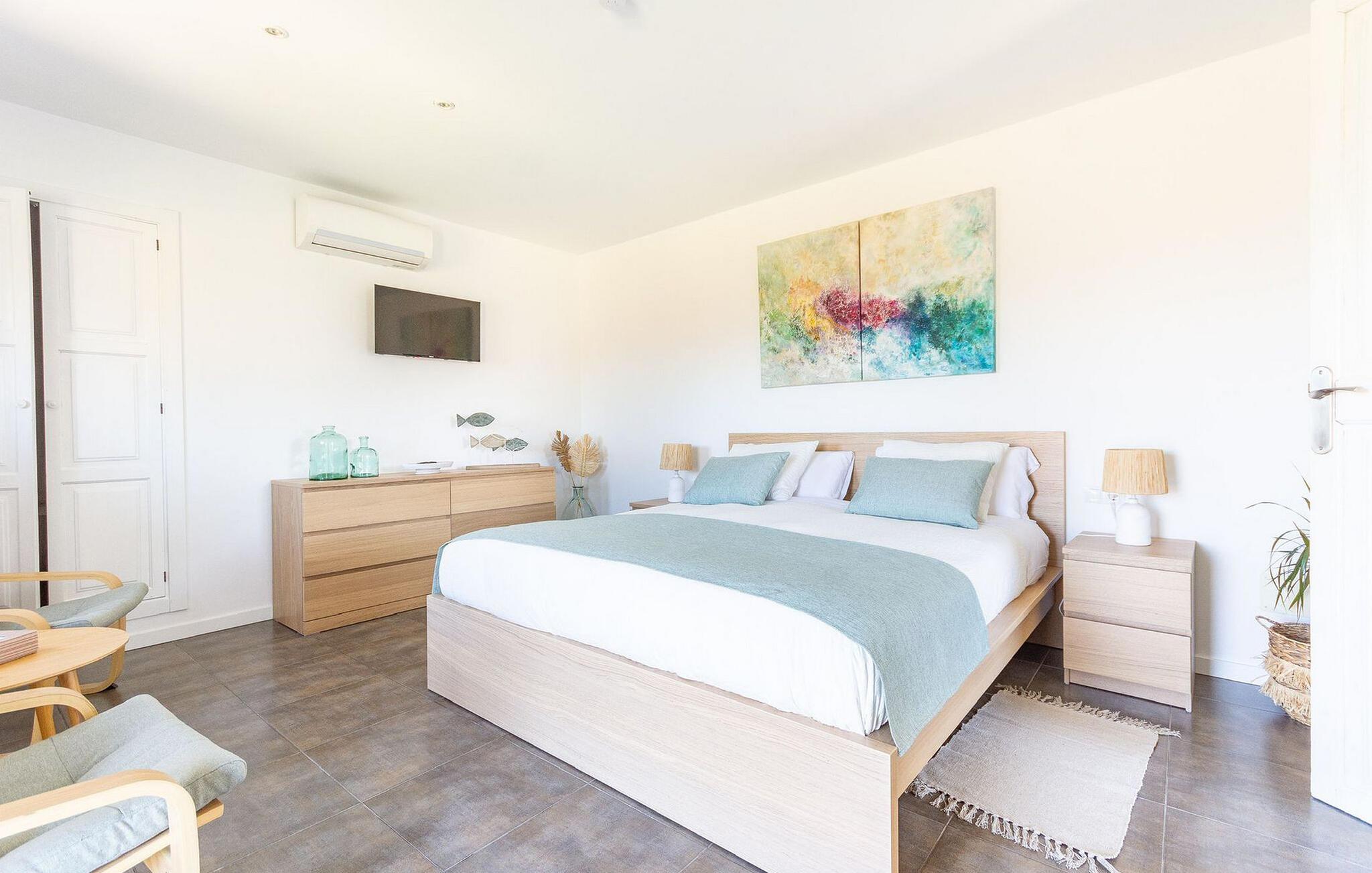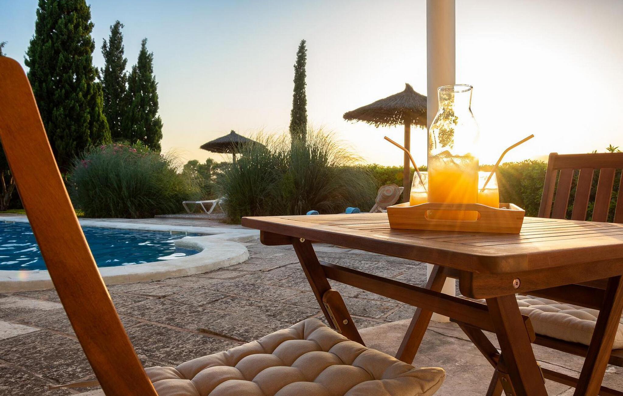 Lejligheden "Son Flo Bouganvilla" er en del af Agroturismo Son Flor, beliggende på en bakke i den østlige del af Mallorca. Det har en privat, vidunderligt skyggefuld terrasse med spiseplads og en smuk udsigt over sletten nær Santa Margalida. Denne rolige ejendom tilbyder adgang til to fælles pools med liggestole, en anlagt have, et fælles grillområde, et bordtennisbord, et lille bibliotek og en dartbane. I kan også leje biler og cykler efter anmodning. Der er åben parkering til rådighed foran agriturismekomplekset, og de smukke sandstrande på Mallorcas østkyst er kun en kort køretur væk. Denne 50 kvadratmeter store lejlighed kan komfortabelt rumme op til tre gæster. Det har et hyggeligt dobbeltværelse med aircondition og en komfortabel sovesofa til en tredje person. Det moderne køkken har også en spiseplads. Der er også et badeværelse med bruser. Lejligheden er udstyret med WiFi og tilbyder pålidelig mobiltelefonmodtagelse. Ferielejligheden ligger ca 3,5 km nordøst for Santa Margalida på den østlige del af Mallorca. Can Picafort og den lange strand i Alcúdia-bugten ligger kun 15 minutter væk i bil.