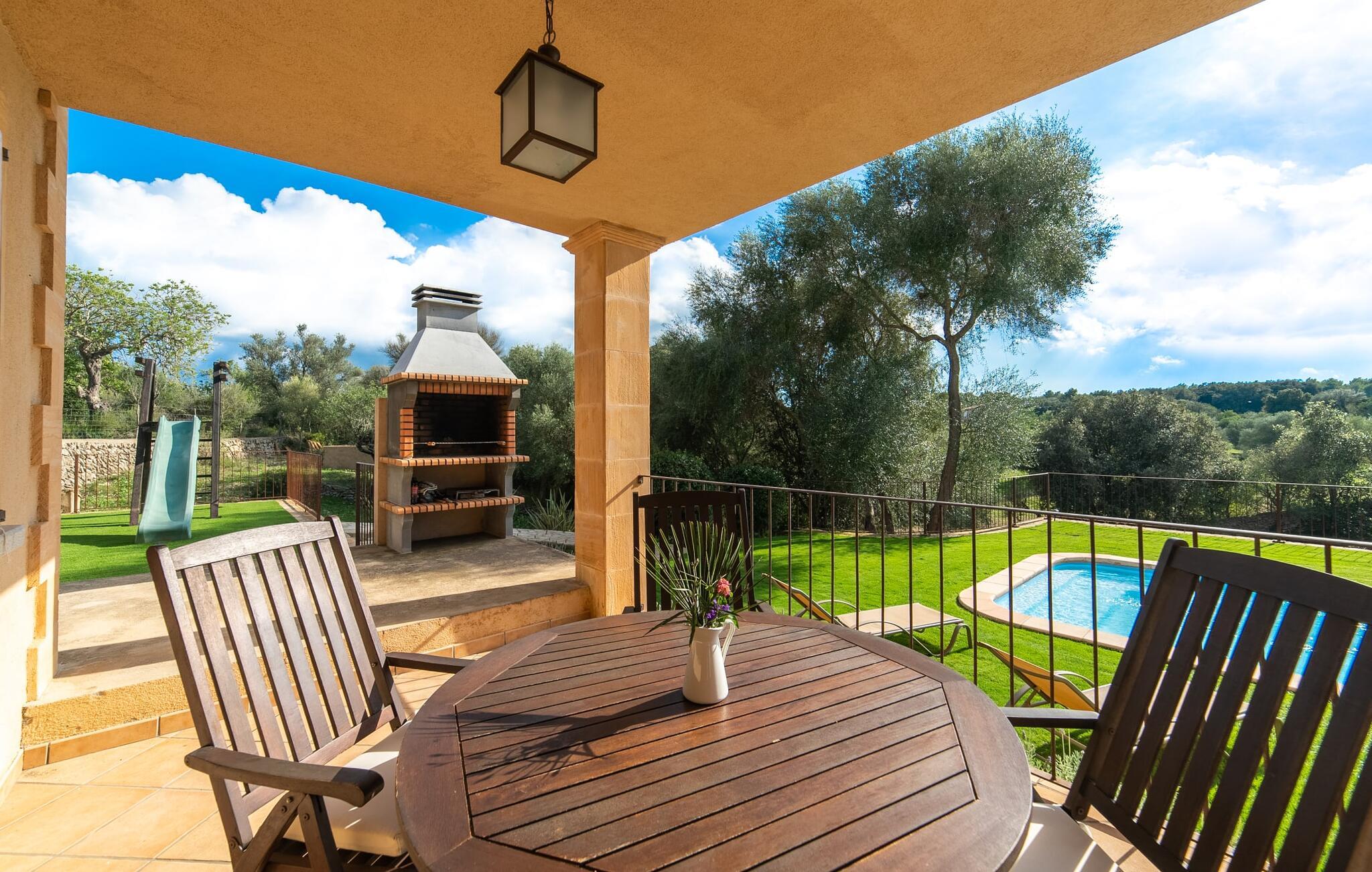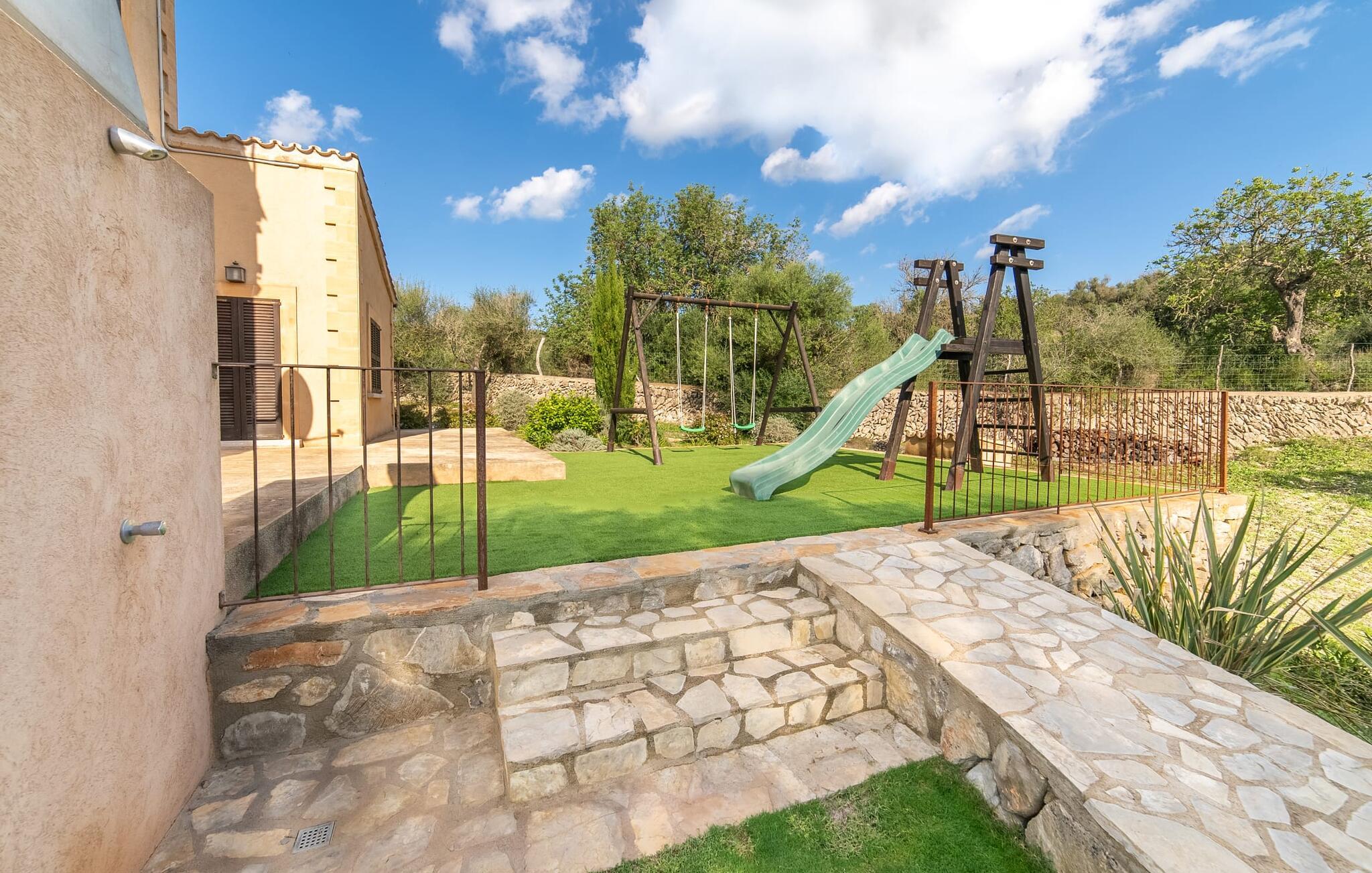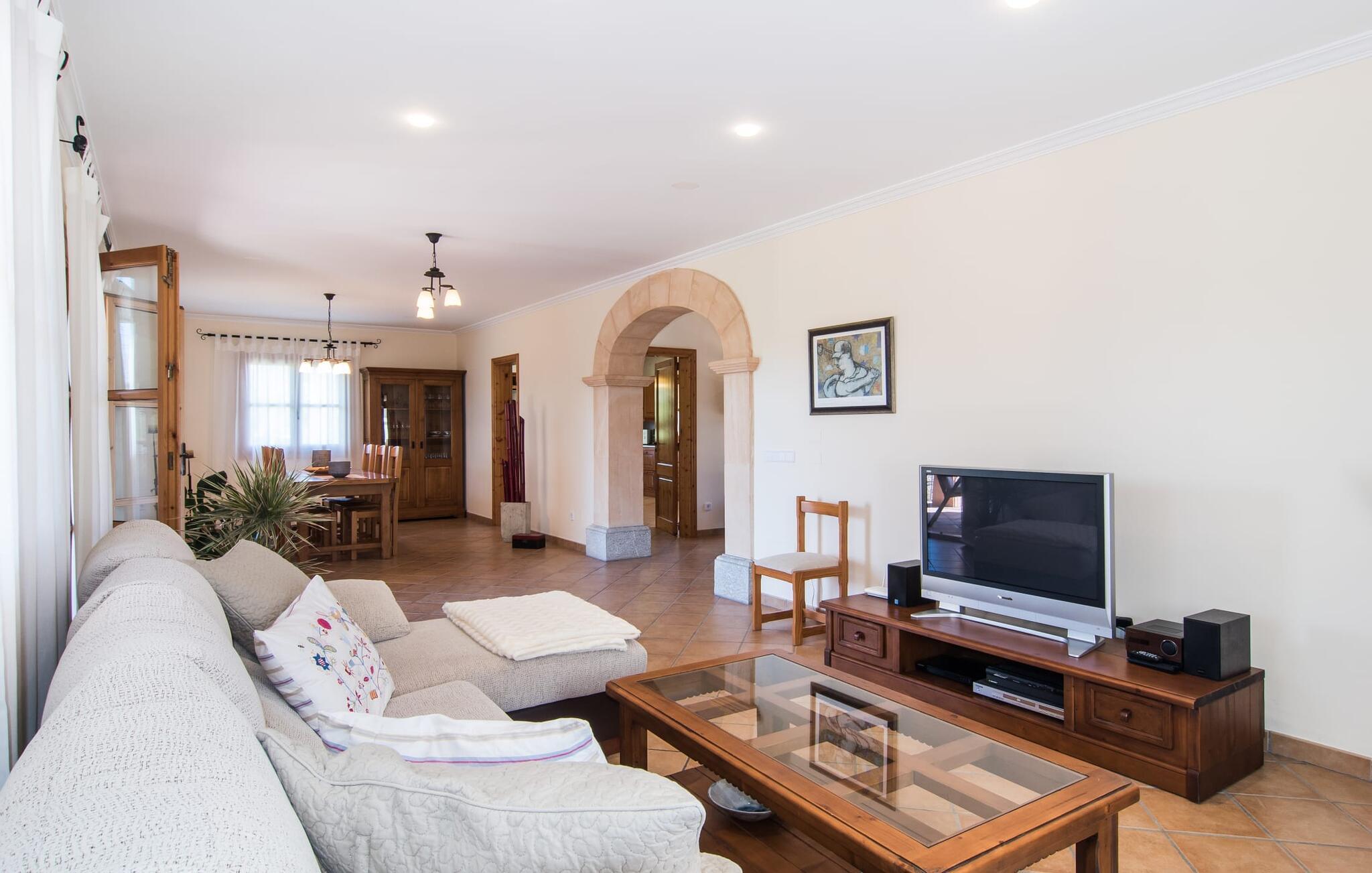 Leder I efter et sted, hvor I kan nyde fred og privatliv? Så kig nærmere, for måske er denne lille perle lige det, I leder efter. Villaens idylliske beliggenhed giver jer mulighed for at gå lange ture gennem naturen og blot koble af og koble af med krop og sjæl. Det, der bestemt er værd at fremhæve, er den statelige terrasse - når I først har sat jer derned, vil I ikke tage afsted, udsigten er så betagende. Under jeres ophold kan I føle, som om I er blevet transporteret til et fantastisk filmsæt. Der er flere siddepladser på terrassen, så intet står i vejen for et afslappet måltid udendørs med udsigt til det grønne. På den forudsatte grill kan I tilberede den friske fisk, I har købt hver tirsdag på det ugentlige marked i Artà. Det er bedst at bruge en hjemmelavet marinade lavet af krydderurter, hvidløg og olivenolie, som giver den en udsøgt smag. Og parret med et fremragende glas vin fra en mallorcansk vingård kan livet være så smukt... Selve villaen imponerer med sine stærkt oplyste rum og interiørets naturlige karisma, hvor der ikke er stilistiske modsætninger. De flotte gulvfliser kan findes i alle rum og på terrassen. Møblerne er for det meste indrettet i varme trætoner, der blander sig harmonisk med de cremefarvede vægge. Der er en hyggelig atmosfære, som forstærkes af lysindfaldet gennem villaens store vinduespartier. Soveværelserne ovenpå er designet til komfort og lover afslappende nætter eller en afslappende eftermiddagssiesta. To af værelserne har dobbeltseng, det tredje har to enkeltsenge og er derfor ideelt som børneværelse. Det ene af de to badeværelser byder endda på et hjørnebadekar til et behageligt aftenbad. I stueetagen har den åbne stue et hyggeligt loungehjørne og en pejs - så bare rolig, hvis vejret ikke samarbejder, for I kunne ikke undvære den hyggelige varme og den knitrende ild. Fra stuen er der direkte adgang til trækøkkenet, som byder på alt, hvad et selvforplejningshjerte begærer med ovn, keramisk kogeplade, stort køleskab, opvaskemaskine, mikroovn, kaffemaskine, elkedel og drikkevarekøleskab. På grund af sin afsondrede landlige beliggenhed er villaen "Son Norte Fou" særligt velegnet til folk, der søger fred og afslapning. Leder I efter underholdning, kan I besøge grottesystemet Coves de Artà, et attraktivt udflugtsmål, der også er fascinerende for børn. En tur til den naturlige strand i Cala Torta, som er omkring tredive minutter væk, anbefales også. Når I først krydser den noget ujævne vej til parkeringspladsen, kan I nyde den fascinerende skønhed ved denne sandstrand omgivet af bølgende grønne bakker. Denne landlige og afsondrede villa ligger i de grønne bakker mellem Colònia de Sant Pere og den maleriske lille kunstnerby Artà, kun 2,9 km væk. Der vil I også finde talrige indkøbsmuligheder til at dække jeres daglige behov samt mange seværdigheder. På cirka 20 minutter kan I nå smukke sandstrande som Canyamel og Platja de Son Moll. Bemærk venligst, at denne ejendom ikke accepterer ungdomsgrupper eller polterabender. En ungdomsgruppe på denne ejendom består af personer under 30 år. Book ikke denne ejendom, hvis I er en ungdomsgruppe eller en polterabendgruppe, da jeres reservation vil blive afvist, når den er booket, hvilket også kan være tilfældet ved ankomst til ejendommen eller under jeres ophold, og I vil ikke modtage en refusion.