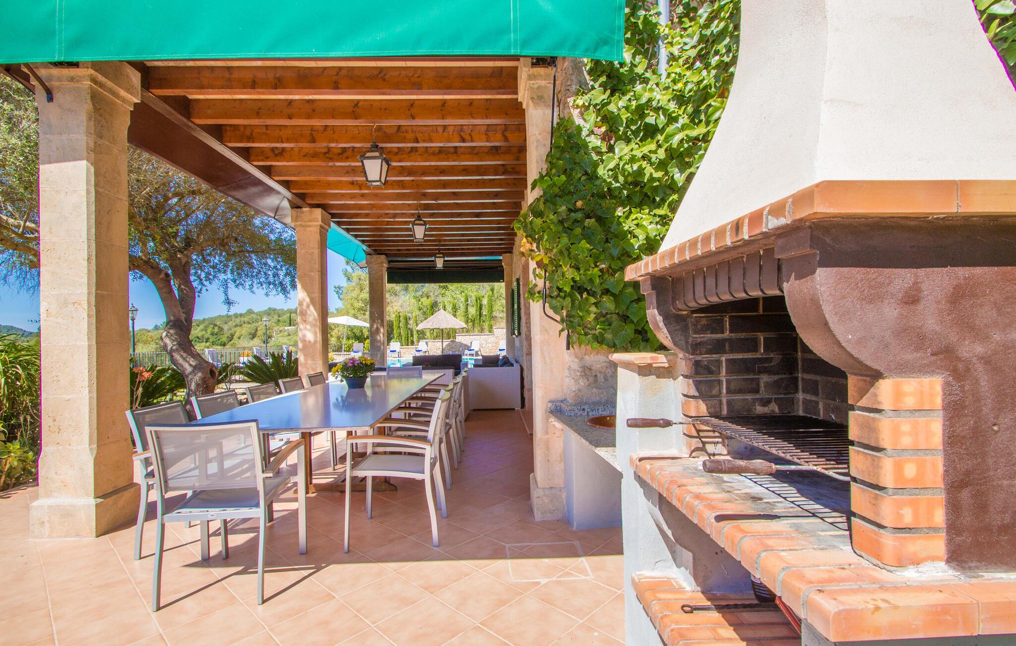 Villaens rummelige poolterrasse med luksuriøse træliggestole og parasoller tilbyder et vidunderligt afslapningsområde. Selve poolen er ideel til banesvømning, mens et lavvandet område sikrer sikker sjov for børn. En rummelig, overdækket terrasse med indbygget grillplads lægger op til at spise under åben himmel, og smagfulde lanterner sørger for, at aftenbadning er lige så behagelig. Skyggen fra de omkringliggende træer øger komforten på varme dage.
