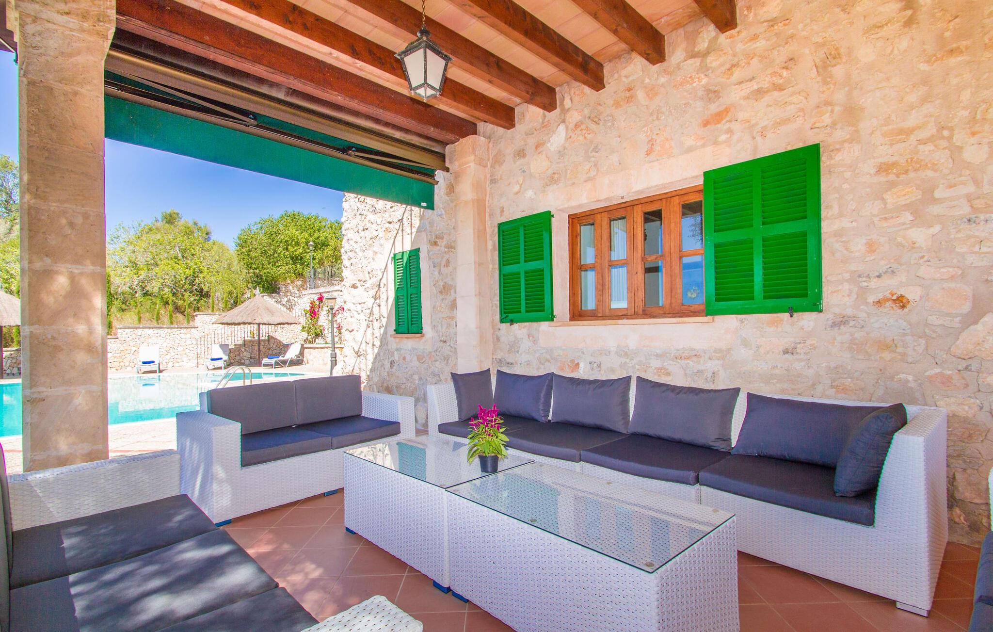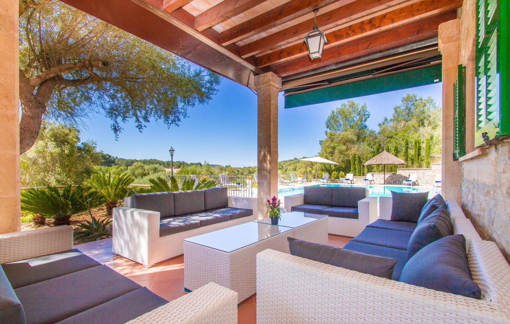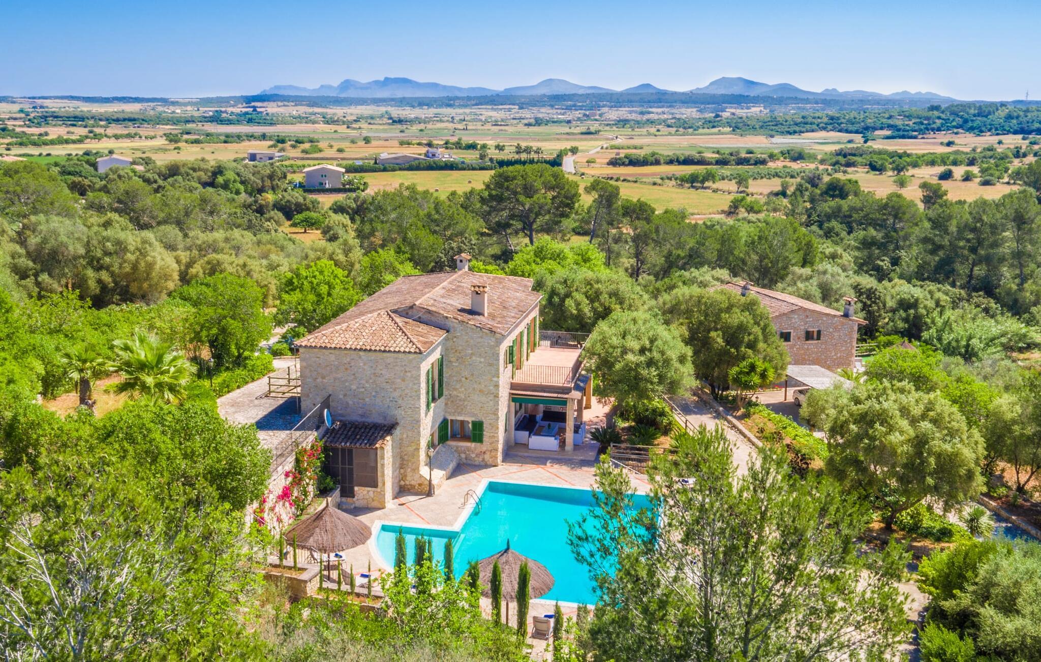 Denne luksusvilla ligger i den østlige del af Mallorca og tilbyder en sensationel udsigt over Puig de Bonany. Hvis I vil shoppe, skal I blot køre til nabobyen Petra, hvor I finder adskillige supermarkeder, barer og restauranter. De smukke strande Son Real og Son Serra er inden for rækkevidde.