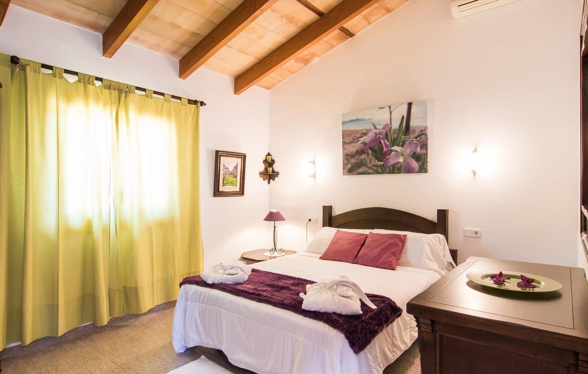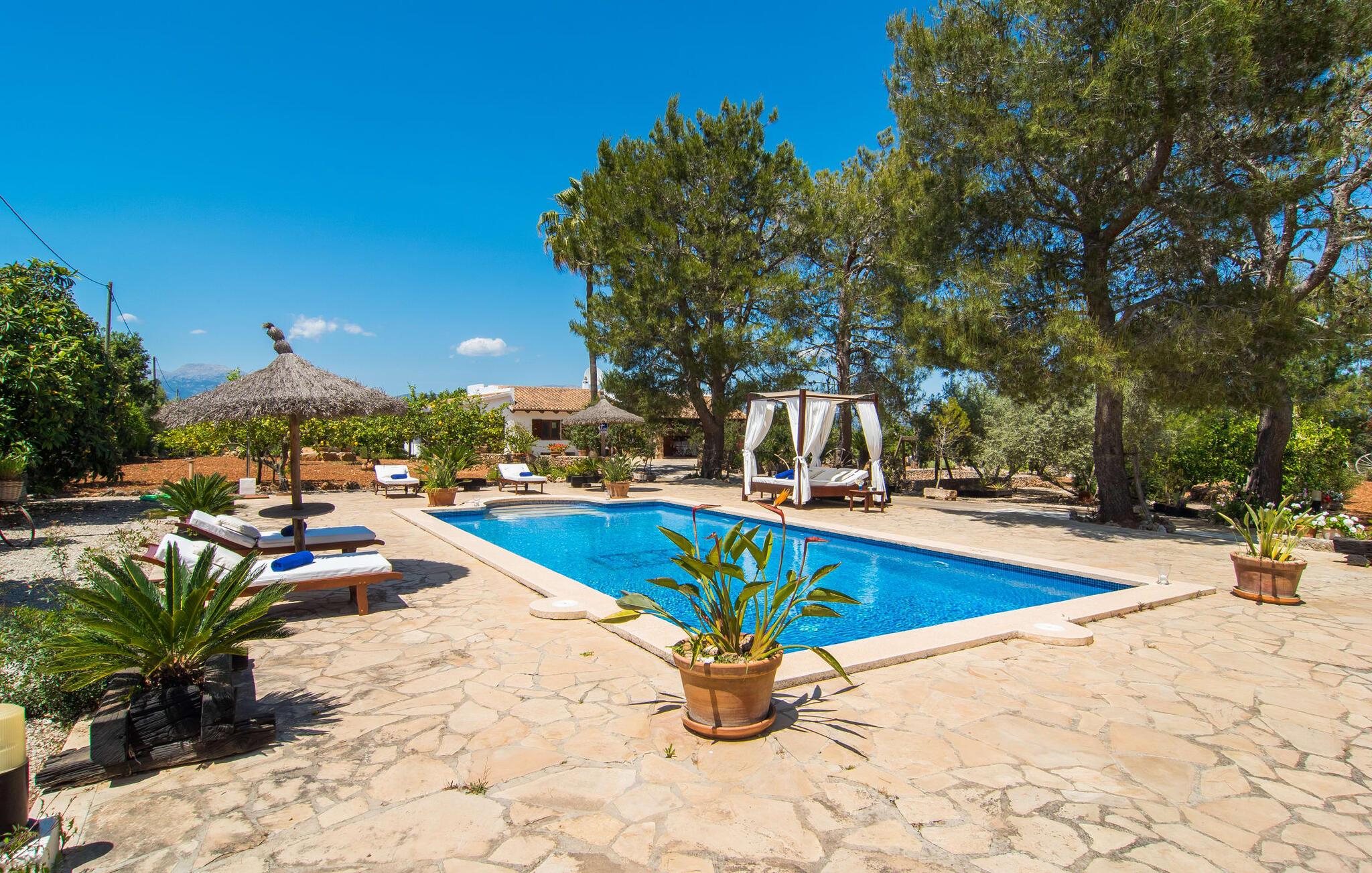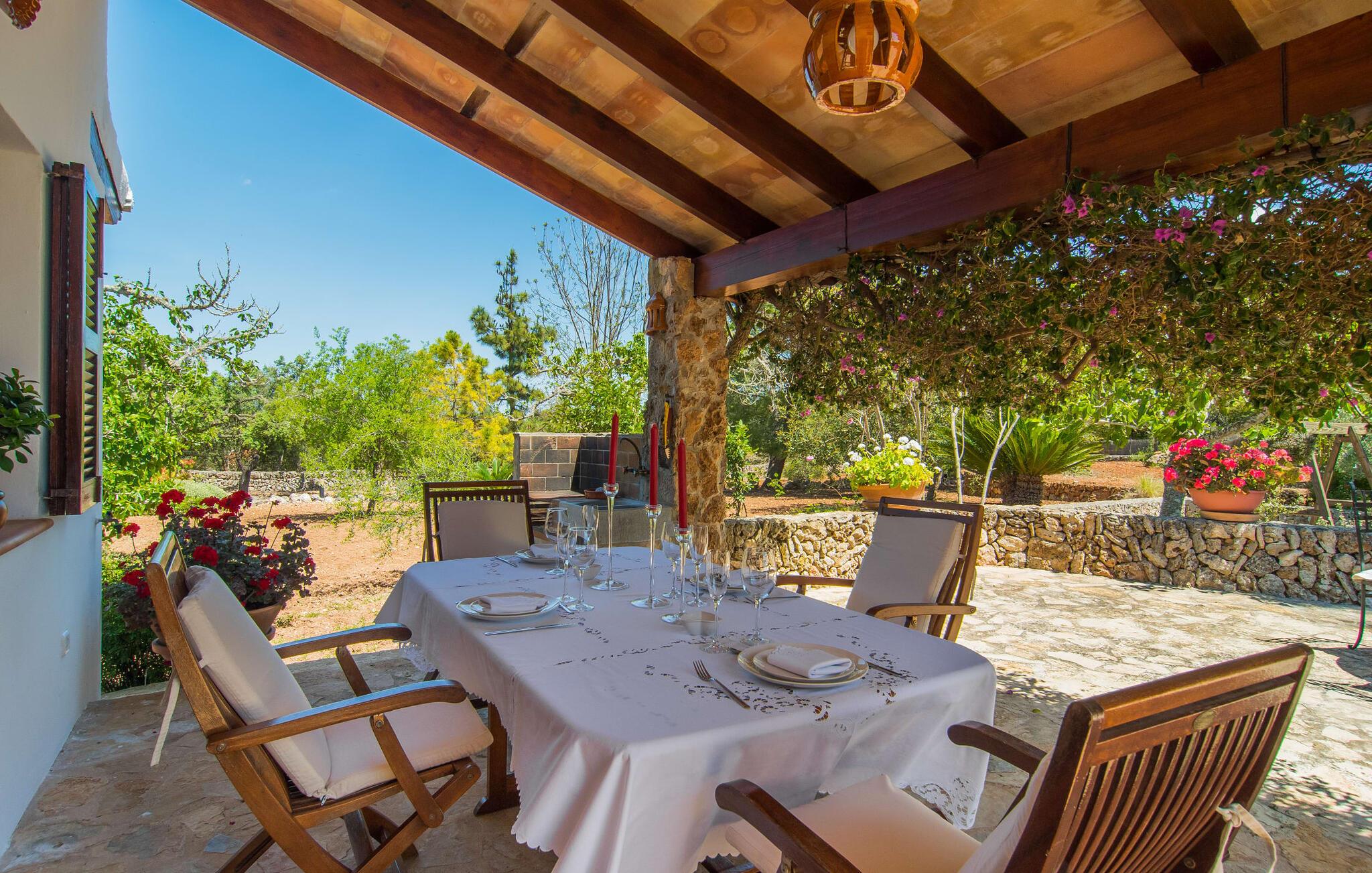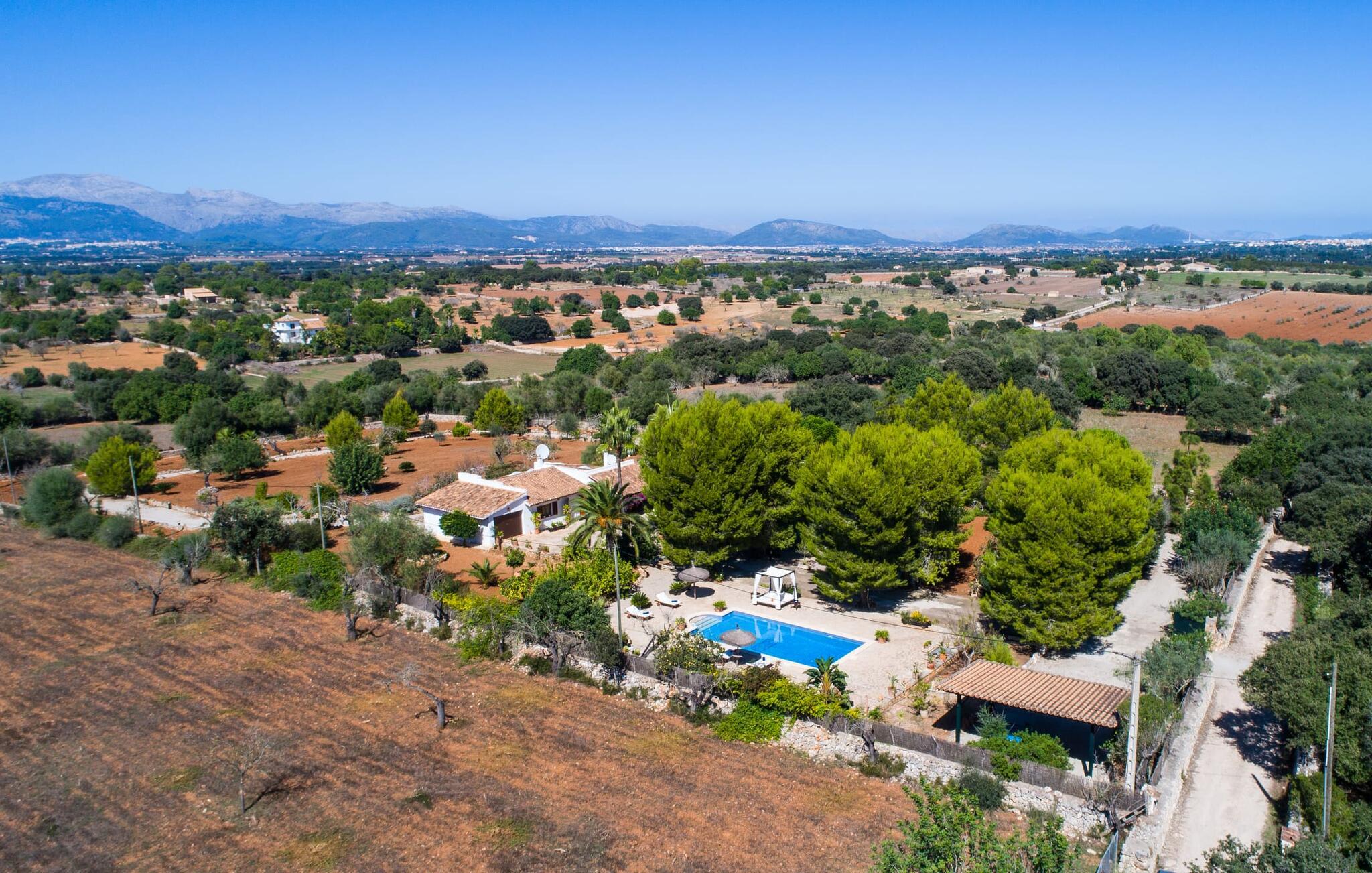 Den landlige villa "Son Mulet de Llubí" er en oase af fred og det ideelle feriested for et forelsket par eller en lille familie. En kærligt designet have med stor sans for detaljer venter jer ved huset. Terracotta spande fyldt med planter, gamle vognhjul lænet op ad stammerne af høje fyrretræer, en rusten grøn cykel og mere giver et smukt helhedsbillede, som tilfældigt. Mens de gamle træer giver masser af skygge, inviterer naturstensterrassen omkring den store pool til solbadning. I kan forkæle jeres hud med lidt afslapning under halmparaplyer eller på den balinesiske seng. Der er et dejligt opholdsområde med komfortable stole på den overdækkede terrasse ved huset. Det perfekte sted at nyde måltider tilberedt på den nærliggende murstensgrill. Den overdækkede terrasse fører ind til villaens indre. Huset er hyggeligt og rustikt og er indrettet med en masse kærlighed. Et åbent opholds- og spiseområde byder på plads nok til alle besøgende med en smuk sofa og tv-hjørne, en stor pejs til de kolde dage og et spisebord. Villaens køkken er lille, men pænt og er ligeledes integreret i dette rum. Lyse vægge og gulvfliser kombineret med de varme farver i træmøblerne og loftsbjælkerne giver hele rummet en hyggelig atmosfære. En lille gang fører til de to soveværelser og badeværelset. I det første soveværelse sørger to senge på 0,90 x 1,90 for en afslappende søvn, i det andet soveværelse er der en stor dobbeltseng på 1,60 x 1,90 m. Begge værelser er indrettet med kærlige detaljer og har hver et stort klædeskab og en kommode skuffer med god plads til jeres feriegarderobe. Det lyse badeværelse med bruseniche fra gulv til loft er moderne og funktionelt. Llubí er en lille, søvnig landsby på den nordlige fod af den store ø-sletten Es Pla. Byen er kendt for sine lækre kapers, som dyrkes på de omkringliggende marker. Disse kan naturligvis også købes på det ugentlige marked på Placa de la Carretera. Hvis I foretrækker noget lidt mere travlt, kan I nå øens mest berømte bondemarked i Sineu på blot et kvarter. Det tager omtrent samme tid at komme til Inca, Eldorado for sko og læder. Herfra kan I også hurtigt nå øens hovedstad Palma via MA-13 ????motorvejen til en obligatorisk dagstur. I den store bugt Alcúdia, også kun 20 minutter væk i bil, er der ingen grænser for fornøjelsen ved at svømme i havet på de kilometerlange sandstrande. Ser du, villaen "Son Mulet de Llubí" er både en oase af fred og et perfekt tilflugtssted og et godt udgangspunkt for begivenhedsrig ø-udforskning. I den nordlige del af Mallorca, i trekanten mellem Inca, Sineu og Muro, ligger denne perle af en villa, "Son Mulet de Llubí", i en absolut rolig beliggenhed. Den drømmende by Llubí, bygget på to bakker og kendt for de bedste kapers på øen, ligger kun 5 km fra villaen. Små indkøbsture kan gennemføres hver tirsdag på det ugentlige marked på Plaça de la Carretera. For større shoppingture er butikkerne i Inca eller Sa Pobla kun 15 minutter væk. De smukke strande i Alcúdia-bugten er ikke meget længere væk.
