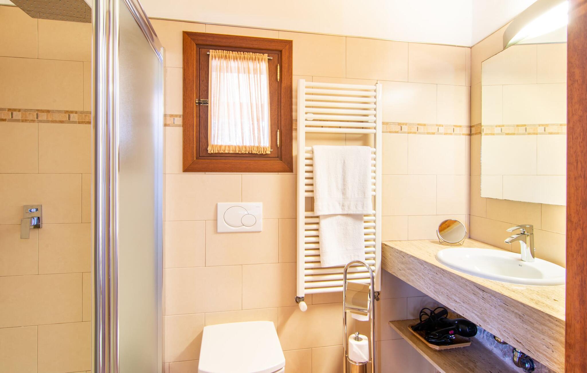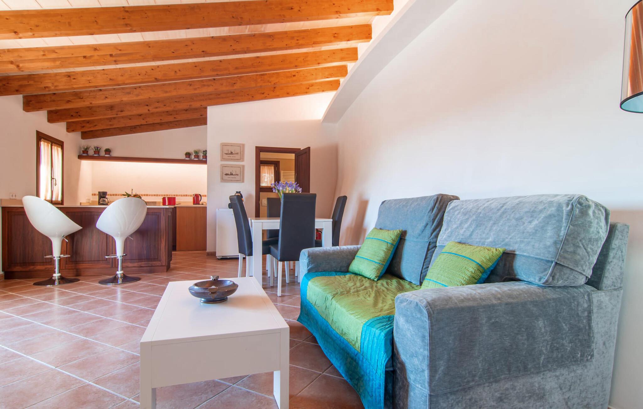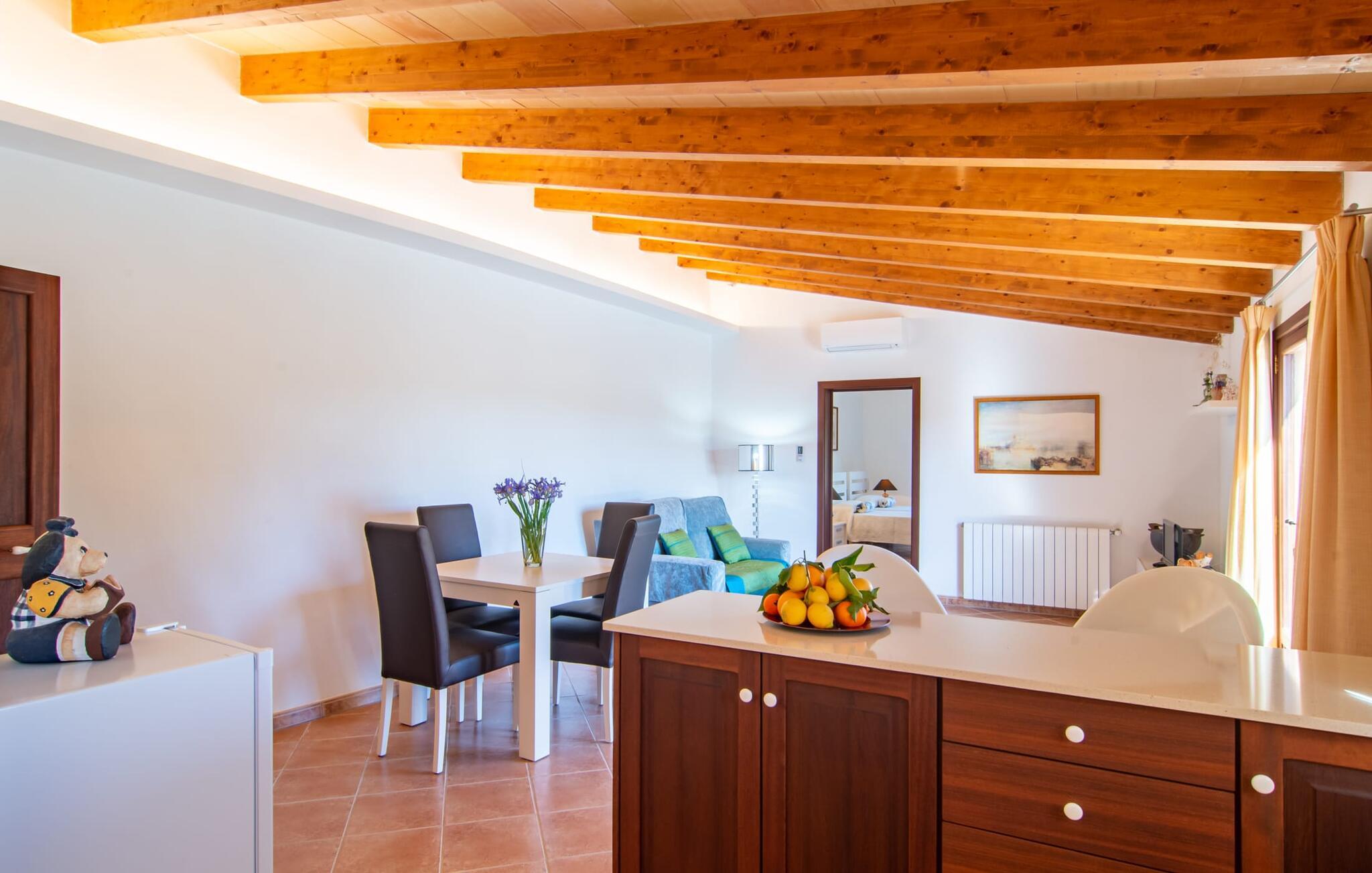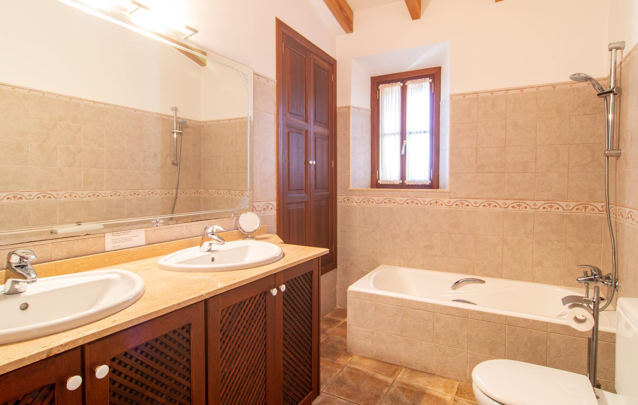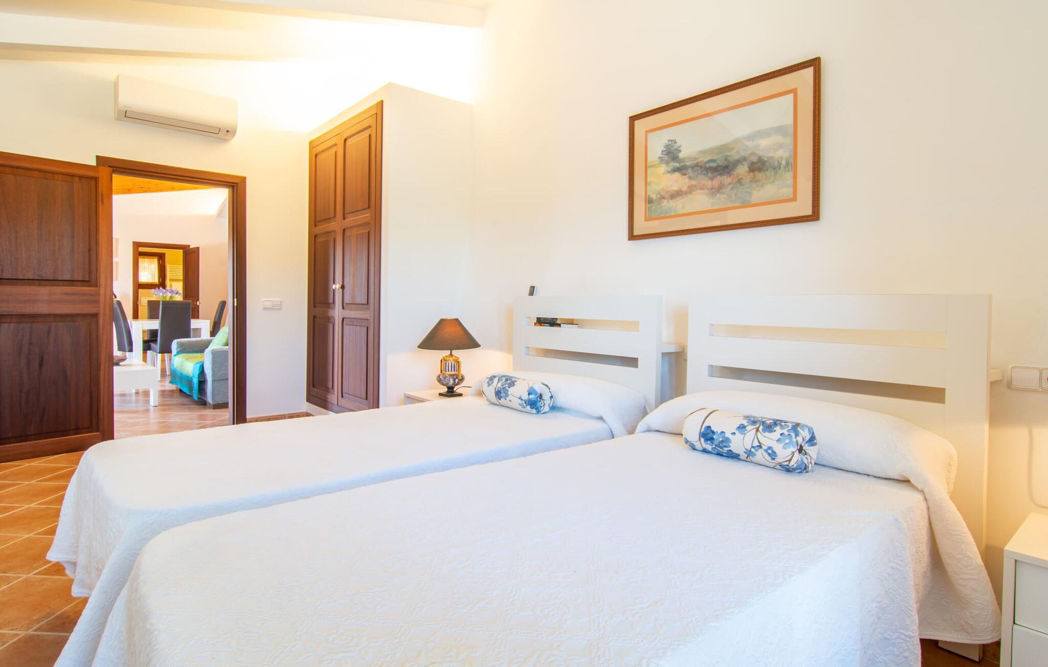 Kunne I tænke jer at fordybe jer i fuldstændig fred, slukke og nyde freden og roen? Hvis I leder efter alle faciliteterne til en velholdt ferie i en finca på Mallorca, så er "Son Paparra" lige noget for jer. Beliggende mellem maleriske bakker og marker, er denne naturstensbygning omgivet af smukke træer, hvilket skaber en indbydende og hyggelig atmosfære. Det store terrasseområde omkring poolen byder på mange åbne og overdækkede steder at slappe af. En ferie på en finca på Mallorca indeholder naturligvis også hyggelige grillaftener, og de overdækkede terrassearealer omkring huset er perfekte til dette. Indvendigt fortsætter fincaen med at imponere med sit komfortable layout. Med 240 m² boligareal giver det plads nok til op til seks gæster, der ønsker at tilbringe deres ferie sammen. Et af de tre stilfulde dobbeltværelser er placeret i et separat sommerhus og tilbyder komplet privatliv med eget badeværelse og stue/spisestue - ideel til at ledsage bedsteforældre eller et par med en baby. I hovedhuset, fordelt på to etager, finder I en indbydende stue og en rummelig spiseplads. På øverste etage er der to soveværelser med hvert sit badeværelse og en skøn altan med vid udsigt. Dette er det perfekte tilflugtssted for jeres ferie på Mallorca. Den roligt beliggende Mallorca finca "Son Paparra" er kun omkring 6 minutter i bil fra Sant Llorenc. Der vil I finde et bageri, et supermarked, et apotek og restauranter. De nærmeste strande kan nås efter ca. 10 km.