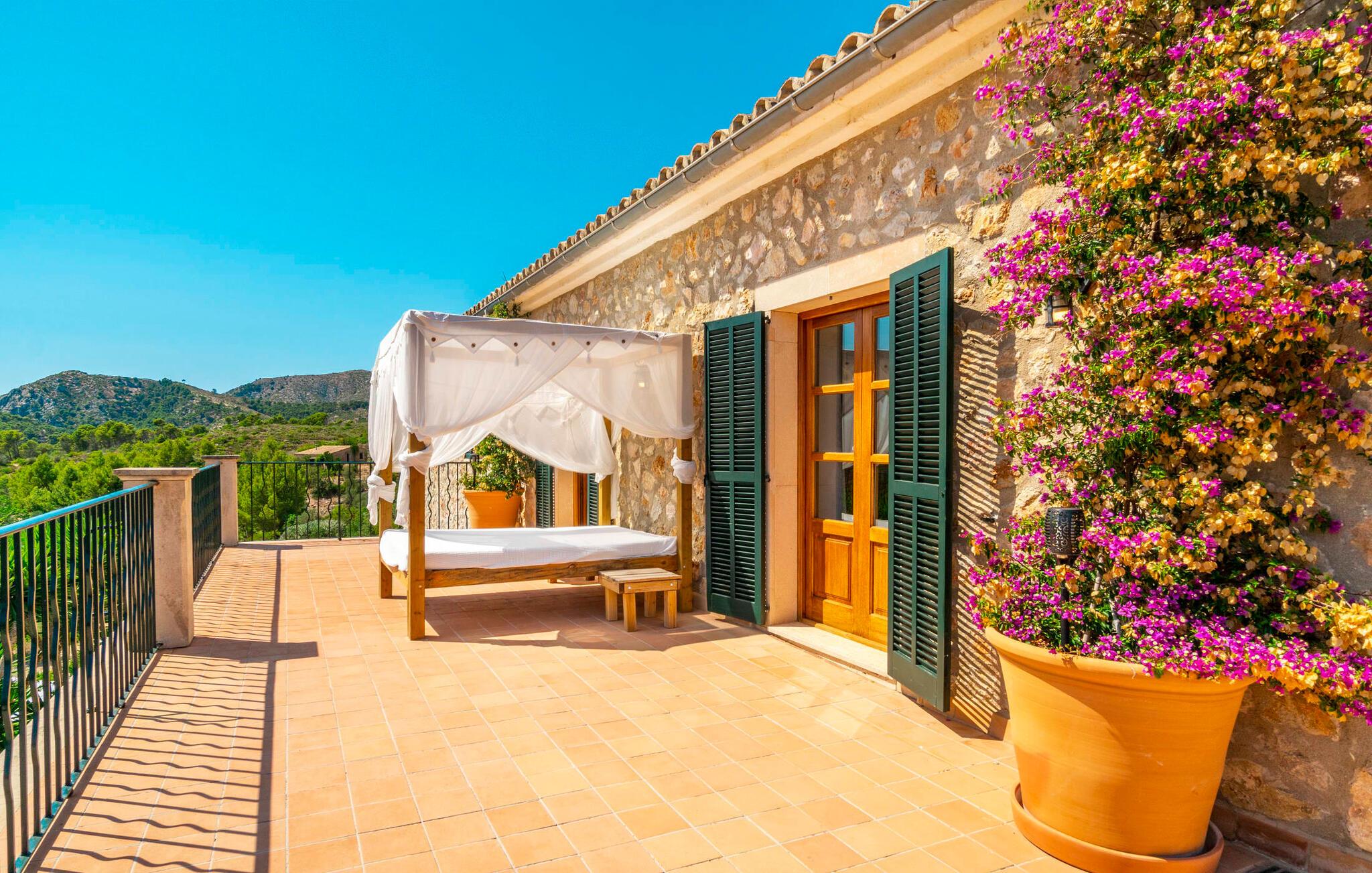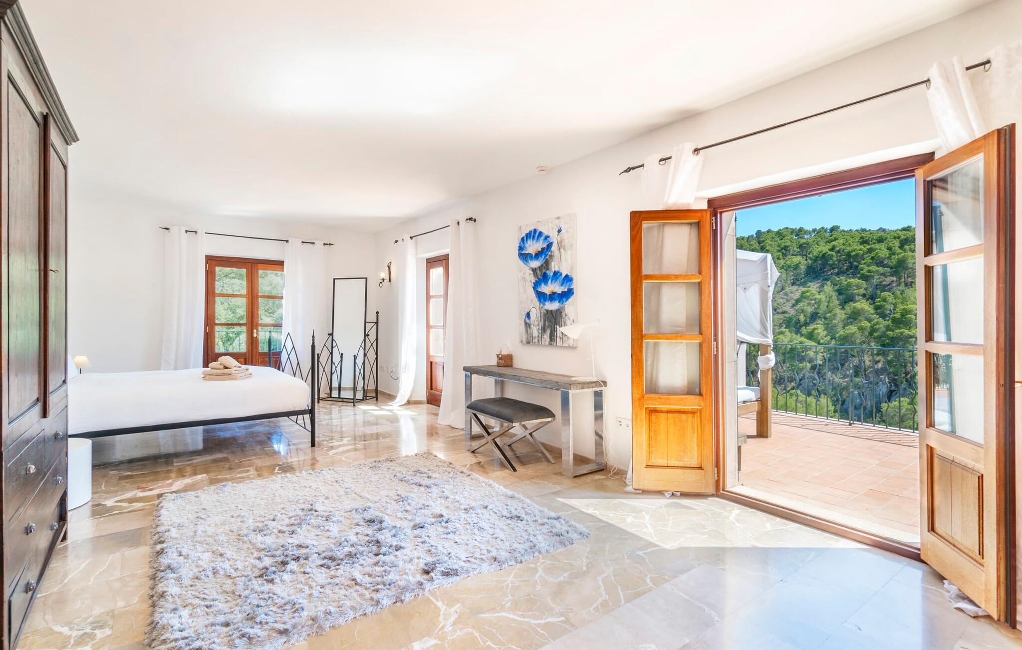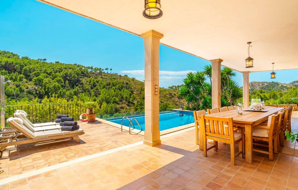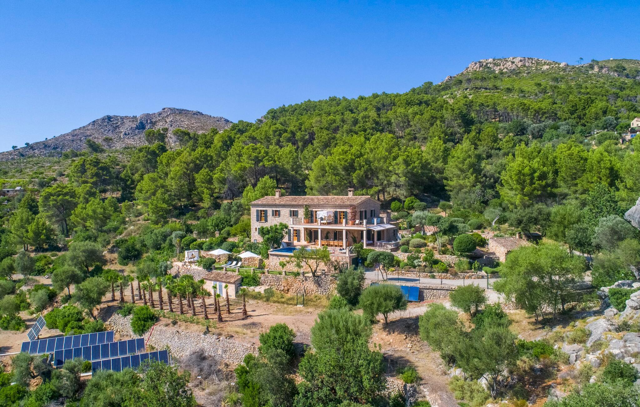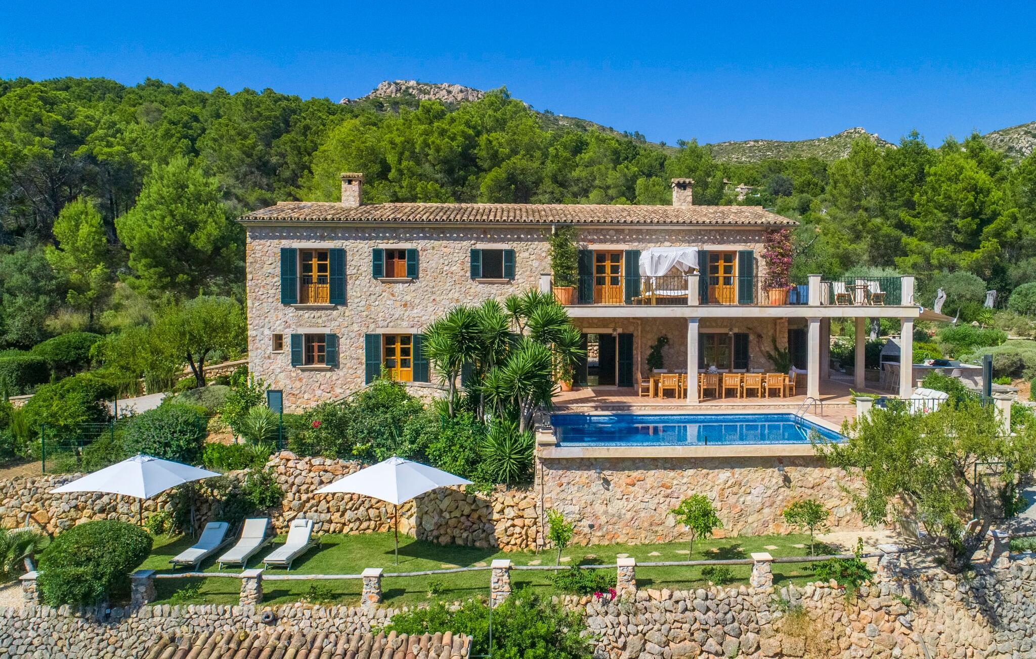 Ankom, sluk, nyd: Dette fristende feriemantra byder jer velkommen til den imponerende villa "Son Pujol de Andratx". Det smukke naturstenshus i to rummelige etager ligger ikke kun på en charmerende bjergskråning, men er også sydvendt og nyder godt af masser af sol og en behagelig ugenert beliggenhed. Det er ikke kun omgivet af forskellige overdækkede og udækkede indbydende terrassearealer, men tiltrækker også med endnu en terrasse på øverste etage og en kæmpe, alsidigt anlagt ejendom. En del af terrassearealet er udstyret med et spraykølesystem, som køler omgivelsestemperaturen med omkring 10 grader og holder hvepse væk. I kan gå rundt blandt velduftende rosmarin- og lavendelbuske, små oliventræer og palmer, men der er også plads til, at børn kan lege på plænerne. For sportsentusiaster er der et udendørs bordtennisbord, en pull-up bar og en boulebane i strandsandet. Hist og her er der skabt smukke hjørner til afslapning, for eksempel stilfulde liggestole eller en daybed med gardiner, der svajer romantisk i vinden - simpelthen fantastisk! Det gælder også infinity-poolen lige ved siden af huset, hvorfra man kan tage et kig på den omkringliggende natur. I kan nyde en lignende udsigt fra det ekstra lange spisebord på den overdækkede terrasse, som byder på plads nok til alle rejsende. Silbermühlen-grillen i det fuldt udstyrede udendørs stenkøkken tilbyder de bedste betingelser for kulinariske aftener af høj kvalitet i det fri. Storslåede stengulve, hvide vægge, flotte detaljer som gamle bjælker, glitrende lysekroner og elegante søjler – indretningen af jeres sommerhus er et sandt blikfang. "Son Pujol de Andratx" er blevet møbleret og dekoreret med stor smag, men også en god følelse af komfort. Værelserne er rummelige og lyse, det imponerende indgangsparti byder jer velkommen i stueetagen. Lad os derefter gå videre til et enkelt åbent rum, der rummer opholds- og spiseområderne samt køkkenet. Mens en stor sofa med afslapningsfunktion i stuen indbyder til at putte sig foran pejsen, er der et langt træbord i spisestuen til en overdådig middag. I kan tilberede de lækkerier, I vil servere, i køkkenet lige ved siden af. Hobbykokke vil blive begejstrede for pladsen og de absolut højkvalitets apparater. Når det er tid til søde drømme, kan I trække jer tilbage til et af de fem stilfulde soveværelser, hver med et smart en-suite badeværelse, pengeskab og aircondition. Det bakkede og skovklædte landskab omkring jeres ejendom er særdeles velegnet til lange gå- eller vandreture, da det er et af de smukkeste områder i den sydvestlige del af øen. Andratx er ca. 3,9 km væk med udlejningsbil. Den traditionelle by, populær som eksklusivt boligområde, ligger i Tramuntana-bjergenes dal og er bestemt et besøg værd. Med sine smalle gader og autentiske mallorcanske bybilleder giver Andratx ikke kun inspiration til mange kunstnere og forfattere, men tiltrækker også et internationalt publikum. Ud over de smukke kirker Santa Maria de Andratx og s'Arracó og Castel de Son Mas, som nu bruges som rådhus, bør I også kigge forbi kulturcentret CCA Andratx, hvor moderne kunst er udstillet. For en dag på stranden kan I for eksempel tage til Platja de Sant Elm, kun 10 km væk. Takket være dets fine sand og let skrånende kyst er den særlig populær blandt familier med små børn. Stranden byder også på god infrastruktur og en promenade til slentreture. "Son Pujol de Andratx" er en villadrøm, der går i opfyldelse: et betagende, stort naturstenshus, bygget i en fantastisk sydvendt beliggenhed, afsondret beliggenhed på en skråning, på en kæmpe ejendom med en fortryllende have, kun 3,9 km fra Andratx . Bag huset kan I forvente ikke kun overdækkede og solrige terrasseområder, men også en fantastisk infinity-pool, hvorfra I kan nyde en imponerende udsigt over den omkringliggende natur. Stranden i Platja de Sant Elm ligger kun 10 km væk i bil. Bemærk venligst, at denne ejendom ikke accepterer ungdomsgrupper eller polterabender. En ungdomsgruppe på denne ejendom består af personer under 30 år. Book ikke denne ejendom, hvis I er en ungdomsgruppe eller en polterabendgruppe, da jeres reservation vil blive afvist, når den er booket, hvilket også kan være tilfældet ved ankomst til ejendommen eller under jeres ophold, og I vil ikke modtage en refusion.