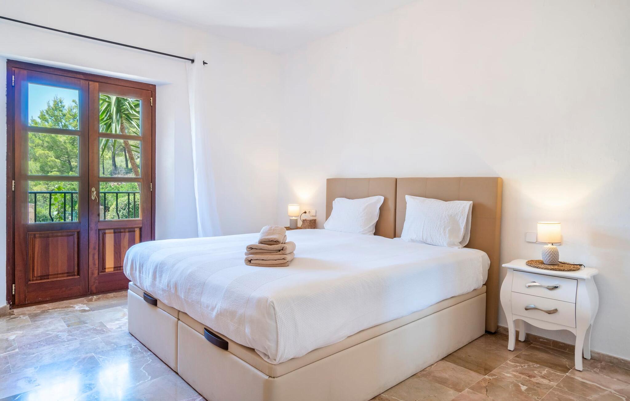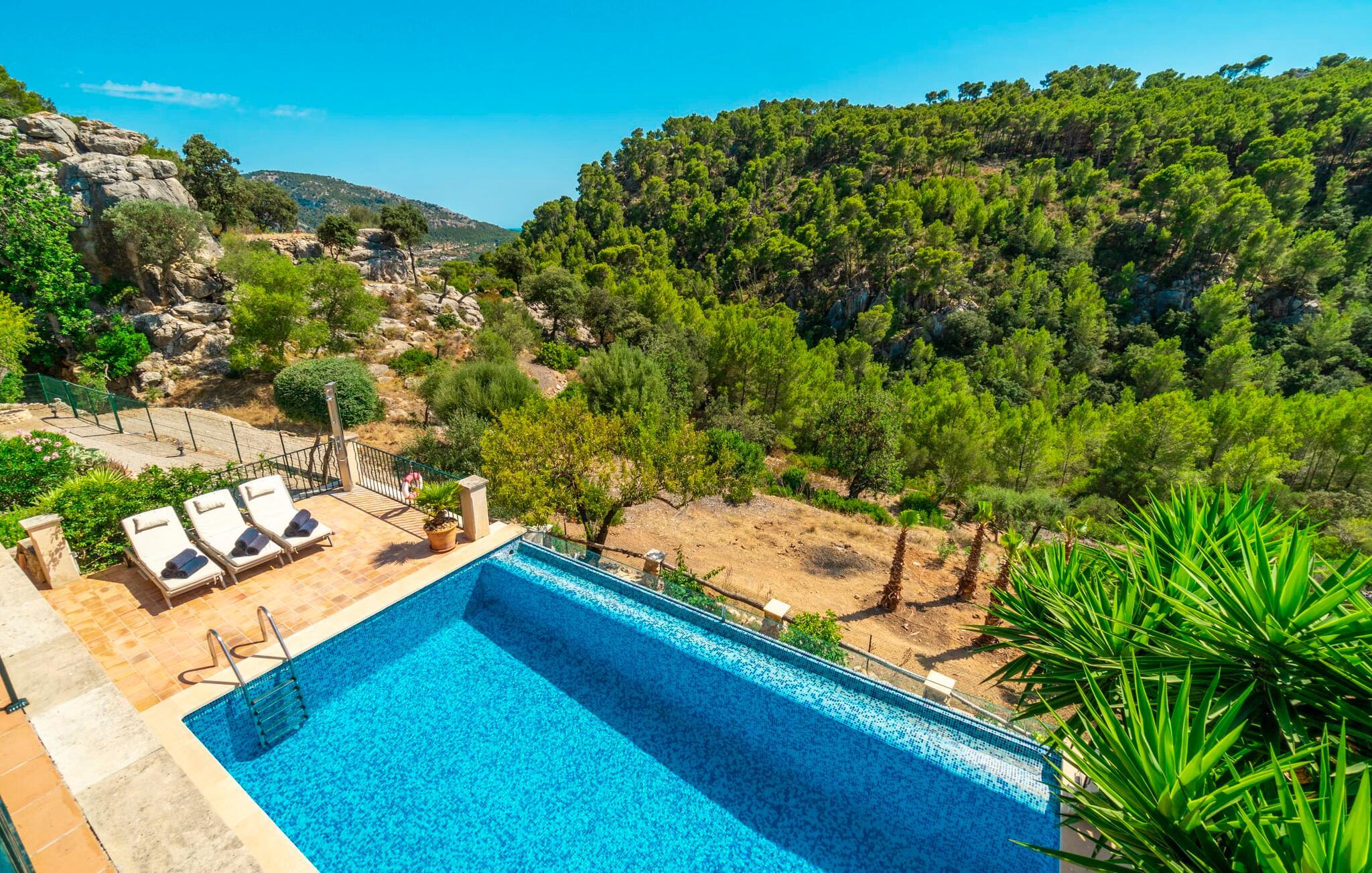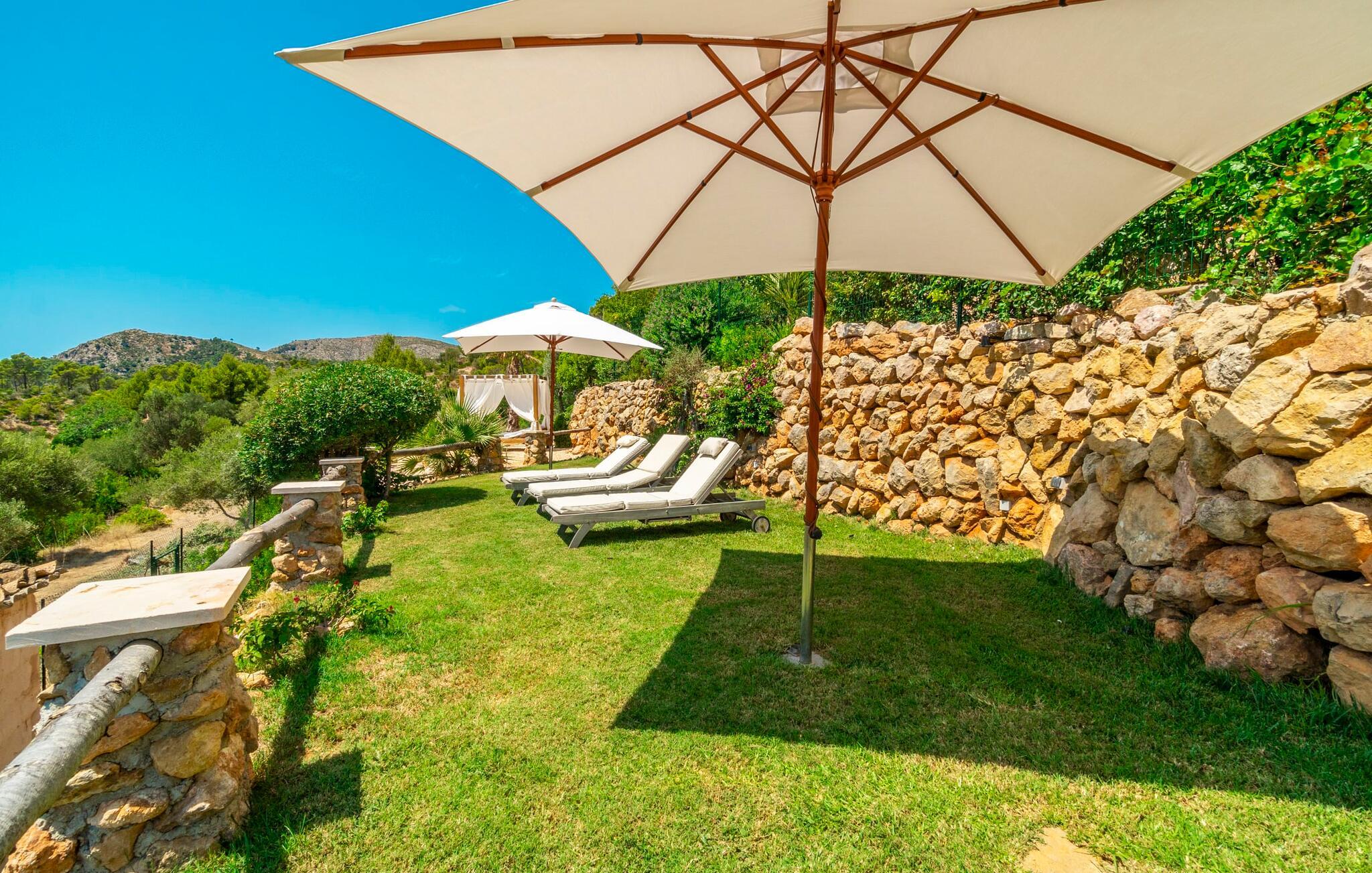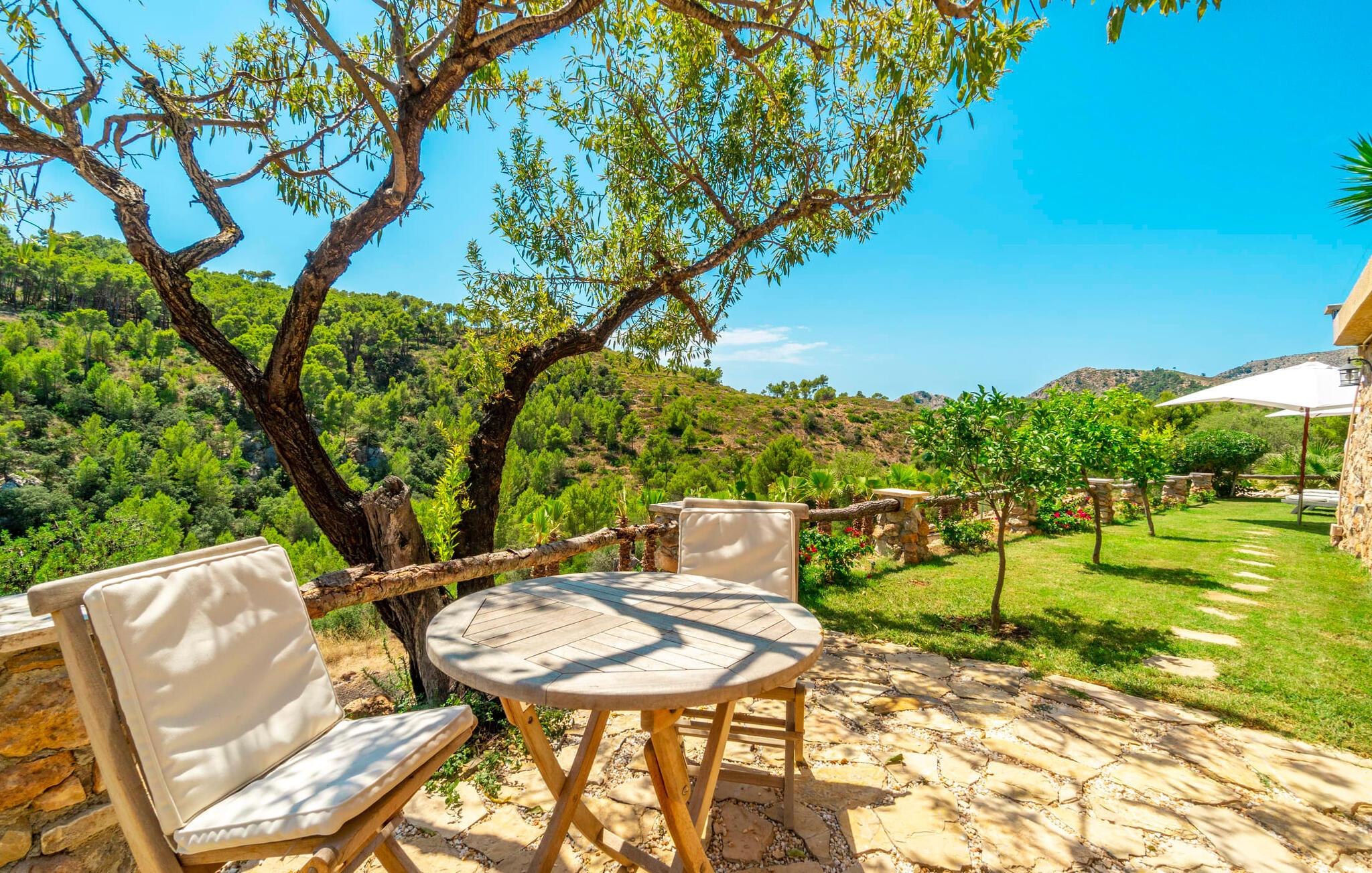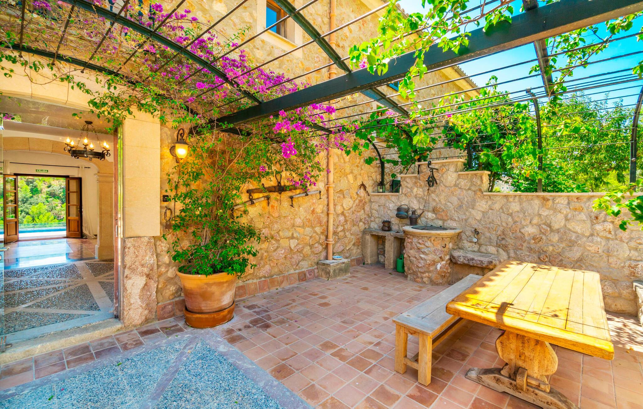 Ankom, sluk, nyd: Dette fristende feriemantra byder jer velkommen til den imponerende villa "Son Pujol de Andratx". Det smukke naturstenshus i to rummelige etager ligger ikke kun på en charmerende bjergskråning, men er også sydvendt og nyder godt af masser af sol og en behagelig ugenert beliggenhed. Det er ikke kun omgivet af forskellige overdækkede og udækkede indbydende terrassearealer, men tiltrækker også med endnu en terrasse på øverste etage og en kæmpe, alsidigt anlagt ejendom. En del af terrassearealet er udstyret med et spraykølesystem, som køler omgivelsestemperaturen med omkring 10 grader og holder hvepse væk. I kan gå rundt blandt velduftende rosmarin- og lavendelbuske, små oliventræer og palmer, men der er også plads til, at børn kan lege på plænerne. For sportsentusiaster er der et udendørs bordtennisbord, en pull-up bar og en boulebane i strandsandet. Hist og her er der skabt smukke hjørner til afslapning, for eksempel stilfulde liggestole eller en daybed med gardiner, der svajer romantisk i vinden - simpelthen fantastisk! Det gælder også infinity-poolen lige ved siden af huset, hvorfra man kan tage et kig på den omkringliggende natur. I kan nyde en lignende udsigt fra det ekstra lange spisebord på den overdækkede terrasse, som byder på plads nok til alle rejsende. Silbermühlen-grillen i det fuldt udstyrede udendørs stenkøkken tilbyder de bedste betingelser for kulinariske aftener af høj kvalitet i det fri. Storslåede stengulve, hvide vægge, flotte detaljer som gamle bjælker, glitrende lysekroner og elegante søjler – indretningen af jeres sommerhus er et sandt blikfang. "Son Pujol de Andratx" er blevet møbleret og dekoreret med stor smag, men også en god følelse af komfort. Værelserne er rummelige og lyse, det imponerende indgangsparti byder jer velkommen i stueetagen. Lad os derefter gå videre til et enkelt åbent rum, der rummer opholds- og spiseområderne samt køkkenet. Mens en stor sofa med afslapningsfunktion i stuen indbyder til at putte sig foran pejsen, er der et langt træbord i spisestuen til en overdådig middag. I kan tilberede de lækkerier, I vil servere, i køkkenet lige ved siden af. Hobbykokke vil blive begejstrede for pladsen og de absolut højkvalitets apparater. Når det er tid til søde drømme, kan I trække jer tilbage til et af de fem stilfulde soveværelser, hver med et smart en-suite badeværelse, pengeskab og aircondition. Det bakkede og skovklædte landskab omkring jeres ejendom er særdeles velegnet til lange gå- eller vandreture, da det er et af de smukkeste områder i den sydvestlige del af øen. Andratx er ca. 3,9 km væk med udlejningsbil. Den traditionelle by, populær som eksklusivt boligområde, ligger i Tramuntana-bjergenes dal og er bestemt et besøg værd. Med sine smalle gader og autentiske mallorcanske bybilleder giver Andratx ikke kun inspiration til mange kunstnere og forfattere, men tiltrækker også et internationalt publikum. Ud over de smukke kirker Santa Maria de Andratx og s'Arracó og Castel de Son Mas, som nu bruges som rådhus, bør I også kigge forbi kulturcentret CCA Andratx, hvor moderne kunst er udstillet. For en dag på stranden kan I for eksempel tage til Platja de Sant Elm, kun 10 km væk. Takket være dets fine sand og let skrånende kyst er den særlig populær blandt familier med små børn. Stranden byder også på god infrastruktur og en promenade til slentreture. "Son Pujol de Andratx" er en villadrøm, der går i opfyldelse: et betagende, stort naturstenshus, bygget i en fantastisk sydvendt beliggenhed, afsondret beliggenhed på en skråning, på en kæmpe ejendom med en fortryllende have, kun 3,9 km fra Andratx . Bag huset kan I forvente ikke kun overdækkede og solrige terrasseområder, men også en fantastisk infinity-pool, hvorfra I kan nyde en imponerende udsigt over den omkringliggende natur. Stranden i Platja de Sant Elm ligger kun 10 km væk i bil. Bemærk venligst, at denne ejendom ikke accepterer ungdomsgrupper eller polterabender. En ungdomsgruppe på denne ejendom består af personer under 30 år. Book ikke denne ejendom, hvis I er en ungdomsgruppe eller en polterabendgruppe, da jeres reservation vil blive afvist, når den er booket, hvilket også kan være tilfældet ved ankomst til ejendommen eller under jeres ophold, og I vil ikke modtage en refusion.