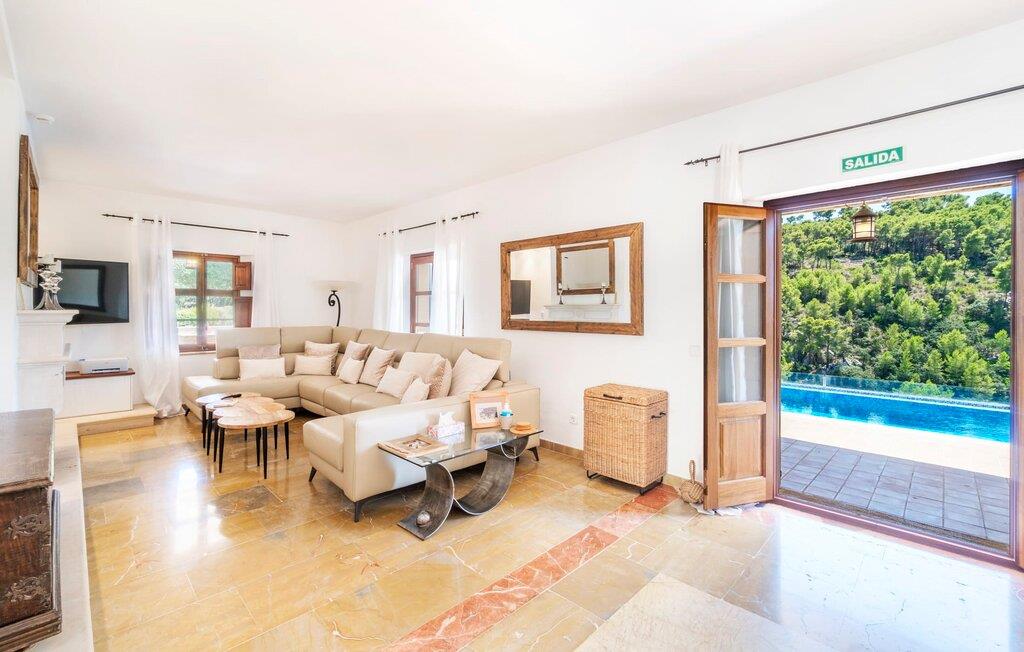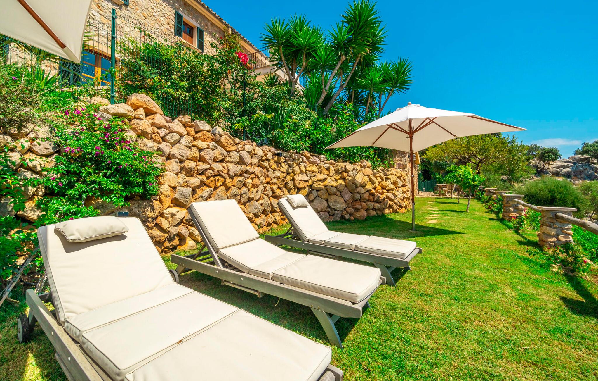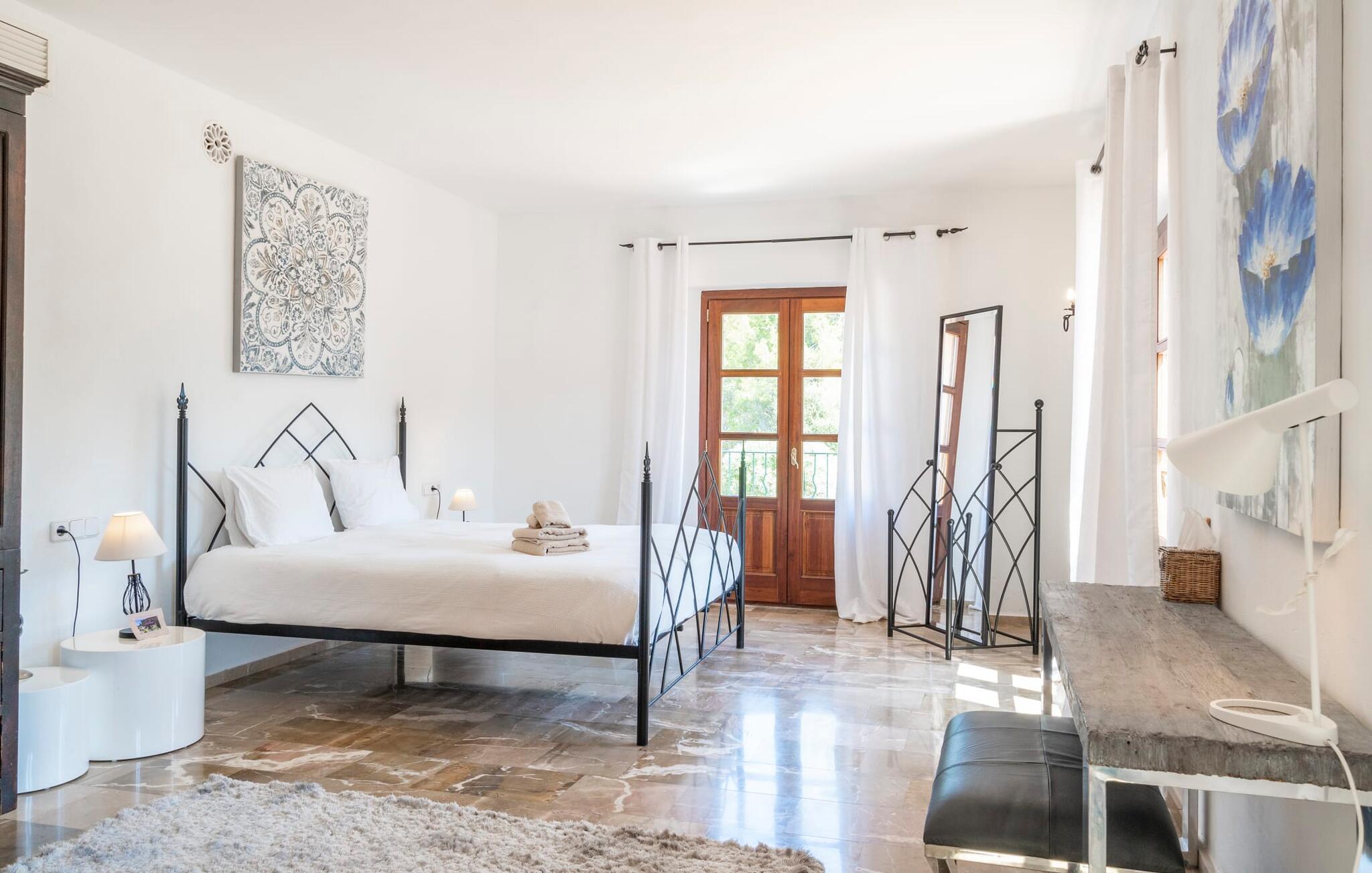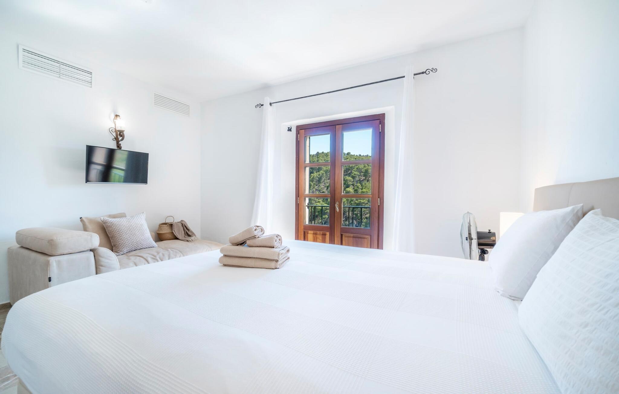 Ankom, sluk, nyd: Dette fristende feriemantra byder jer velkommen til den imponerende villa "Son Pujol de Andratx". Det smukke naturstenshus i to rummelige etager ligger ikke kun på en charmerende bjergskråning, men er også sydvendt og nyder godt af masser af sol og en behagelig ugenert beliggenhed. Det er ikke kun omgivet af forskellige overdækkede og udækkede indbydende terrassearealer, men tiltrækker også med endnu en terrasse på øverste etage og en kæmpe, alsidigt anlagt ejendom. En del af terrassearealet er udstyret med et spraykølesystem, som køler omgivelsestemperaturen med omkring 10 grader og holder hvepse væk. I kan gå rundt blandt velduftende rosmarin- og lavendelbuske, små oliventræer og palmer, men der er også plads til, at børn kan lege på plænerne. For sportsentusiaster er der et udendørs bordtennisbord, en pull-up bar og en boulebane i strandsandet. Hist og her er der skabt smukke hjørner til afslapning, for eksempel stilfulde liggestole eller en daybed med gardiner, der svajer romantisk i vinden - simpelthen fantastisk! Det gælder også infinity-poolen lige ved siden af huset, hvorfra man kan tage et kig på den omkringliggende natur. I kan nyde en lignende udsigt fra det ekstra lange spisebord på den overdækkede terrasse, som byder på plads nok til alle rejsende. Silbermühlen-grillen i det fuldt udstyrede udendørs stenkøkken tilbyder de bedste betingelser for kulinariske aftener af høj kvalitet i det fri. Storslåede stengulve, hvide vægge, flotte detaljer som gamle bjælker, glitrende lysekroner og elegante søjler – indretningen af jeres sommerhus er et sandt blikfang. "Son Pujol de Andratx" er blevet møbleret og dekoreret med stor smag, men også en god følelse af komfort. Værelserne er rummelige og lyse, det imponerende indgangsparti byder jer velkommen i stueetagen. Lad os derefter gå videre til et enkelt åbent rum, der rummer opholds- og spiseområderne samt køkkenet. Mens en stor sofa med afslapningsfunktion i stuen indbyder til at putte sig foran pejsen, er der et langt træbord i spisestuen til en overdådig middag. I kan tilberede de lækkerier, I vil servere, i køkkenet lige ved siden af. Hobbykokke vil blive begejstrede for pladsen og de absolut højkvalitets apparater. Når det er tid til søde drømme, kan I trække jer tilbage til et af de fem stilfulde soveværelser, hver med et smart en-suite badeværelse, pengeskab og aircondition. Det bakkede og skovklædte landskab omkring jeres ejendom er særdeles velegnet til lange gå- eller vandreture, da det er et af de smukkeste områder i den sydvestlige del af øen. Andratx er ca. 3,9 km væk med udlejningsbil. Den traditionelle by, populær som eksklusivt boligområde, ligger i Tramuntana-bjergenes dal og er bestemt et besøg værd. Med sine smalle gader og autentiske mallorcanske bybilleder giver Andratx ikke kun inspiration til mange kunstnere og forfattere, men tiltrækker også et internationalt publikum. Ud over de smukke kirker Santa Maria de Andratx og s'Arracó og Castel de Son Mas, som nu bruges som rådhus, bør I også kigge forbi kulturcentret CCA Andratx, hvor moderne kunst er udstillet. For en dag på stranden kan I for eksempel tage til Platja de Sant Elm, kun 10 km væk. Takket være dets fine sand og let skrånende kyst er den særlig populær blandt familier med små børn. Stranden byder også på god infrastruktur og en promenade til slentreture. "Son Pujol de Andratx" er en villadrøm, der går i opfyldelse: et betagende, stort naturstenshus, bygget i en fantastisk sydvendt beliggenhed, afsondret beliggenhed på en skråning, på en kæmpe ejendom med en fortryllende have, kun 3,9 km fra Andratx . Bag huset kan I forvente ikke kun overdækkede og solrige terrasseområder, men også en fantastisk infinity-pool, hvorfra I kan nyde en imponerende udsigt over den omkringliggende natur. Stranden i Platja de Sant Elm ligger kun 10 km væk i bil. Bemærk venligst, at denne ejendom ikke accepterer ungdomsgrupper eller polterabender. En ungdomsgruppe på denne ejendom består af personer under 30 år. Book ikke denne ejendom, hvis I er en ungdomsgruppe eller en polterabendgruppe, da jeres reservation vil blive afvist, når den er booket, hvilket også kan være tilfældet ved ankomst til ejendommen eller under jeres ophold, og I vil ikke modtage en refusion.